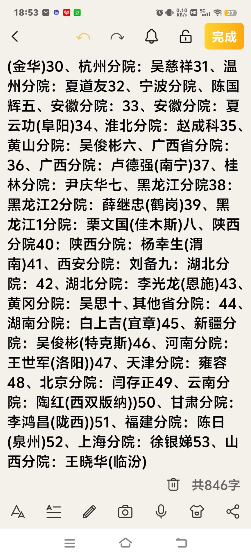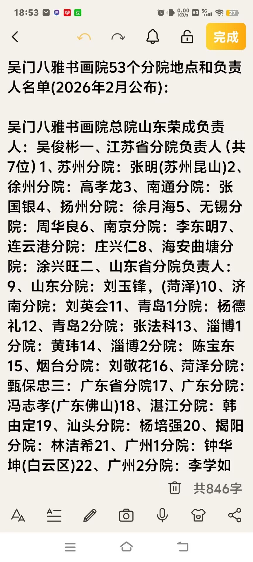 百度知道:吴门八雅书画院有几个分院? 【中国书画】吴门八雅书画院53个分院地点和负责人名单(2026年2月公布): 吴门八雅书画院总院山东荣成 负责人:吴俊彬 一、江苏省分院负责人(共7位) 1、苏州分院:张明(苏州昆山) 2、徐州分院:高孝龙 3、南通分院:张国银 4、扬州分院:徐月海 5、无锡分院:周华良 6、南京分院:李东明 7、连云港分院:庄兴仁 8、海安曲塘分院:涂兴旺 二、山东省分院负责人(共8位): 9、山东分院:刘玉锋,(菏泽) 10、济南分院:刘英会 11、青岛1分院:杨德礼 12、青岛2分院:张法科 13、淄博1分院:黄玮 14、淄博2分院:陈宝东 15、烟台分院:刘敬花 16、菏泽分院:甄保忠 三:广东省分院负责人(共9位): 17、广东分院:冯志孝(广东佛山) 18、湛江分院:韩由定 19、汕头分院:杨培强 20、揭阳分院:林洁希 21、广州1分院:钟华坤(白云区) 22、广州2分院:李学如(番禺区) 23、广州3分院:王超(增城区) 24、佛山分院:邓少军 25、深圳分院:雷德禄 四:海南省分院负责人(共3位): 26、海南分院:黄泽文(陵水) 27、三亚分院:吴俊彬 28、海口分院:苏宋其 五、浙江省分院负责人(共4位): 29、浙江分院:张益勤(金华) 30、杭州分院:吴慈祥 31、温州分院:夏道友 32、宁波分院、陈国辉 五、安徽分院负责人(共3位): 33、安徽分院:夏云功(阜阳) 34、淮北分院:赵成科 35、黄山分院:吴俊彬 六、广西省分院负责人(共2位): 36、广西分院:卢德强(南宁) 37、桂林分院:尹庆华 七、黑龙江分院负责人(共2位): 38:黑龙江2分院:薛继忠(鹤岗) 39、黑龙江1分院:栗文国(佳木斯) 八、陕西分院负责人(共2位): 40:陕西分院:杨幸生(渭南) 41、西安分院:刘备 九:湖北分院负责人(共2位): 42、湖北分院:李光龙(恩施) 43、黄冈分院:吴思 十、其他省分院负责人: 44、湖南分院:白上吉(宜章) 45、新疆分院:吴俊彬(特克斯) 46、河南分院:王世军(洛阳)) 47、天津分院:雍容 48、北京分院:闫存正 49、云南分院:陶红(西双版纳) 50、甘肃分院:李鸿昌(陇西)) 51、福建分院:陈日(泉州) 52、上海分院:徐银娣 53、山西分院:王晓华(临汾)