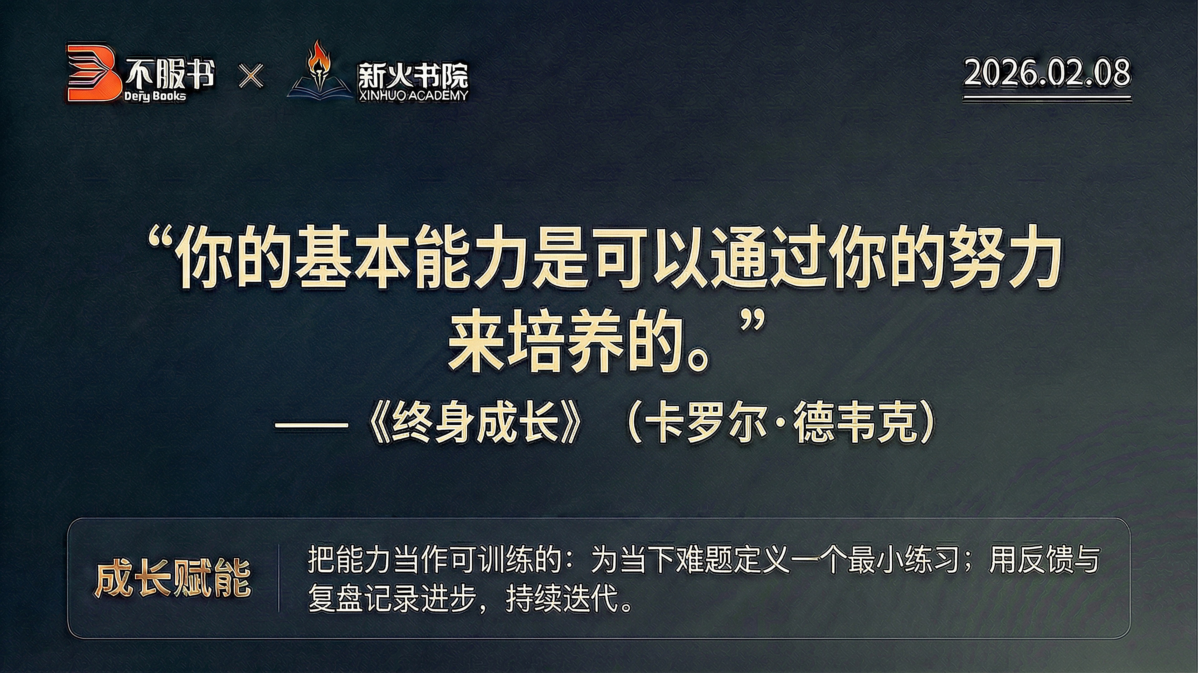 【每日分享】 各位书友早安!今天是2月8日,周日。 今日为您分享卡罗尔·德韦克《终身成长》中的核心信念:“你的基本能力是可以通过你的努力来培养的。” 我们在面对从未做过的新任务时,第一反应往往是“我没有这个天赋”或“我不擅长这个”。这其实是“固定型思维”在作祟,它让我们画地为牢。 但这本书告诉我们:天赋只是起点,而非终点。 即使是莫扎特或乔丹,他们的卓越也是建立在持续的刻意练习之上。 卡罗尔·德韦克在书中建议我们把能力当作“肌肉”来训练: • 定义最小练习:不要总想着憋大招,为当下的难题设定一个只要5分钟就能完成的“最小练习”。 • 记录与复盘:把每一次失败都看作是“数据反馈”,而不是对你能力的“最终判决”。持续迭代,你就能重塑大脑的回路。