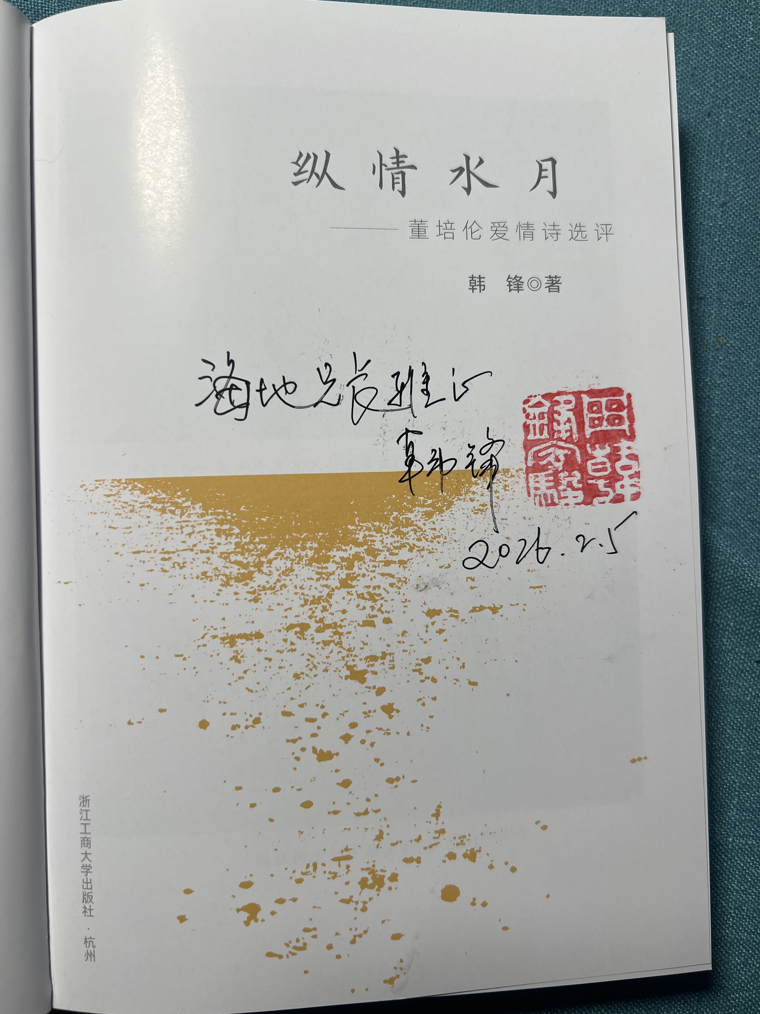 “写完《纵情水月:董培伦爱情诗选评》一百二十九首的最后一篇《新春之恋》,我放下笔,静静地坐在书桌前。回首这部评论集的撰写,我从窗外繁花芬芳的春天开篇,在炎夏里奋笔,在渐冷的秋冬里疾书,直到2024年年末万家灯火的时候完成了第一稿。我轻轻地嘘了一口气,然后继续前行,当我改完这部书稿,在晨色中仰看窗外,迎春花已“咚咚咚”地在开了,垂柳也悄悄地从辫梢上吐出了一颗颗新春的绿芽。这是一段从春天到春天难忘的创作心路。” ———韩锋 文学评论家韩锋老师也曾为我《树的风景》作评论,非常感谢。 收到韩老师新作《纵情水月——董培伦爱情诗选评》,这本诗歌评论集是近年来对董培伦爱情诗最系统、最全面、最专业的诗歌评论集。韩老师从“春天到春天”,在四季的时光里,用心、用情、用文学评论家的专业理论和思想精心点评,我深为感动,非常敬佩,容我慢慢品读,欣赏学习。