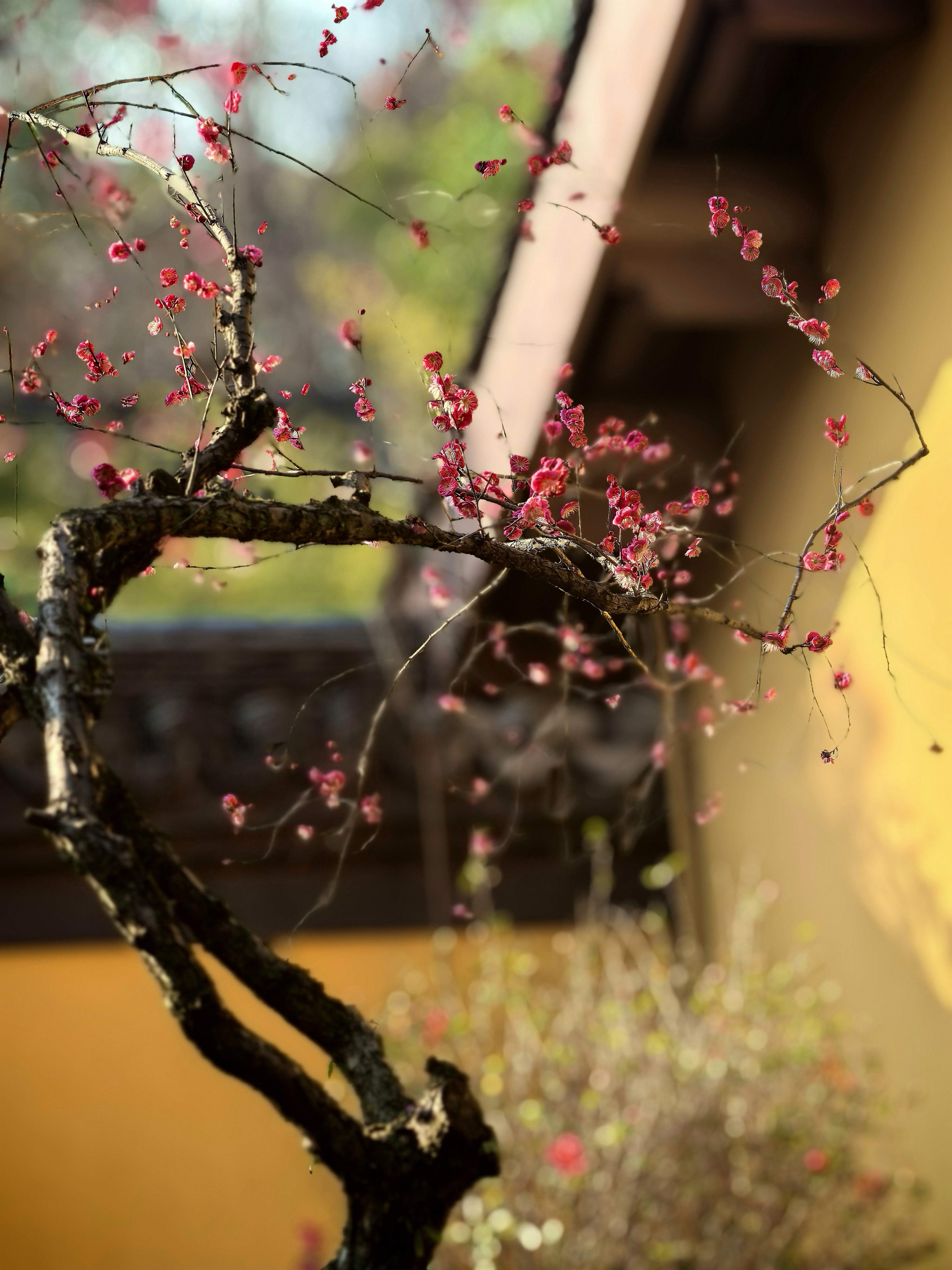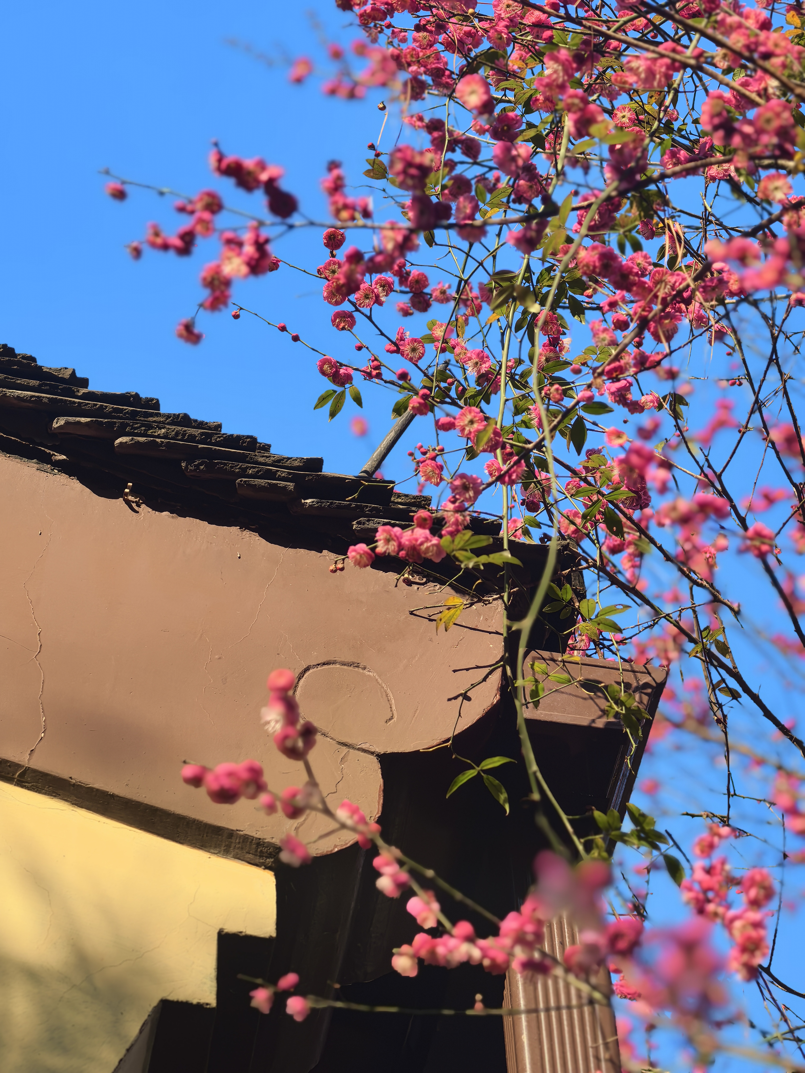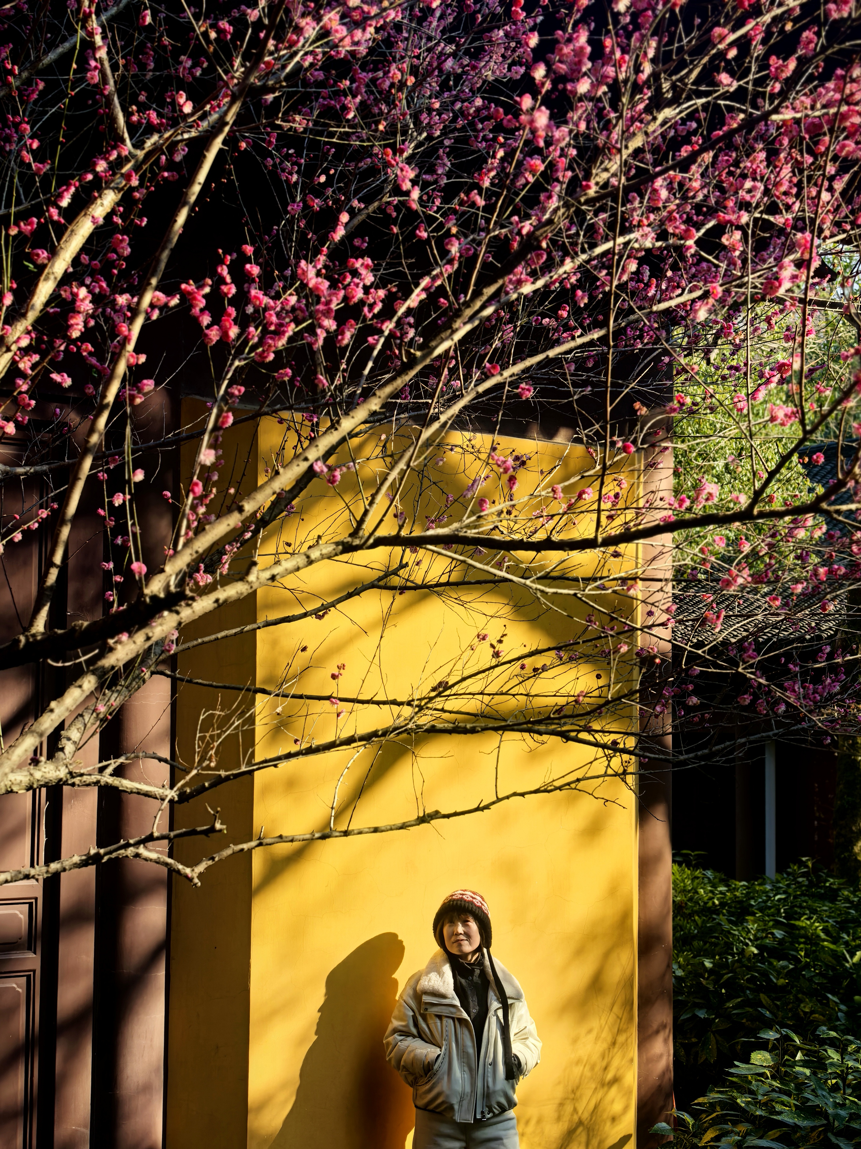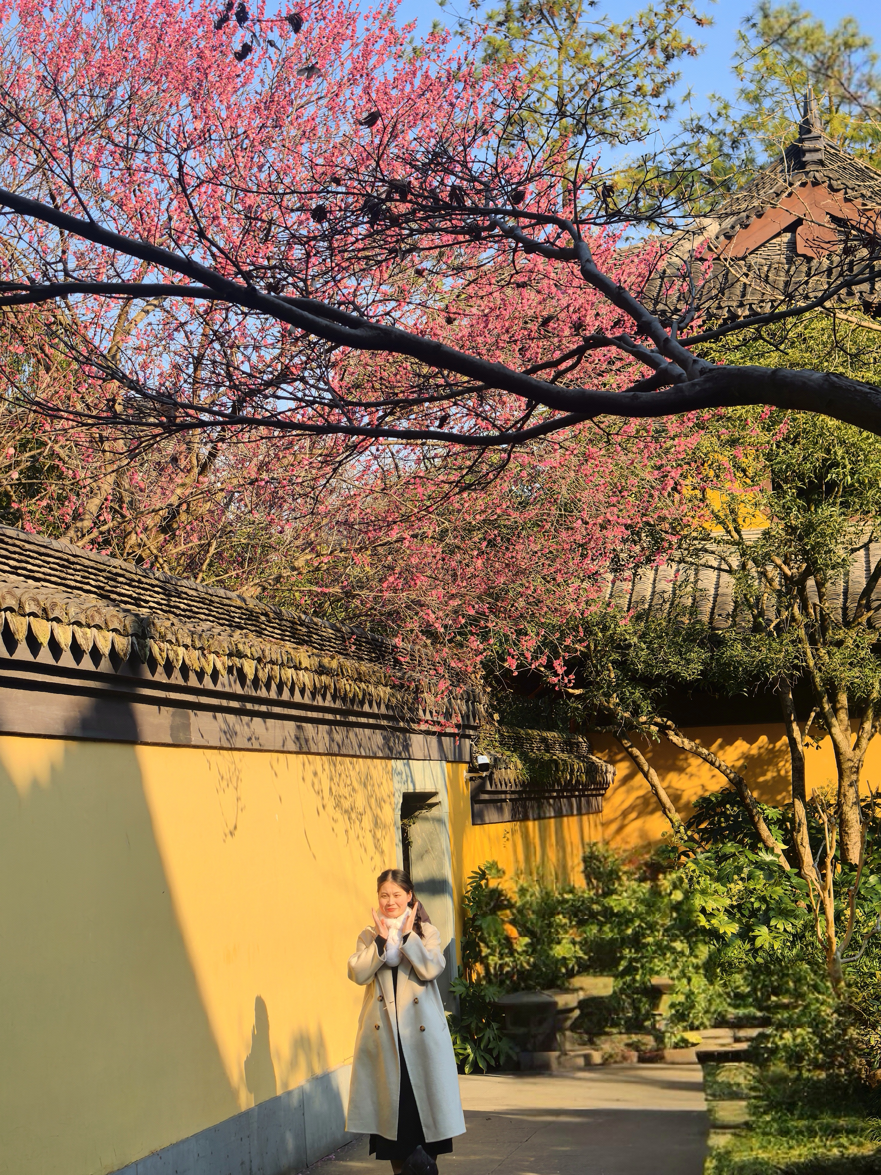 今天的慧因高丽寺,是一个朋友圈摄影大赛的热点秀场。平日里静谧的古寺内,游人如织。几株红梅生得摇曳多姿,如诗如画。 下午暖阳慵懒地漫过黄墙,在斑驳的光影中唤醒了一树的梅朵。虬枝如墨线,勾勒着风骨;繁花似绯云,灼灼然燃烧在檐角瓦当之畔。 飞檐翘角承载着时光的厚重;红梅轻颤,每一瓣都诉说着生命的鲜活。暗香浮于回廊之间,偶有游人仰首细嗅,或举镜凝眸,恨不得将这动人的绯红伴着禅寂一同收入自己的方寸之间。 古朴的永恒与绚烂的须臾,真的是相看两不厌,有时候静默也成为永恒。年年赏梅必拍地,这里算是相当出片的地方了!杭城赏梅之八慧因高丽寺。