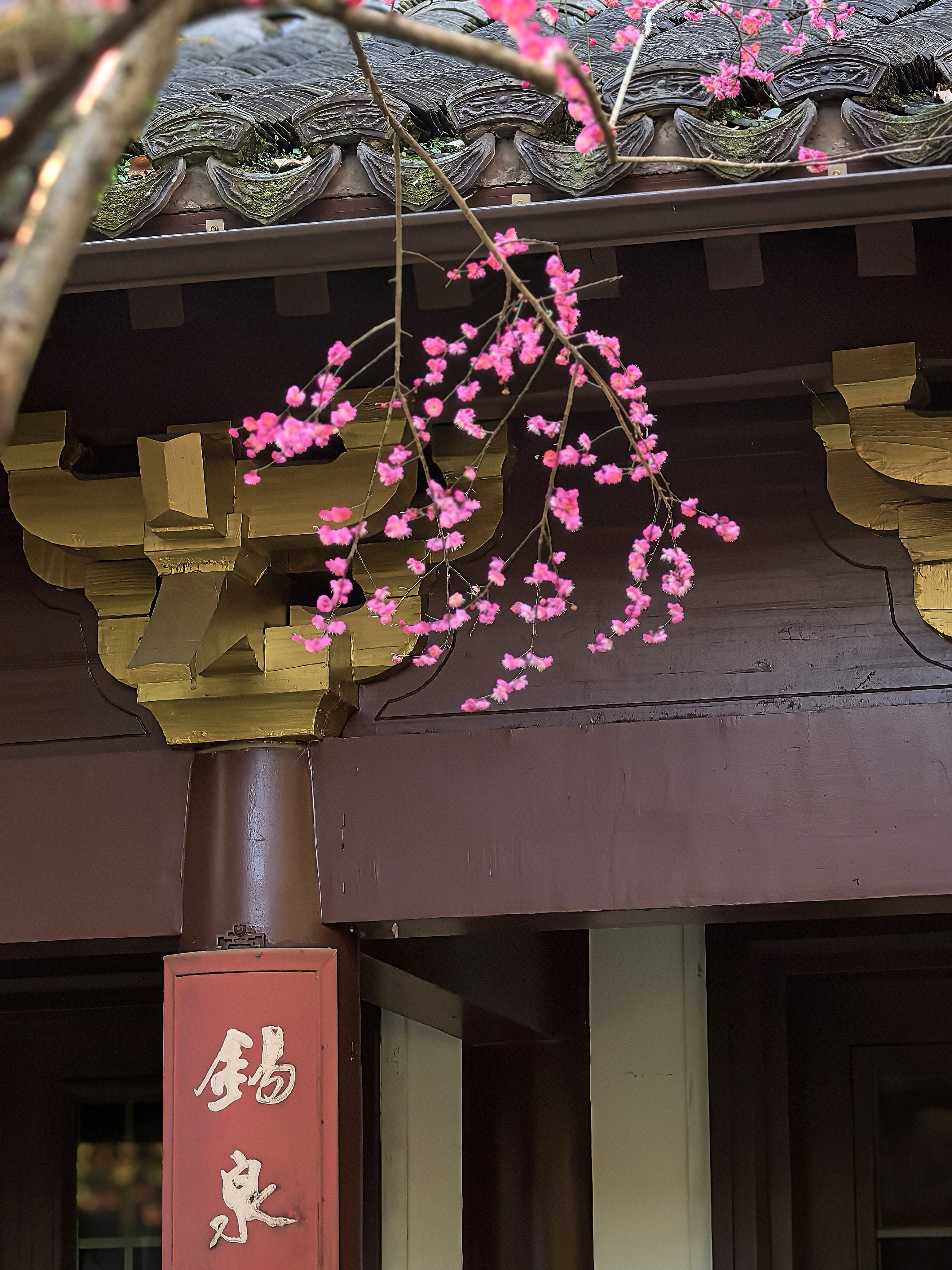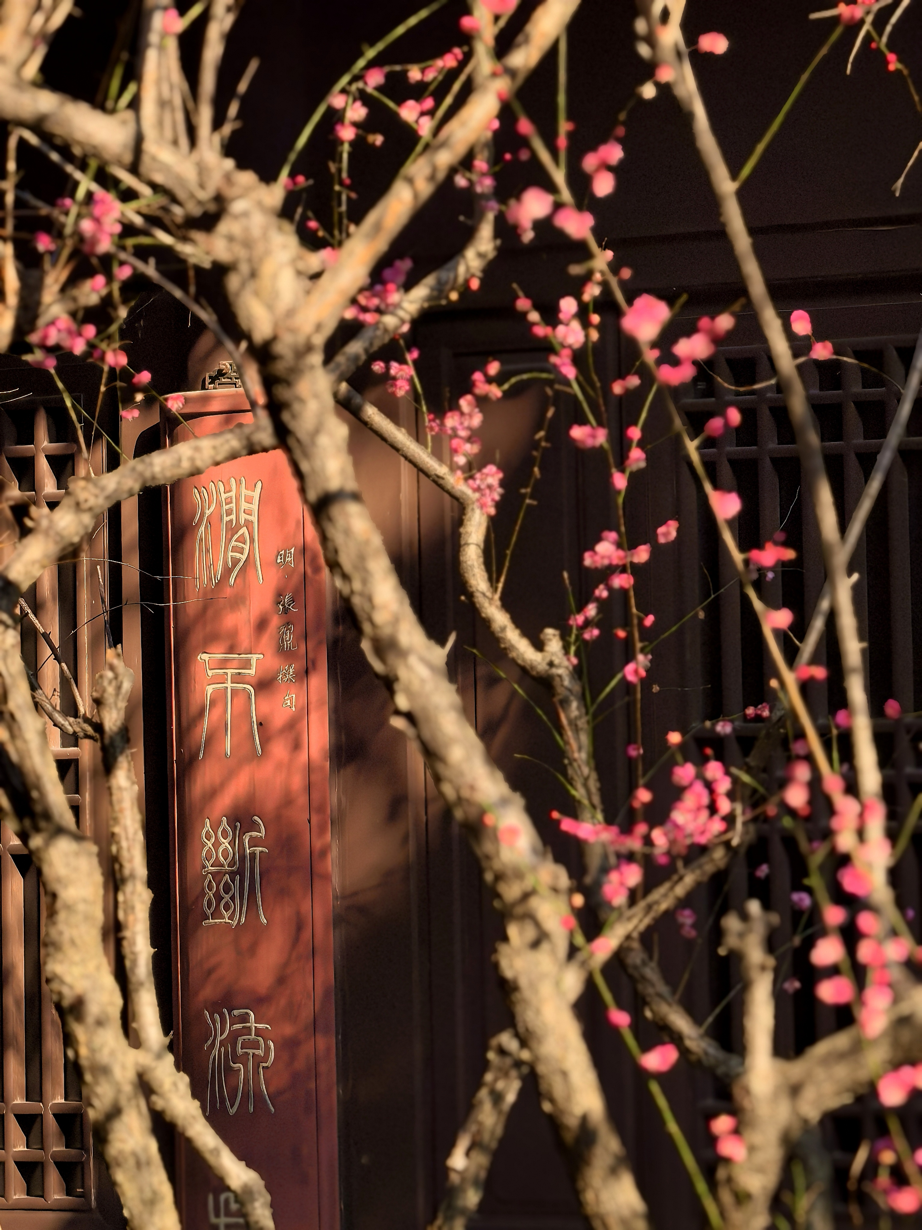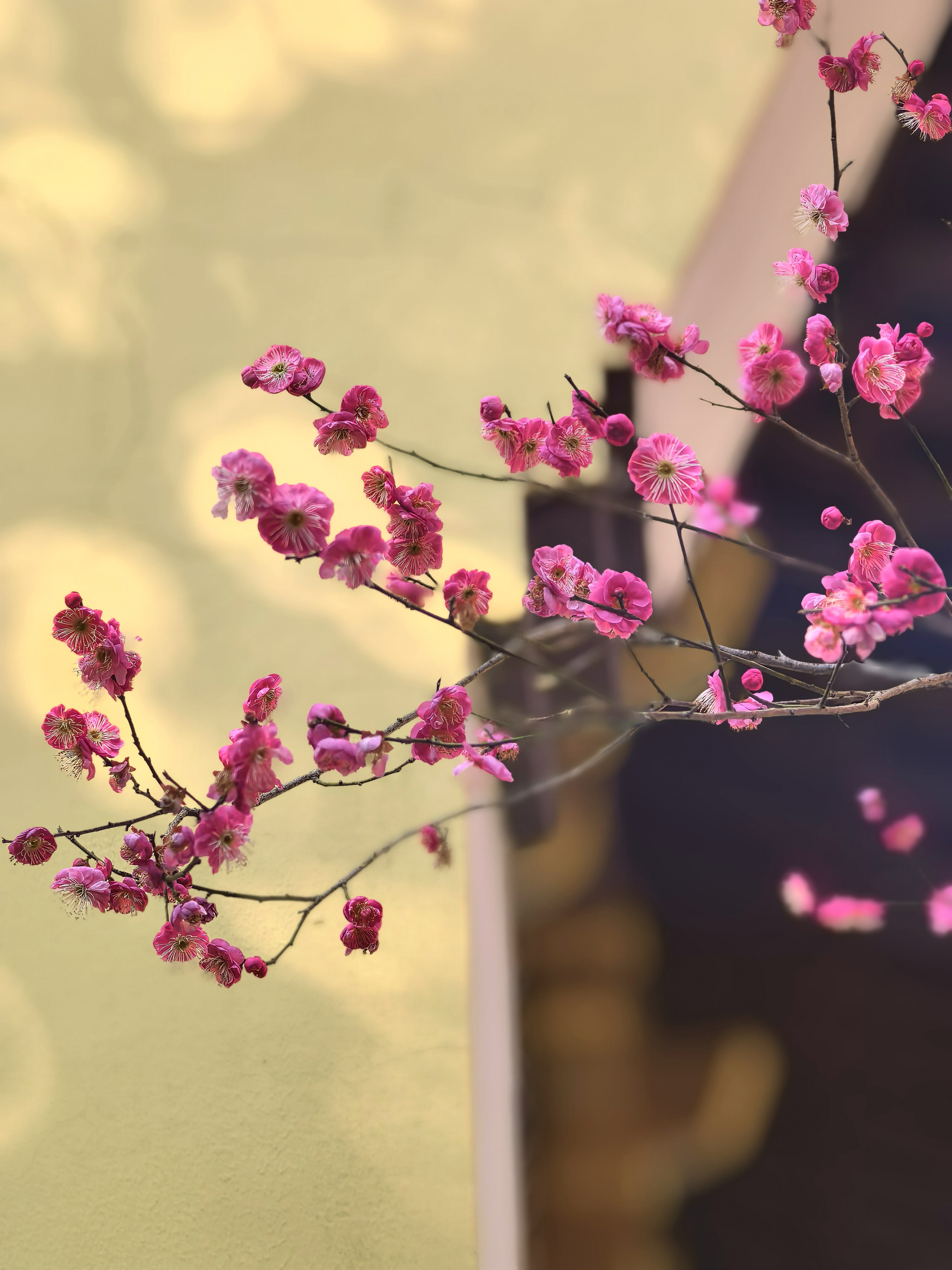 今天的慧因高丽寺,是一个朋友圈摄影大赛的热点秀场。平日里静谧的古寺内,游人如织。几株红梅生得摇曳多姿,如诗如画。 下午暖阳慵懒地漫过黄墙,在斑驳的光影中唤醒了一树的梅朵。虬枝如墨线,勾勒着风骨;繁花似绯云,灼灼然燃烧在檐角瓦当之畔。 飞檐翘角承载着时光的厚重;红梅轻颤,每一瓣都诉说着生命的鲜活。暗香浮于回廊之间,偶有游人仰首细嗅,或举镜凝眸,恨不得将这动人的绯红伴着禅寂一同收入自己的方寸之间。 古朴的永恒与绚烂的须臾,真的是相看两不厌,有时候静默也成为永恒。年年赏梅必拍地,这里算是相当出片的地方了!杭城赏梅之八慧因高丽寺。