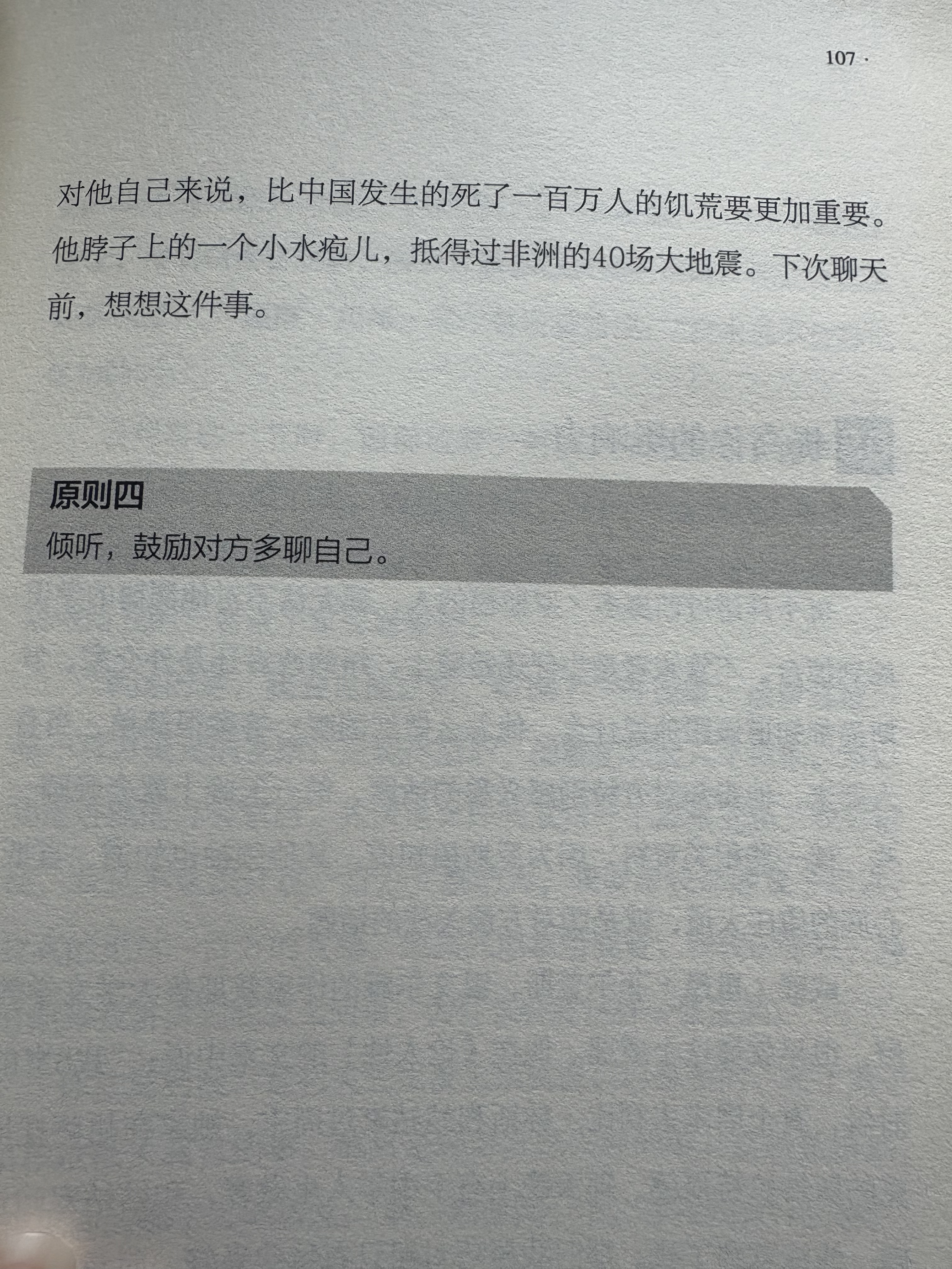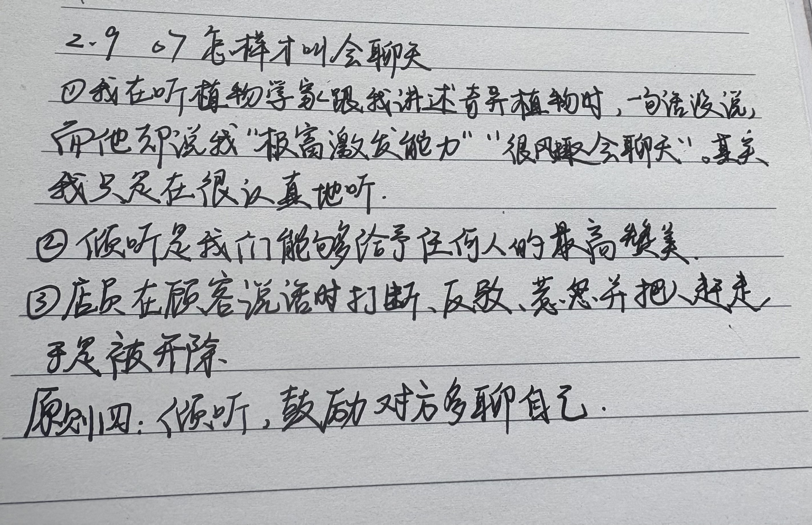 #人性的弱点# Day6 第二篇07怎样才叫会聊天? 我在听植物学家讲述奇异植物时,一句话没说。而他却说我极富激发能力?很风趣会聊天?其实我只是在很认真的听而已。 某店销售员在顾客说话时打断、反驳、惹怒他,并且把人赶走,于是此店员被开除。 生活中不会倾听的人也非常的多。有时候我想表达一个观点,对方一边说想听我跟他解释,一边又不给我留话口说,只是一味的表达自己的想法,这完全是不会聊天的表现。 当对方在跟你倾诉时,我们应该真诚安静地倾听并不时给予简短回应,这一点我从高中开始意识到就在改正了,这是做人最基本的尊重。倾听是我们能够给予任何人的最高赞美。 原则四:倾听,鼓励对方多聊自己