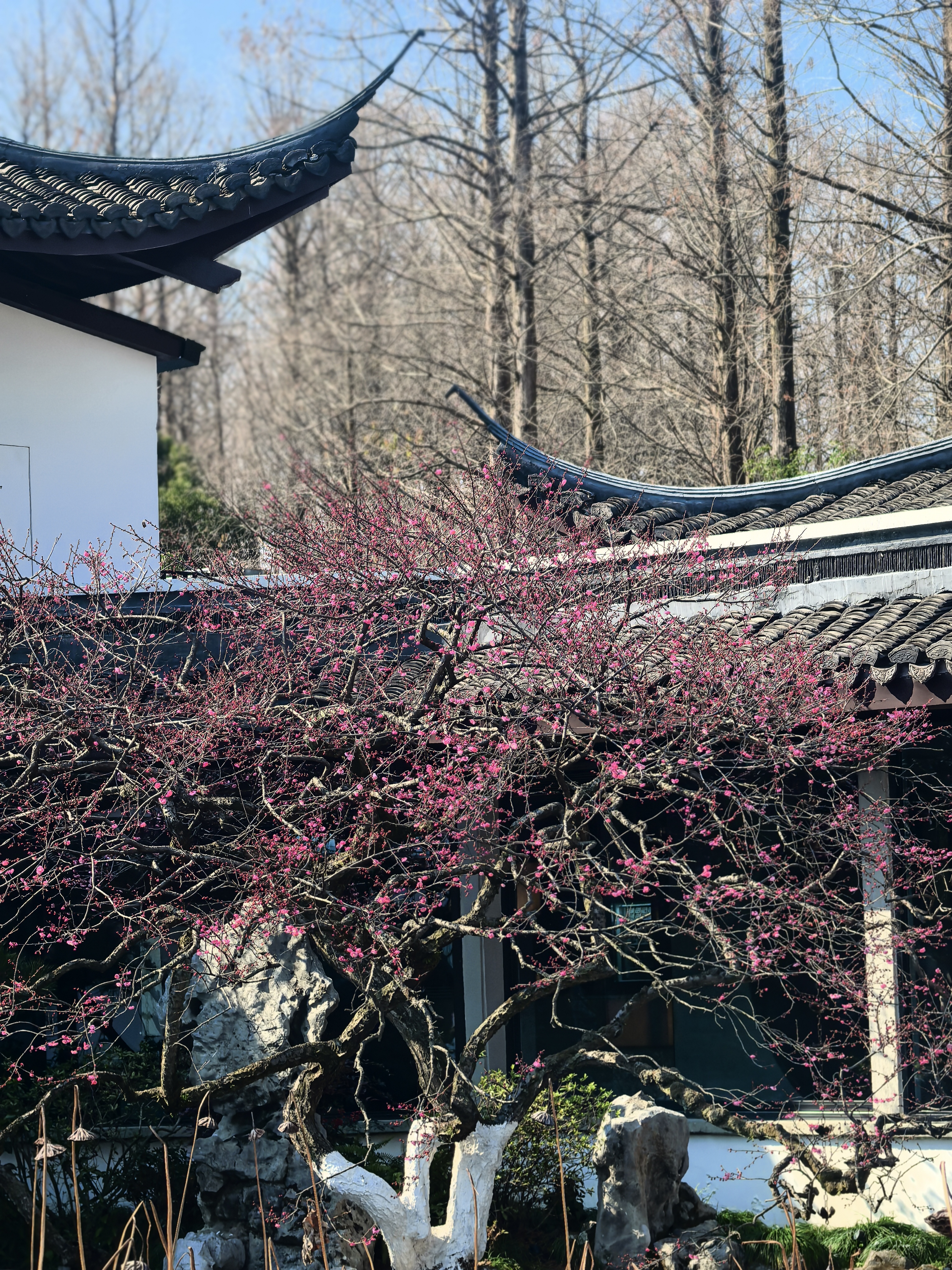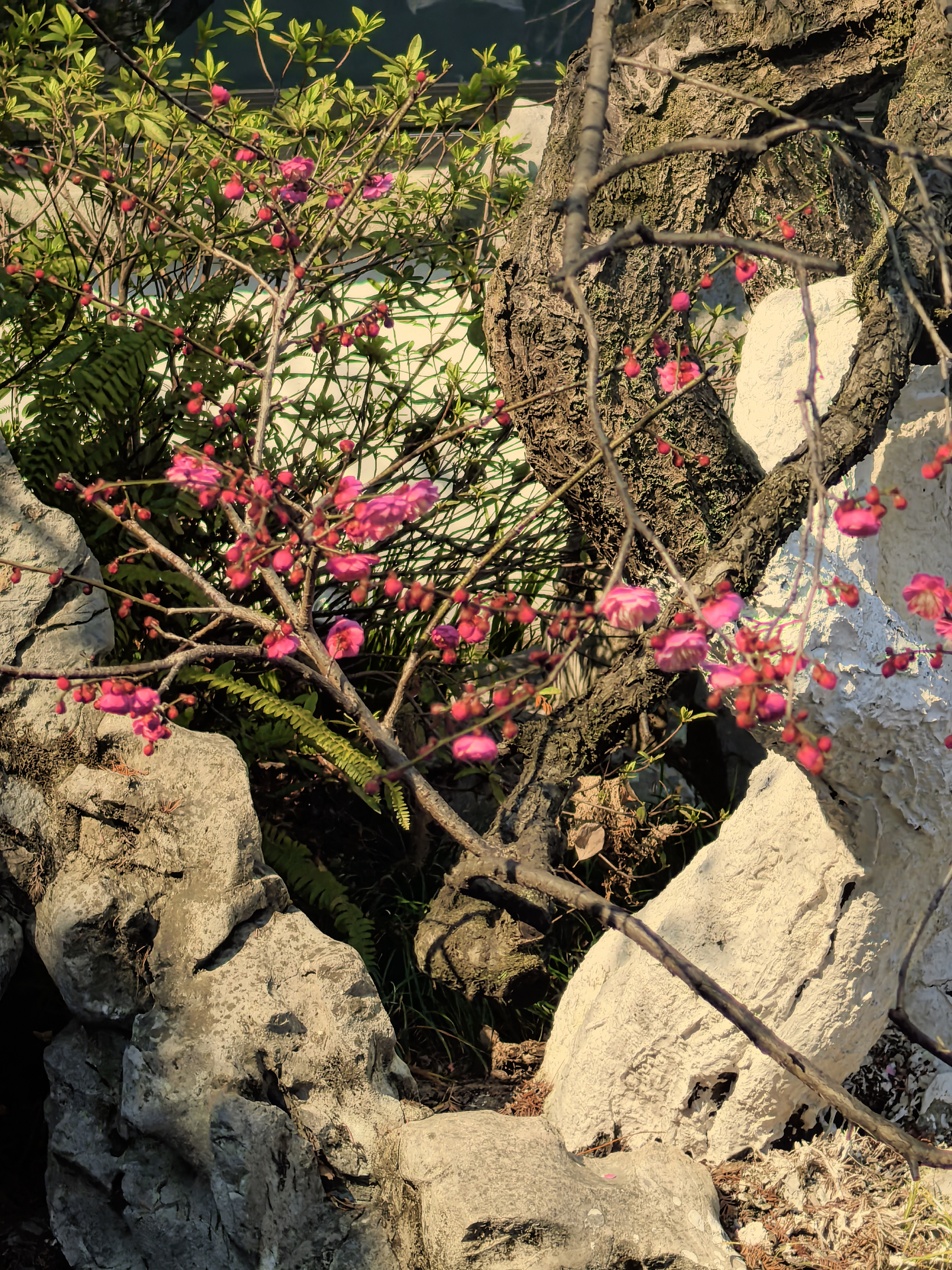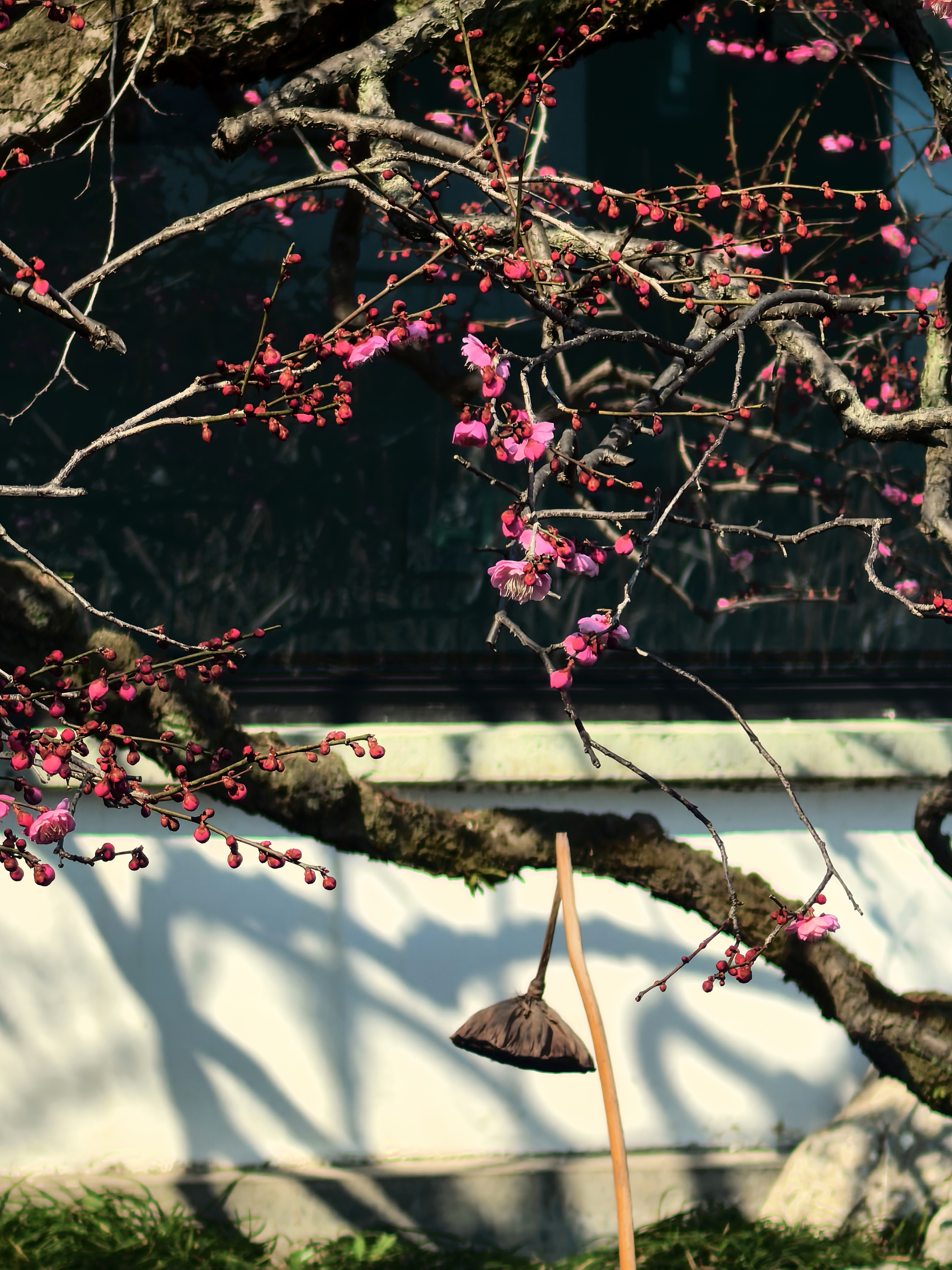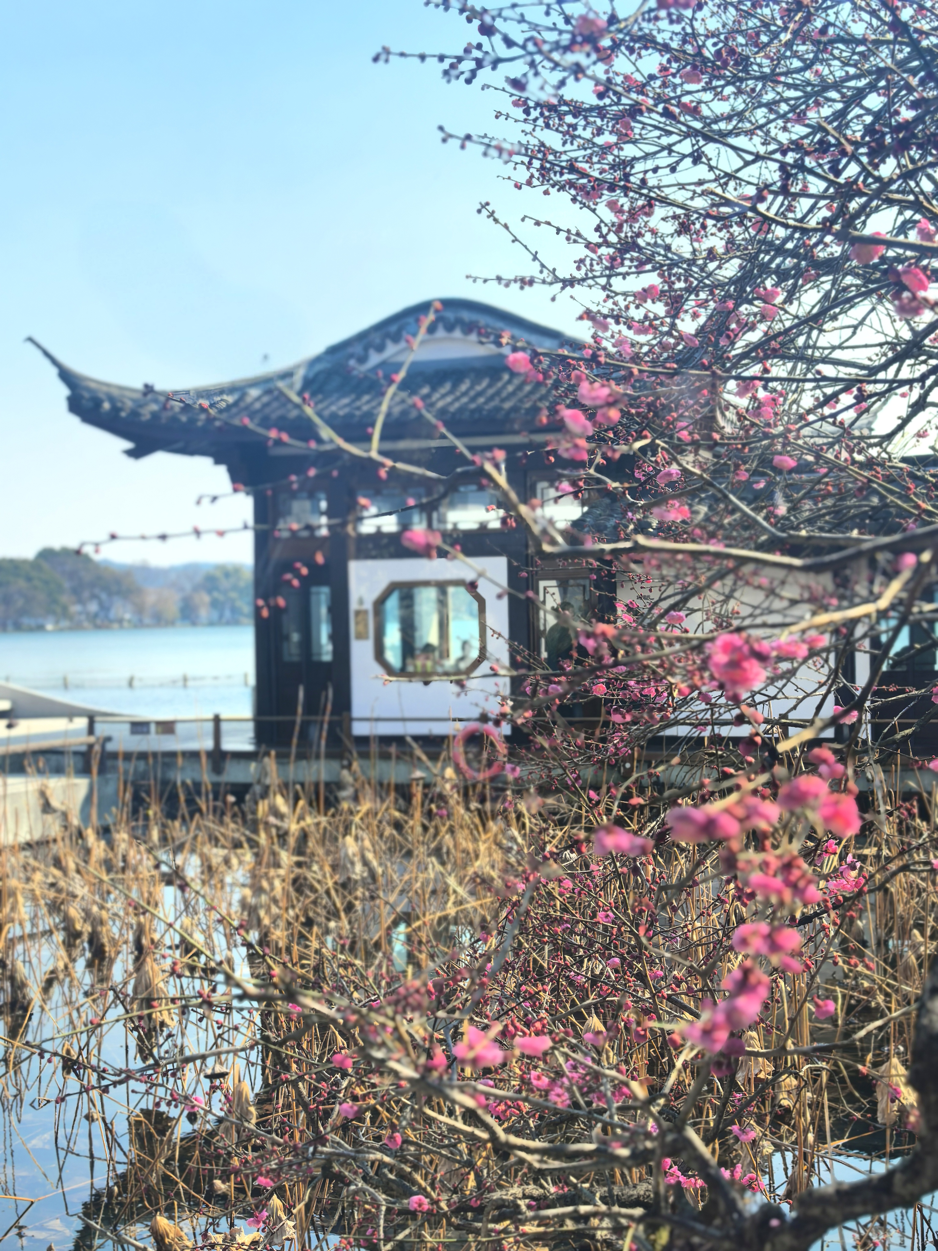 湛碧楼的红梅,是老明星了,经过杨公堤时经不住又进来看了一回。廊道上终究是镶了一层透亮的玻璃。拍花的人少了,镜头无从探出,闹猛的场景不再。 我却觉得这样也好,与梅之间,隔着一小片的枯荷,又隔着一层冰凉的琉璃,赏花的心情,反倒格外地淡定了。 梅枝越发地苍虬,墨黑的枝干盘曲着,像是把几十年的光阴都拧成倔强的筋脉。可梢头点染的红,却依旧是清丽的,疏疏落落地缀着,隔着玻璃望去,朦朦胧胧的,像美人迟暮后脸颊上未褪尽的胭脂痕。 前几年人在花下喧笑,楼上楼下都是赏花人,如今只剩梅影弯斜在崭新的走廊上,幽幽的,一段一段,都是旧岁的魂魄。 尽管听不到多少推杯换盏的声音。玻璃隔开的,何止是镜头?分明是两个空间,外头是摇曳的风景,里头是凝固的空气。而梅花,依然做着它淡红的梦。杭城赏梅之十二湛碧楼。