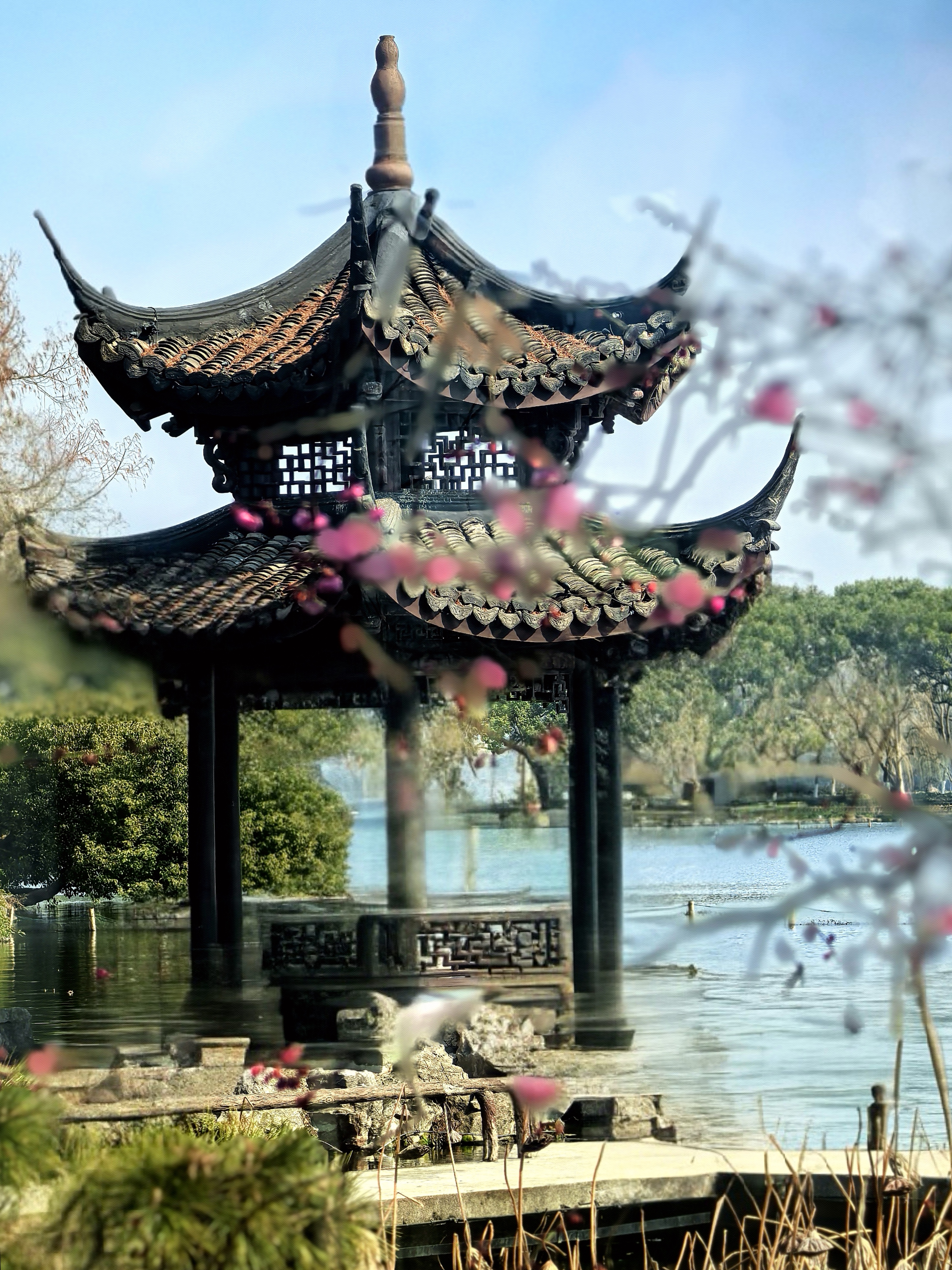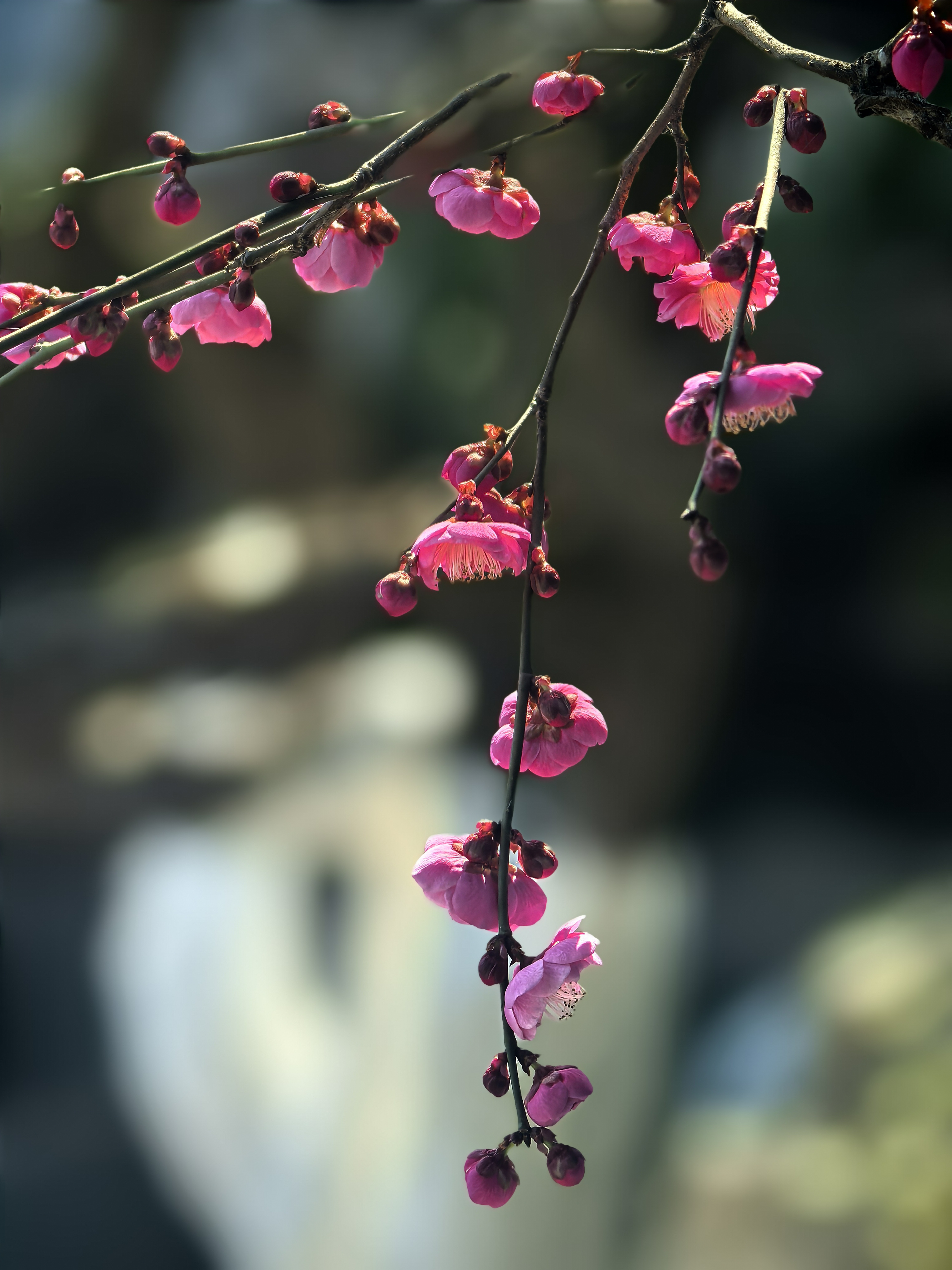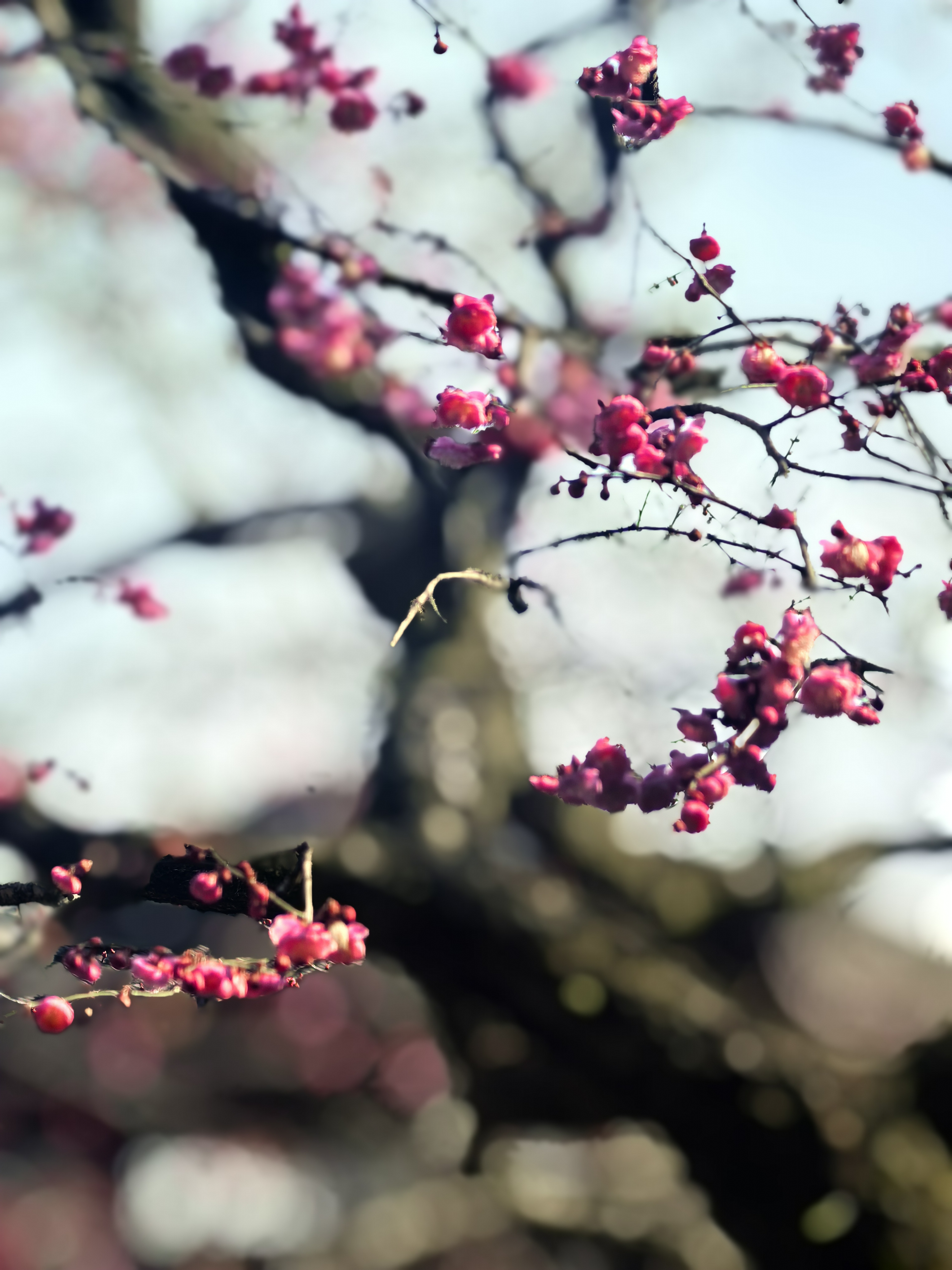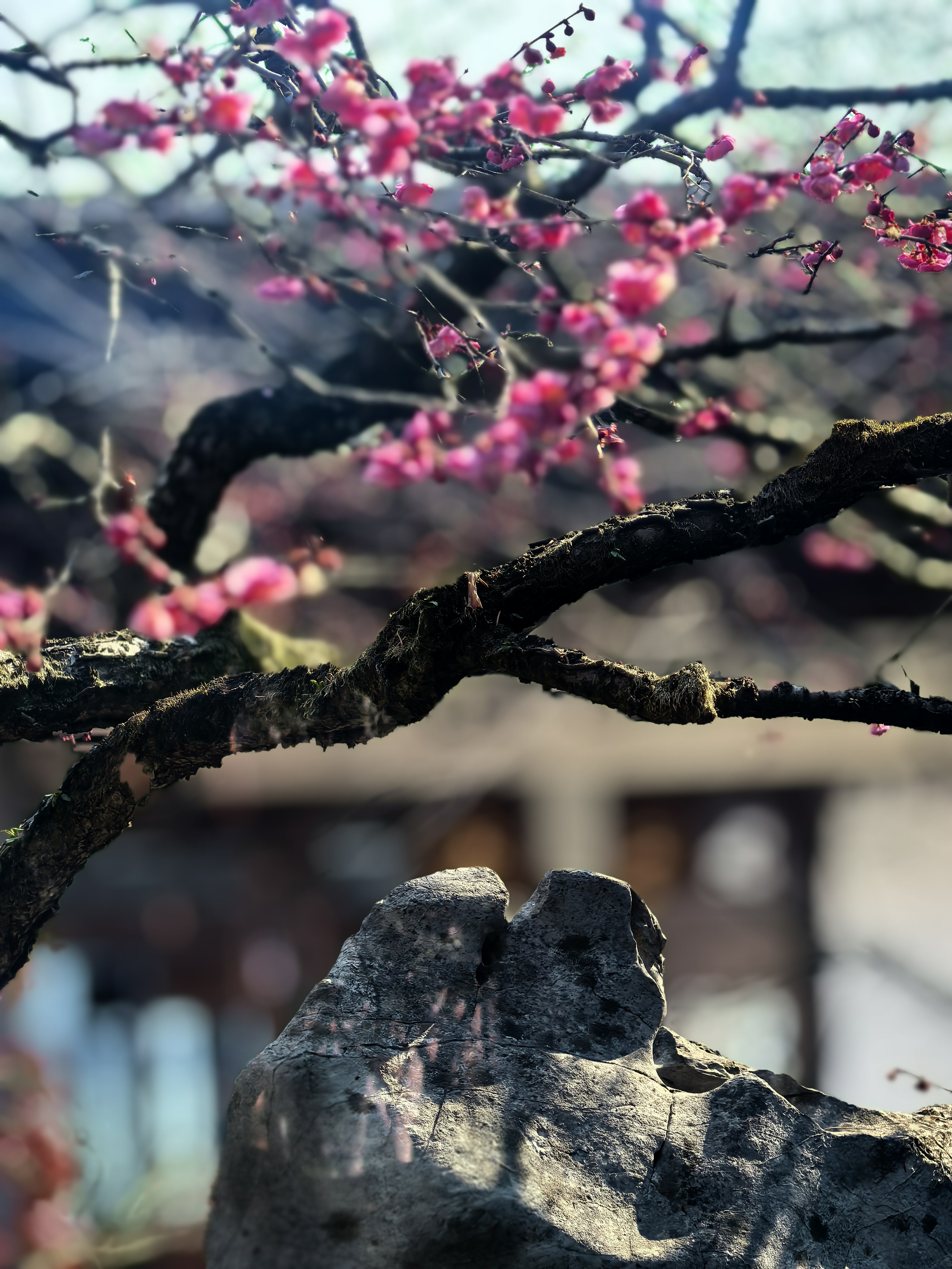 湛碧楼的红梅,是老明星了,经过杨公堤时经不住又进来看了一回。廊道上终究是镶了一层透亮的玻璃。拍花的人少了,镜头无从探出,闹猛的场景不再。 我却觉得这样也好,与梅之间,隔着一小片的枯荷,又隔着一层冰凉的琉璃,赏花的心情,反倒格外地淡定了。 梅枝越发地苍虬,墨黑的枝干盘曲着,像是把几十年的光阴都拧成倔强的筋脉。可梢头点染的红,却依旧是清丽的,疏疏落落地缀着,隔着玻璃望去,朦朦胧胧的,像美人迟暮后脸颊上未褪尽的胭脂痕。 前几年人在花下喧笑,楼上楼下都是赏花人,如今只剩梅影弯斜在崭新的走廊上,幽幽的,一段一段,都是旧岁的魂魄。 尽管听不到多少推杯换盏的声音。玻璃隔开的,何止是镜头?分明是两个空间,外头是摇曳的风景,里头是凝固的空气。而梅花,依然做着它淡红的梦。杭城赏梅之十二湛碧楼。