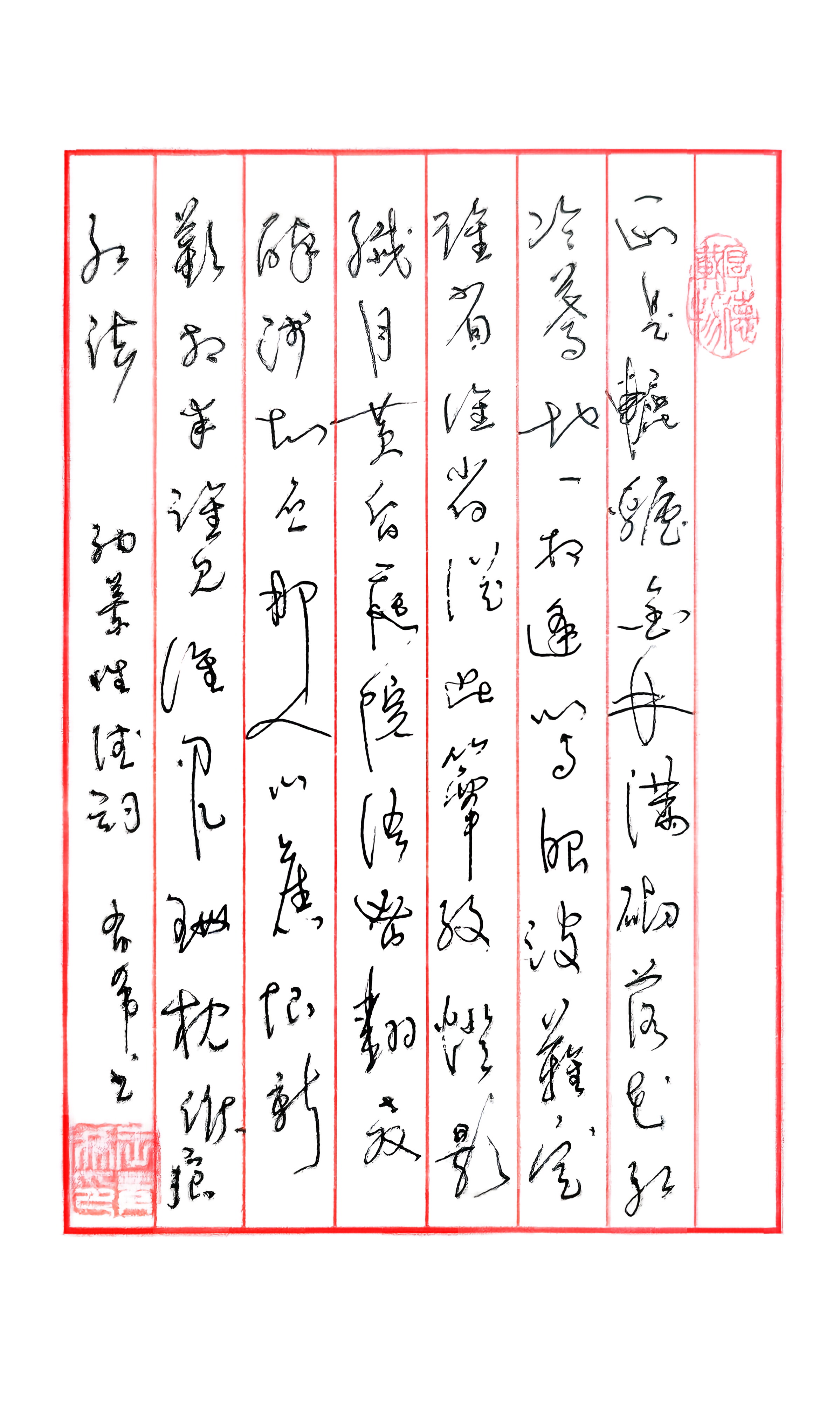 本人书法赏析之4 这幅硬笔草书,以纳兰性德作品为底,在红格信笺上晕染出别样的古典意趣。 线条如游丝般柔韧,却又暗藏劲骨,提按间将硬笔的爽利与草书的流转巧妙调和。字势或敛或放,气脉贯通,红格与朱印的点缀,让整幅作品在奔放中不失雅致。 难得的是,书写者并未刻意摹古,而是以己意运笔,将词中“谁念西风独自凉”的孤寂,化为笔下的沉郁悠远,让观者既能品到词的凄婉,亦能感受到书者独特的情感投射,可谓“词为心曲,书为心声”。