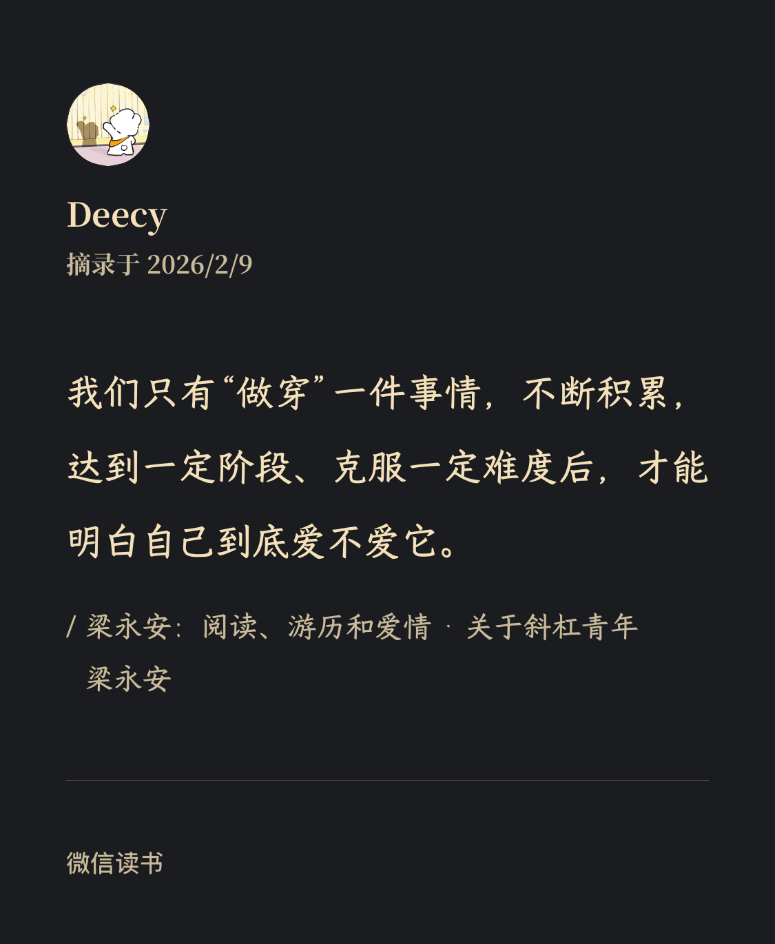 只有做穿一件事情,不断积累,达到一定程度,克服一定困难后,才能明白自己到底爱不爱它。