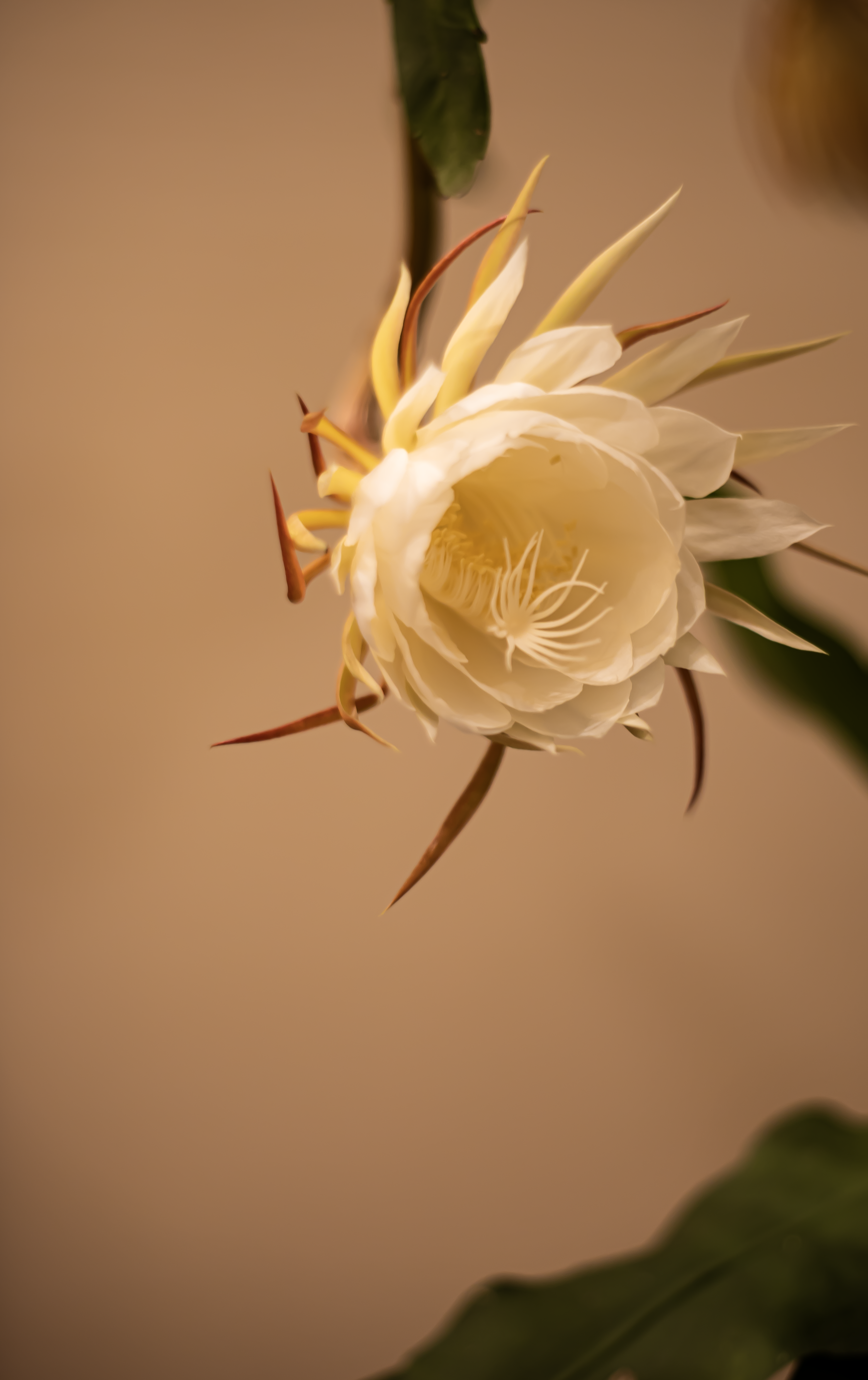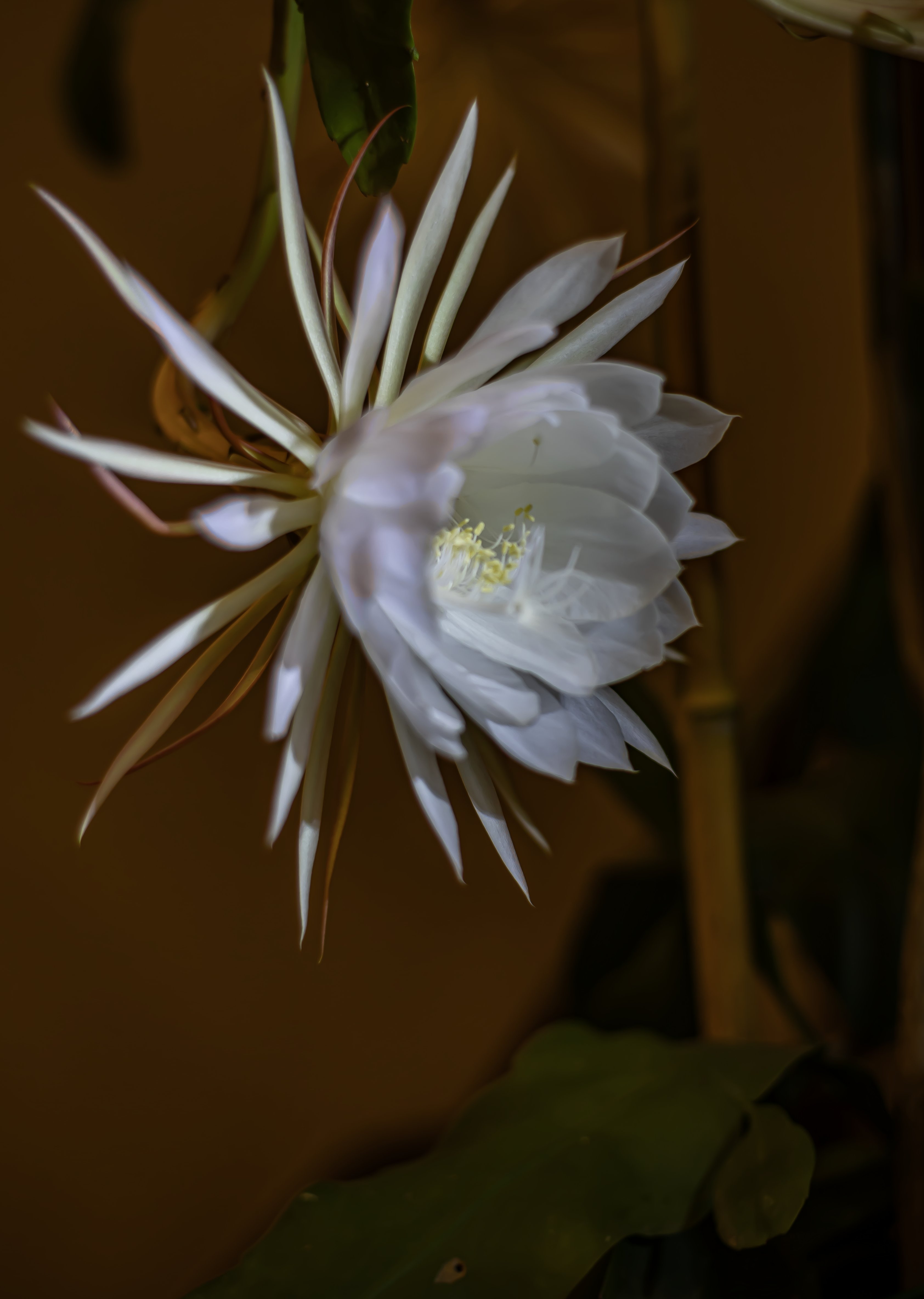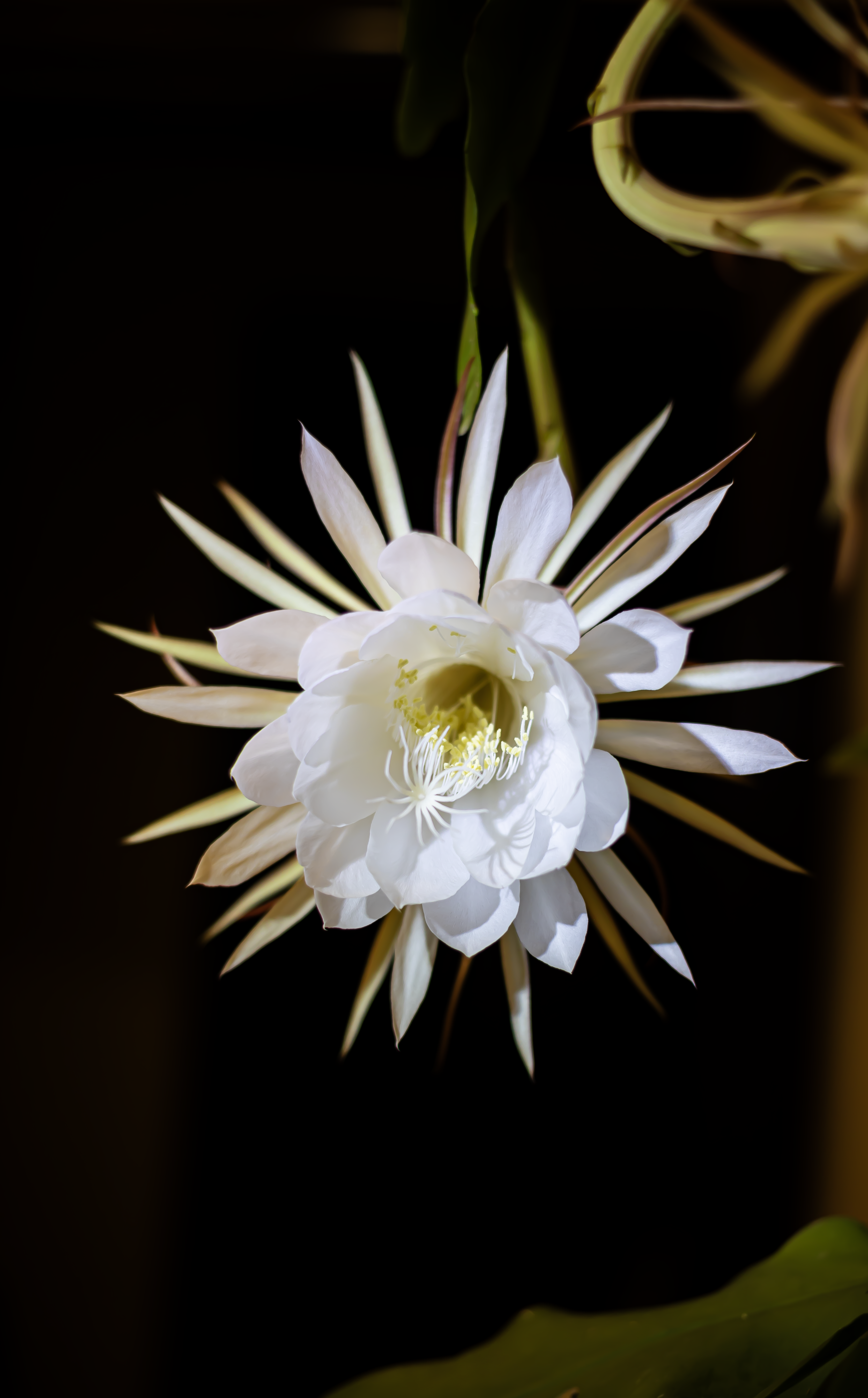 夜色渐浓,昙花悄然初绽。洁白花瓣层叠舒展,花蕊纤毫毕现,在柔光里浮出清绝轮廓。深色背景如墨,衬得这仙人掌科的月下精灵更显孤高。绿叶静垂,托住整场寂静的盛放——原来最惊心动魄的绽放,往往发生在无人注视的深夜。