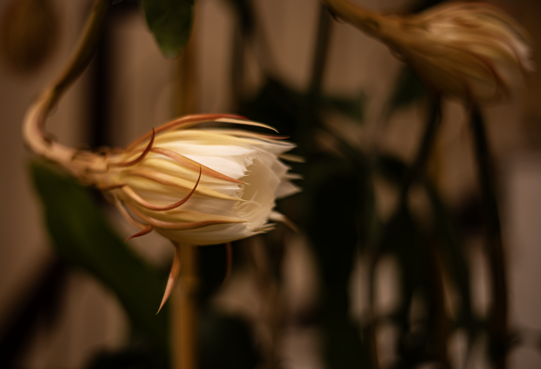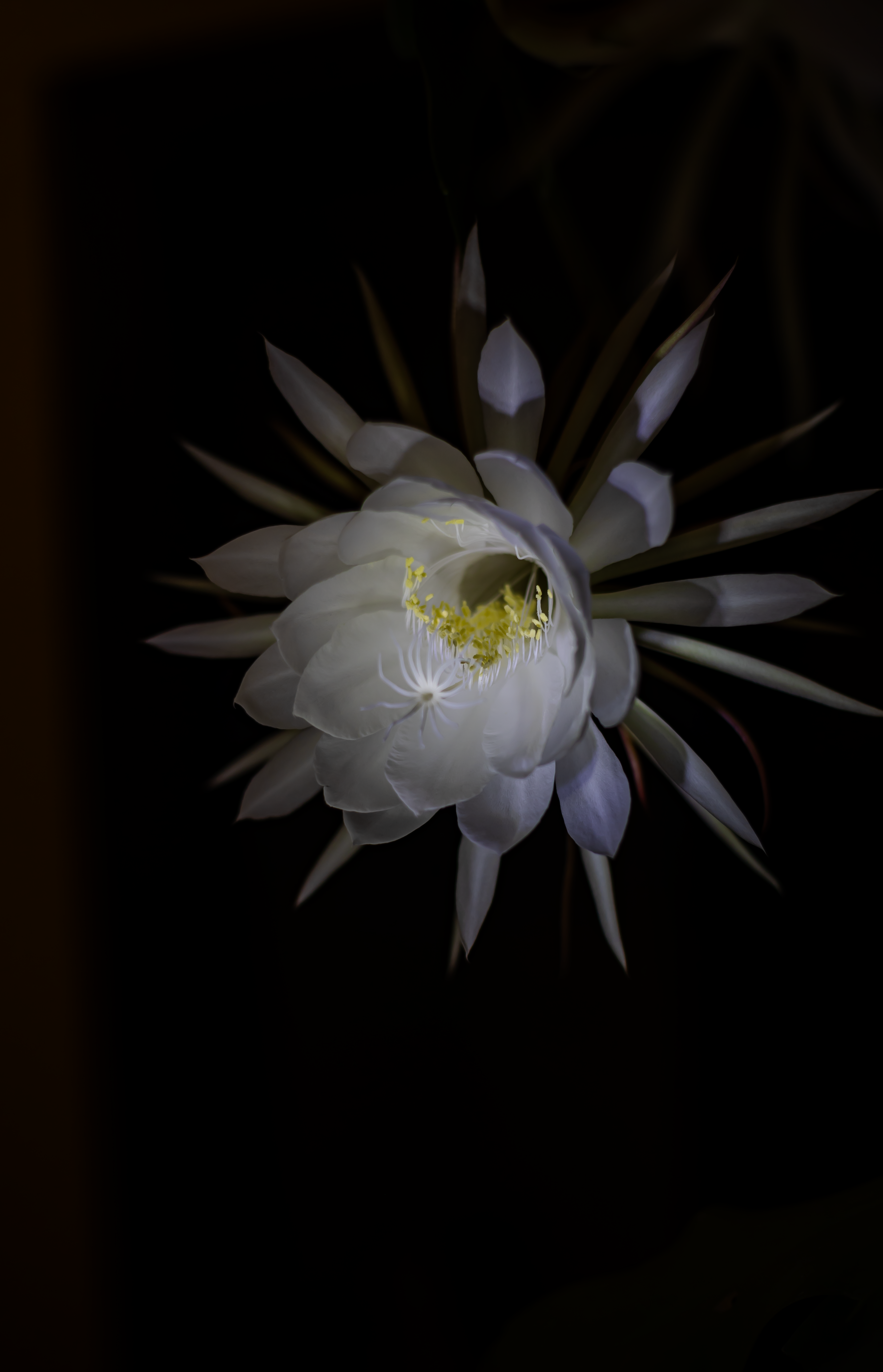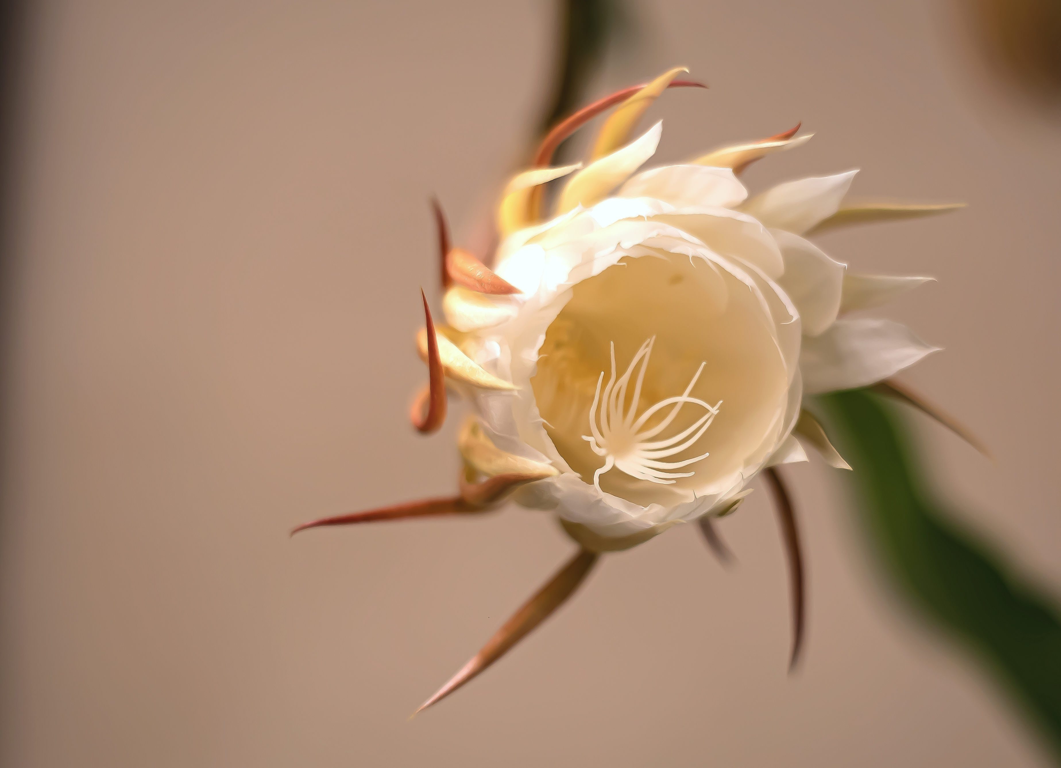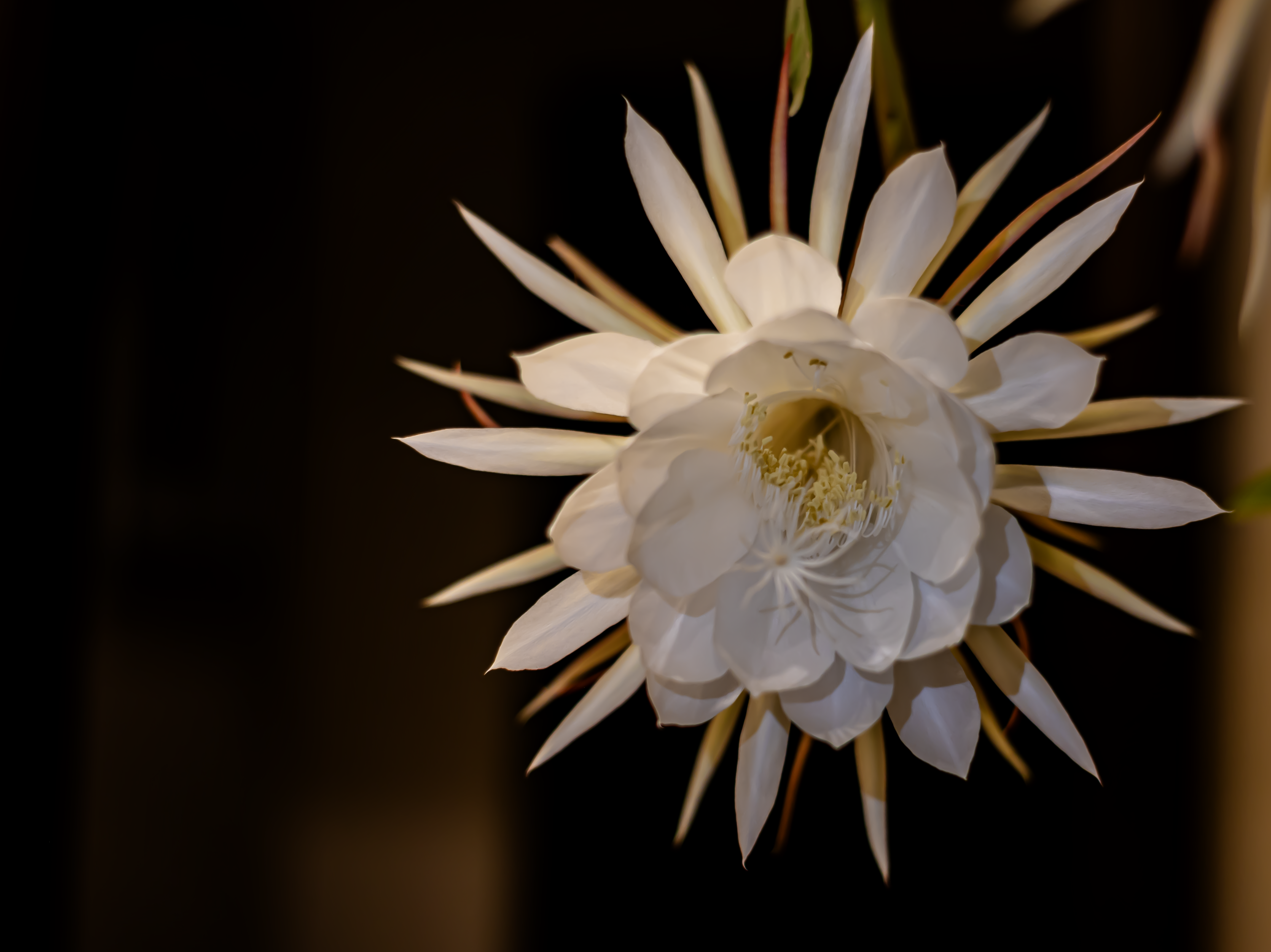 夜色渐浓,昙花悄然初绽。洁白花瓣层叠舒展,花蕊纤毫毕现,在柔光里浮出清绝轮廓。深色背景如墨,衬得这仙人掌科的月下精灵更显孤高。绿叶静垂,托住整场寂静的盛放——原来最惊心动魄的绽放,往往发生在无人注视的深夜。