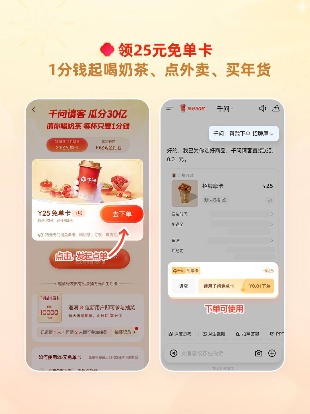 易烊千玺邀你上千问AI购物 感谢易烊千玺的安利让我年前过上好日子了~已经邀请好多人上千问领25元免单卡了,现在办公室的下午茶全是千问安排的!而且自从用了千问后,不说能省钱,连工作效率都变高了,调研资料,梳理框架什么都能做,真的,感谢千玺和千问提前让我们过大年了~ 千问免单