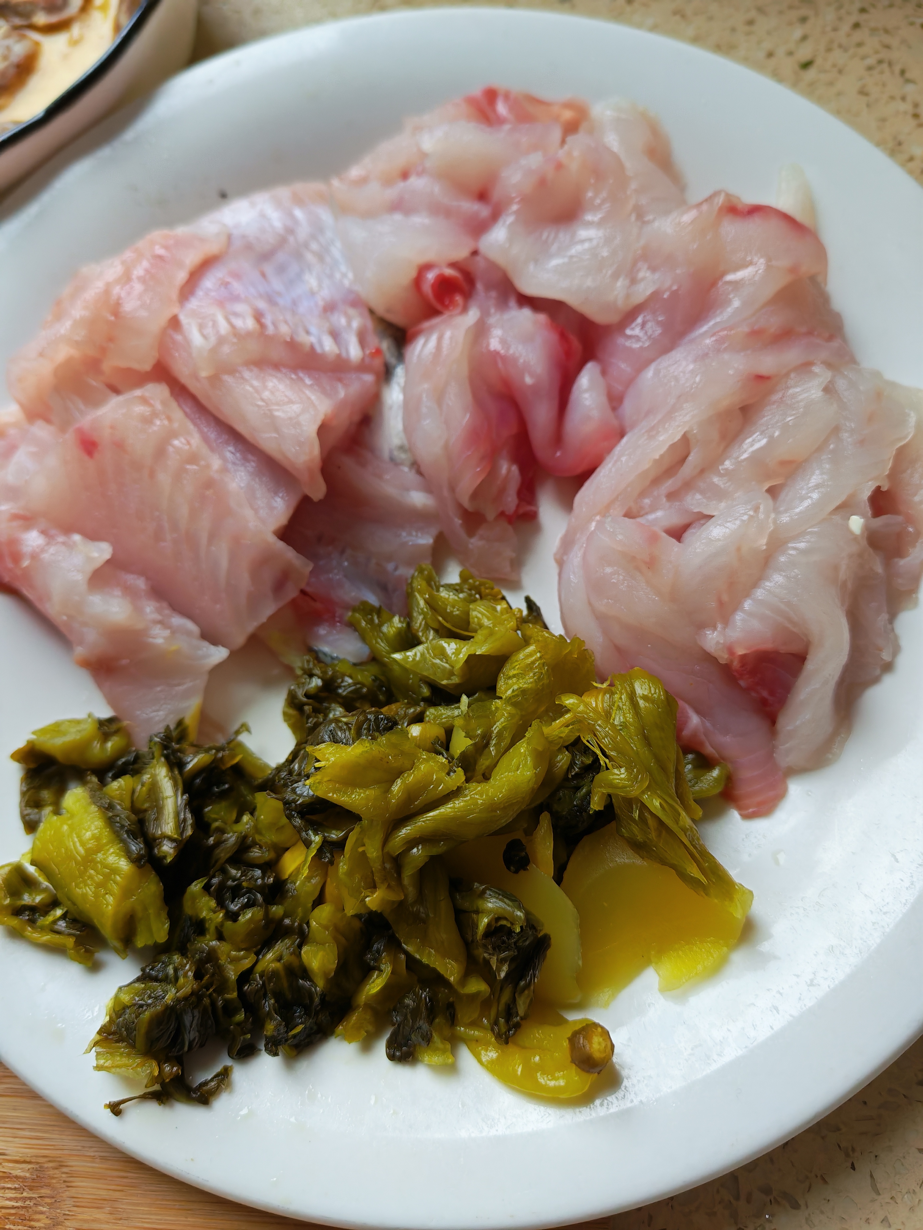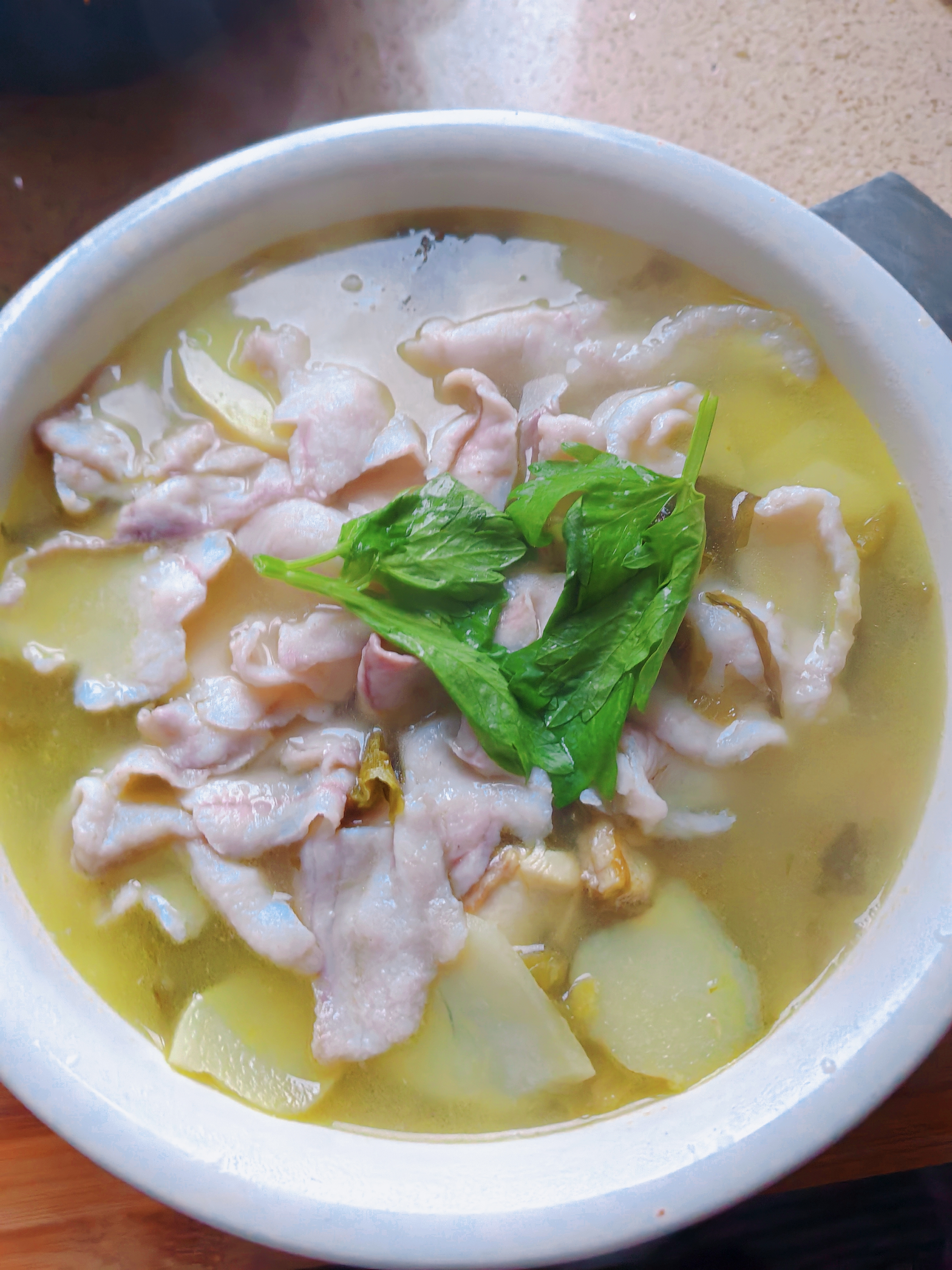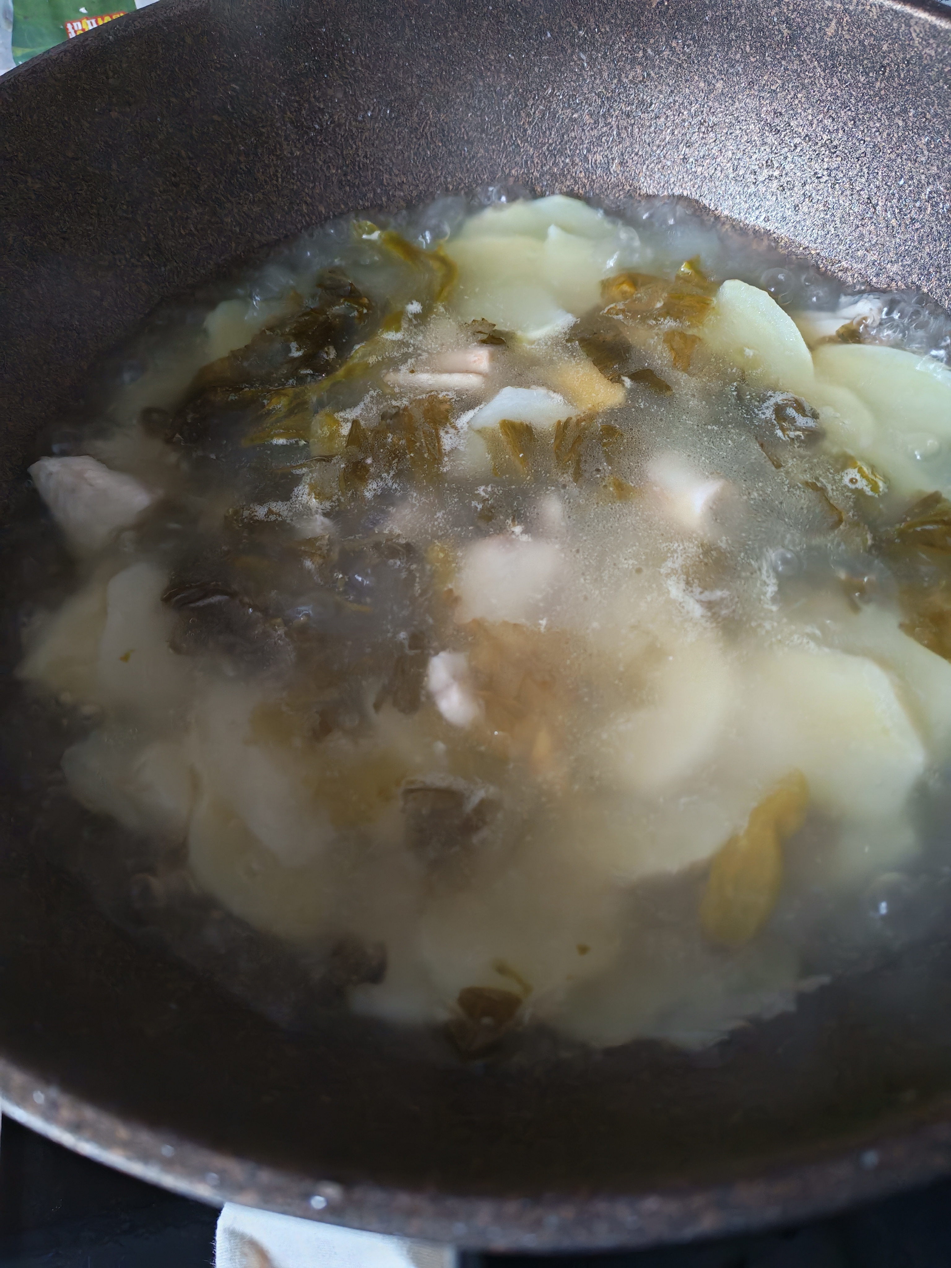 酸菜土豆鱼片|鲜酸开胃,鱼片滑嫩超下饭 一口滑嫩鱼片,一口绵密土豆,酸菜的鲜酸裹着鱼肉的鲜甜,家常又入味,零失败快手硬菜! 详细做法步骤 1. 食材预处理 酸菜切成细丝,土豆切薄片清水冲洗沥干,黑鱼肉片成薄片,加少许盐、料酒、淀粉、蛋清抓匀上浆腌制10分钟,鱼骨切段备用。 2. 煎骨炒香底 锅中热油,放入鱼骨小火煎至两面微黄,下入土豆片翻炒片刻,再放入切好的酸菜丝炒出酸香。 3. 煮底汤入味 往锅中加入足量开水,大火煮沸后转中火煮至土豆绵软、汤底鲜浓,将鱼骨、土豆、酸菜捞出装入碗中。 4. 滑鱼片出锅 另起一锅烧开水,把浆好的鱼片分散下入,煮至鱼片变白卷曲立刻捞出,铺在碗中食材上,可淋少许热油激香即可。