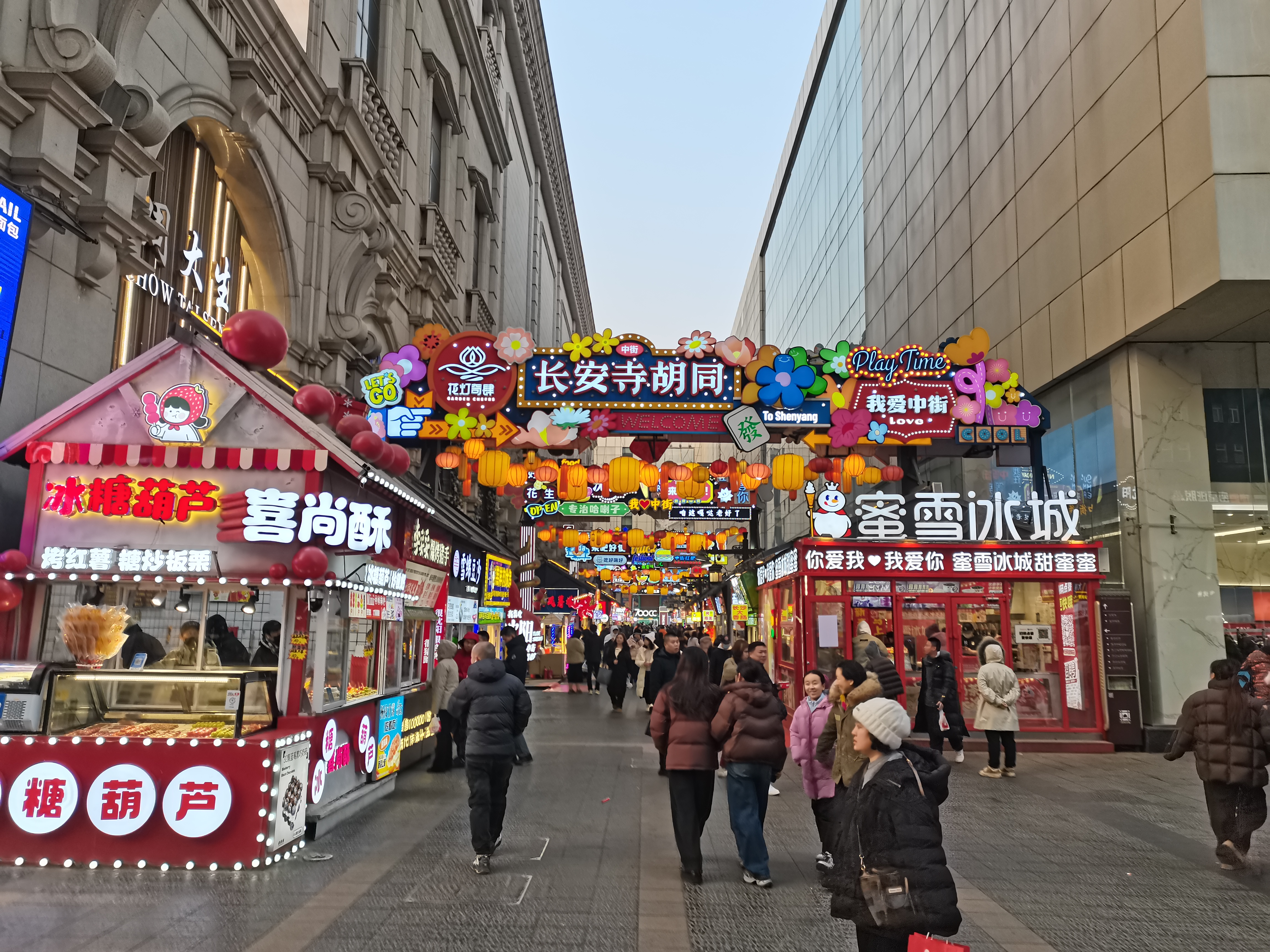 沈阳的冬日寒风凛冽,中街长安寺胡同却暖意融融。行人裹着厚羽绒服穿梭在红灯笼下,冰糖葫芦的甜香在冷空气中格外诱人,蜜雪冰城的招牌在暮色里亮着,天虽冷,却挡不住这满街的年味儿与烟火气。