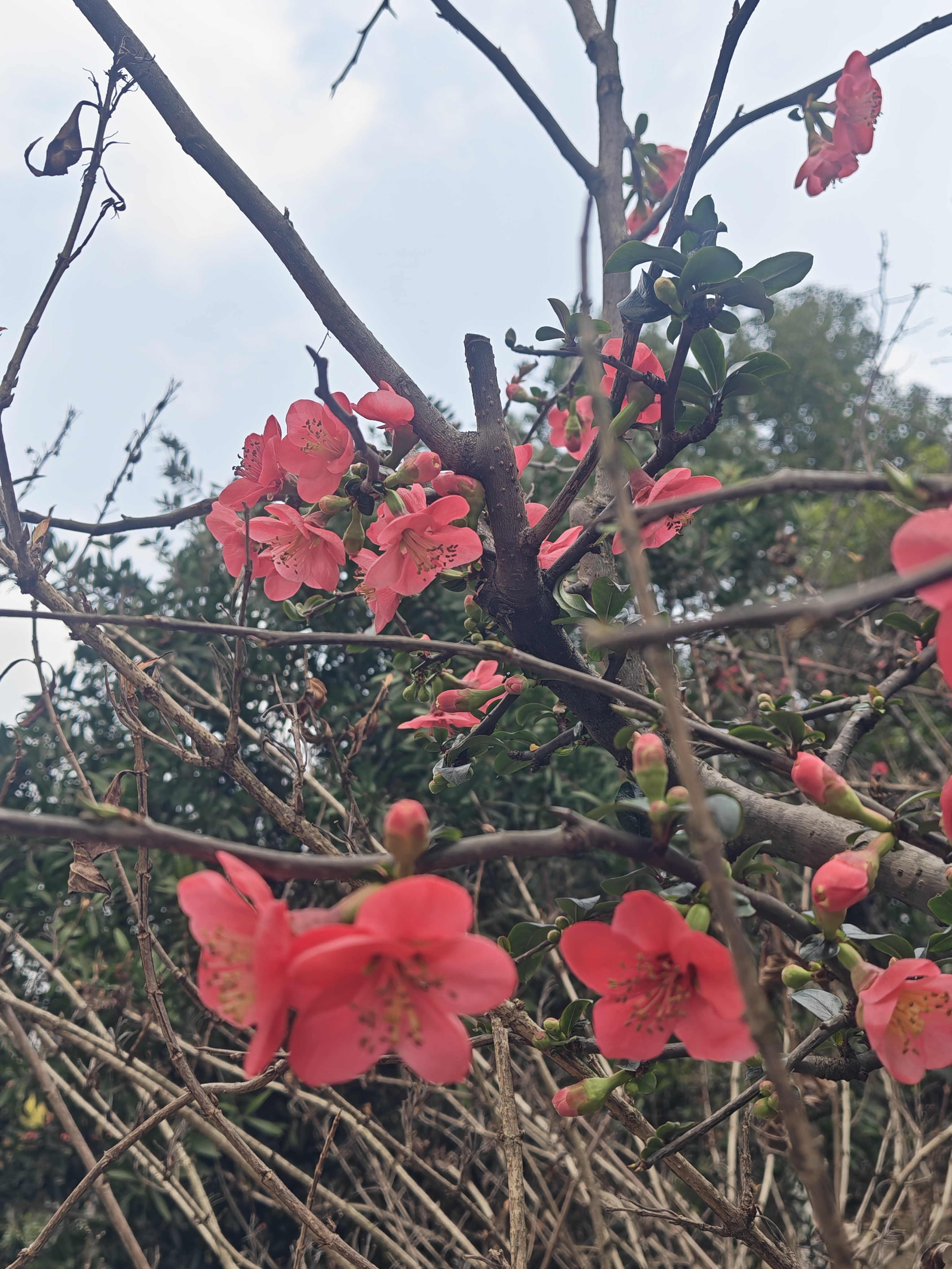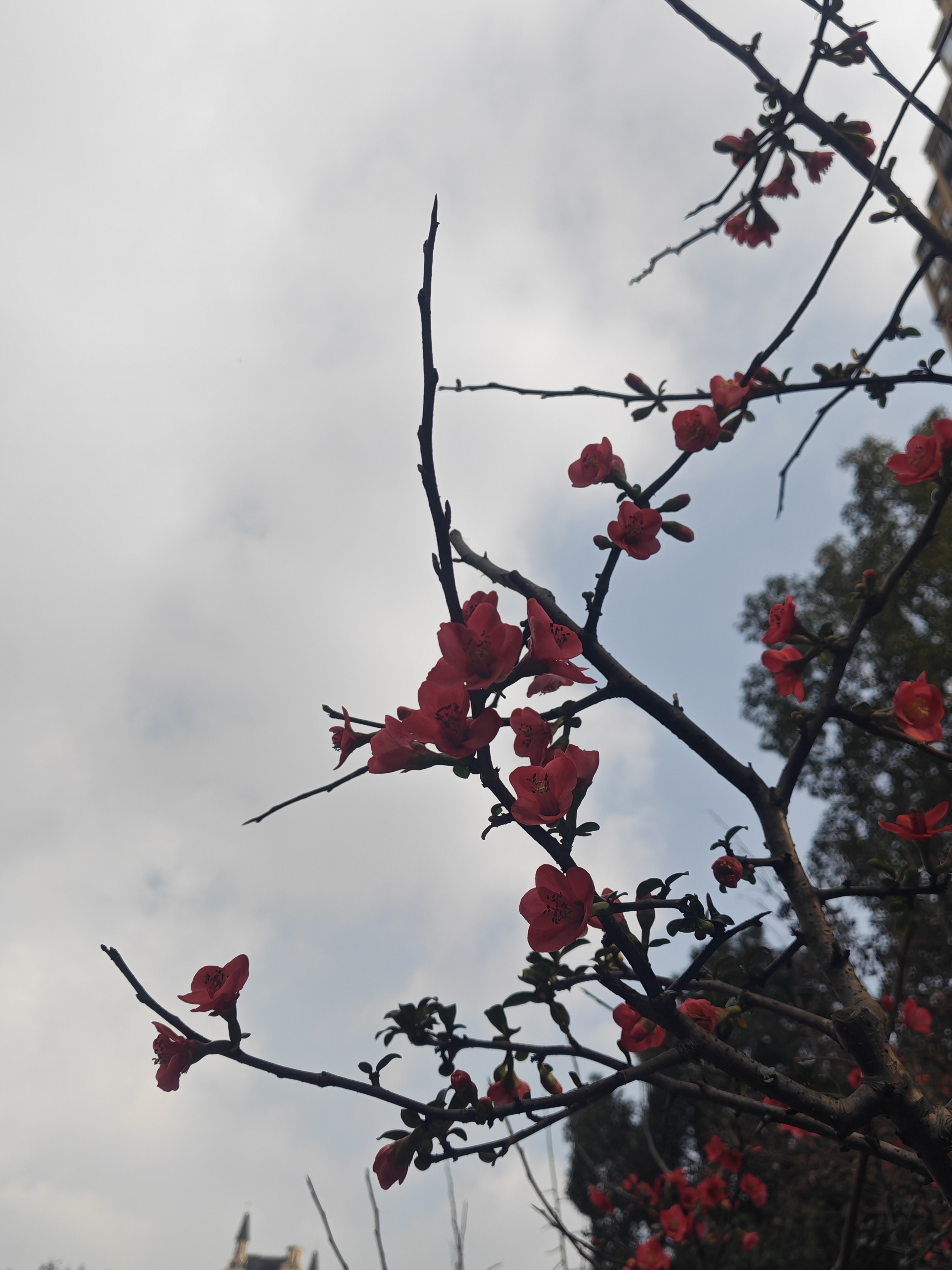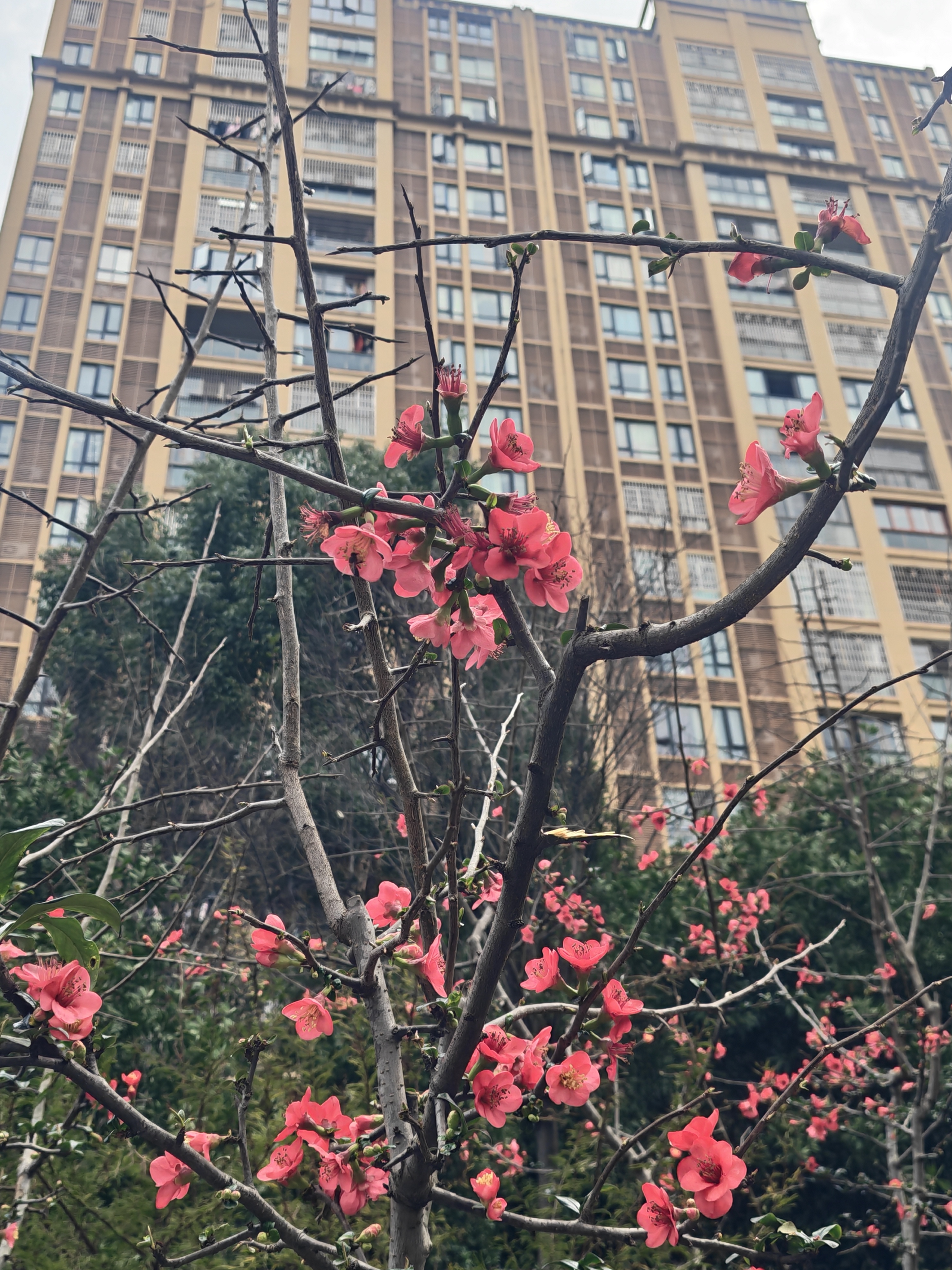 春日阴云下,沱江畔的贴梗海棠红得静默而热烈,花枝轻颤,仿佛在低语一段未寄出的情书。