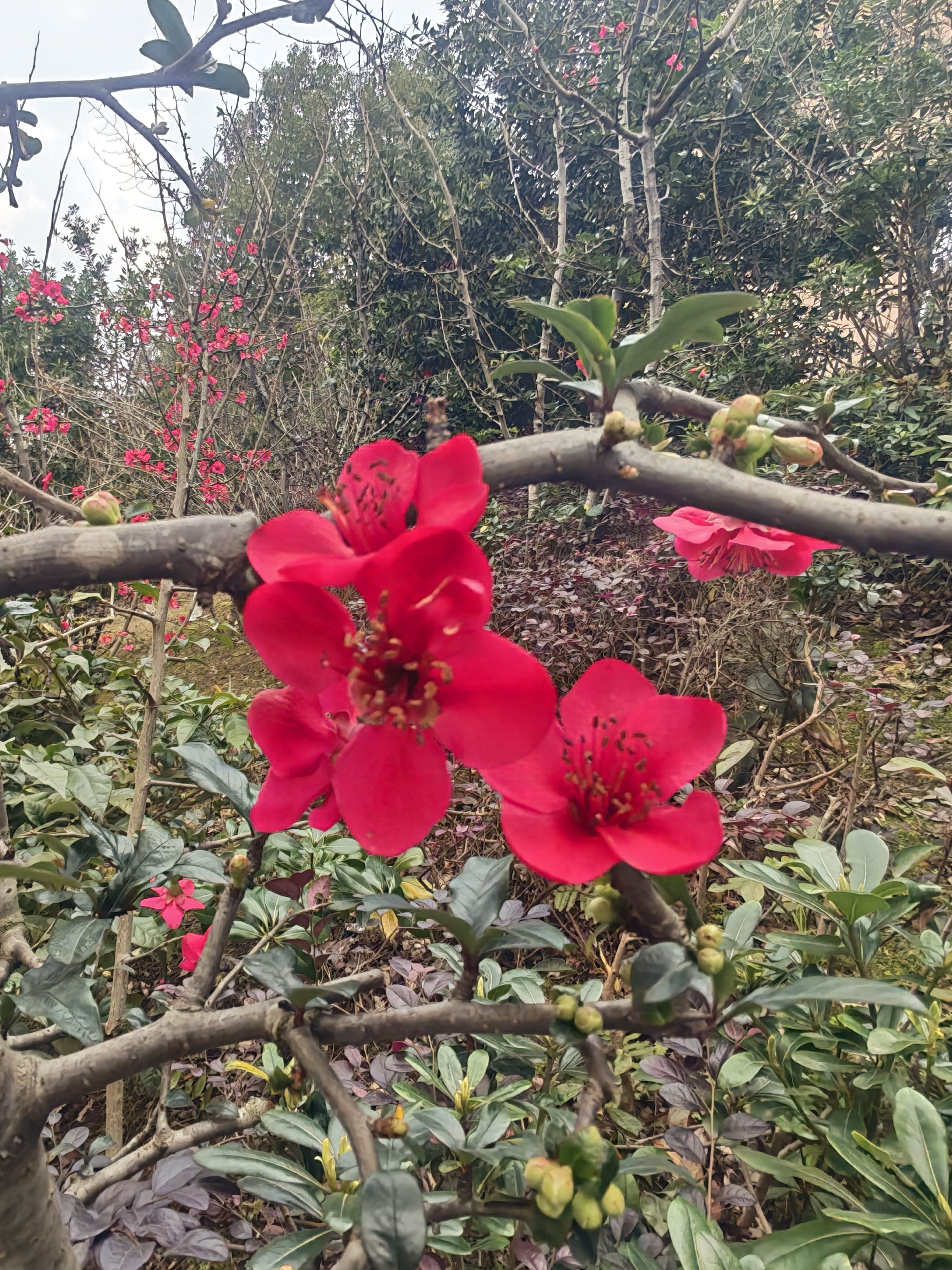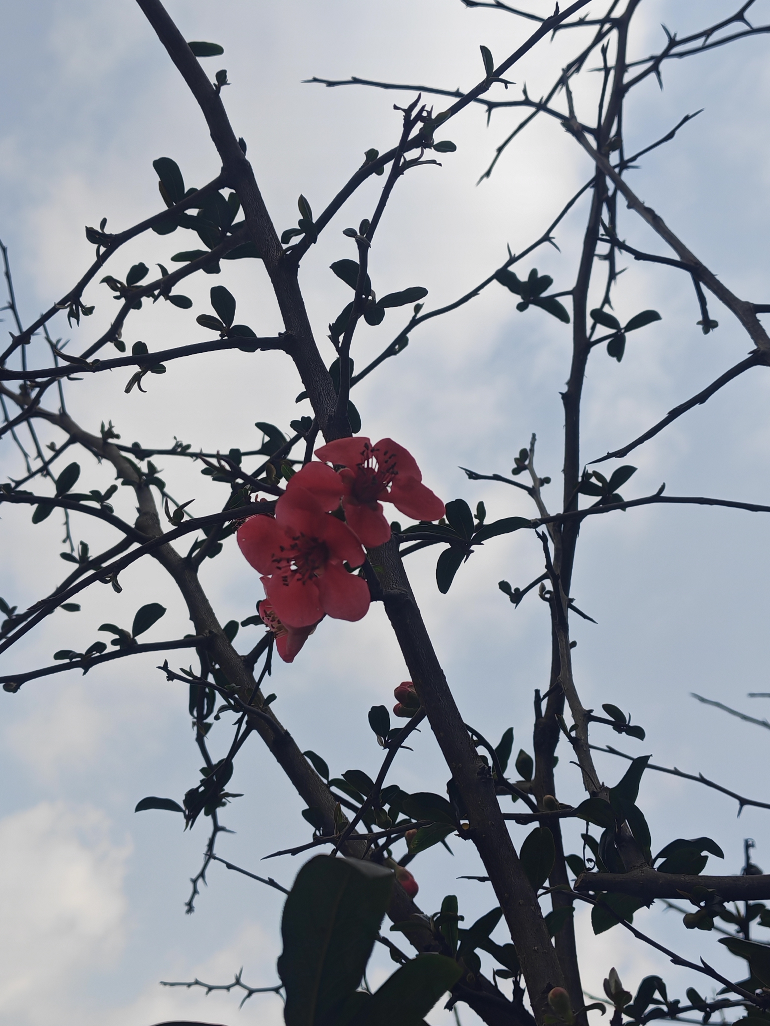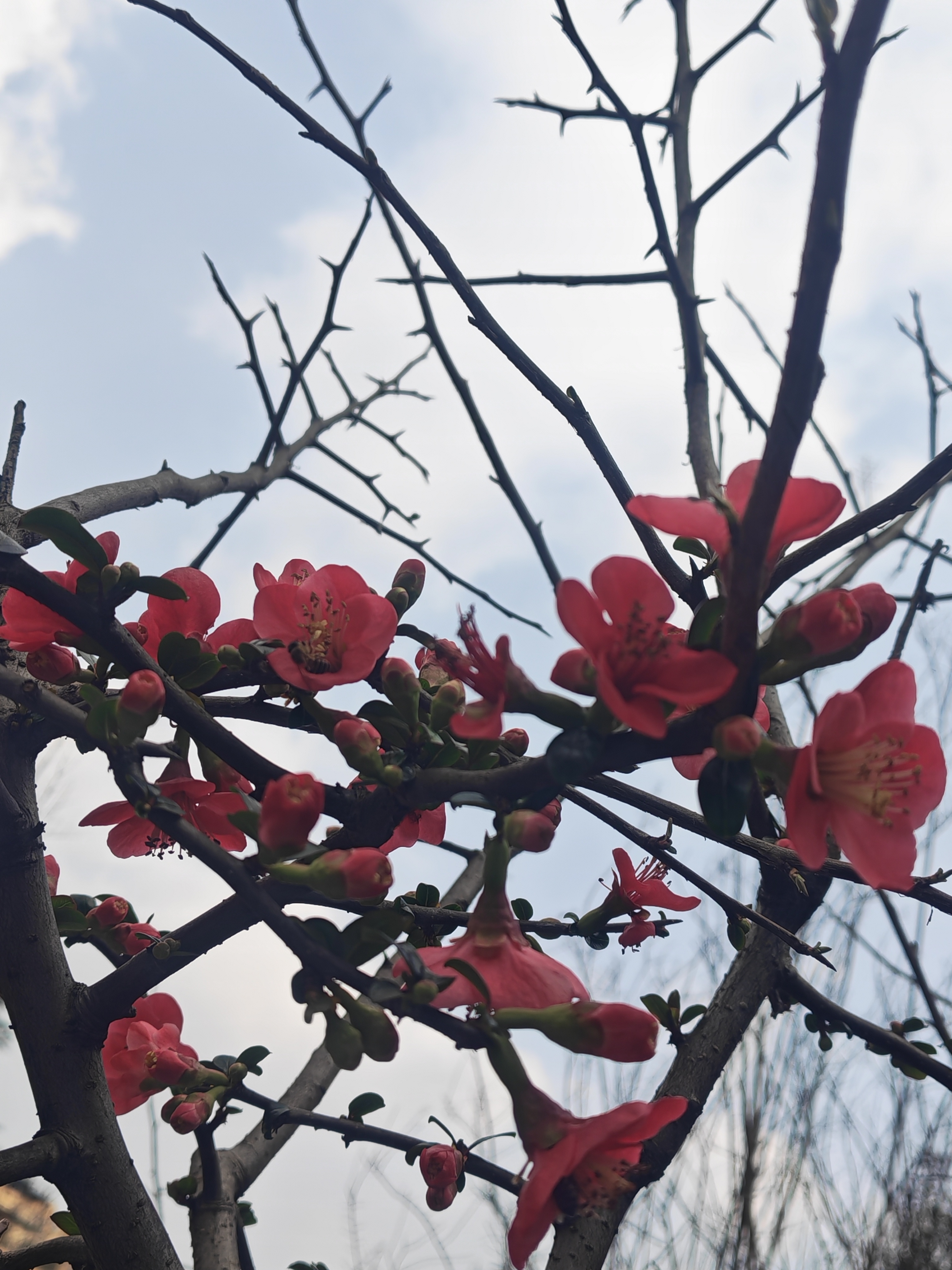 春日阴云下,沱江畔的贴梗海棠红得静默而热烈,花枝轻颤,仿佛在低语一段未寄出的情书。