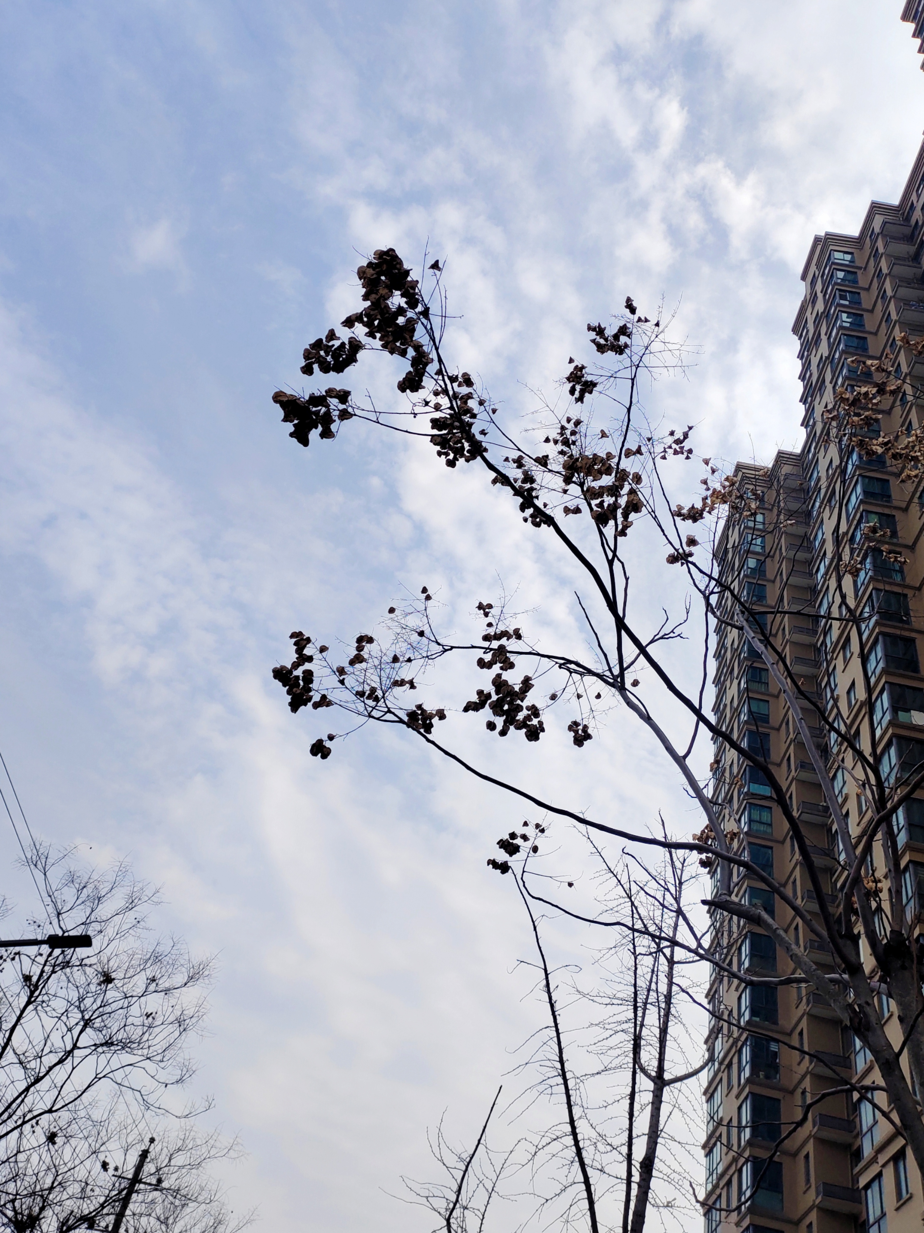 冬日街头,枯枝挂果,与蓝天白云下的高楼群撞个满怀~城市天际线里藏着小确幸✨