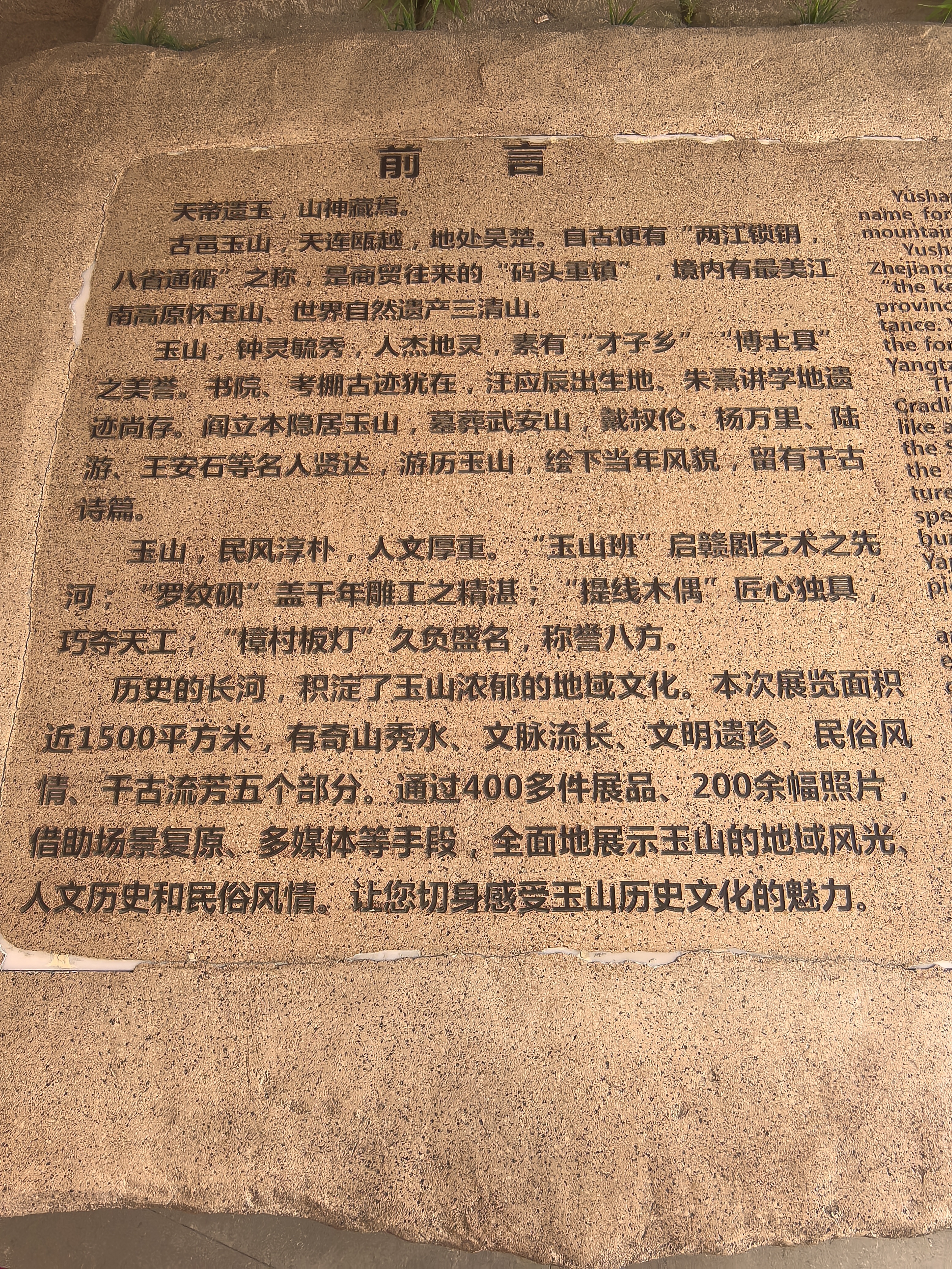 天帝遗玉,山神藏焉。 古邑玉山,天连瓯越,地处吴楚。自古便有“两江锁钥,八省通衢”之称,是商贾往来的“码头重镇”,境内有最美江南高原怀玉山、世界自然遗产三清山。 玉山,钟灵毓秀,人杰地灵,素有“才子乡”“博士县”之美誉。书院、考棚古迹犹在,汪应辰出生地、朱熹讲学地遗迹尚存。阎立本隐居玉山,墓葬武安山,戴叔伦、杨万里、陆游、王安石等名人贤达,游历玉山,绘下当年风貌,留有千古诗篇。 玉山,民风淳朴,人文厚重。“玉山班”启赣剧艺术之先河;“罗纹砚”盖千年雕工之精湛;“提线木偶”匠心独具,巧夺天工;“樟村板灯”久负盛名,称誉八方。 历史的长河,积淀了玉山浓郁的地域文化。本次展览面积近1500平方米,有奇山秀水、文脉流长、文明遗珍、民俗风情、千古流芳五个部分。通过400多件展品、200余幅照片,借助场景复原、多媒体等手段,全面地展示玉山的地域风光、人文历史和民俗风情。让您切身感受玉山历史文化的魅力。