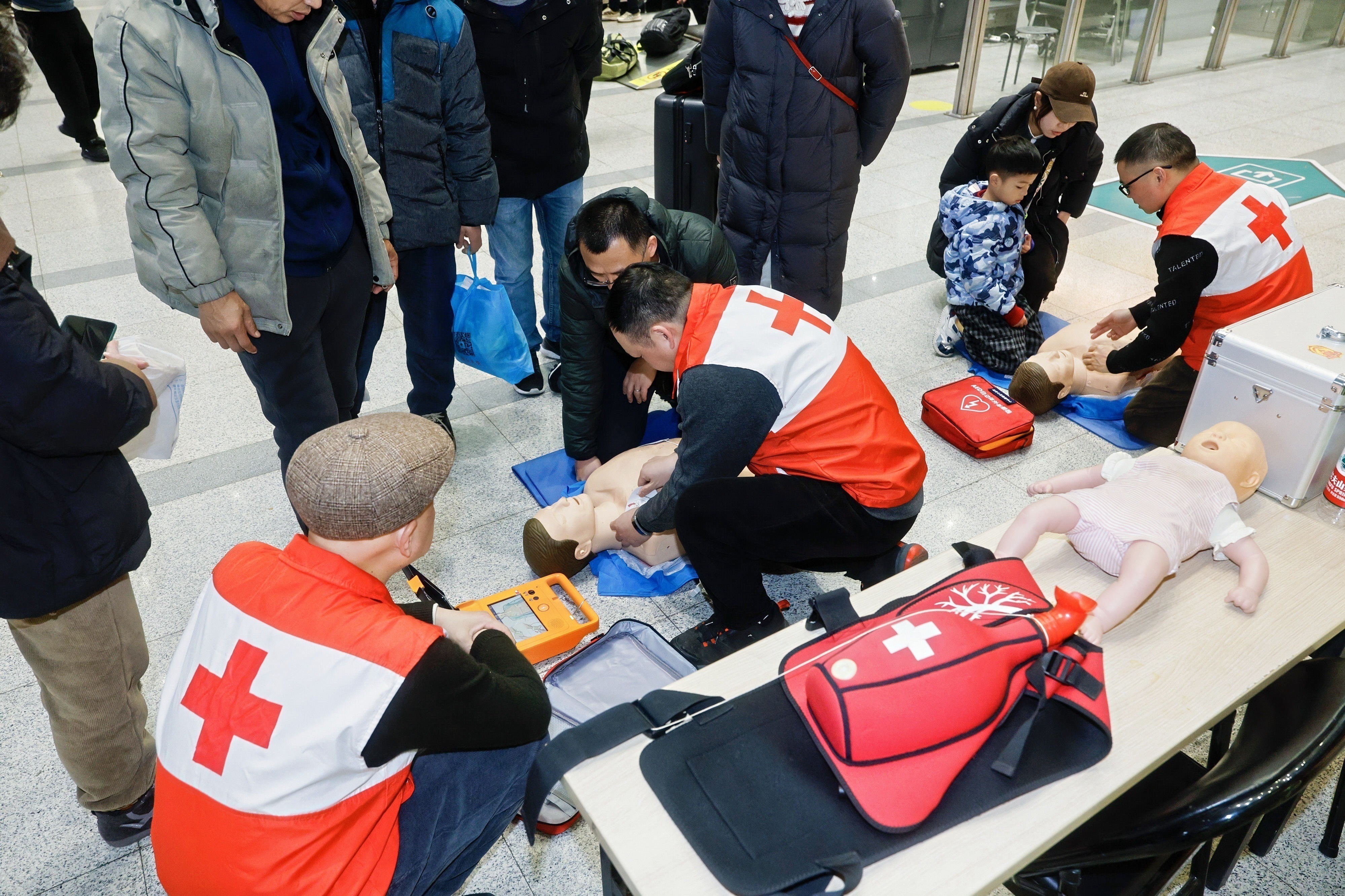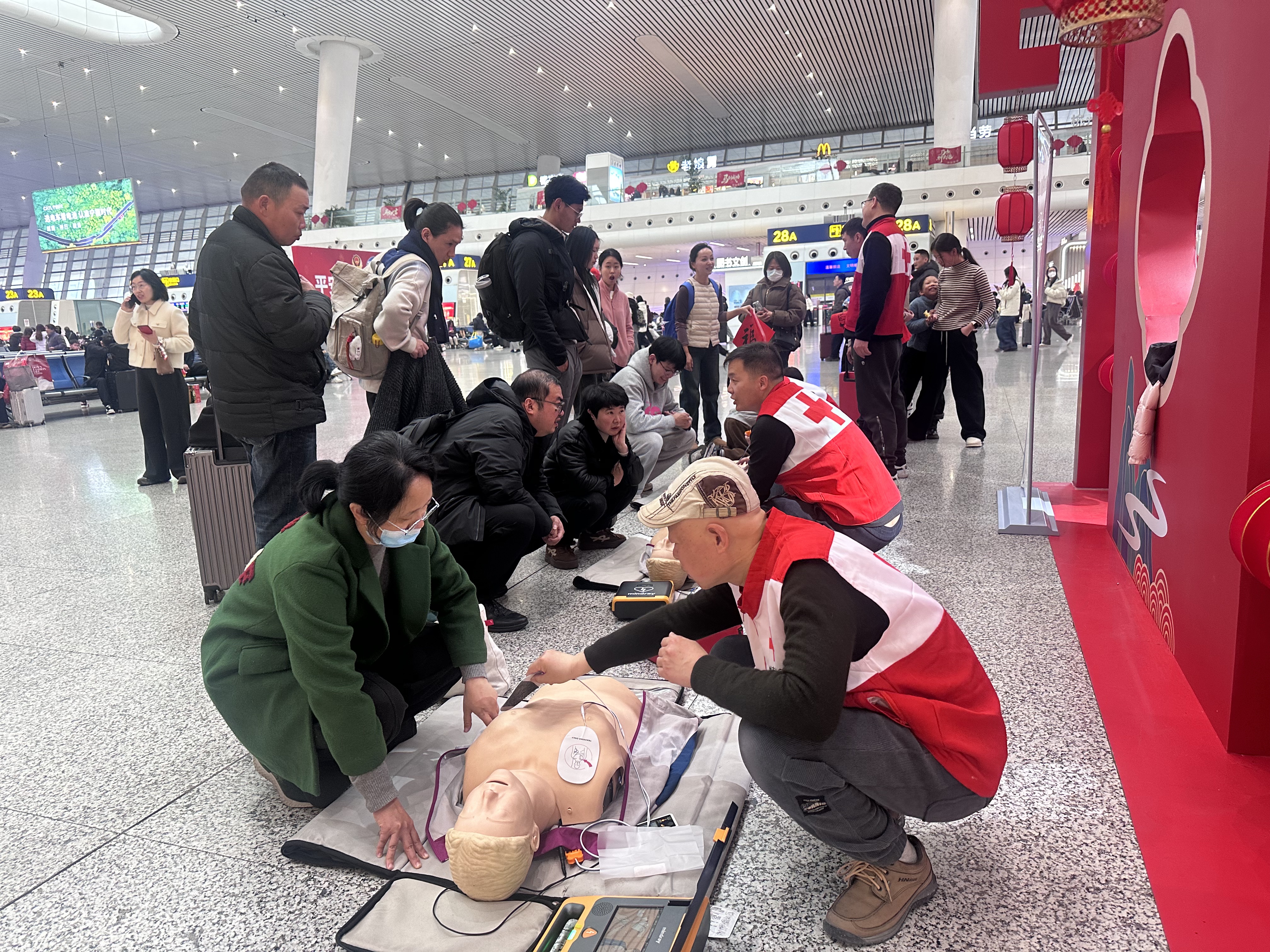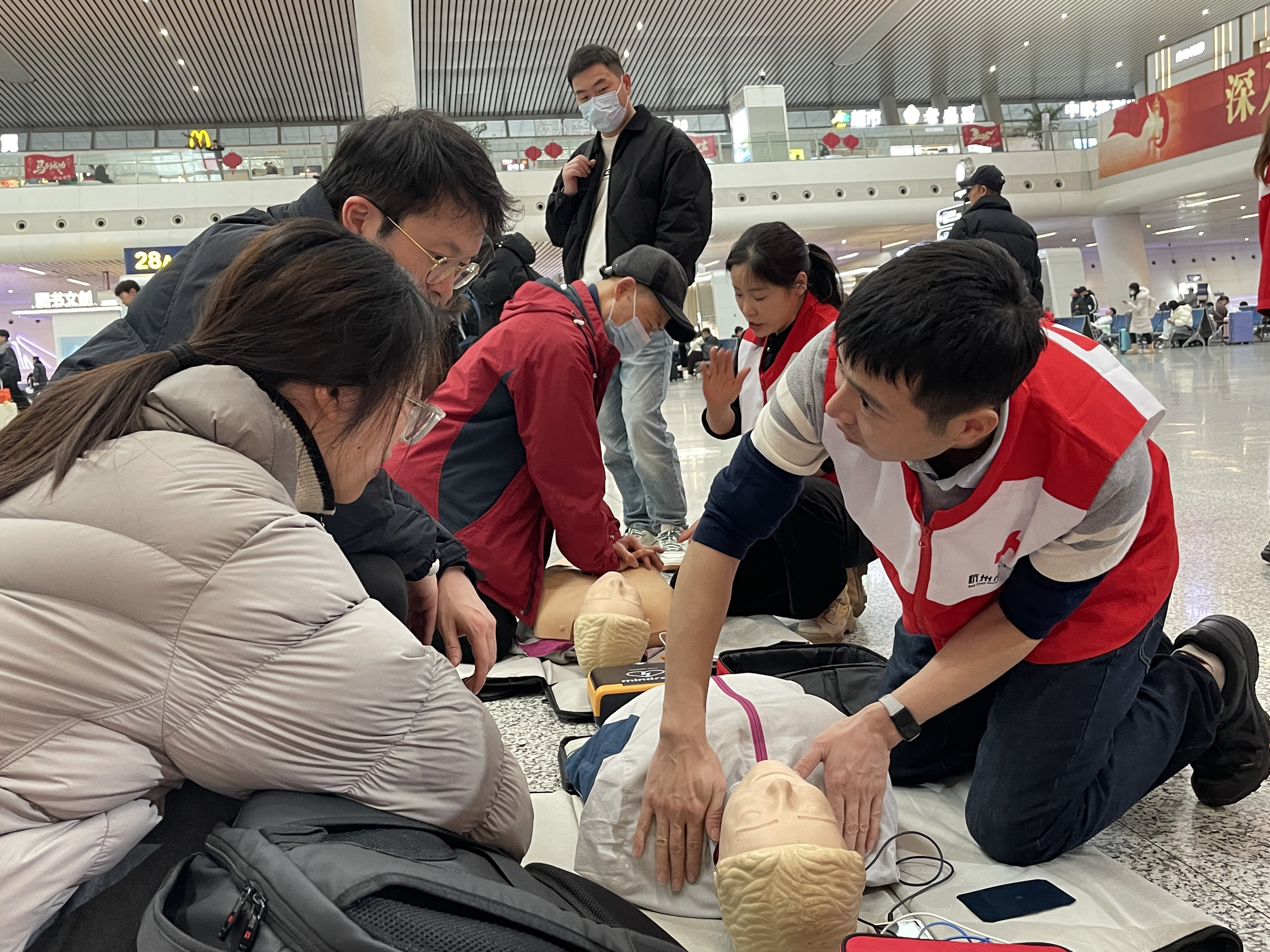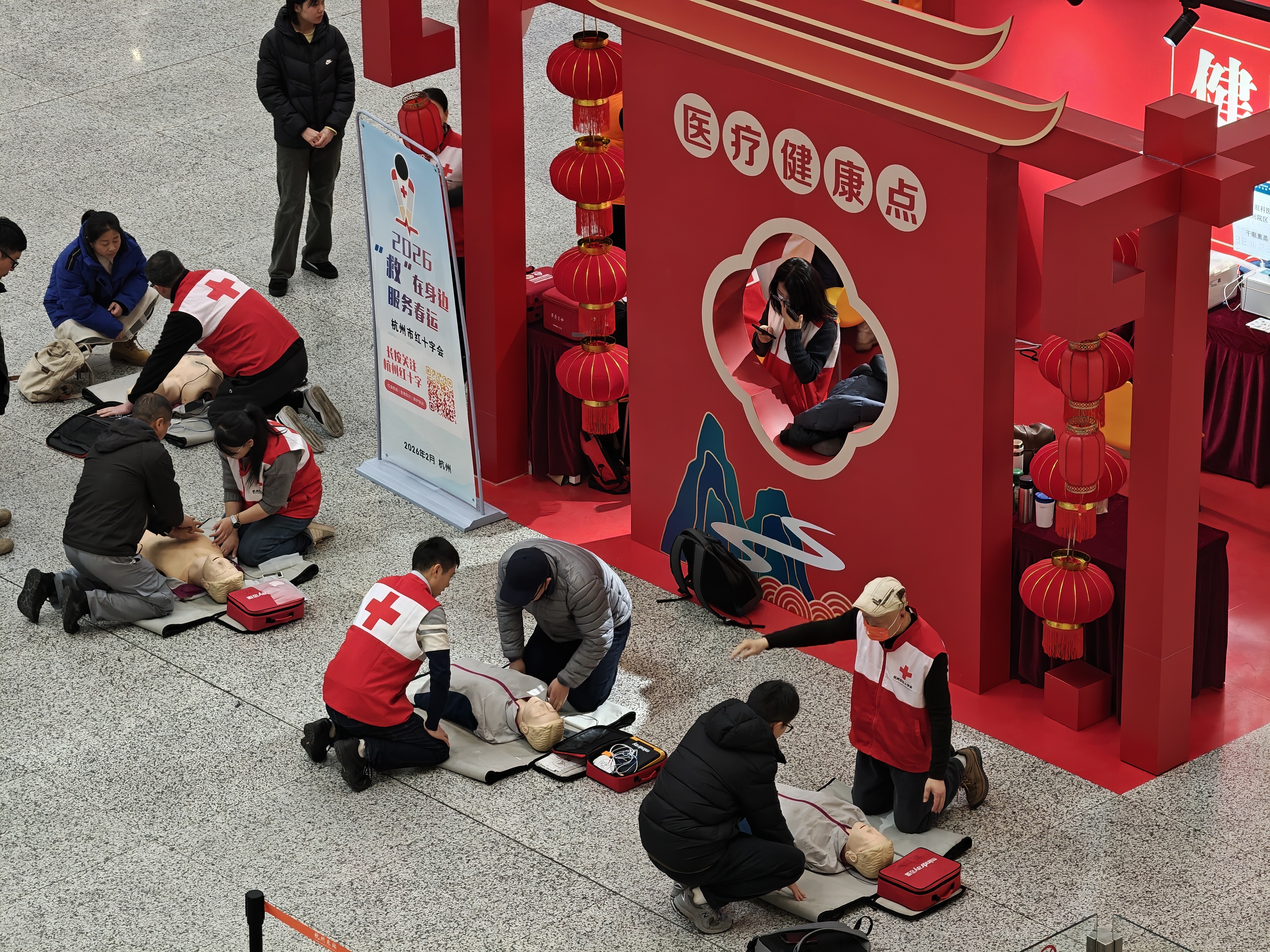 春运假期在杭州各火车站活跃着一支支红会急救志愿者为春运回家旅客普及急救技能。