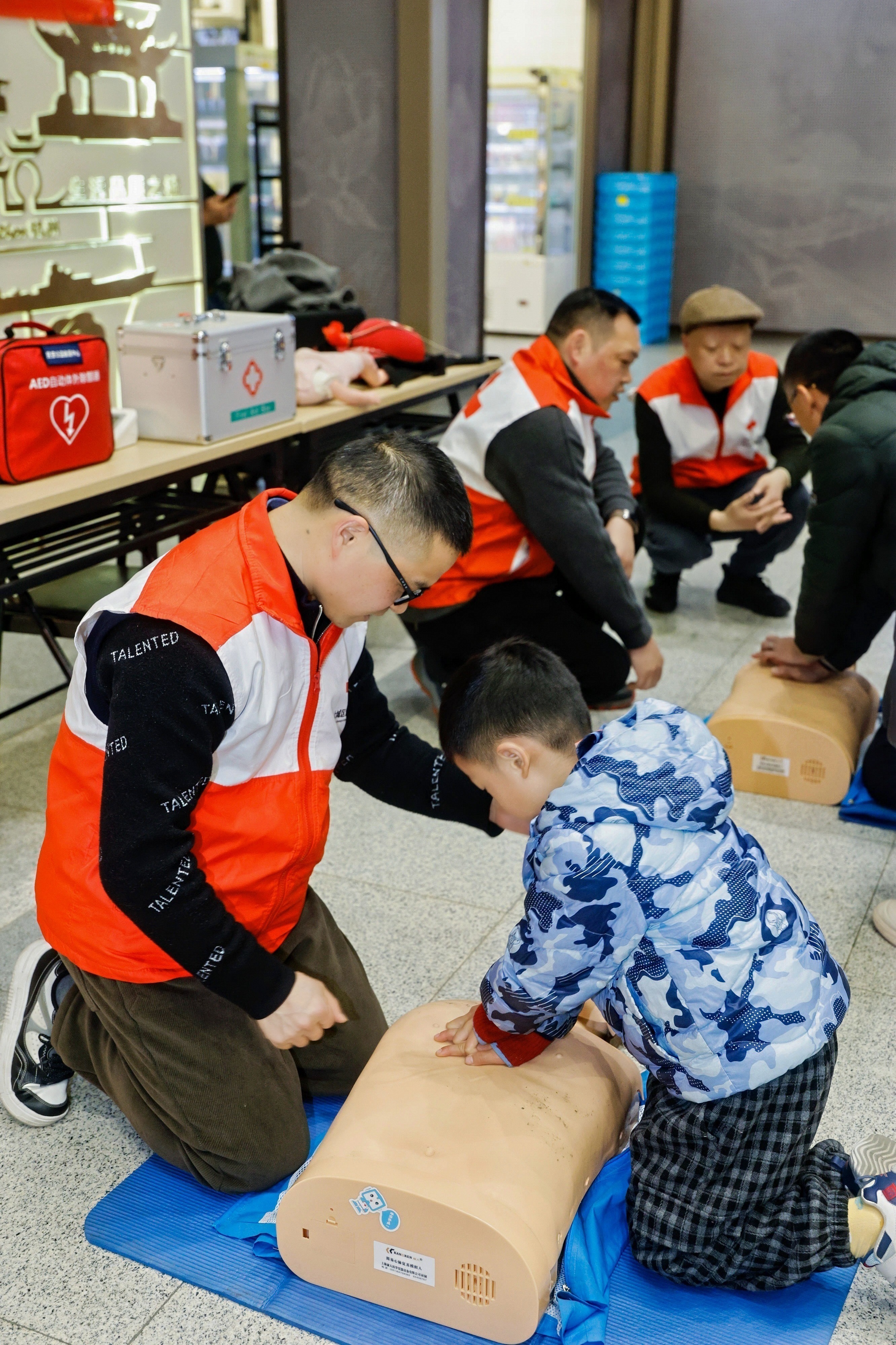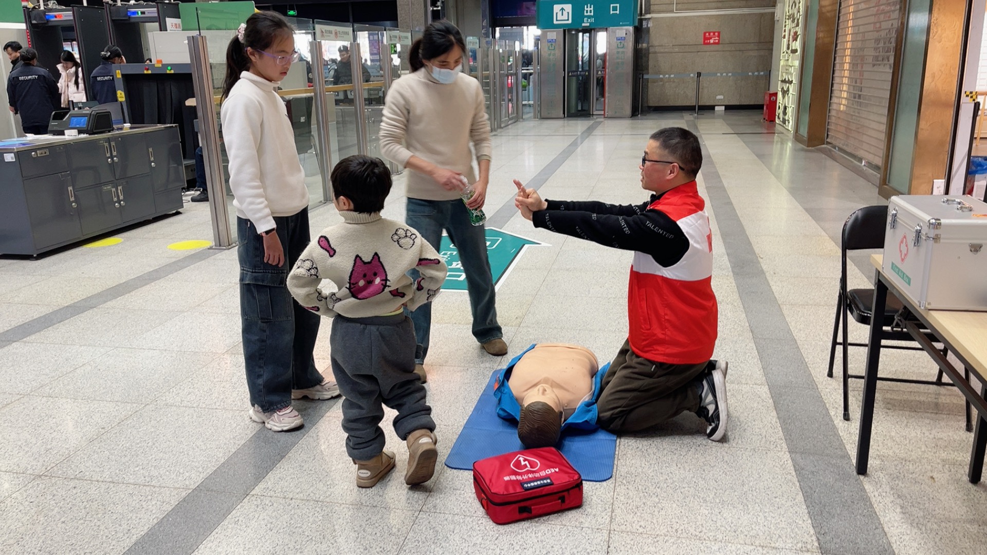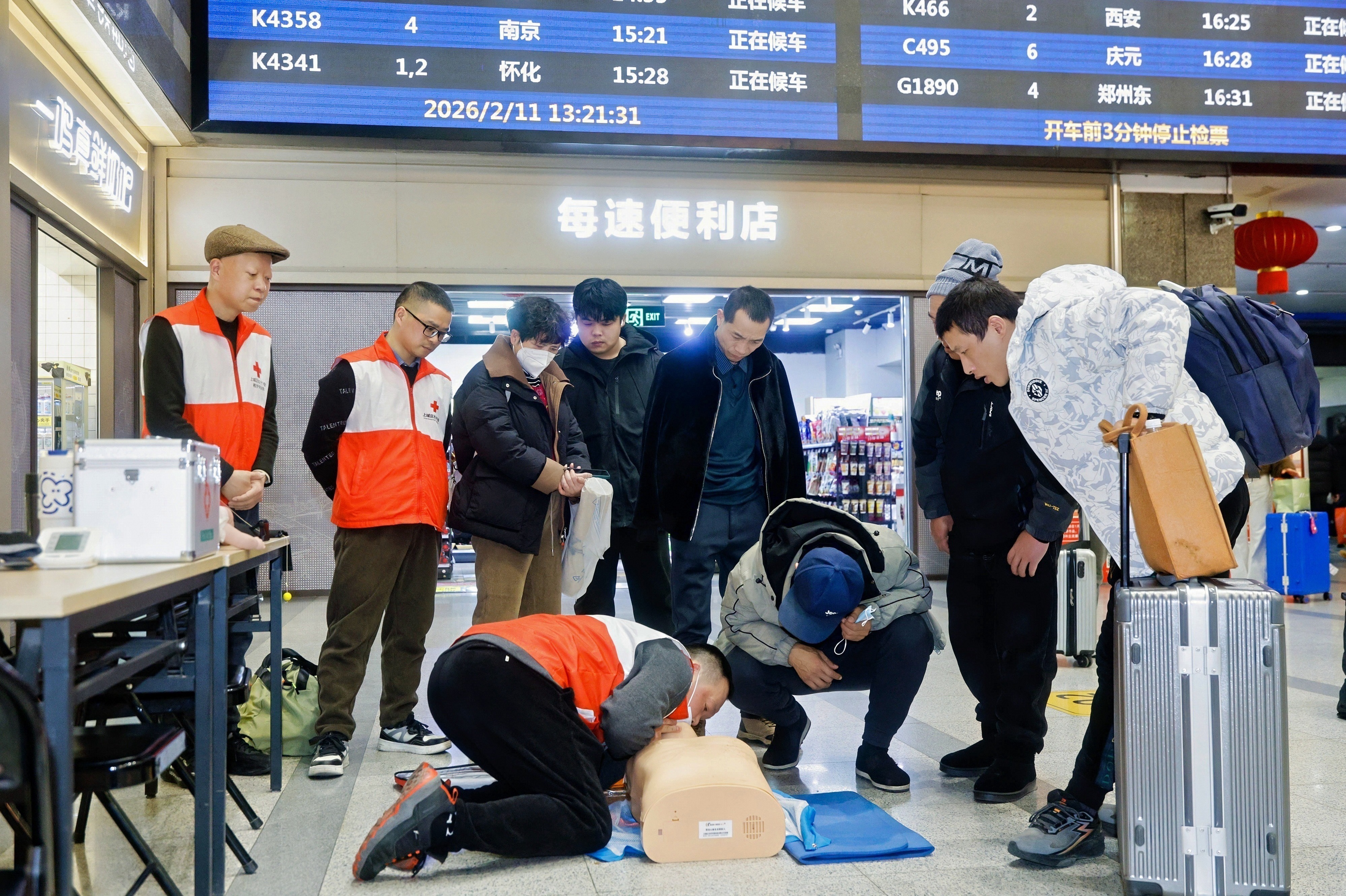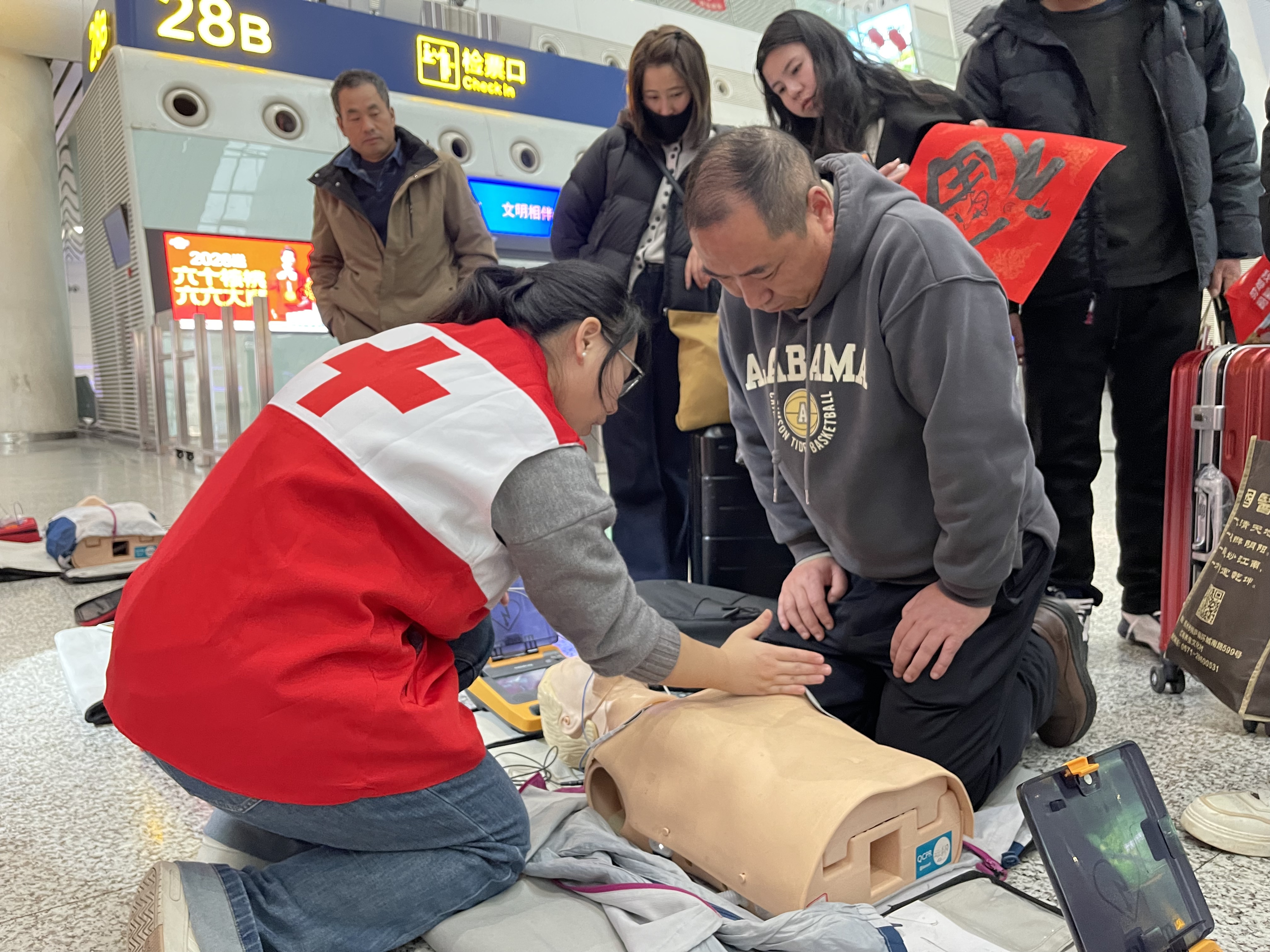 春运假期在杭州各火车站活跃着一支支红会急救志愿者为春运回家旅客普及急救技能。