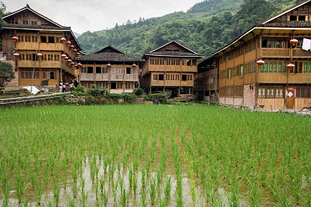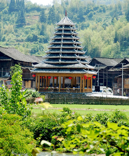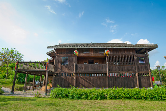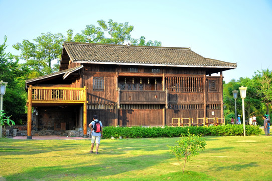 广西民族村主要民居景点 1. 壮族干栏民居(黑衣壮民居):典型高脚木楼,下层养畜储物,上层住人,木构榫卯、泥草糊墙; 2. 侗族鼓楼+风雨桥+戏台:鼓楼为寨中标志,宝塔造型,榫卯无钉;风雨桥可通行避雨,是侗族非遗;戏台用于民俗表演; 3. 苗族民居(吊脚楼):三层木楼,架空防潮,上层储物; 4. 瑶族竹楼:就地取材,竹木结构,通风轻便; 5. 毛南族民居、仫佬族民居:结合山地特点,砖木混合,有特色火塘与窗雕; 6. 客家围屋:环形夯土/砖石围合,防御性强,内部多户聚居;
