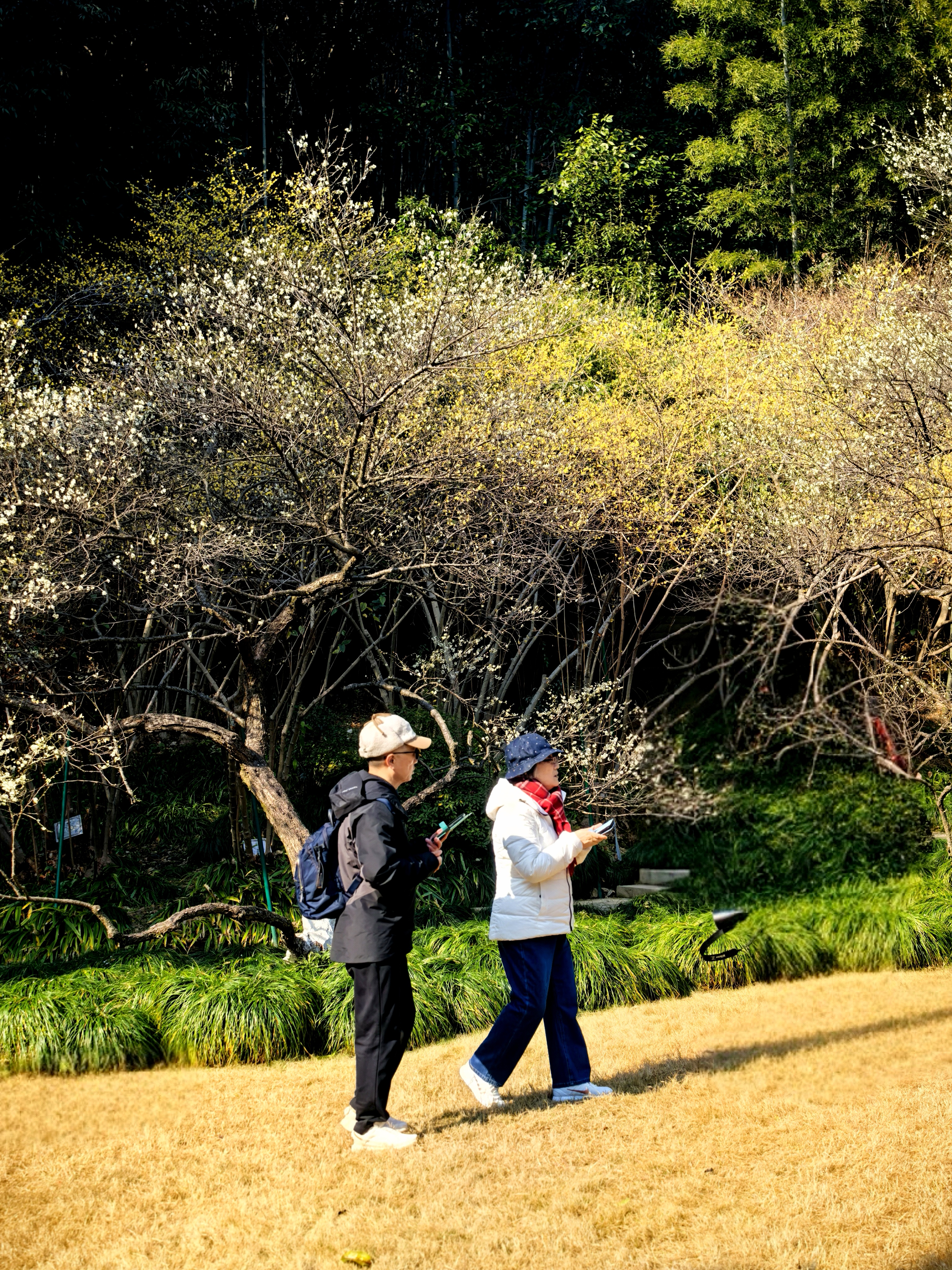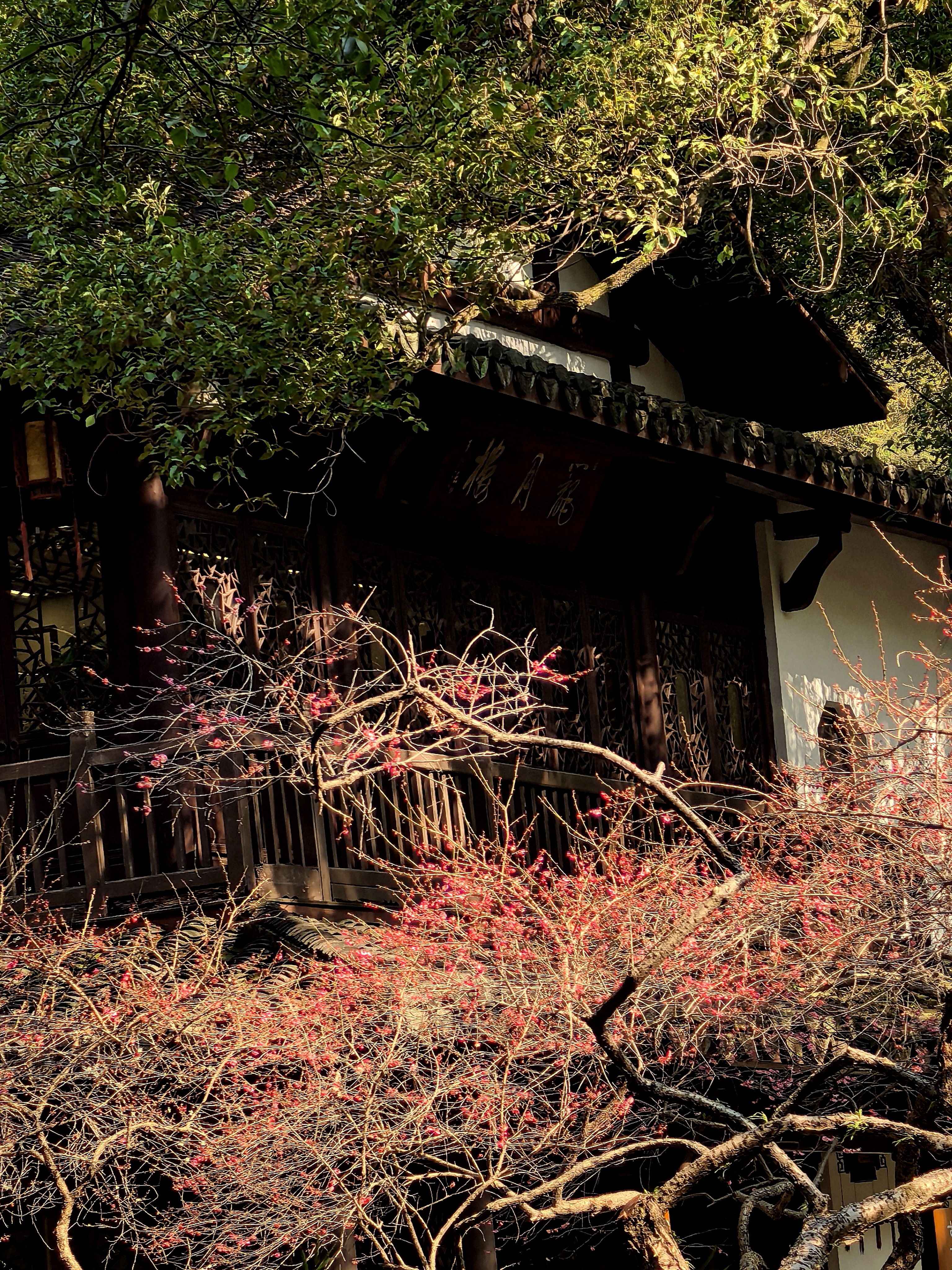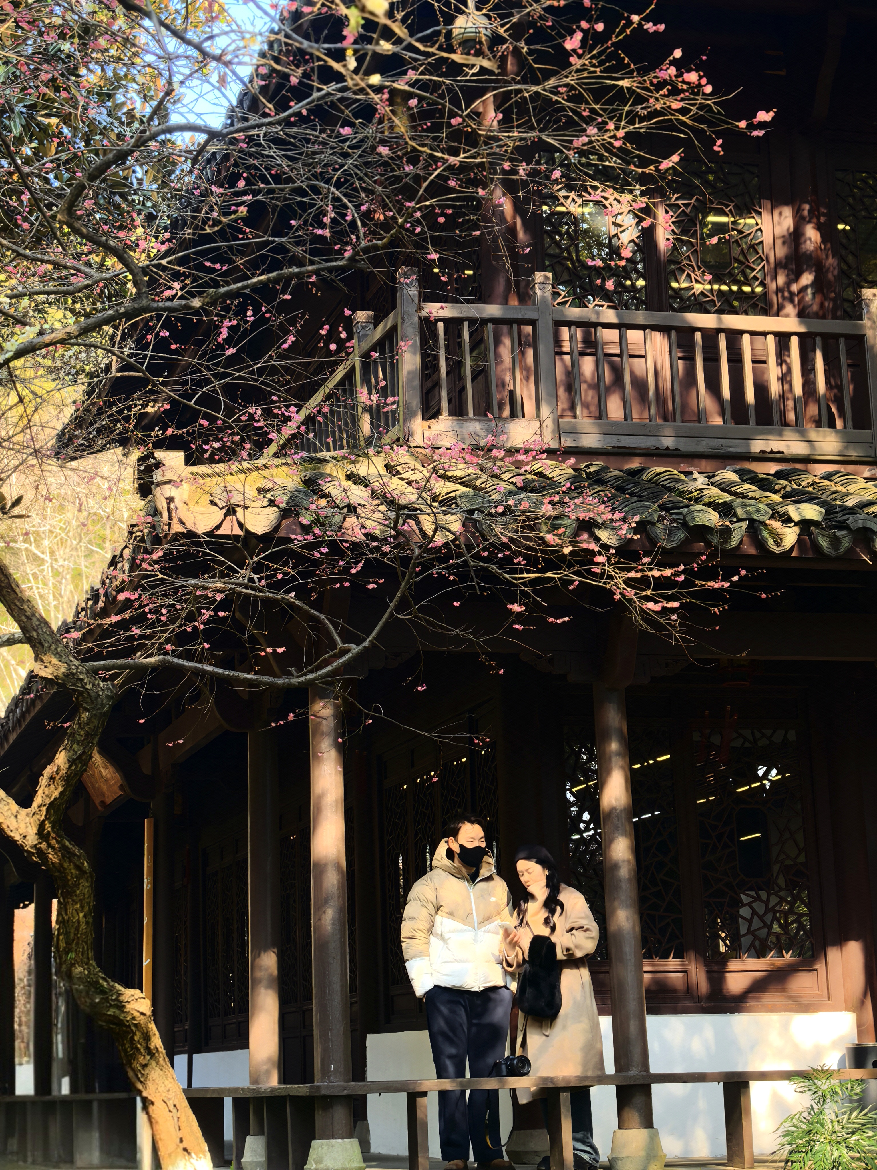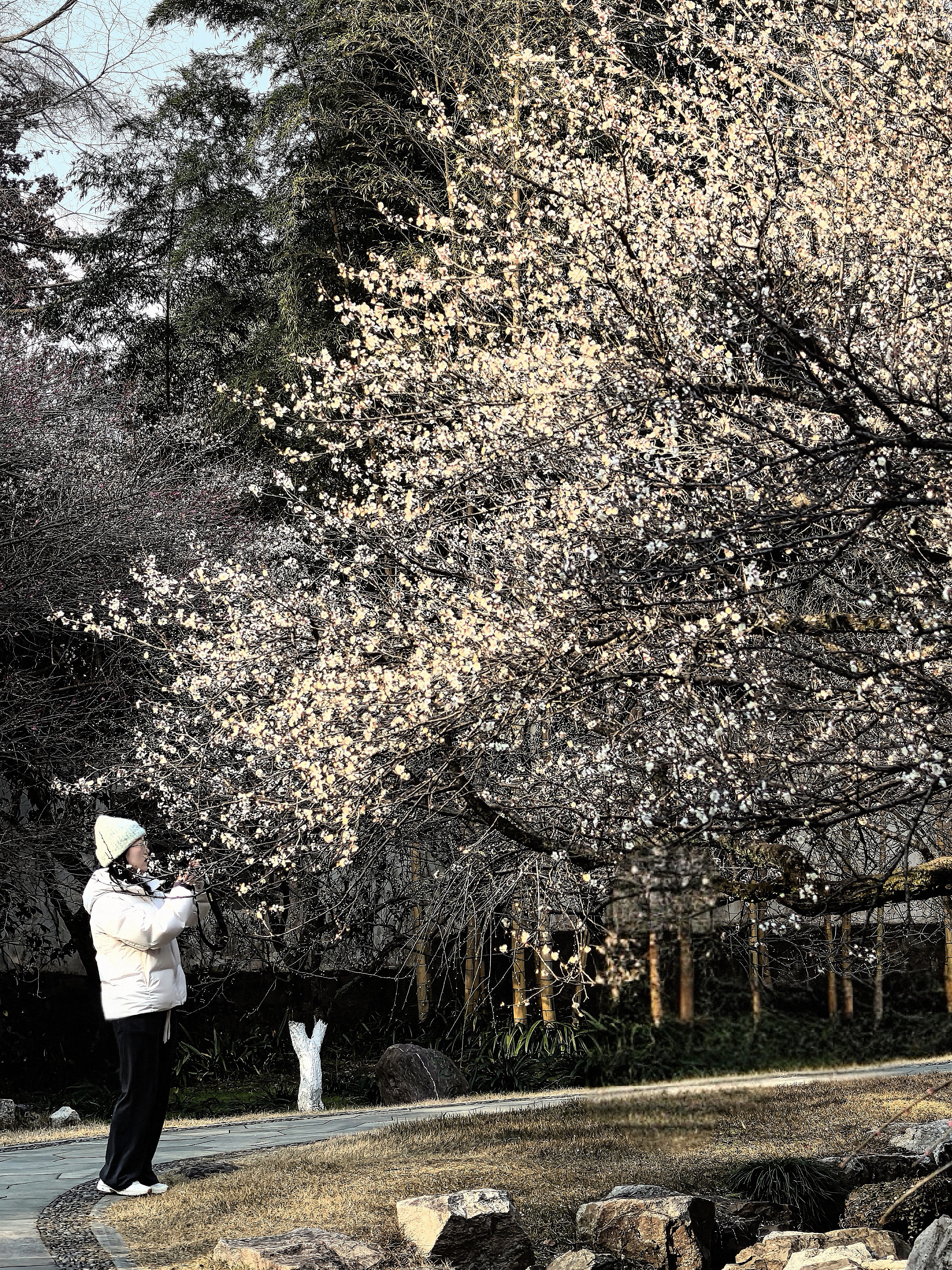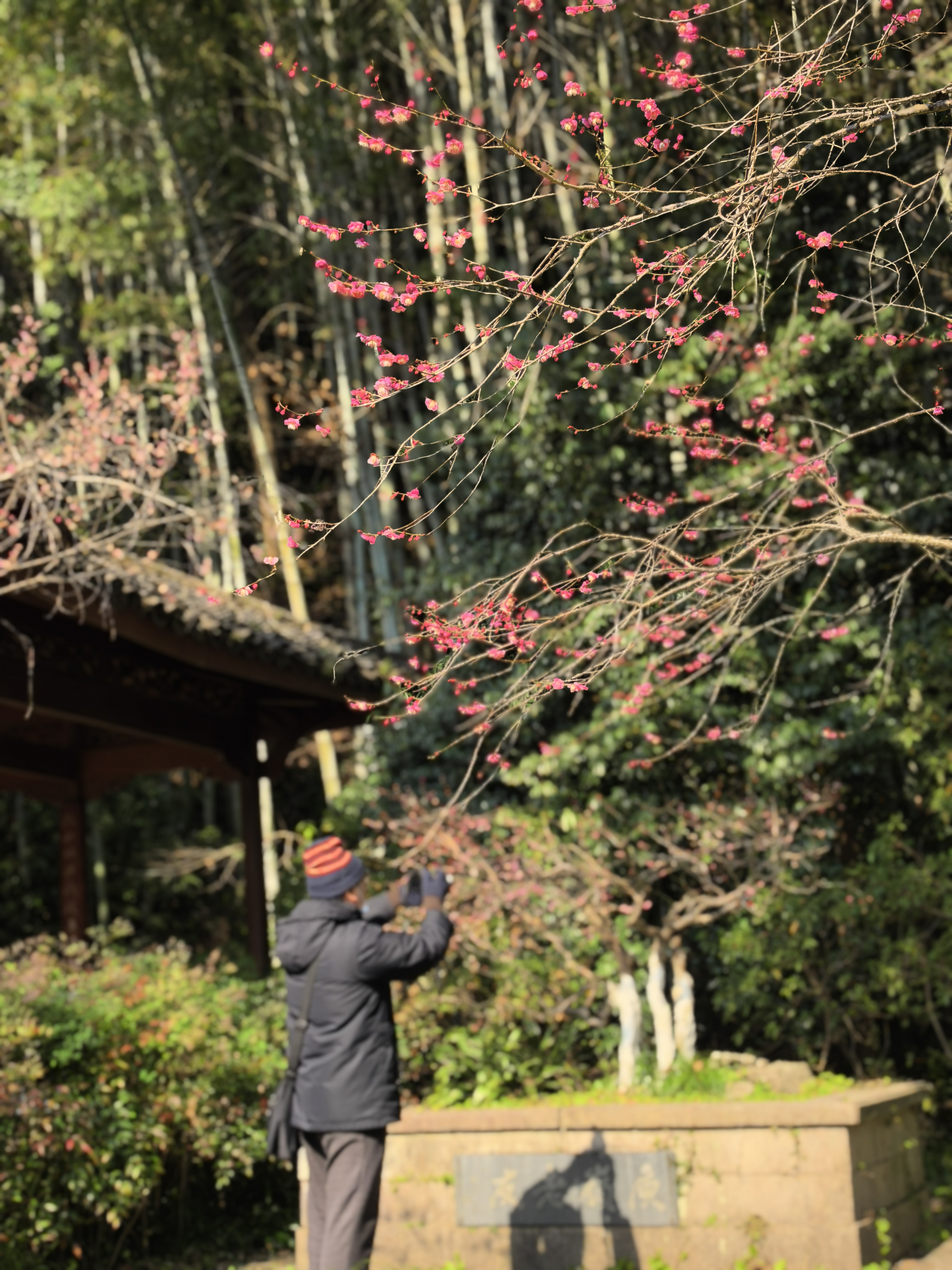 灵峰探梅跻身于杭城三大赏梅胜地,每年我都要想法来一次,并且努力想探出一点与往年不一样的韵味来。 山坳拢住一片温润,梅气比别处醒得更早。许多天前就在朋友圈上看到蜡梅初放了。拾级而上,已有暗香浮动着,牵引脚步。最温馨的感觉是,有一批游人赏好后正次第下来,与我打了个照面,那一种大家都来梅花赶集的感觉立马爆满。 这是过去的赏梅禅径,有后晋开运年间始建的灵峰寺,清代僧人与雅士们在此遍植梅树。几丛“七星古梅”蜡梅正寂寂地黄着,那是时光凝成的琥珀,幽香沉静如古梵音。 笼月楼、掬月亭静静地立在坡上,看那一布幕知,前几日杭城专门为东坡先生庆生,一群人在此雅集,原来今人与古人,都在这一脉清芬里相逢了。 最美的还是那梅影。笼月楼前,老梅枝干虬曲,白梅似玉蝶栖满,红梅则如胭脂轻点。它们并不孤高,只亲昵地环抱着楼台。看一对情侣伫立楼下,竟有被梅花温柔围合的错觉。 最喜的是墨绿的修竹作了背景,衬得蜡梅的澄黄与红梅的妍丽格外分明。风来时,花瓣翩跹,仿佛一场无声的轻梦。 我在掬月亭前静立了一会儿,看花影参差,洒满石阶。千年前的梅魂,与此刻眼前的纷飞,在这一隅灵峰山谷里,宛然合一了。杭城赏梅之十四灵峰探梅。
