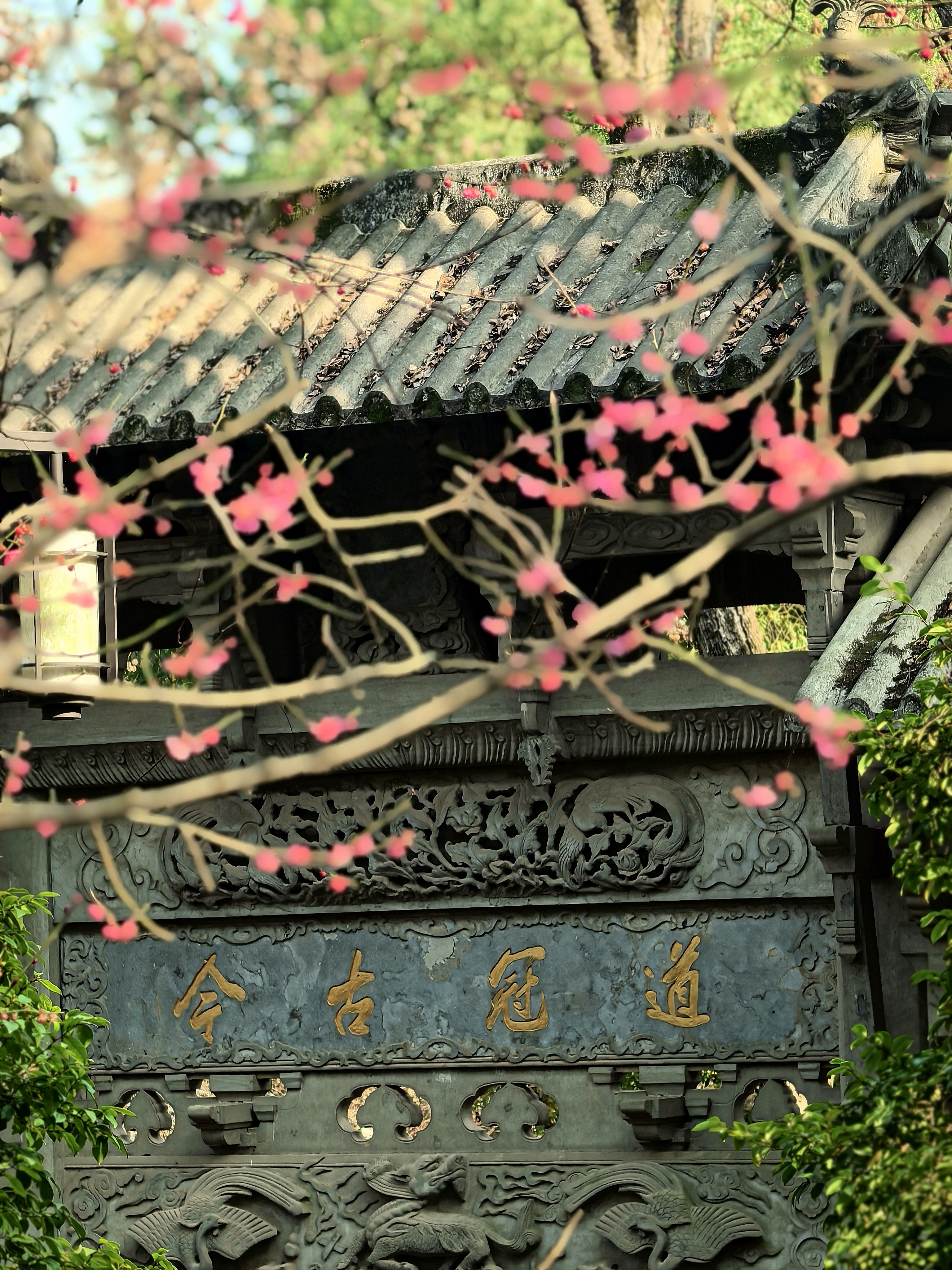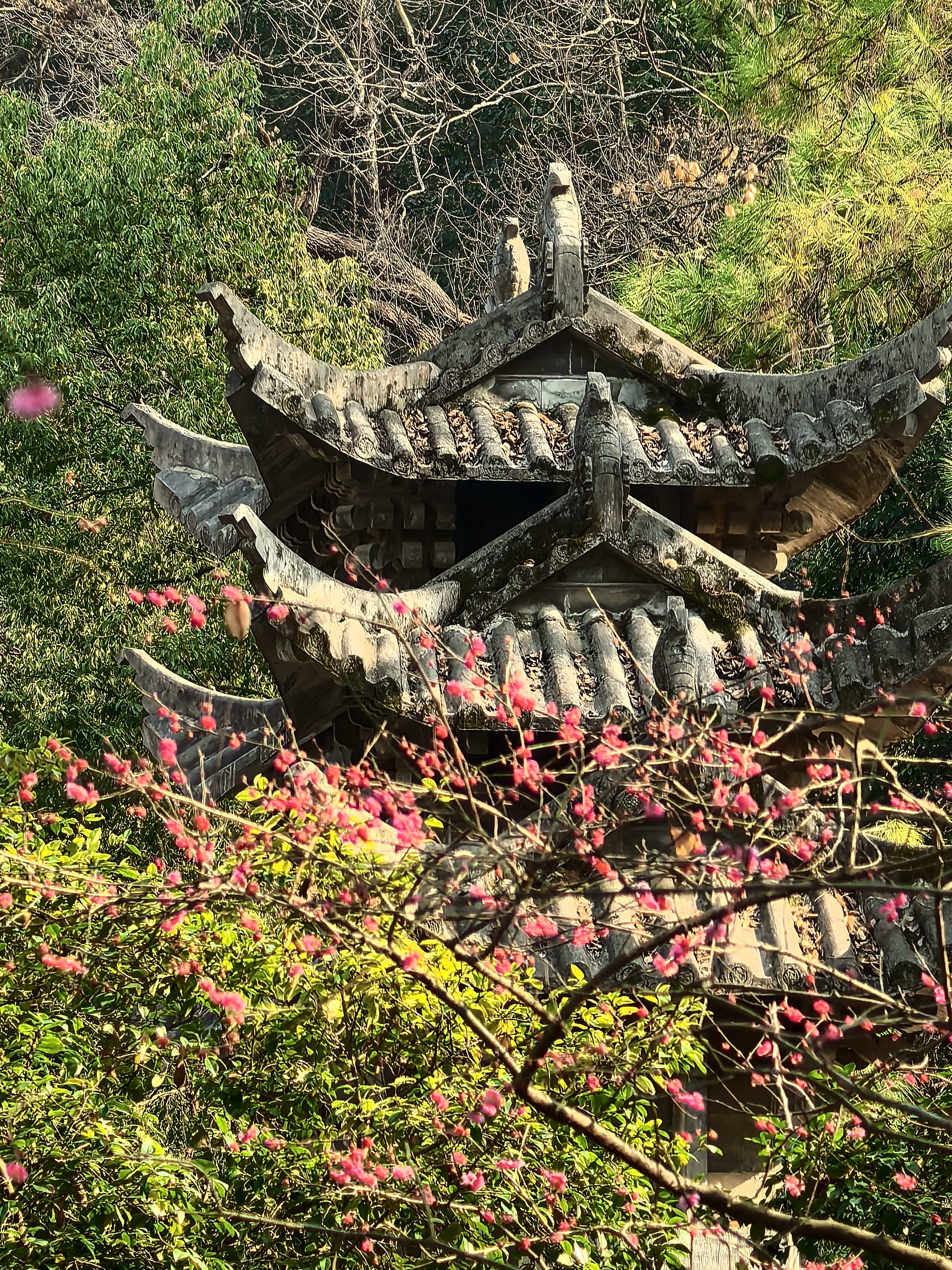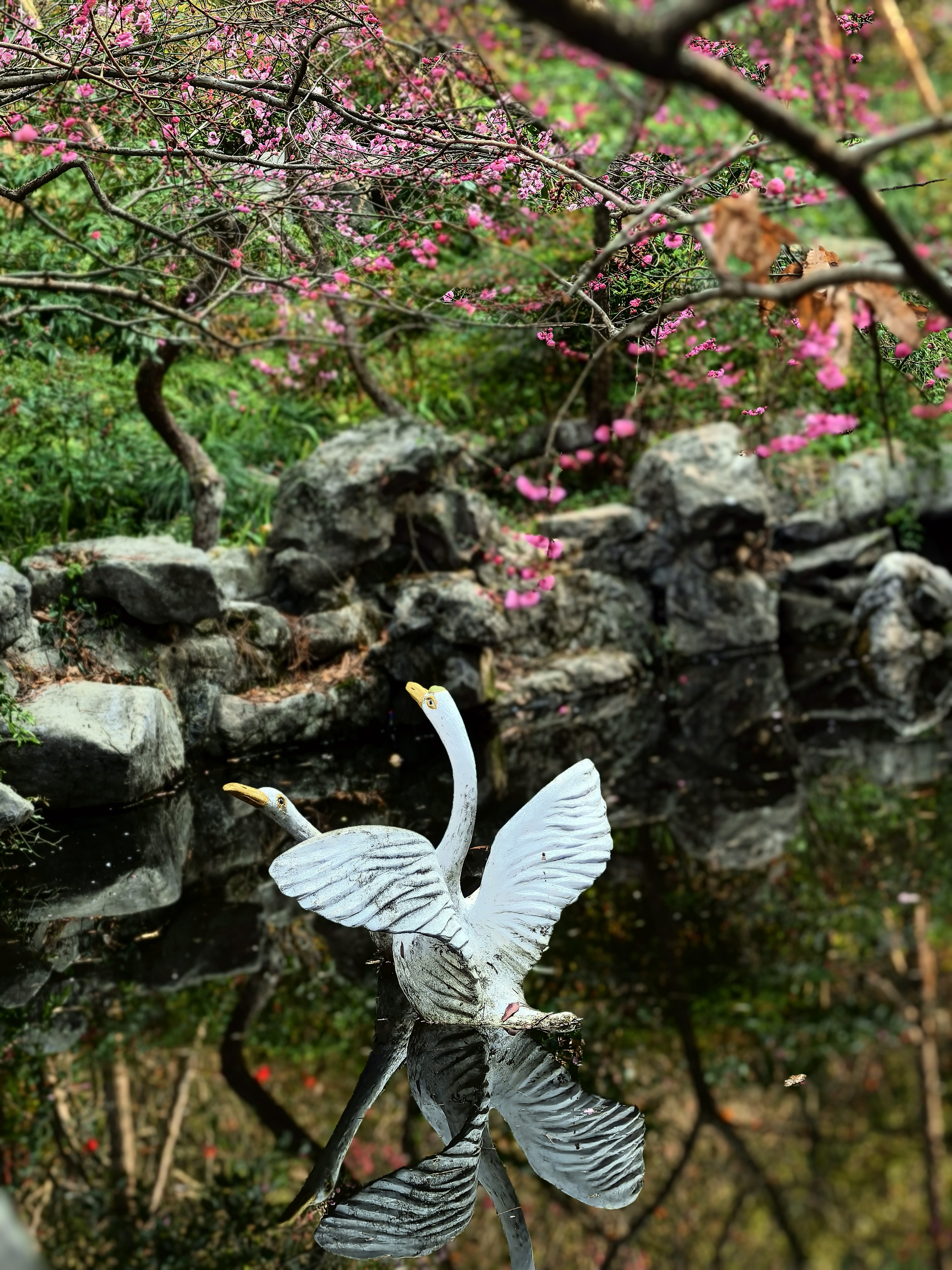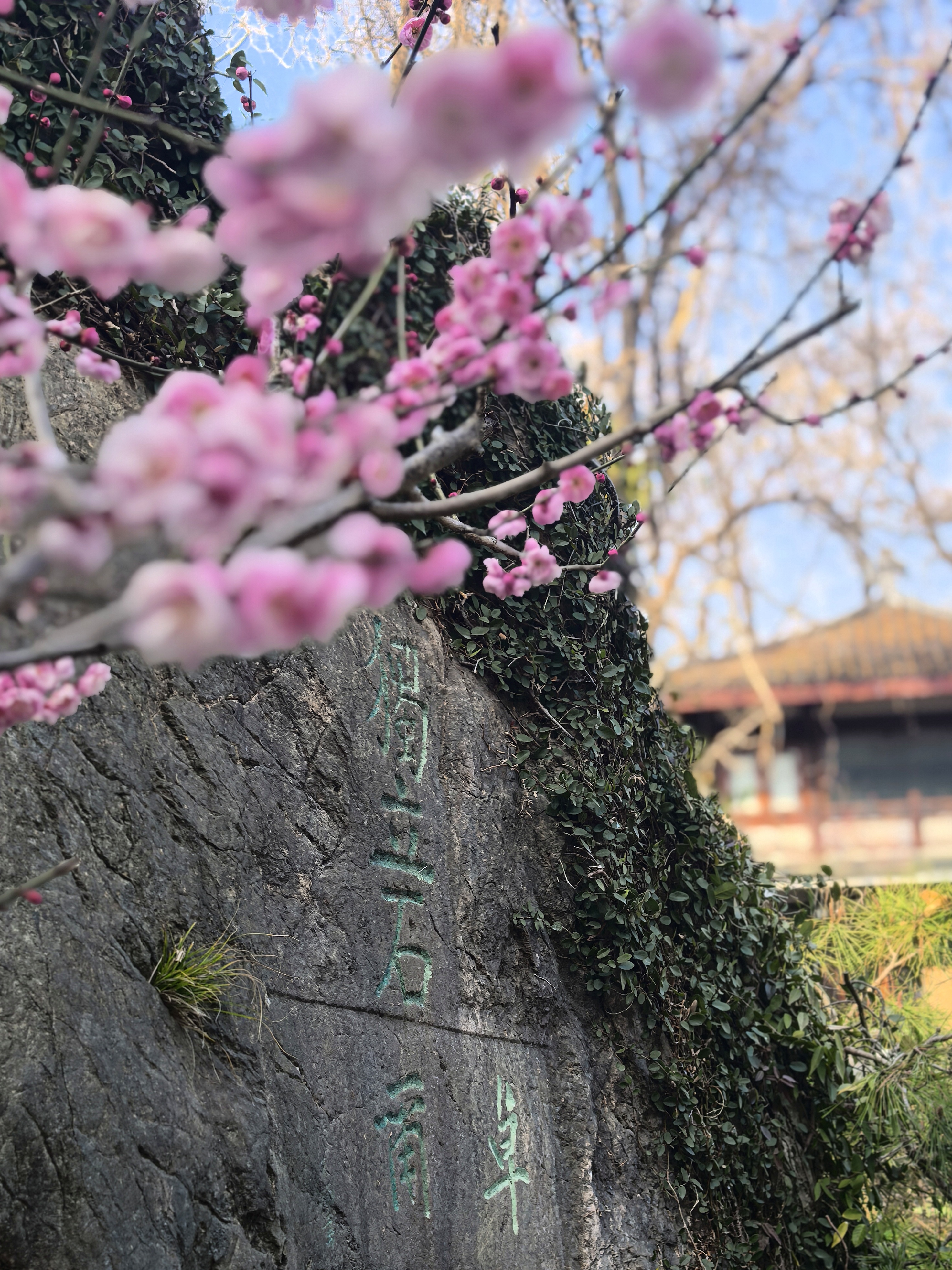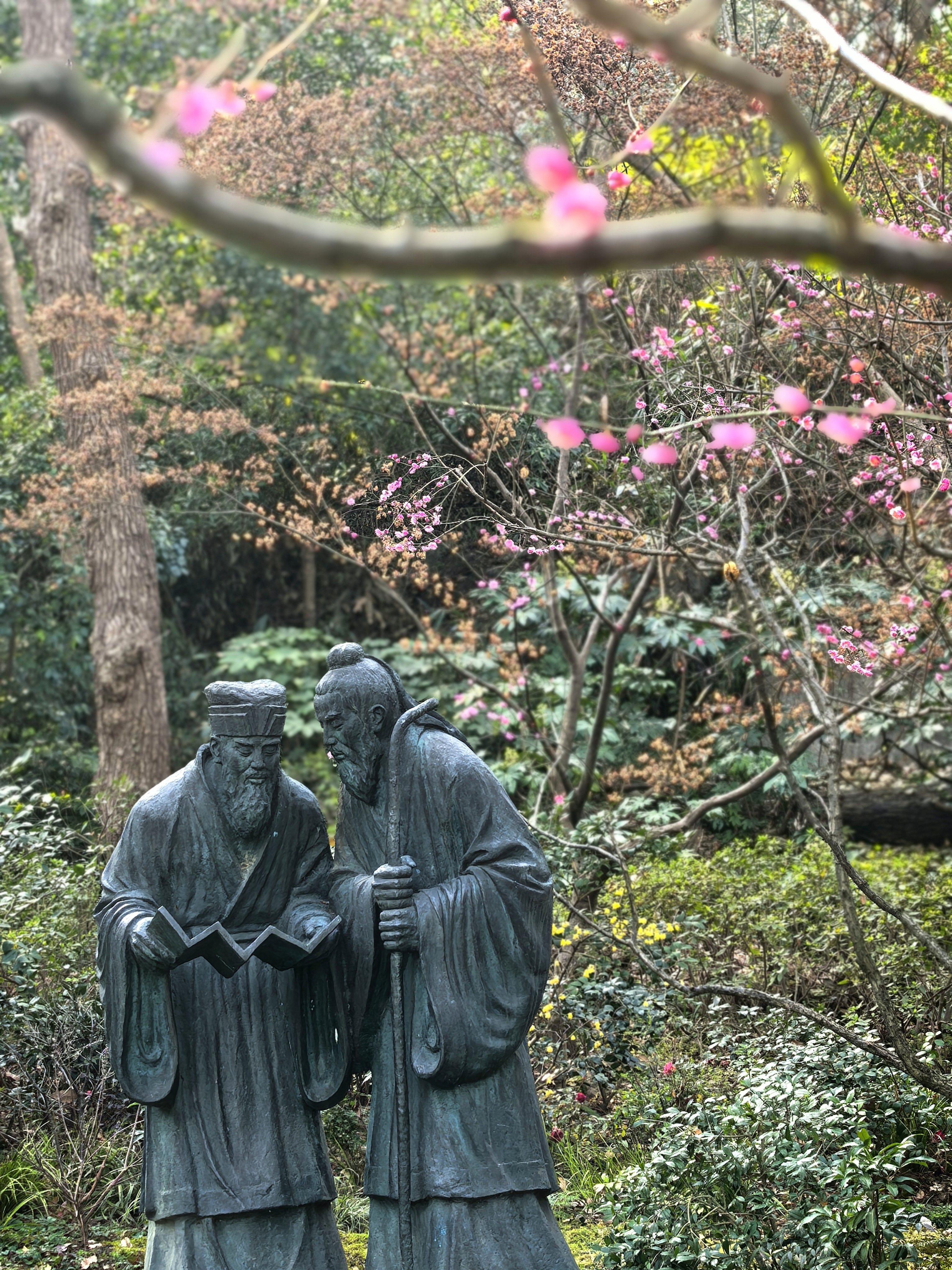 万松书院的梅花很少,并且零星分布,一路拾级而上一下子还找不到。在杭城众多的赏梅地里,极少有人会为三两株梅花而来。但这里的梅花自有它的独特之处。 毓秀阁窗前的那株,恰似岩石边探出的诗眼,在默诵“獨立石商草”的残碑,最妙在于与松竹梅同框,檐角边斜逸的几朵,与飞翘的瓦当共绘着天光的轮廓。 岩石下面的草地上植有几株,瘦瘦弱弱,或者映着“道冠古今”的匾额,让娇柔的花瓣染上金石之气;或是偎着先贤雕像的肩头,将幽香渗入凝固的时光。 准备出来时,却发现耸立于小池边的朱熹雕像,正沐浴在粉红的梅光中,池中两只曲颈的天鹅,恰好对着岩石间最灵动的那簇粉霞。 书院之梅,不似成林盛放那样热闹,但每一枝都找到了最契合的语境:它好像寻古之中的意外之喜,是众多的古建忽然睁开的一瞬明眸,是穿过百年书声后落在肩头的一缕清寂。 说实话,在这片以书墨飘香的院落里,几株梅花便已足够,它们本就是唱给有心人的山中清音。杭城赏梅之十五万松书院。