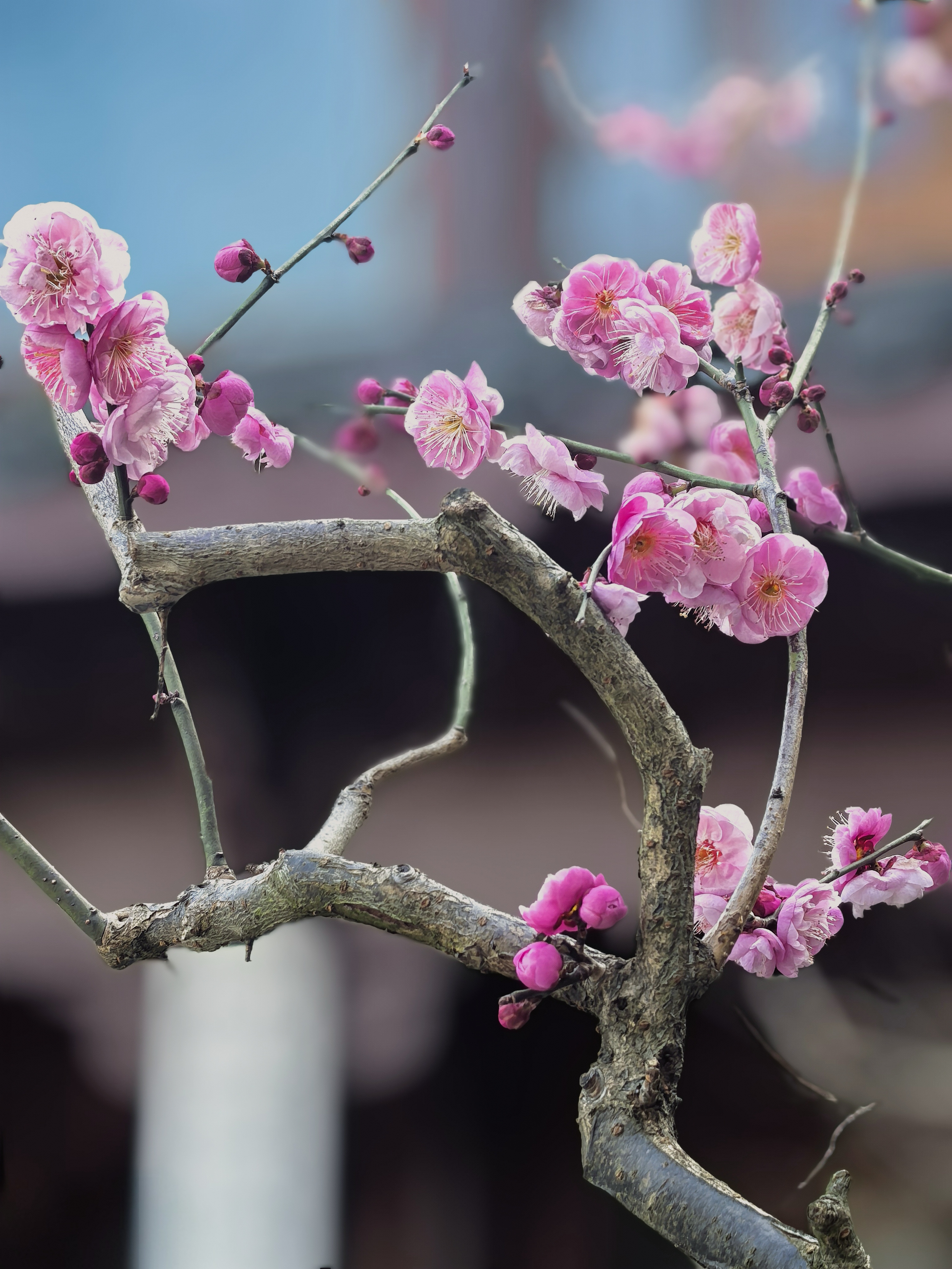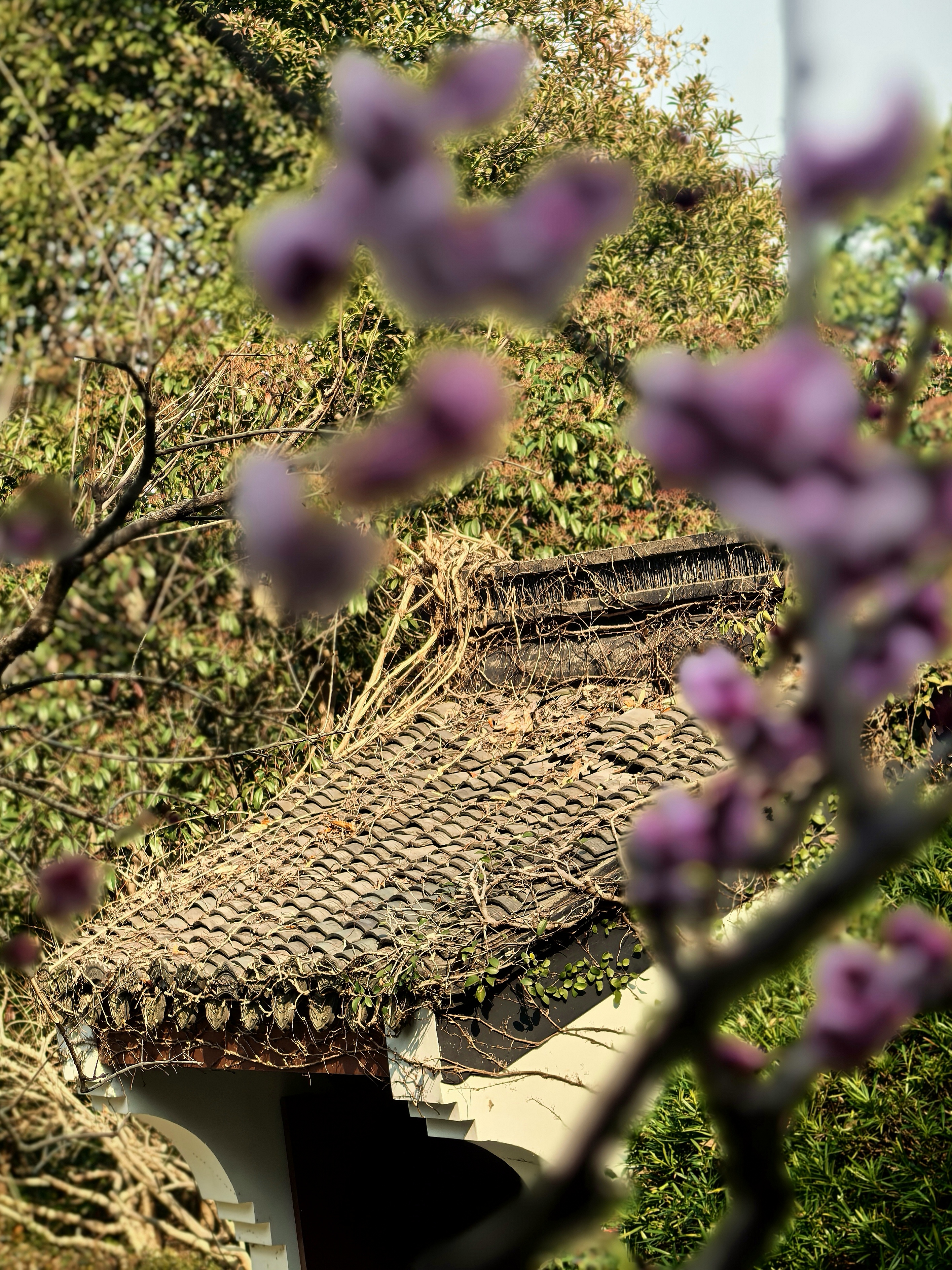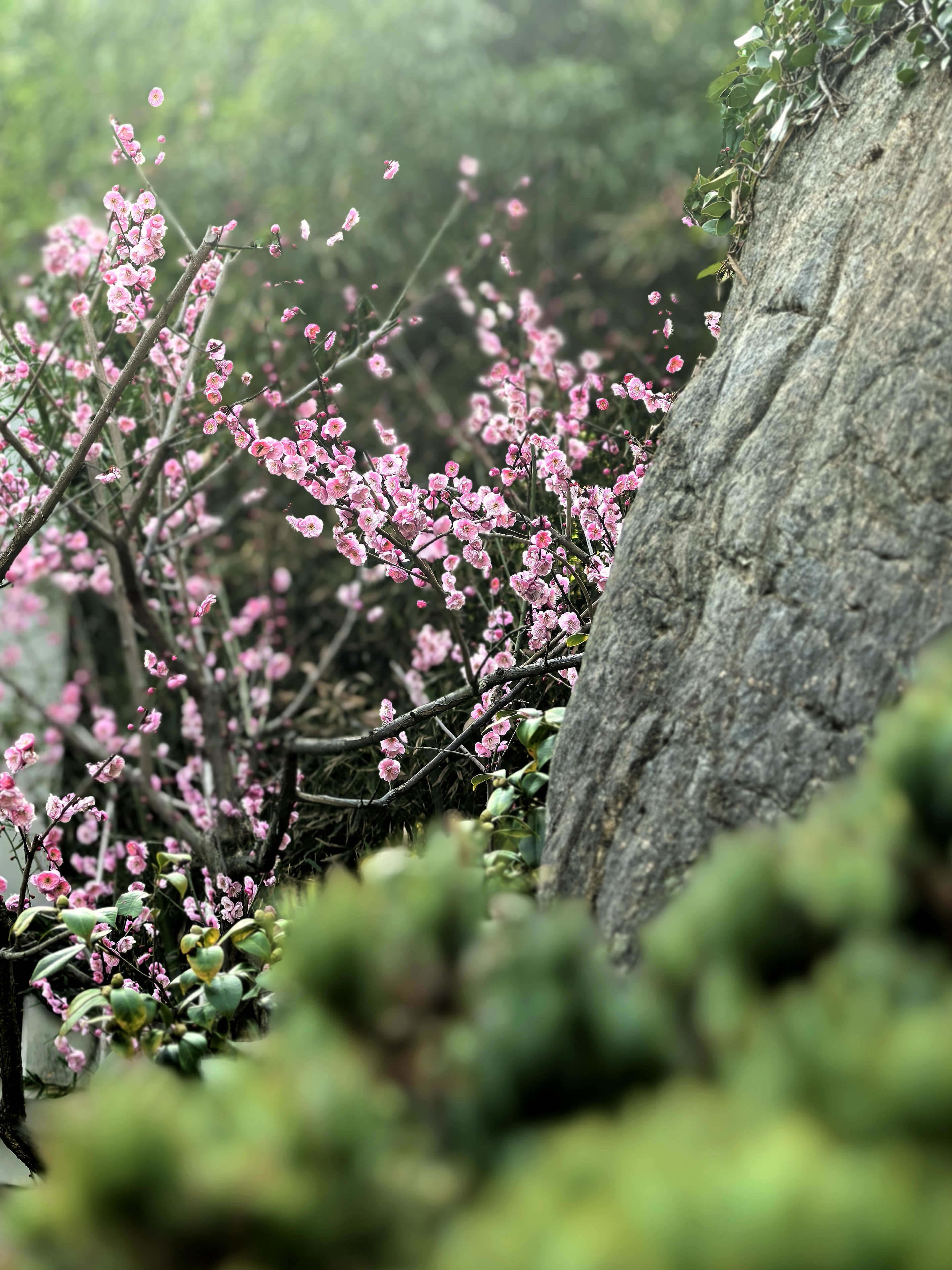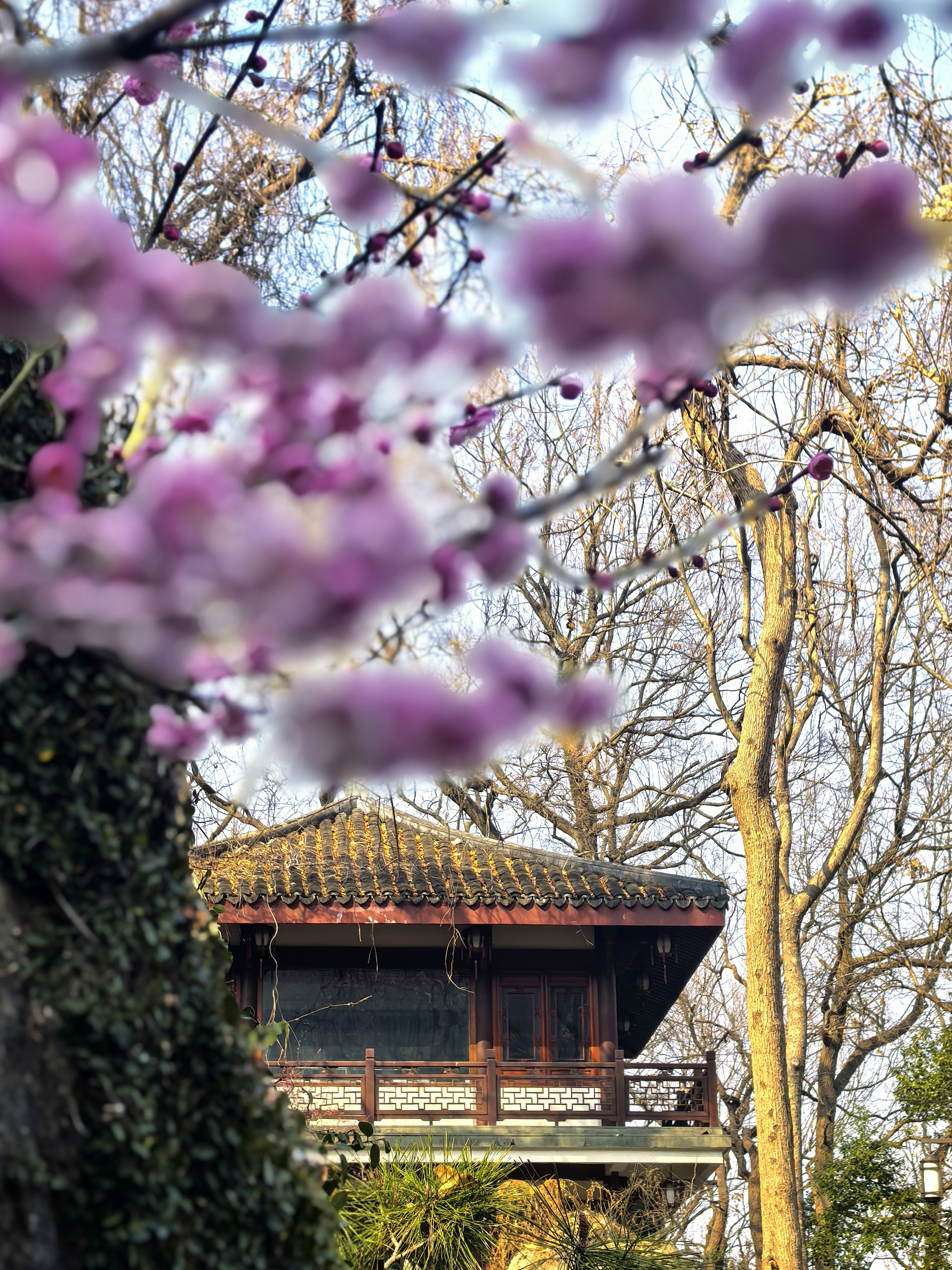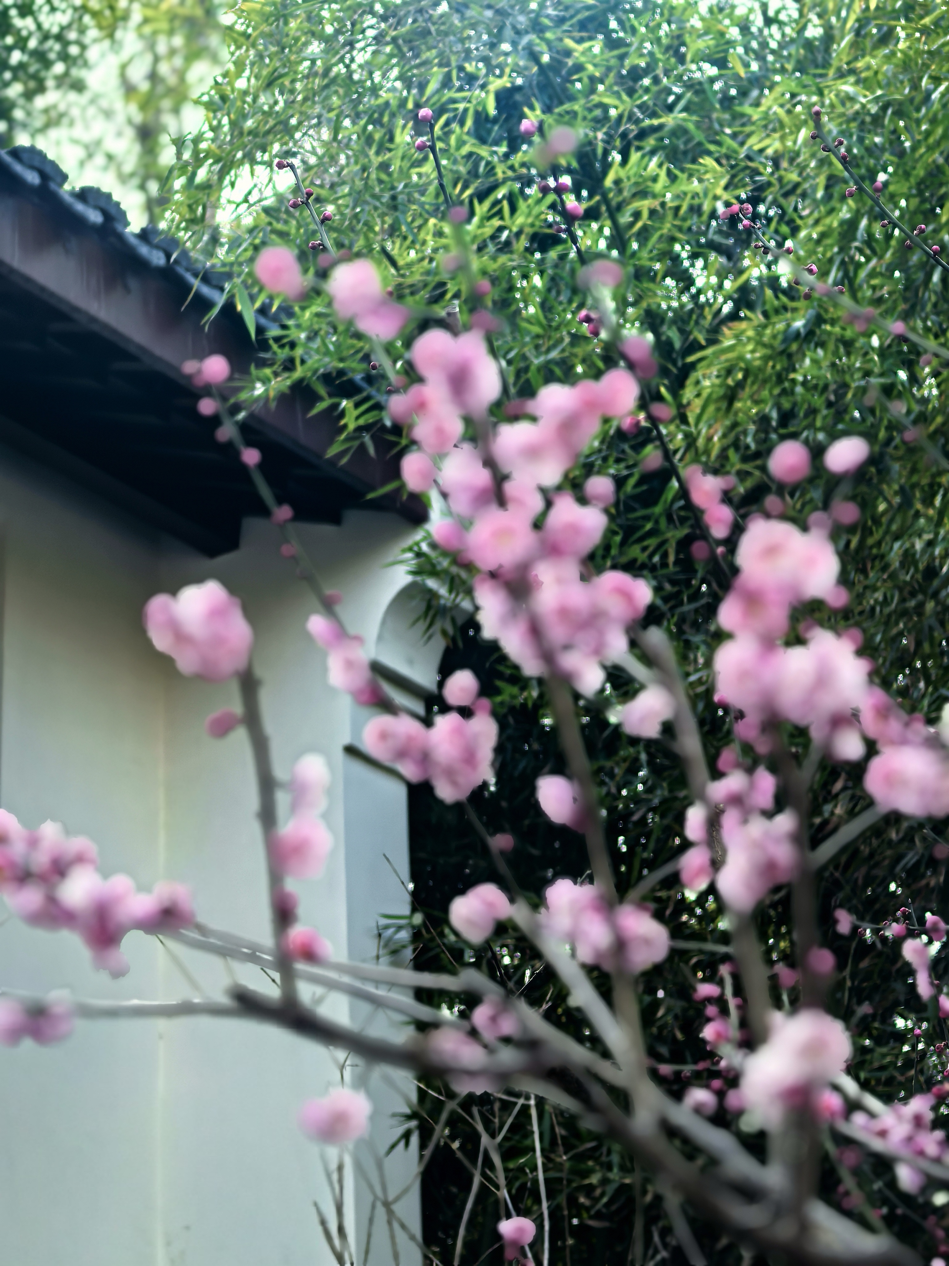 万松书院的梅花很少,并且零星分布,一路拾级而上一下子还找不到。在杭城众多的赏梅地里,极少有人会为三两株梅花而来。但这里的梅花自有它的独特之处。 毓秀阁窗前的那株,恰似岩石边探出的诗眼,在默诵“獨立石商草”的残碑,最妙在于与松竹梅同框,檐角边斜逸的几朵,与飞翘的瓦当共绘着天光的轮廓。 岩石下面的草地上植有几株,瘦瘦弱弱,或者映着“道冠古今”的匾额,让娇柔的花瓣染上金石之气;或是偎着先贤雕像的肩头,将幽香渗入凝固的时光。 准备出来时,却发现耸立于小池边的朱熹雕像,正沐浴在粉红的梅光中,池中两只曲颈的天鹅,恰好对着岩石间最灵动的那簇粉霞。 书院之梅,不似成林盛放那样热闹,但每一枝都找到了最契合的语境:它好像寻古之中的意外之喜,是众多的古建忽然睁开的一瞬明眸,是穿过百年书声后落在肩头的一缕清寂。 说实话,在这片以书墨飘香的院落里,几株梅花便已足够,它们本就是唱给有心人的山中清音。杭城赏梅之十五万松书院。