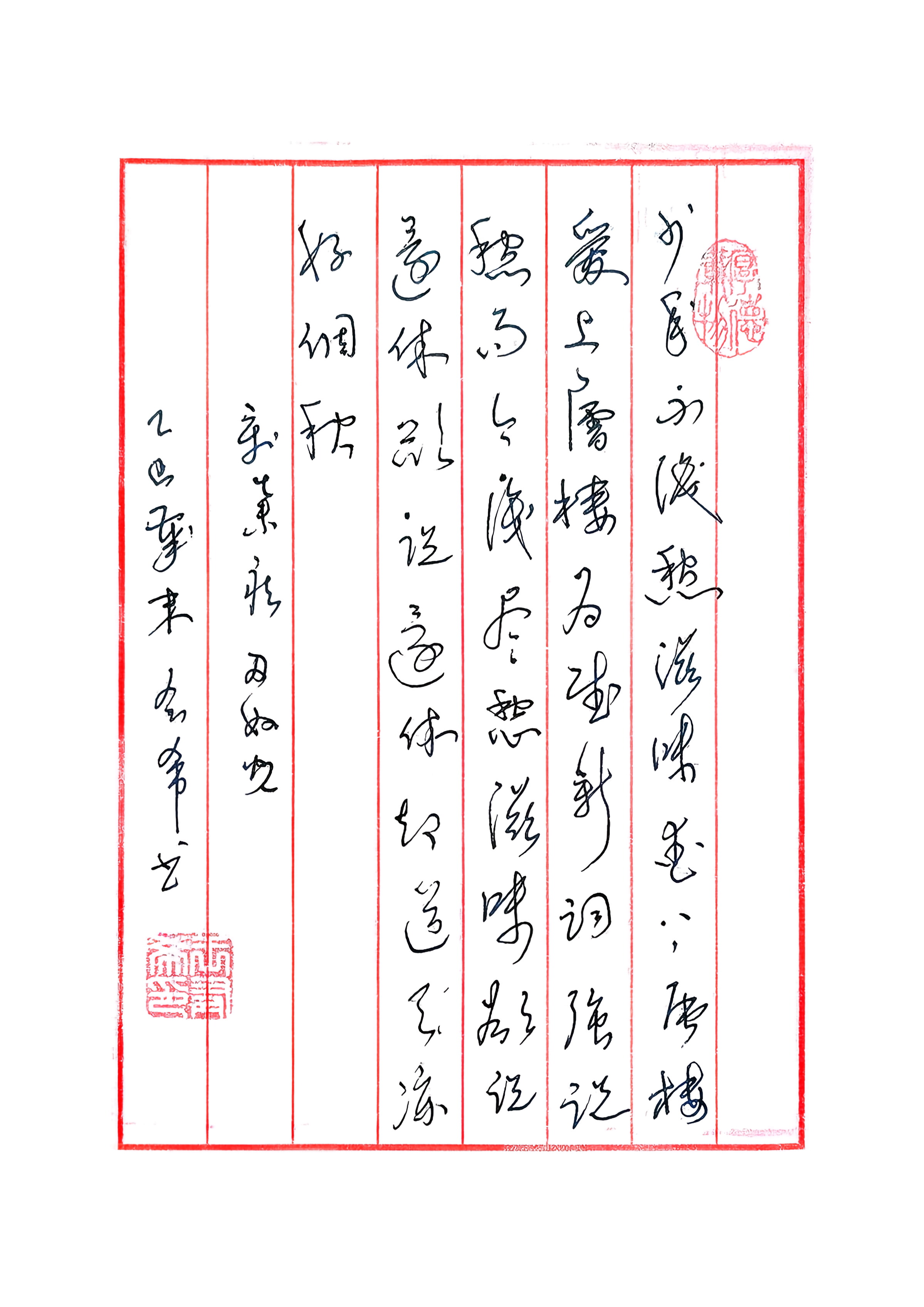 本人书法赏析之2 这幅草书作品书写的是辛弃疾《丑奴儿·书博山道中壁》,整体观感清雅蕴藉,与词意相得益彰: - 技法层面:线条流畅婉转,提按顿挫间见细腻,结体灵动自然,虽为草书却不失清雅之致,体现出书写者对笔墨的精准把控。 - 气韵层面:笔势舒缓有致,如行云流水,与词中“少年不识愁滋味”“欲说还休”的沉郁心境相呼应,将那份欲言又止的沧桑感,通过笔墨节奏缓缓传递。 - 章法层面:布局疏密得当,红栏与墨字相映,印章点缀其间,既具传统信笺的雅致,又不失草书的洒脱,整体和谐统一。