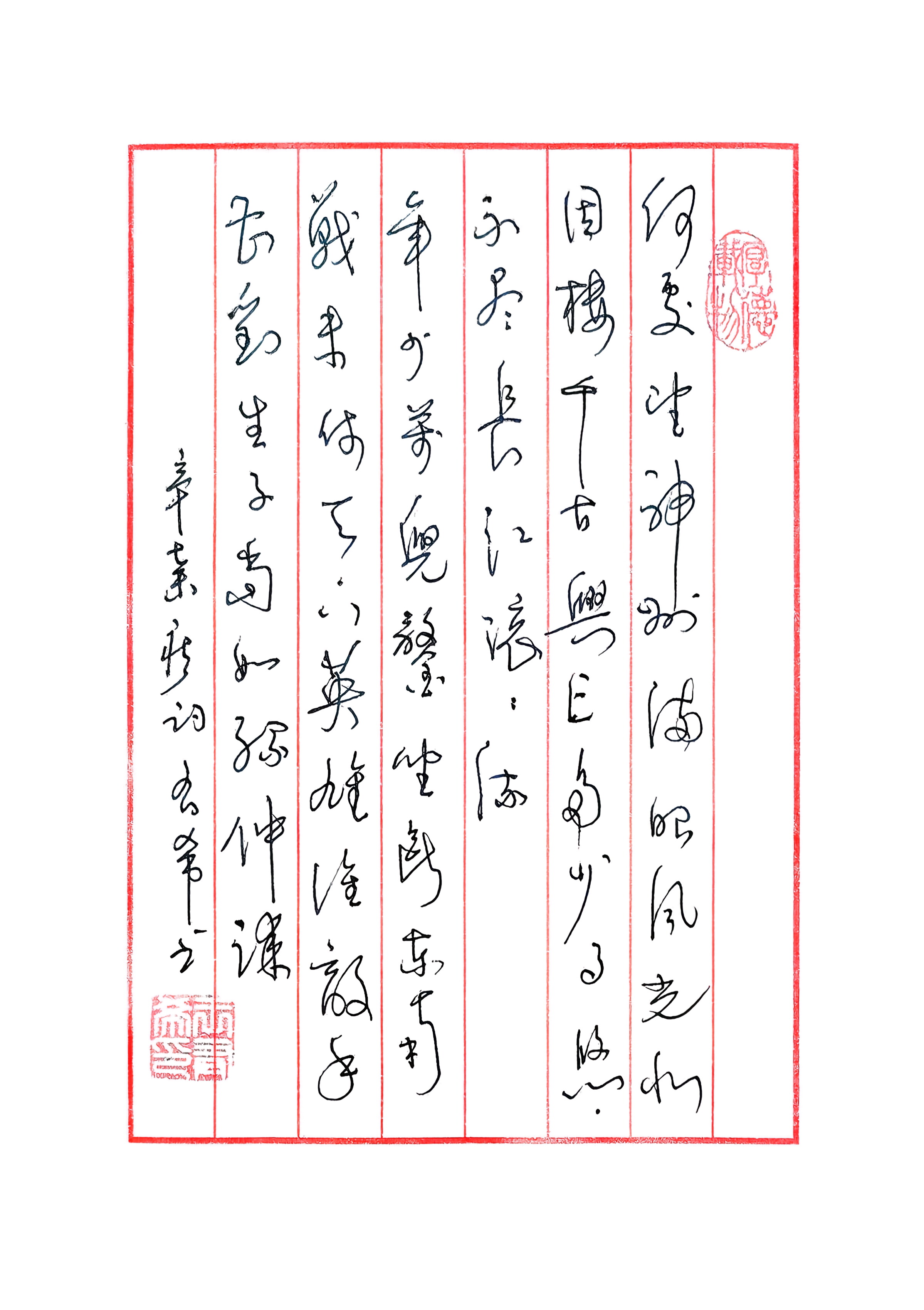 本人书法赏析之7 这幅辛弃疾《南乡子·登京口北固亭有怀》草书有以不特点。 【品其势】 笔势如长江奔涌,线条雄健开张,提按顿挫间似有千钧之力,将“不尽长江滚滚流”的历史浩叹,化作奔涌的笔墨洪流,气势撼人。 【品其骨】 结体刚劲斩截,字态昂扬,如英雄立马,暗合词中“年少万兜鍪,坐断东南”的英武风骨,尽显辛弃疾渴望收复失地的壮志豪情。 【品其韵】 章法如凭栏远眺,红栏信笺似北固亭栏,墨字错落如江山形胜,末句“生子当如孙仲谋”的收束,于怀古中寄寓忧国之思,尽显辛词“以笔为戈”的沉郁与豪迈。