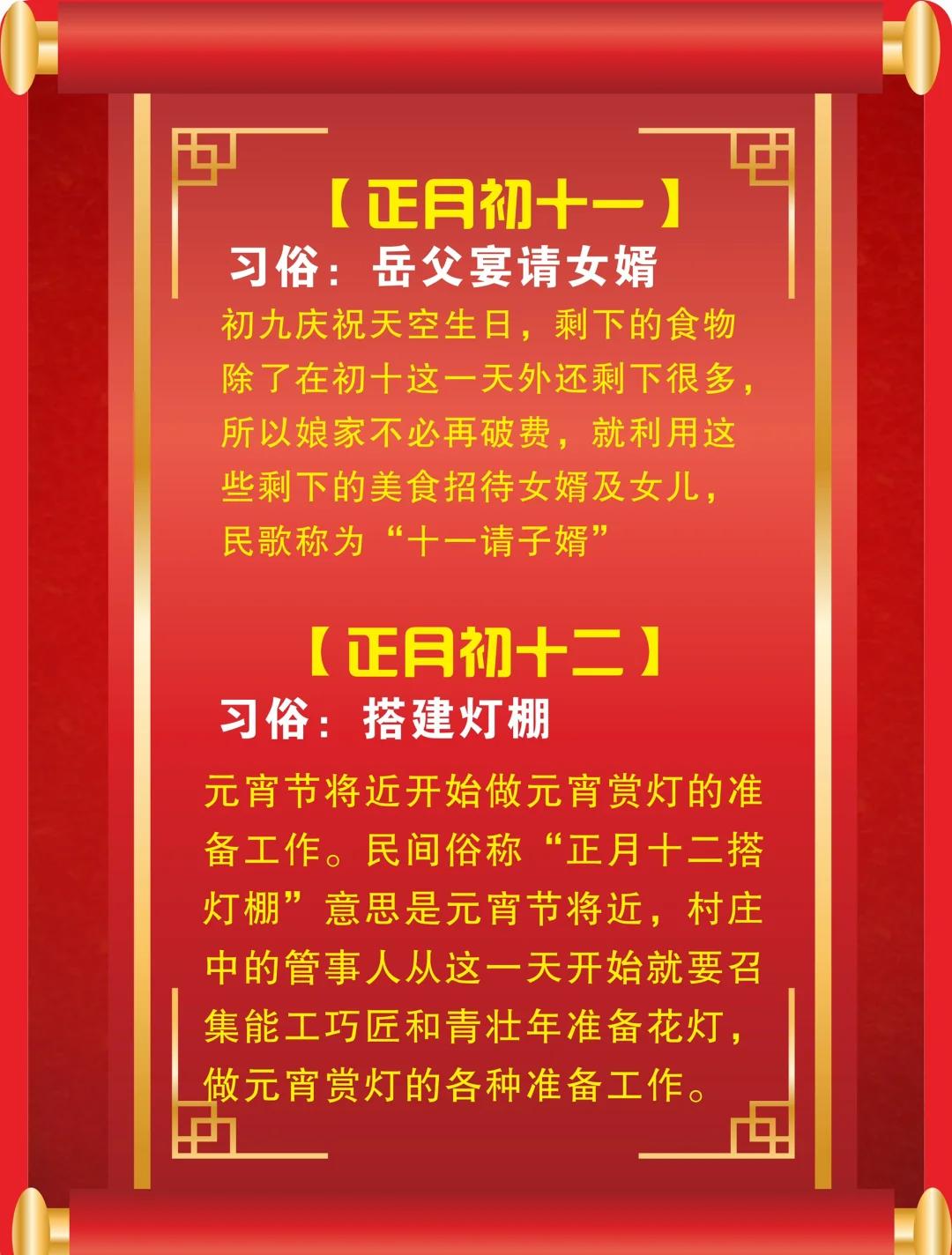 【正月初十一】 习俗:岳父宴请女婿 初九庆祝天空生日,剩下的食物除了在初十这一天外还剩下很多所以娘家不必再破费,就利用这些剩下的美食招待女婿及女儿,民歌称为"十一请子婿" 【正月初十二】 习俗:搭建灯棚 元宵节将近开始做元宵赏灯的准备工作。民间俗称"正月十二搭灯棚"意思是元宵节将近,村庄中的管事人从这一天开始就要召集能工巧匠和青壮年准备花灯,做元宵赏灯的各种准备工作。