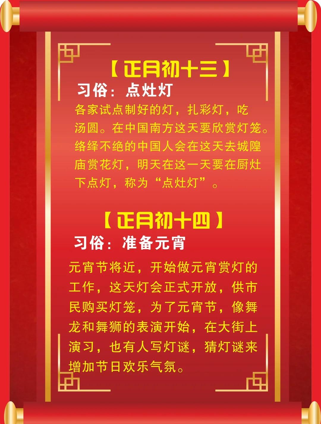 【正月初十三】 习俗:点灶灯 各家试点制好的灯,扎彩灯,吃汤圆。在中国南方这天要欣赏灯笼。络绎不绝的中国人会在这天去城隍庙赏花灯,明天在这一天要在厨灶下点灯,称为"点灶灯"。 【正月初十四】 习俗:准备元宵 元宵节将近,开始做元宵赏灯的工作,这天灯会正式开放,供市民购买灯笼,为了元宵节,像舞龙和舞狮的表演开始,在大街上演习,也有人写灯谜,猜灯谜来增加节日欢乐气氛。