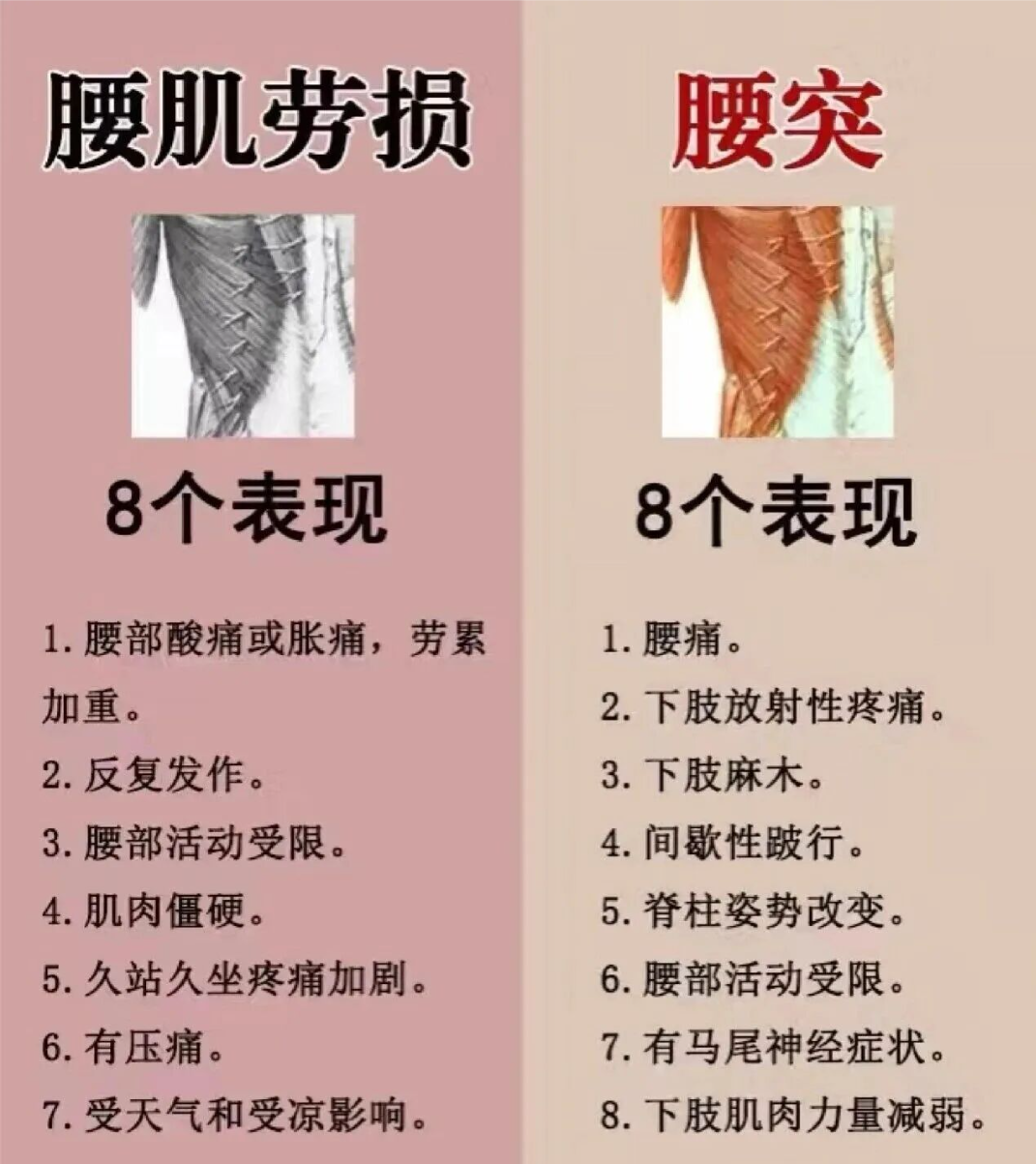 腰肌劳损是肌肉损伤,无下肢症状; 腰椎间盘突出是神经受压,多伴下肢放射痛。 🔹 腰肌劳损(肌肉层面问题) 症状:腰部酸痛、胀痛,疼痛范围局限,久坐、久站或弯腰后加重,适当活动后可缓解,无下肢不适。 原因:长期不良姿势、反复腰部劳累、急性肌肉拉伤后未彻底恢复等。 治疗:以保守调理为主,注意休息、局部热敷、物理因子、适度按摩,配合腰部肌肉功能锻炼。 🔹 腰椎间盘突出(神经受压问题) 症状:腰部突发剧痛,可放射至下肢,伴随下肢麻木、疼痛,咳嗽、打喷嚏或弯腰时痛感加重。 原因:腰椎间盘退行性变、外伤、长期负重、弯腰劳作不当等。 治疗:可通过推拿、物理治疗、药物调理缓解,症状严重、神经受压明显时需手术干预。