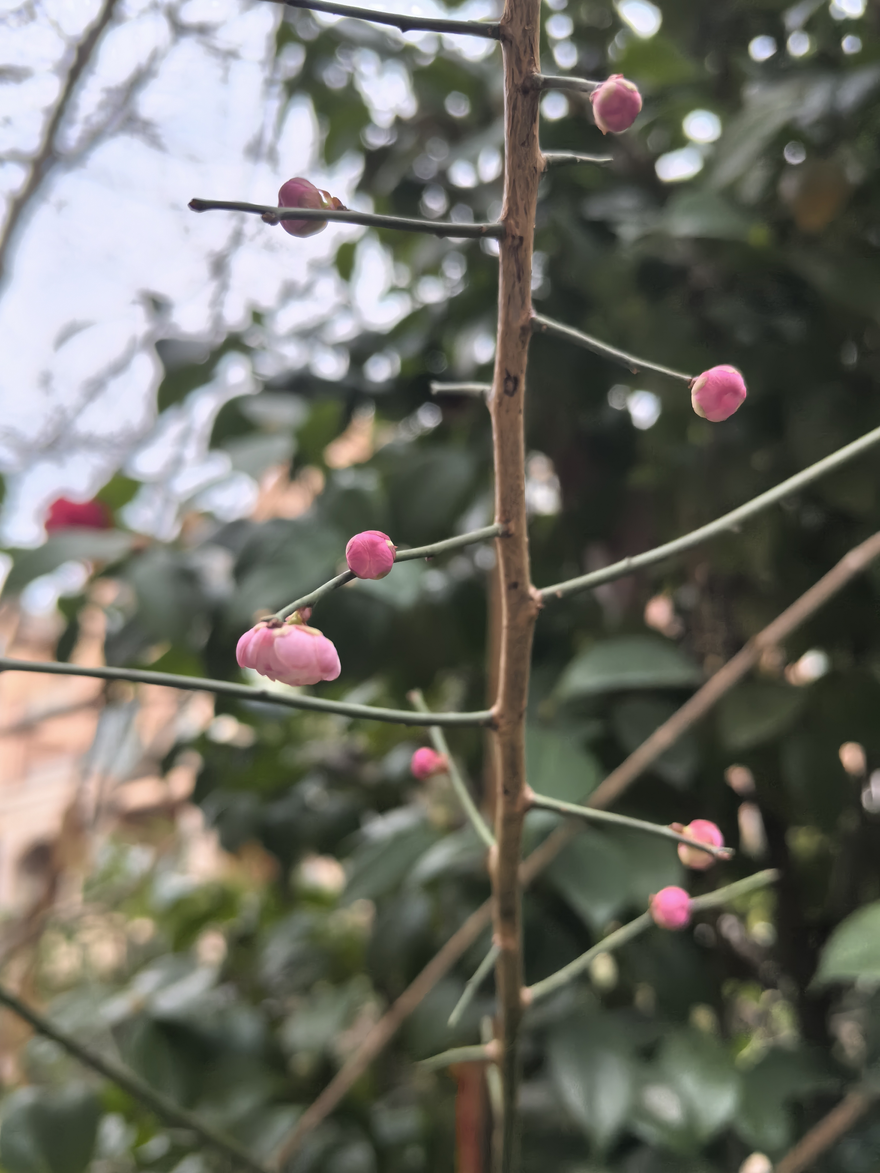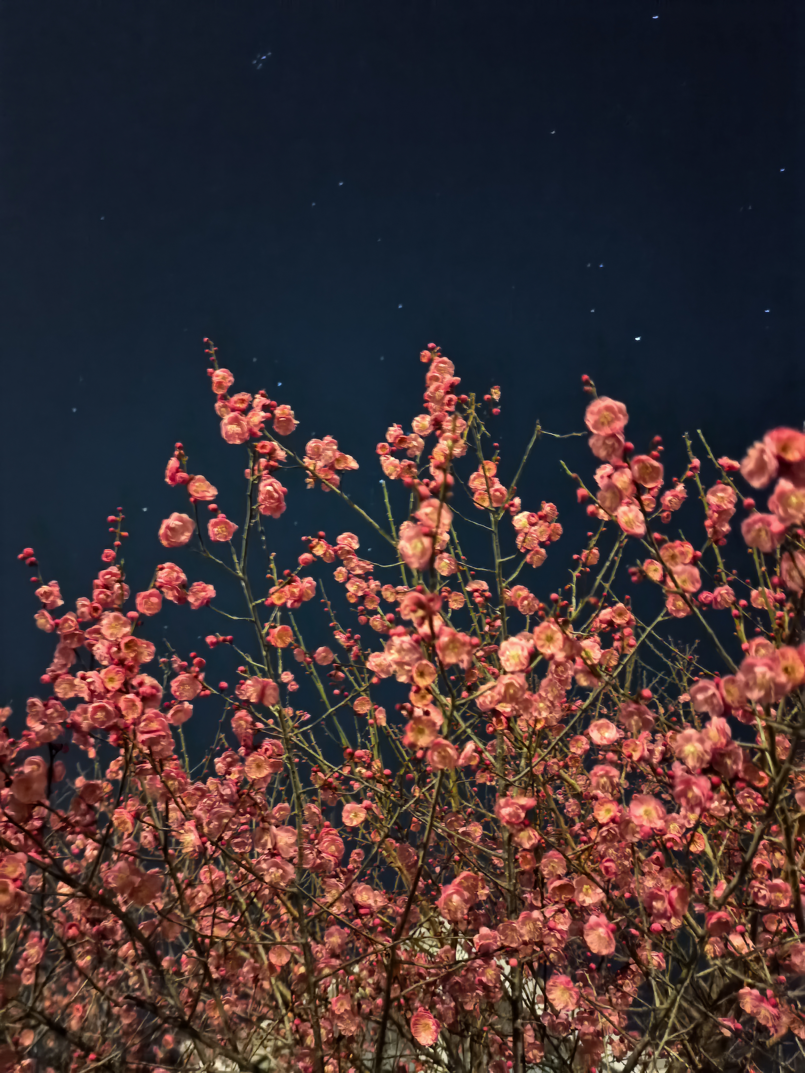 枝头粉梅初绽,花苞微露,在夜色与星辉间静默吐纳,光影流转,冬园如诗。