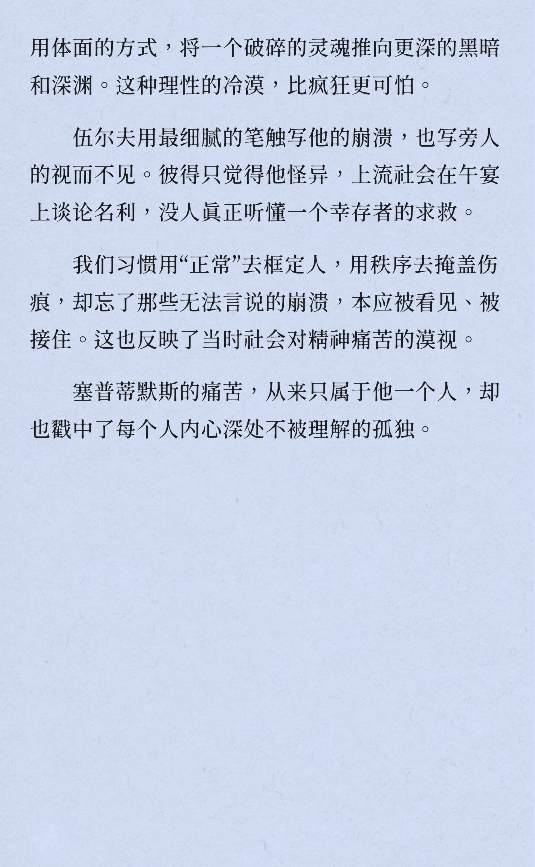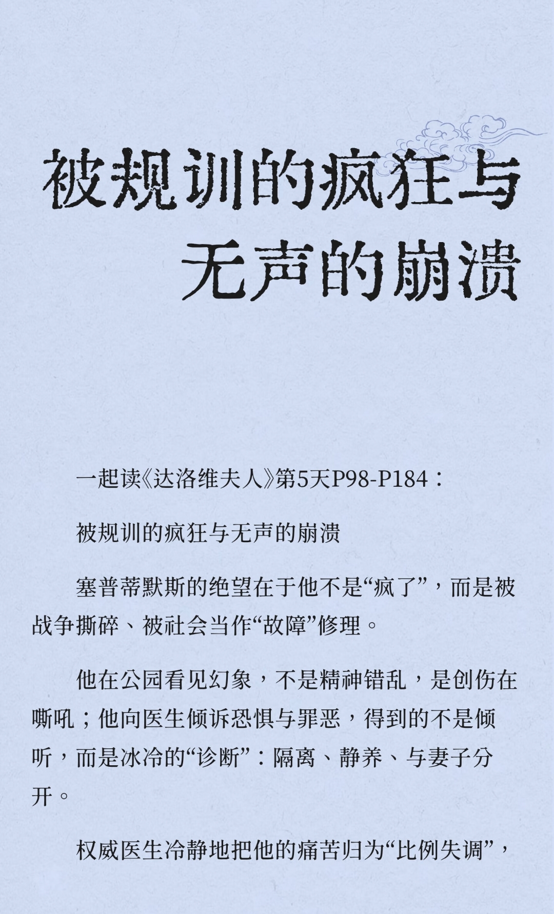 文学经典 | 《达洛维夫人》(五) 一起读《达洛维夫人》第5天 第98-184页: 被规训的疯狂与无声的崩溃 塞普蒂默斯的崩溃源于战争创伤和社会的冷漠。他看到幻象却得不到理解,权威医生的“诊断”加剧了他的绝望。 伍尔夫细腻描绘了他的崩溃,反映了当时社会对精神痛苦的漠视,揭示了孤独与不被理解的普遍性。