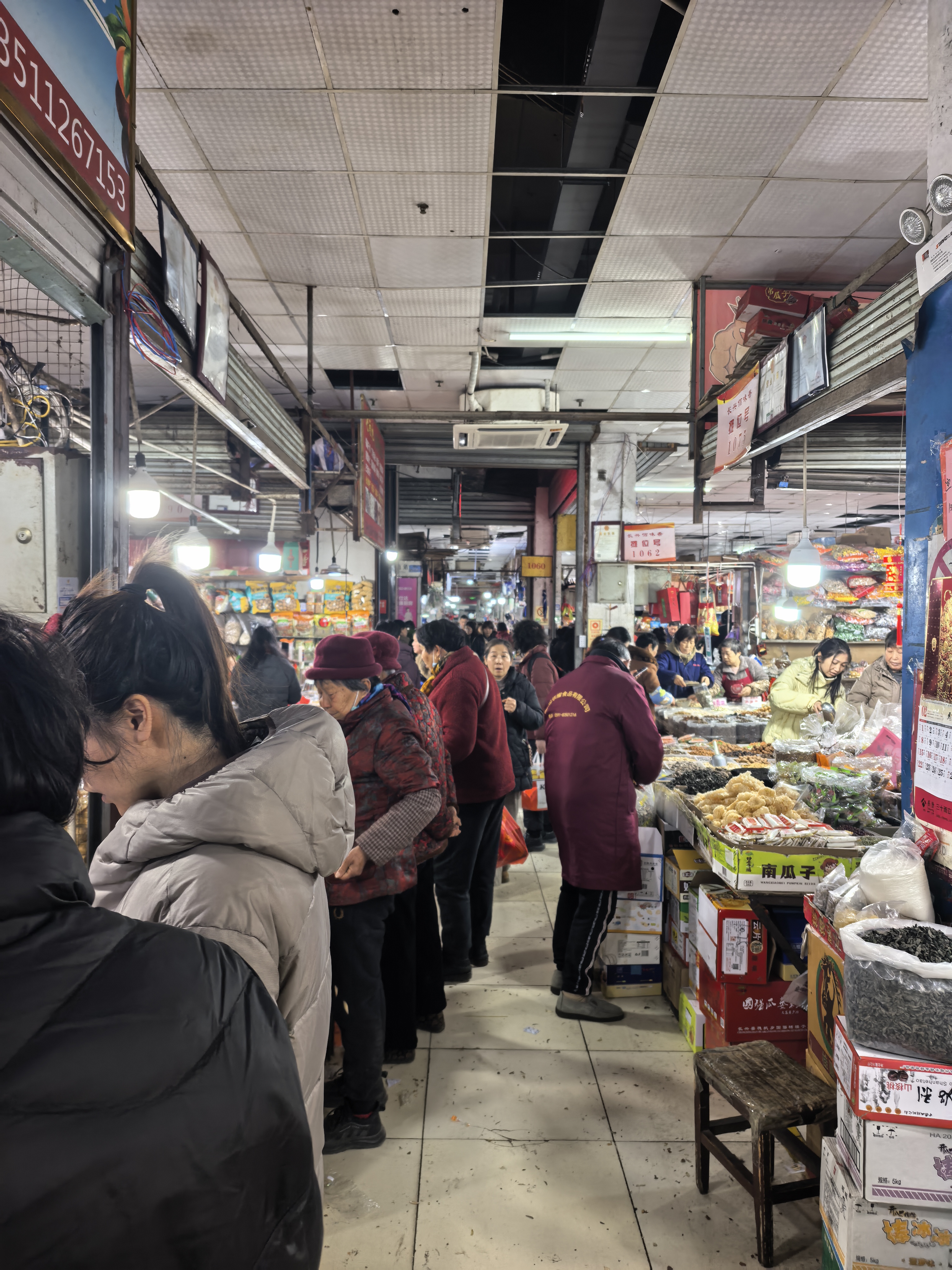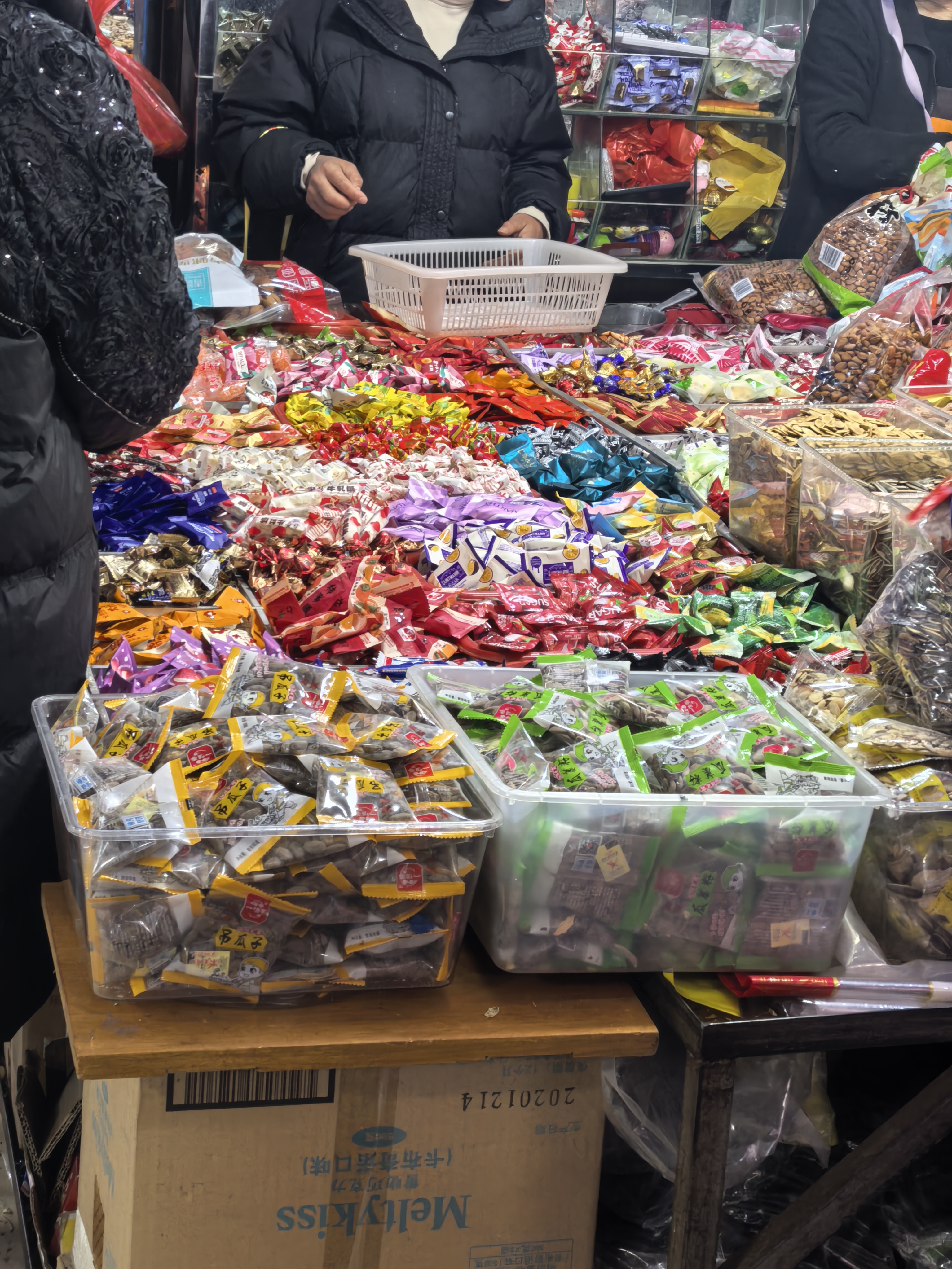 过年最有年味的地方就是这里了,人山人海,每个摊位都在售卖各种年货,如糖果、干货、酒水、礼品等,人们可以在这里一站式购齐过年所需,非常方便。灯光暖,瓷砖亮,商贩笑着递糖,顾客笑着接福——这烟火气,就是最踏实的春节预告 🍫✨