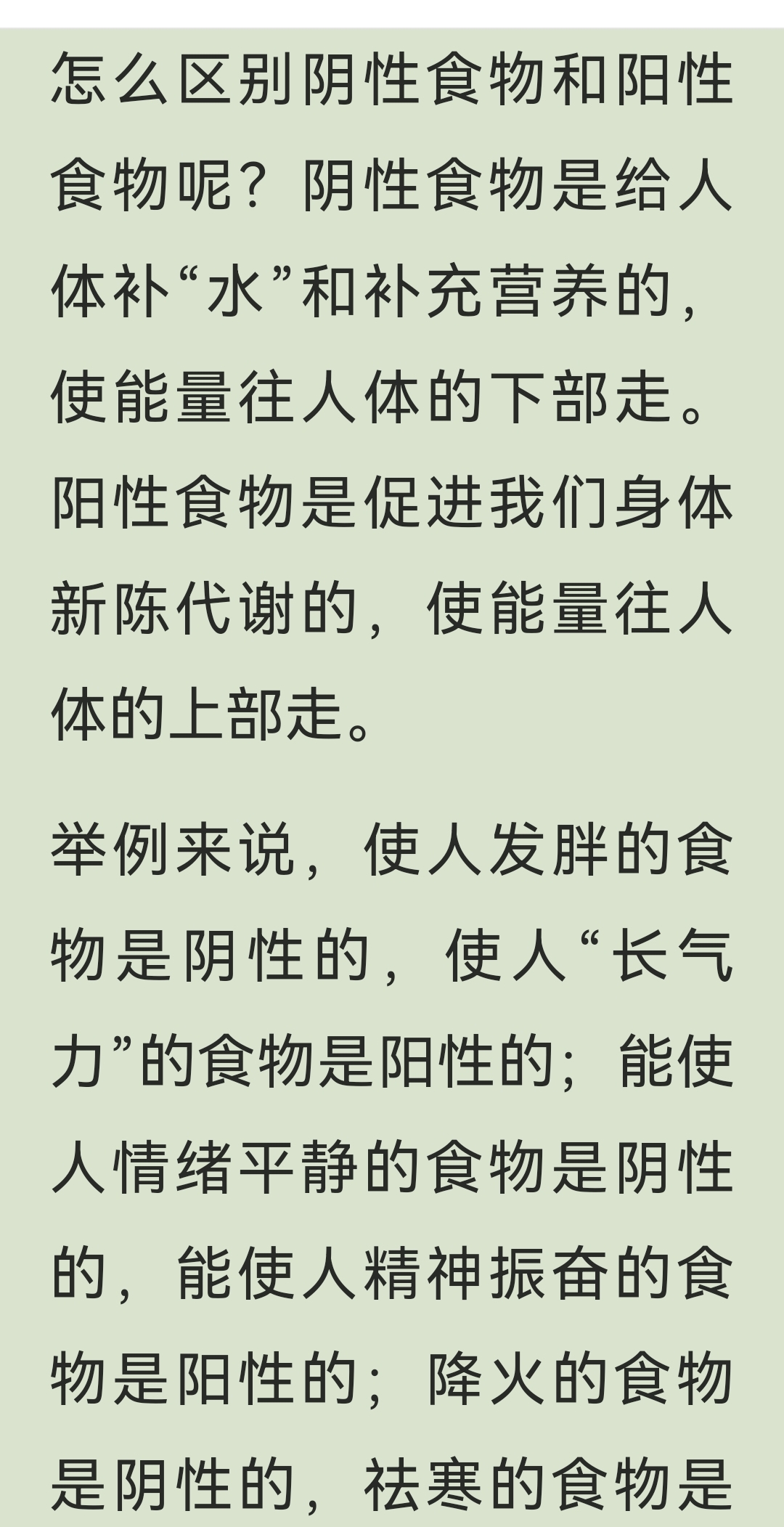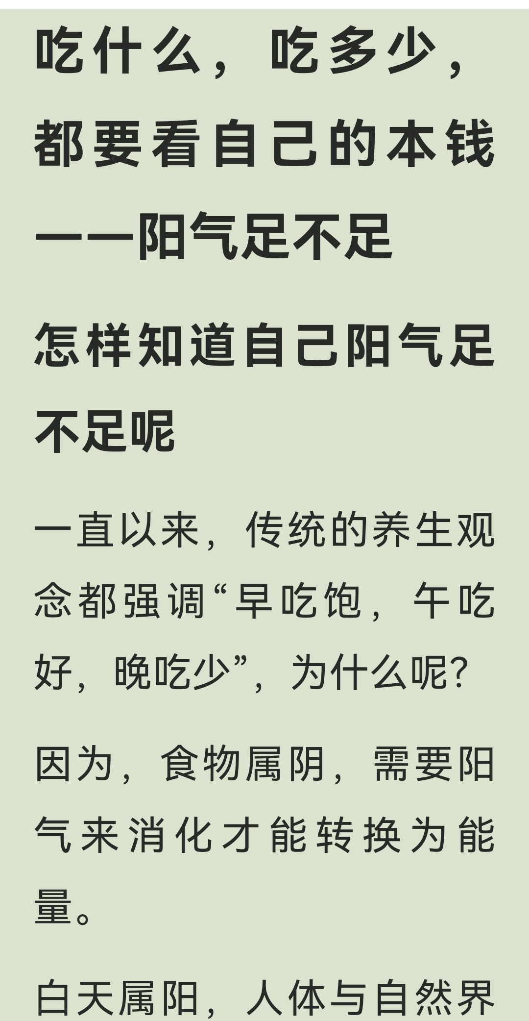 《回家吃饭的智慧》第一章第三小节读书笔记: 一、主要内容 1. 饮食的“本钱”是阳气 食物属阴,需要人体的阳气来消化吸收,才能转化为能量。因此,“吃什么、吃多少”都要以自身阳气是否充足为前提。传统养生“早吃饱,午吃好,晚吃少”的原则,正是因为白天属阳,人体阳气旺盛,消化能力强;夜晚属阴,阳气收敛,过多进食会加重身体负担。 2. 判断阳气是否充足的三个维度 - 年龄:随着年龄增长,人体阳气会自然衰减。 - 运动量:久坐少动的人,阳气普遍不足,因为“动则生阳”。 - 是否怕冷:越是畏寒怕冷,说明体内阳气越亏虚。 3. 食物的阴阳属性与搭配原则 - 阴性食物:主要作用是滋养、补充营养,使能量向下,如使人发胖、情绪平静、降火的食物。 - 阳性食物:主要作用是推动新陈代谢,使能量向上,如使人“长气力”、精神振奋、祛寒的食物。 - 核心原则:当食用了阴性较强的食物后,一定要搭配阳性食物来平衡;反之,阳性食物“补”后,也需要阴性食物补充营养,才能发挥效果。 4. 补养的辩证关系 以补血为例,阿胶是补充造血原料(阴性),当归是补充造血能量(阳性)。如果只吃当归(阳性)却不规律吃饭(缺乏阴性营养),身体就没有原料造血,补养效果会大打折扣。这说明,任何补养都不能脱离日常饮食的基础。 二、心得(个人观点) 这一小节让我对“吃”的理解从“吃什么”深入到了“怎么吃才适合自己”,核心是平衡与顺应。 1. 养生不是跟风,而是自知 我们常被各种“超级食物”和“养生食谱”吸引,却忽略了最根本的一点:没有普适的健康方案,只有适合自己体质的选择。判断自己阳气是否充足,就是认识自己身体的第一步。比如,久坐办公室的人阳气不足,就不宜过多食用生冷、滋腻的阴性食物,否则会加重身体负担。 2. 饮食的智慧在于阴阳平衡 食物的阴阳不是绝对的,而是相对的。吃了大鱼大肉(阴性),就需要搭配葱姜蒜(阳性)来帮助运化;吃了温补的羊肉(阳性),就需要搭配萝卜(阴性)来避免上火。这种“阴阳搭配”的思维,让我明白健康饮食不是简单的“吃对食物”,而是通过食物的偏性来纠正身体的偏性,达到动态平衡。 3. 回归日常,才是根本 那个只吃当归却不规律吃饭的女孩,让我深受触动。我们总想着用昂贵的补品来“走捷径”,却忘了好好吃饭才是最基础的养生。再好的补药,也需要日常饮食提供的营养作为原料。这提醒我,健康从来不是靠外力“补”出来的,而是在一粥一饭的日常中,用朴素的智慧慢慢“养”出来的。 总的来说,这一小节不仅刷新了我的饮食观,更让我懂得:真正的养生智慧,是在了解自己的基础上,顺应自然,平衡阴阳,把健康融入每一个平凡的日子里。