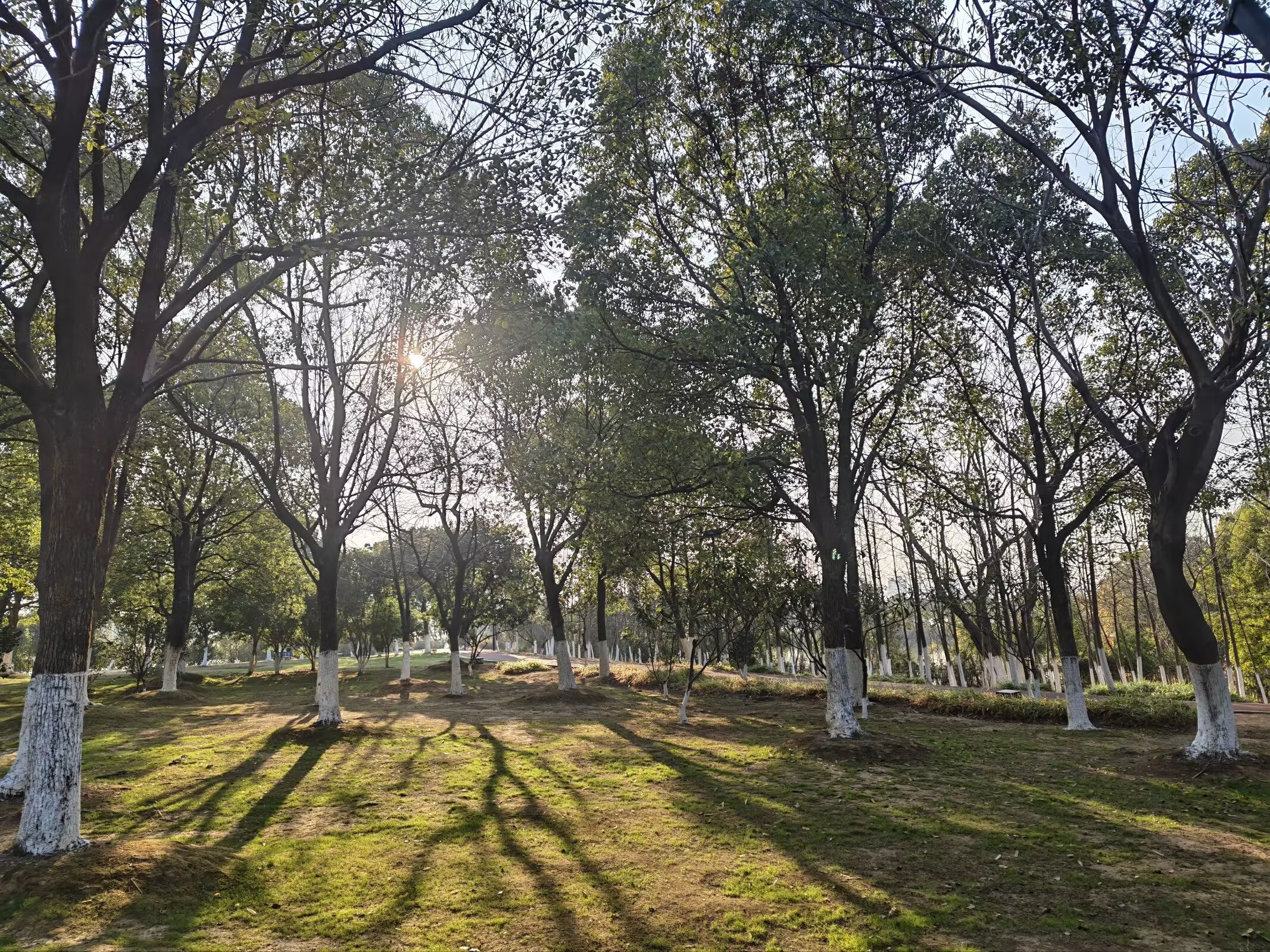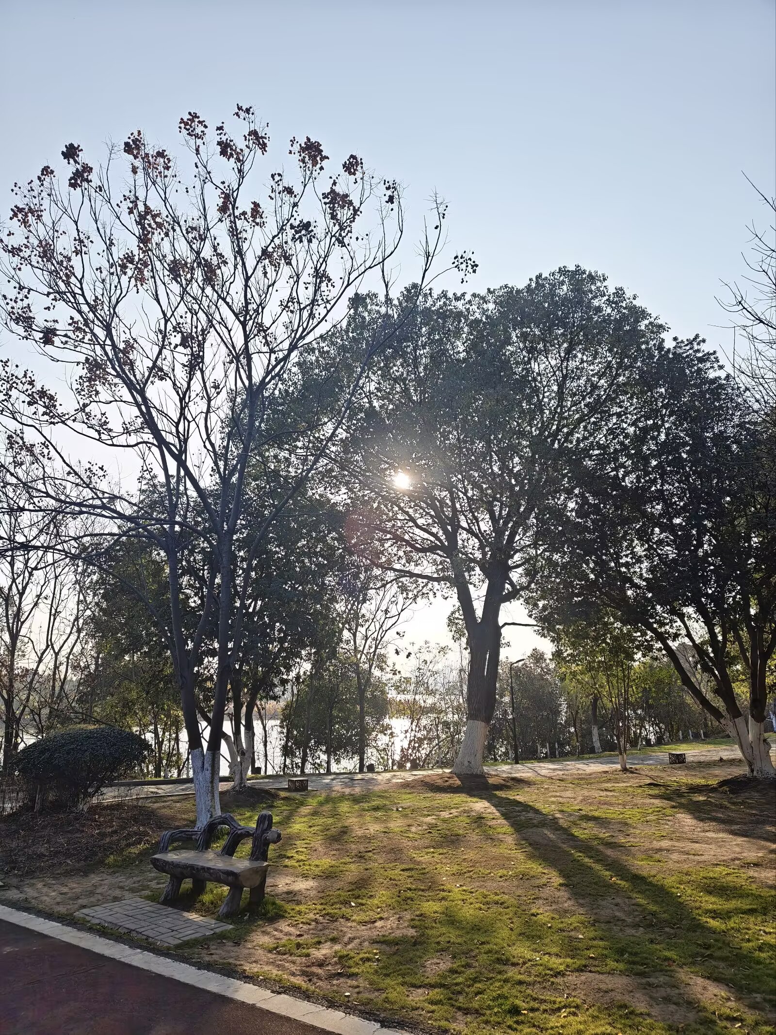 南昌艾溪湖的景色。阳光把树影织成网,铺在冬末的草地上。