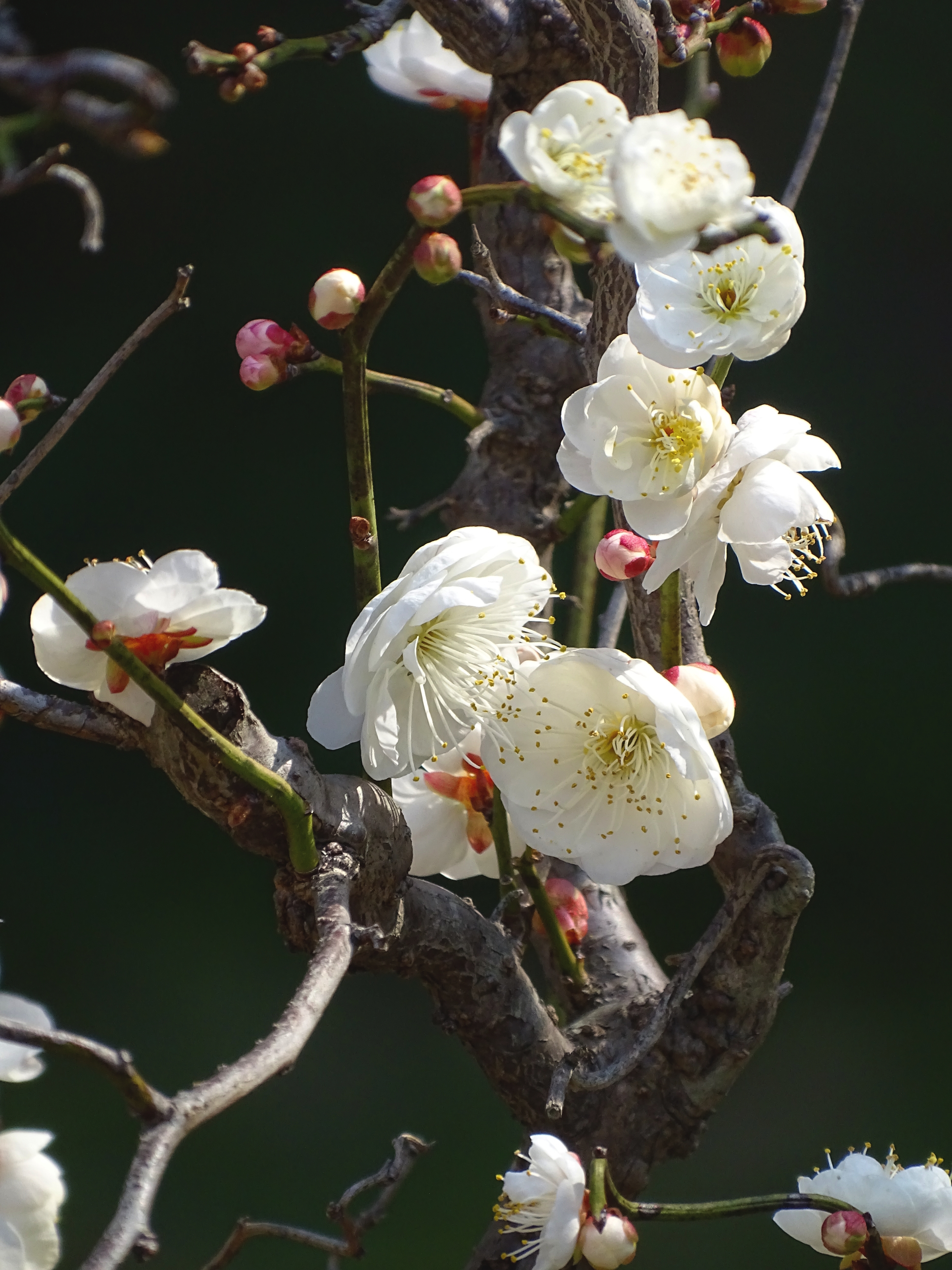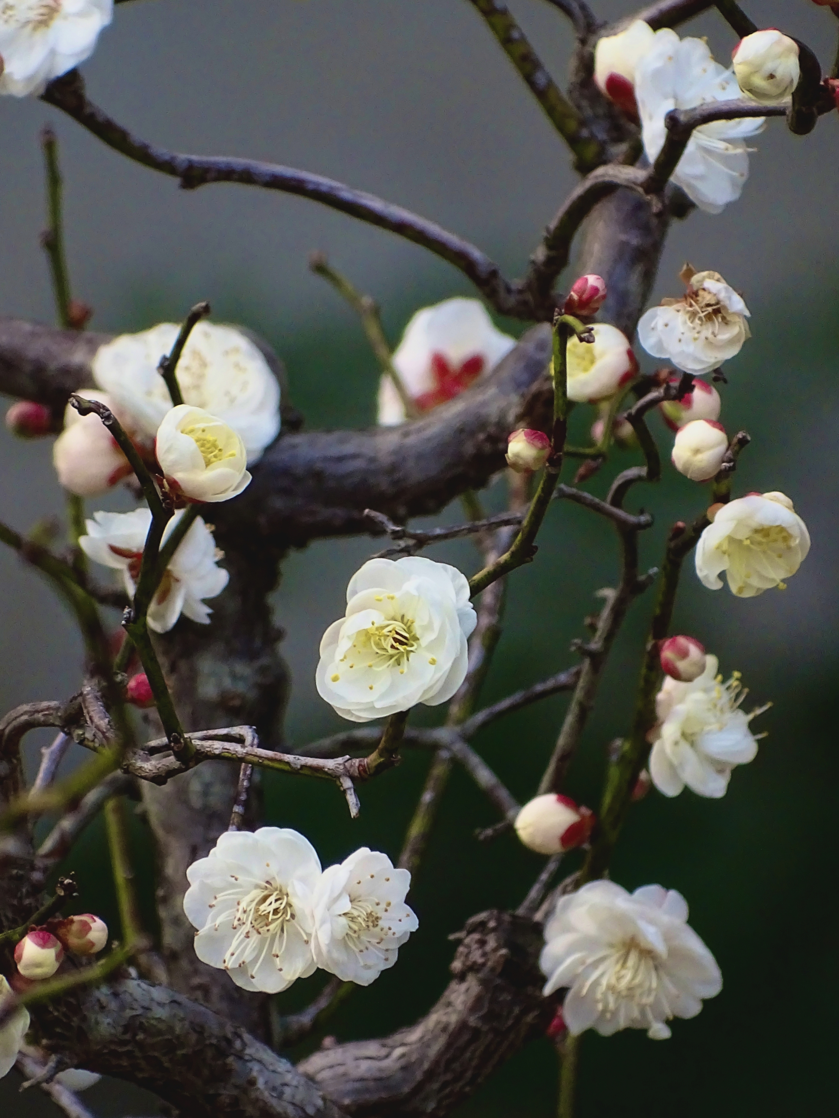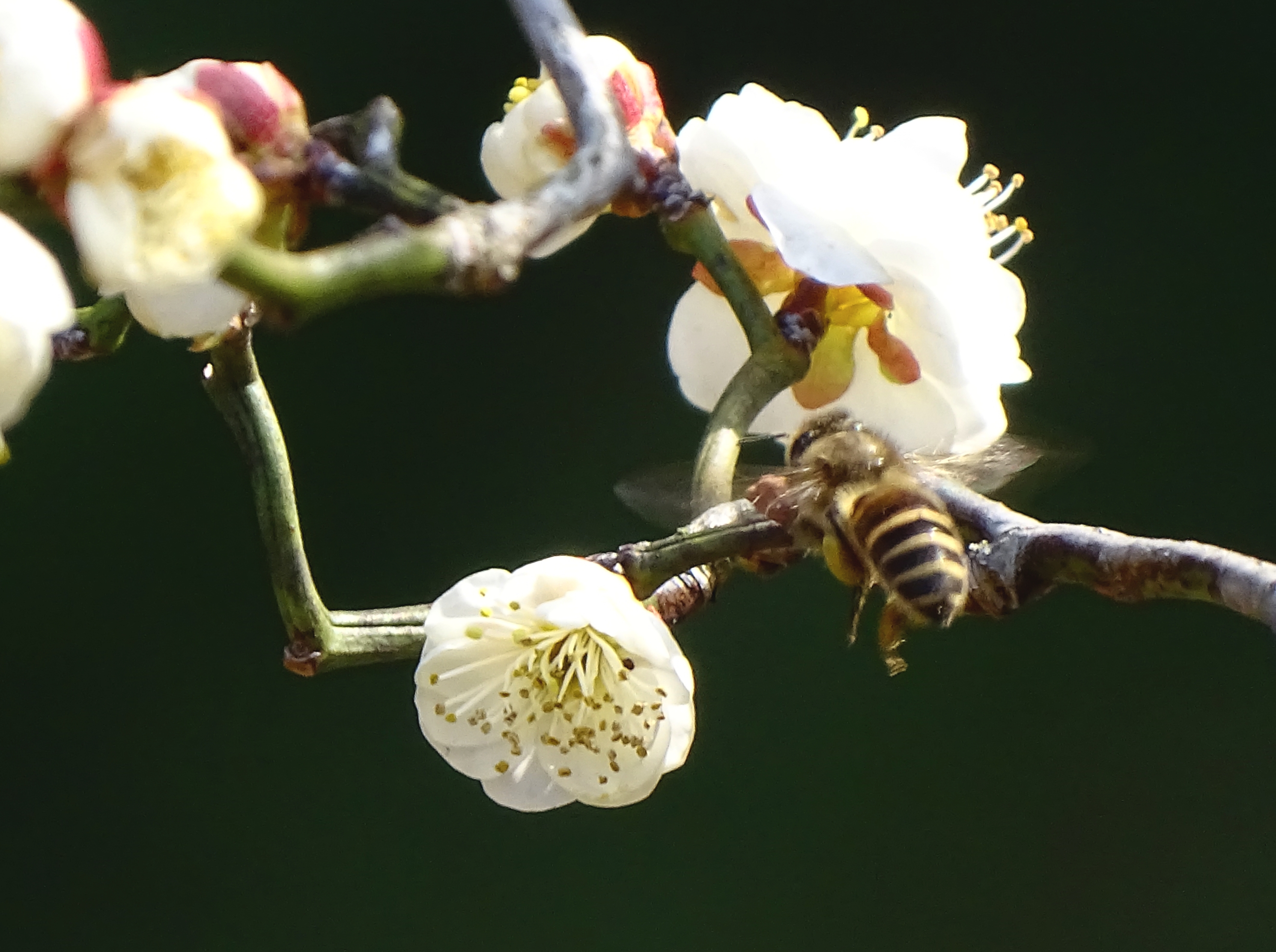 灵峰龙游梅,洁白花瓣衬着红褐色枝干,别有一番雅致。小蜜蜂也被吸引来啦,在花间嗡嗡采蜜,好有生机。这样的小景,看着就让人心里暖暖的。