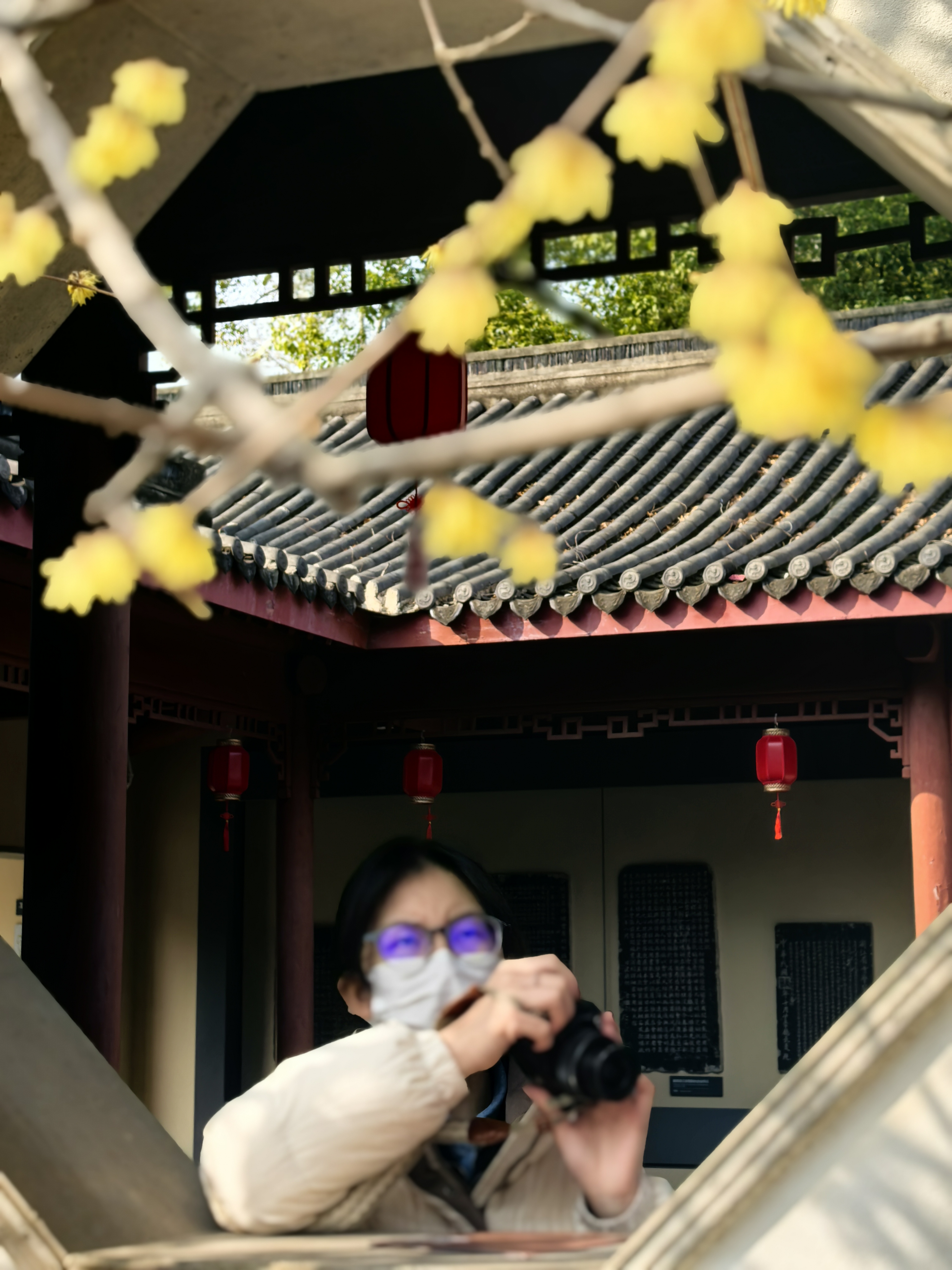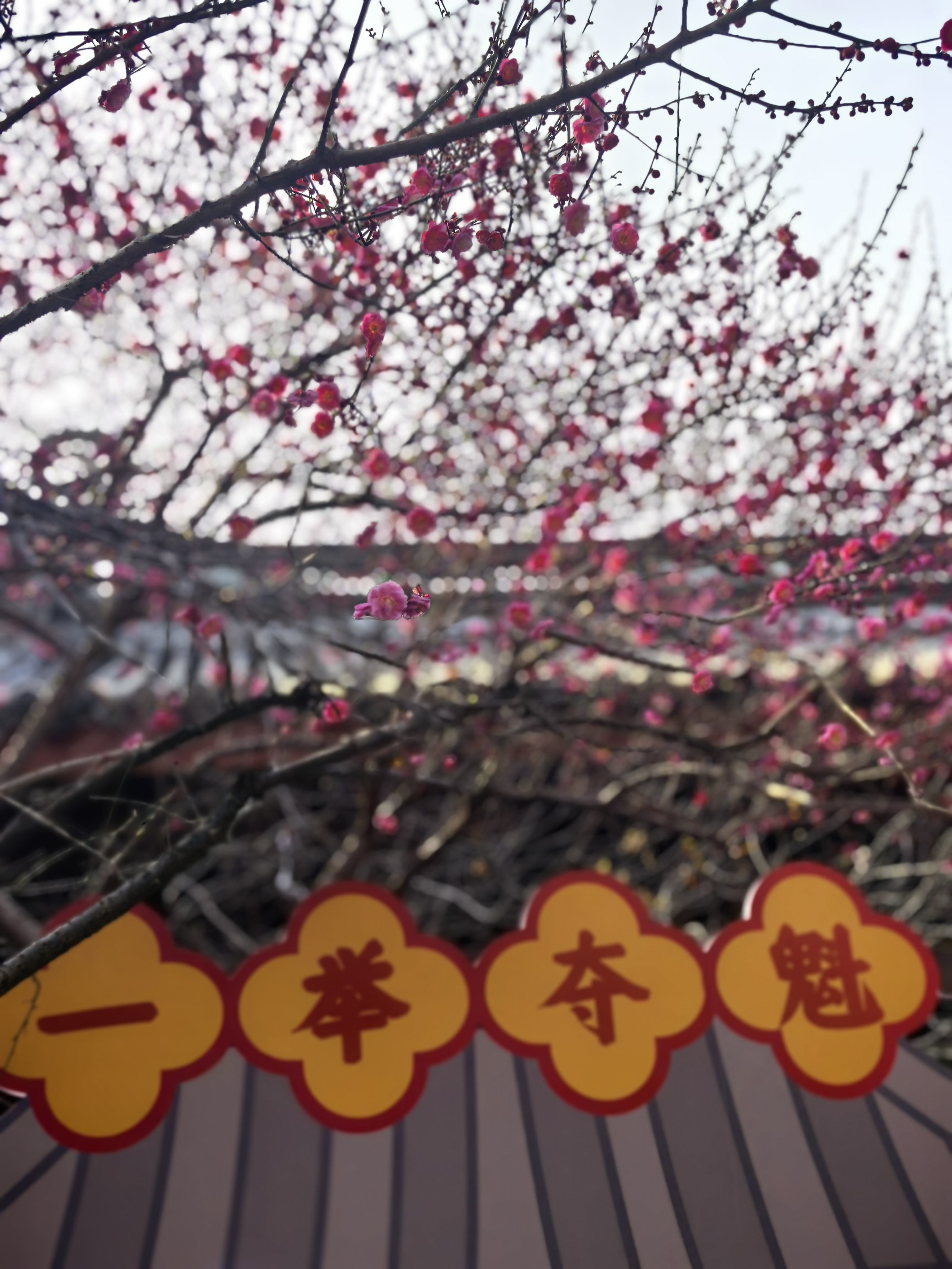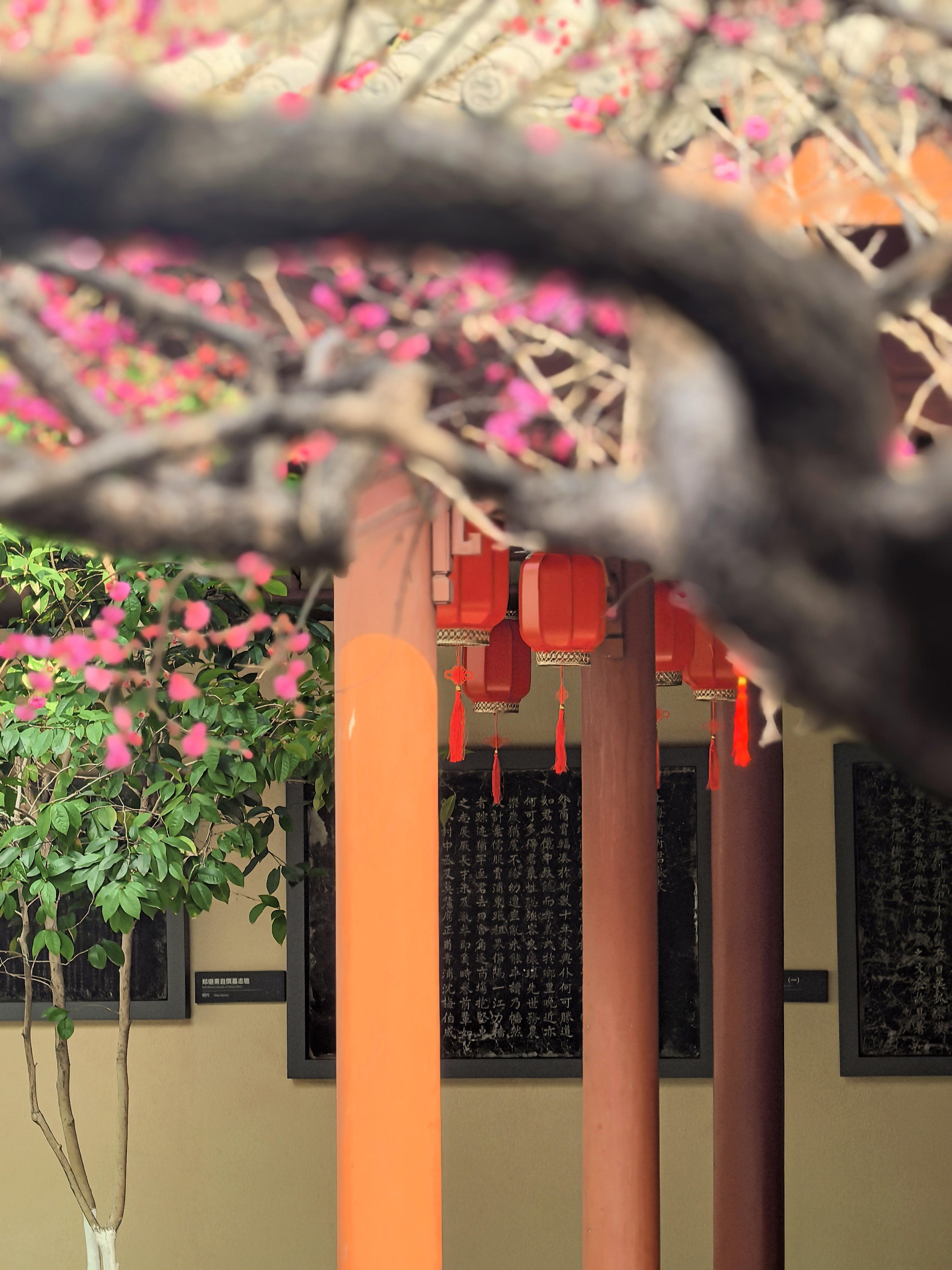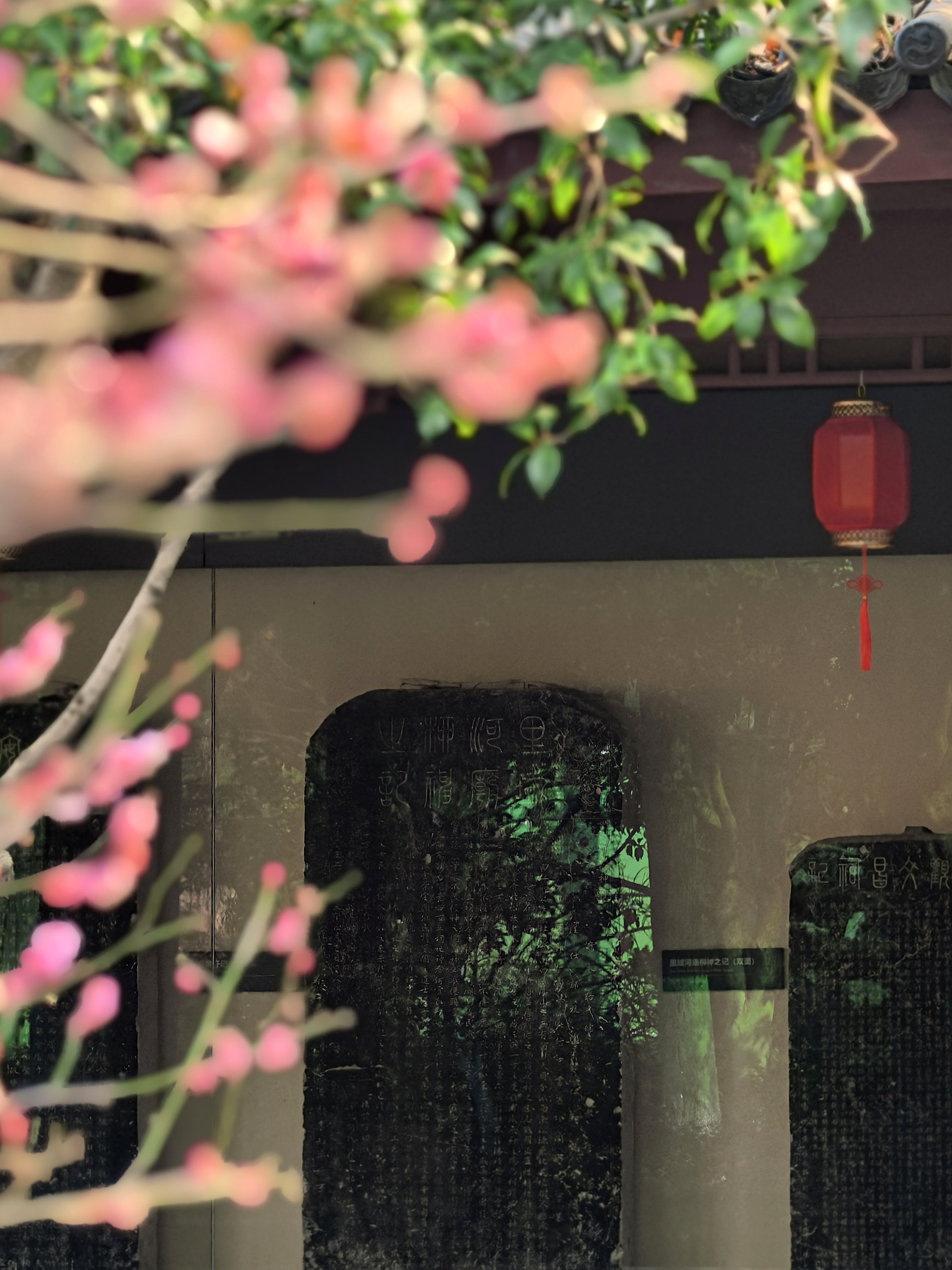 好看的皮囊千篇一律,有趣的灵魂万里挑一。赏梅花也是如此。 藏于吴山闹市的孔庙内,绝大多数也许来赏过金秋的银杏,识过回廊里的众多古碑文物,但在梅花季,将梅花与石碑、石经一同欣赏,却很难得。 梅花仿佛是这些石碑身外跳动着的魂魄,穿越千年时光而来,都活了。而梅花呢,掩映在这些博大高深的碑铭前,沾了说不清的人文底蕴,变得莫名的高雅。 我从不同的角度,将后院内的几株株梅花与石碑同框,不放过一个变化着的鲜活组合。 不光有红梅担纲,还有白梅,蜡梅,也在助力,使得小小的院子,本来只想呆半小时就走的,结果满当当赏了一个多小时。越看越有味儿。