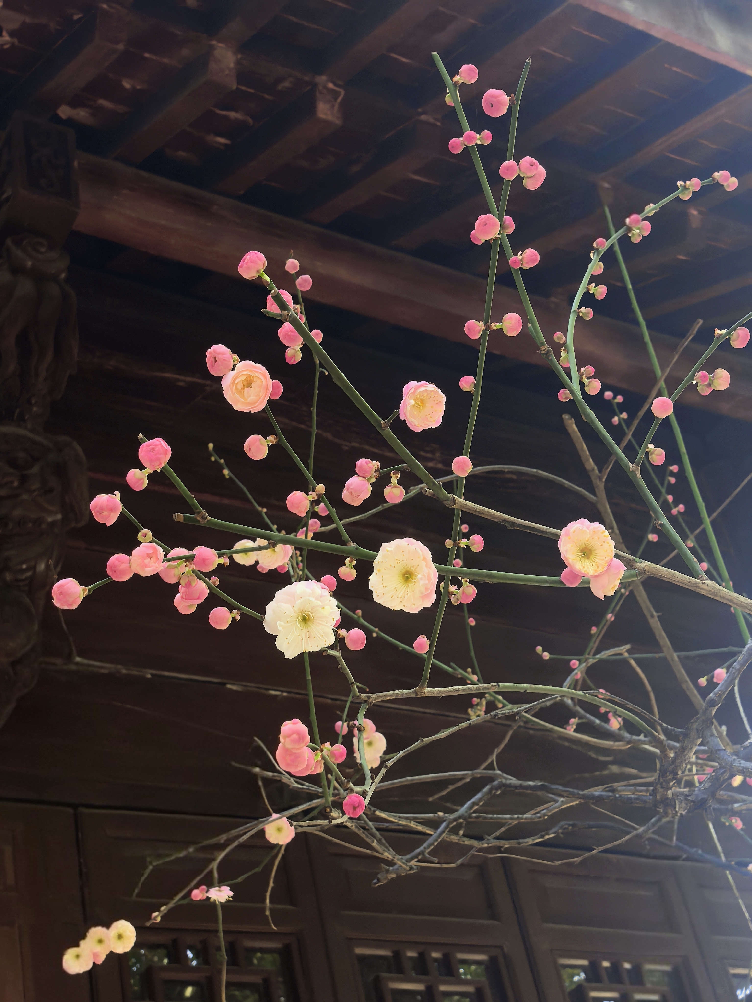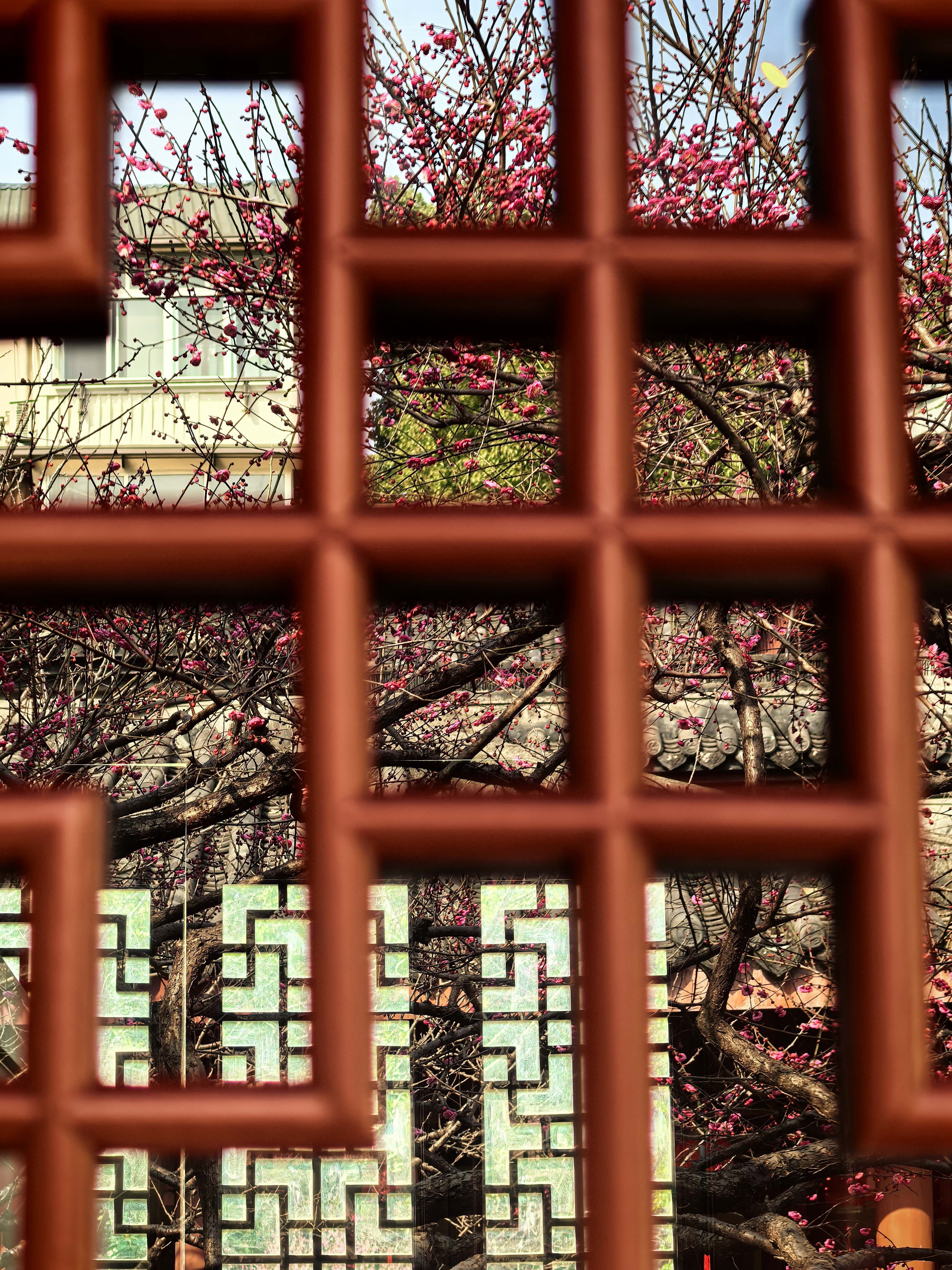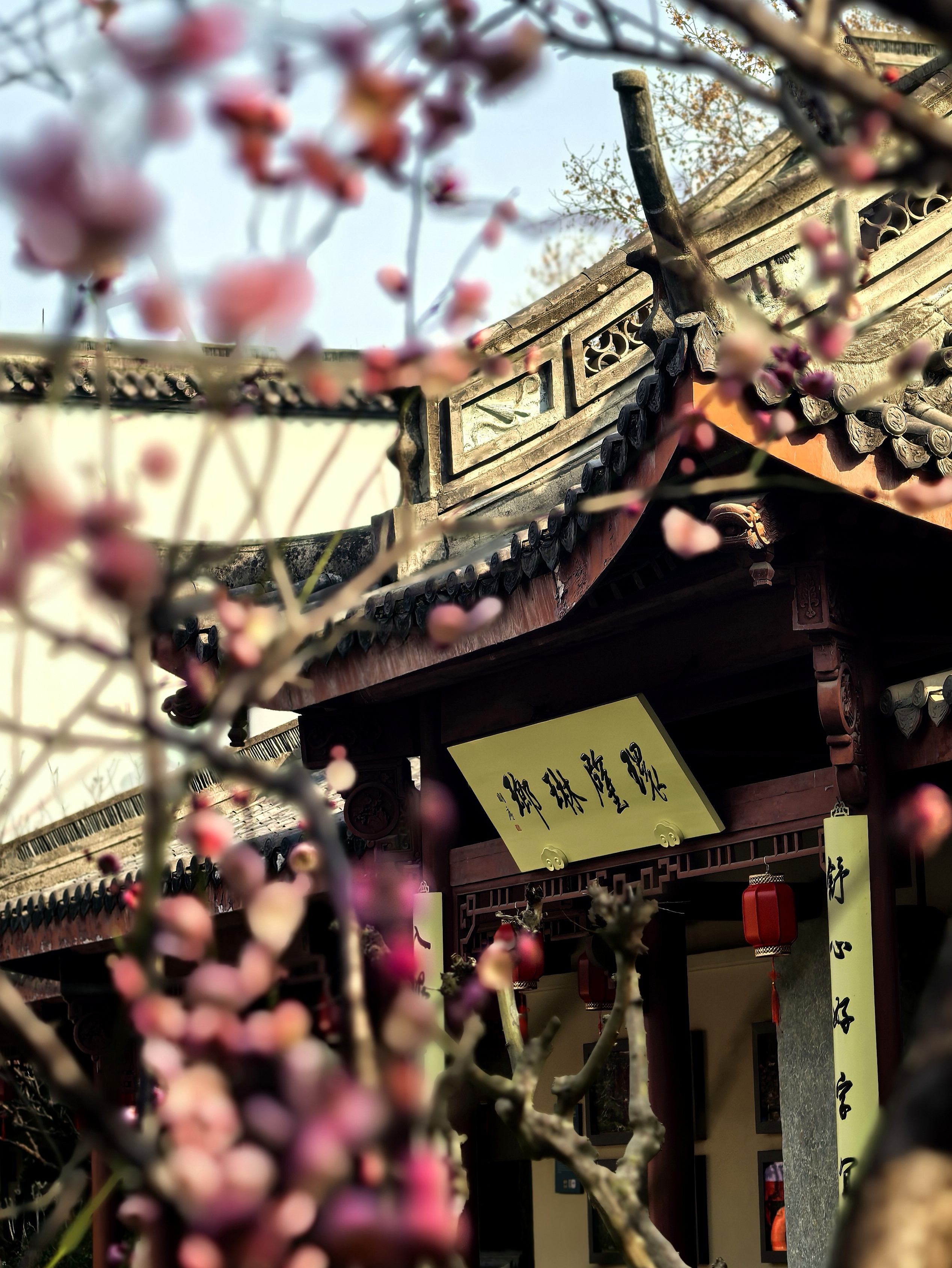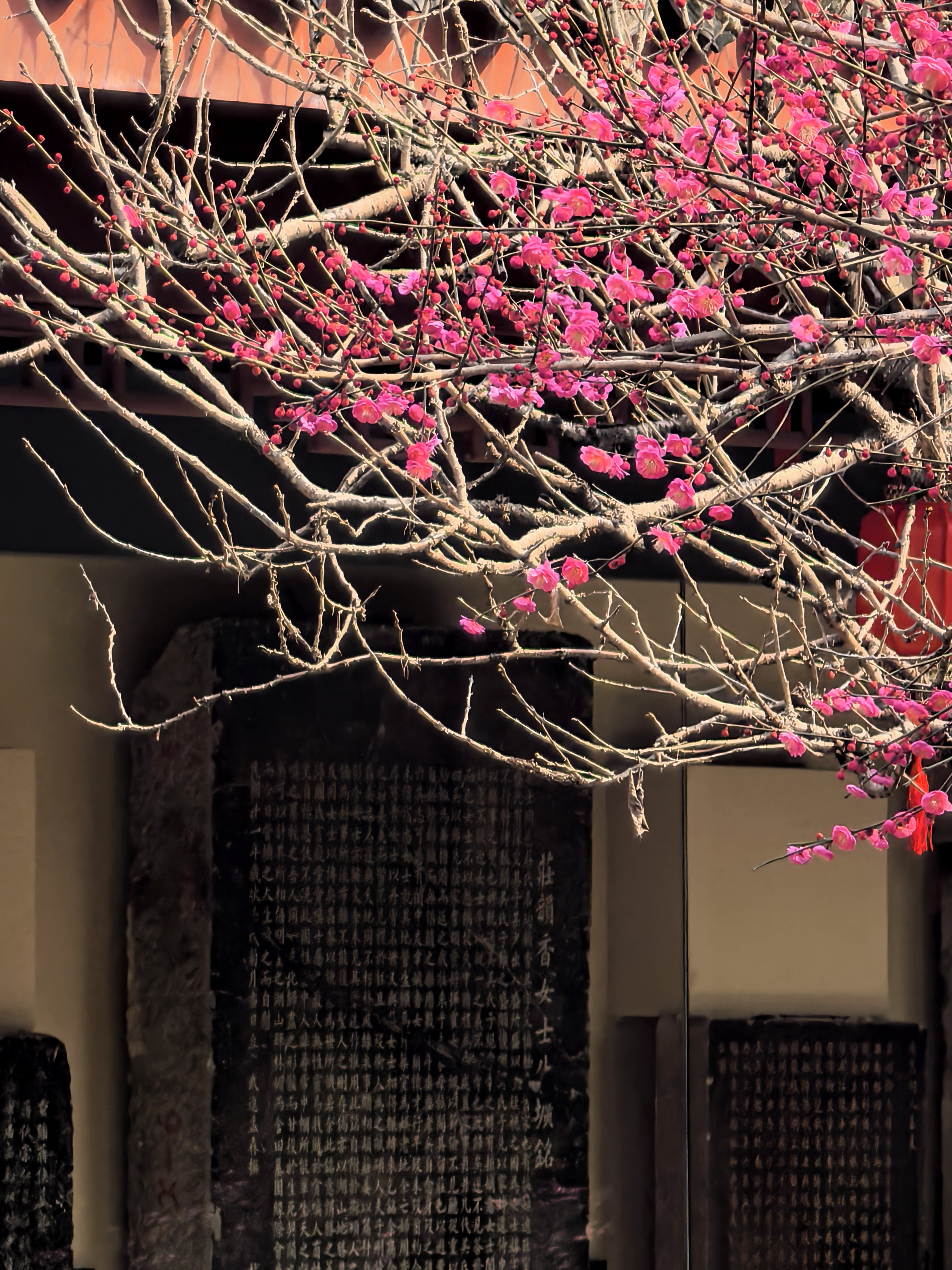 孔庙园子里梅花的确是不多,却处处有寻梅赏梅的意趣。粉墙边斜出几枝红梅,正映着各个朝代斑驳的石纹;白梅三两株,清清淡淡地点在墨池的一角,檐角的兽吻衬着,便成了画。 最不起眼的蜡梅,藏在碑廊深处的窗洞边,幽香一阵阵的,走近了,才见那蜜蜡似的玲珑,那香气是从古碑的缝隙里漫出来的。 孩子们在梅花小景前留影,笑声让梅枝一颤一颤的。在这里,梅不是轰轰烈烈地开给你看,是要你停一停,在碑文间、在水影里、在翘檐指向的天空中,自己去遇见的。杭城赏梅之十七孔庙。