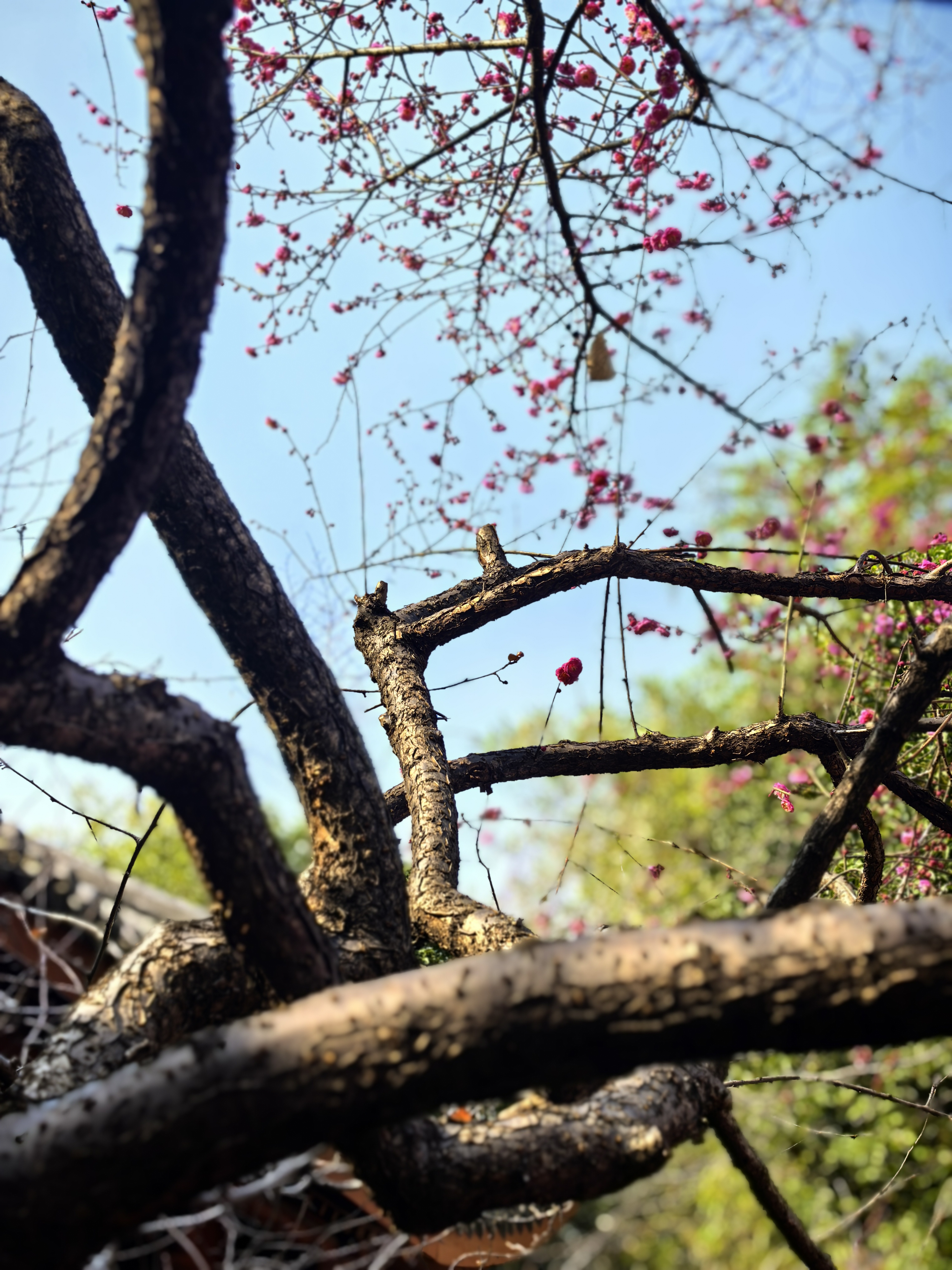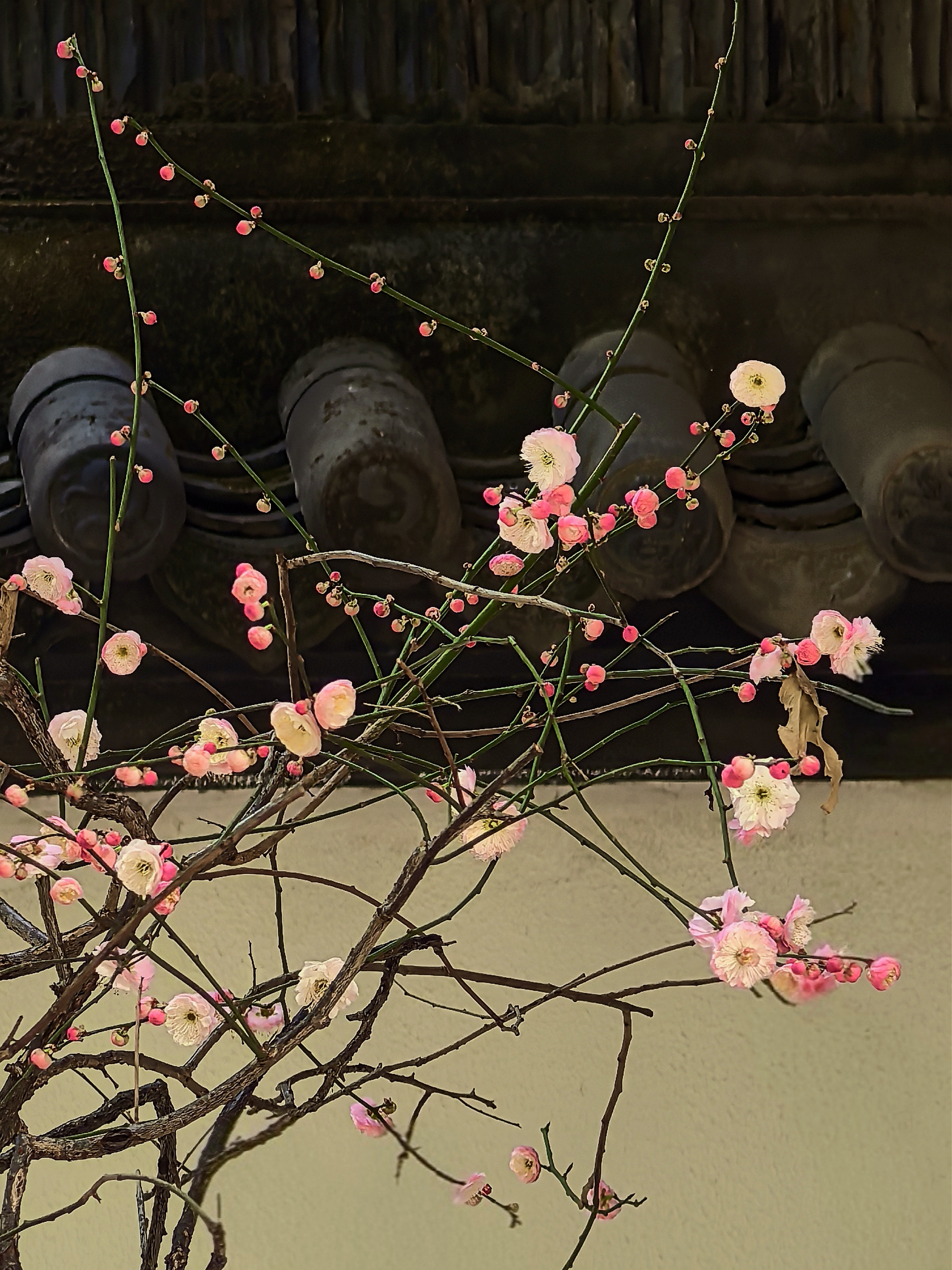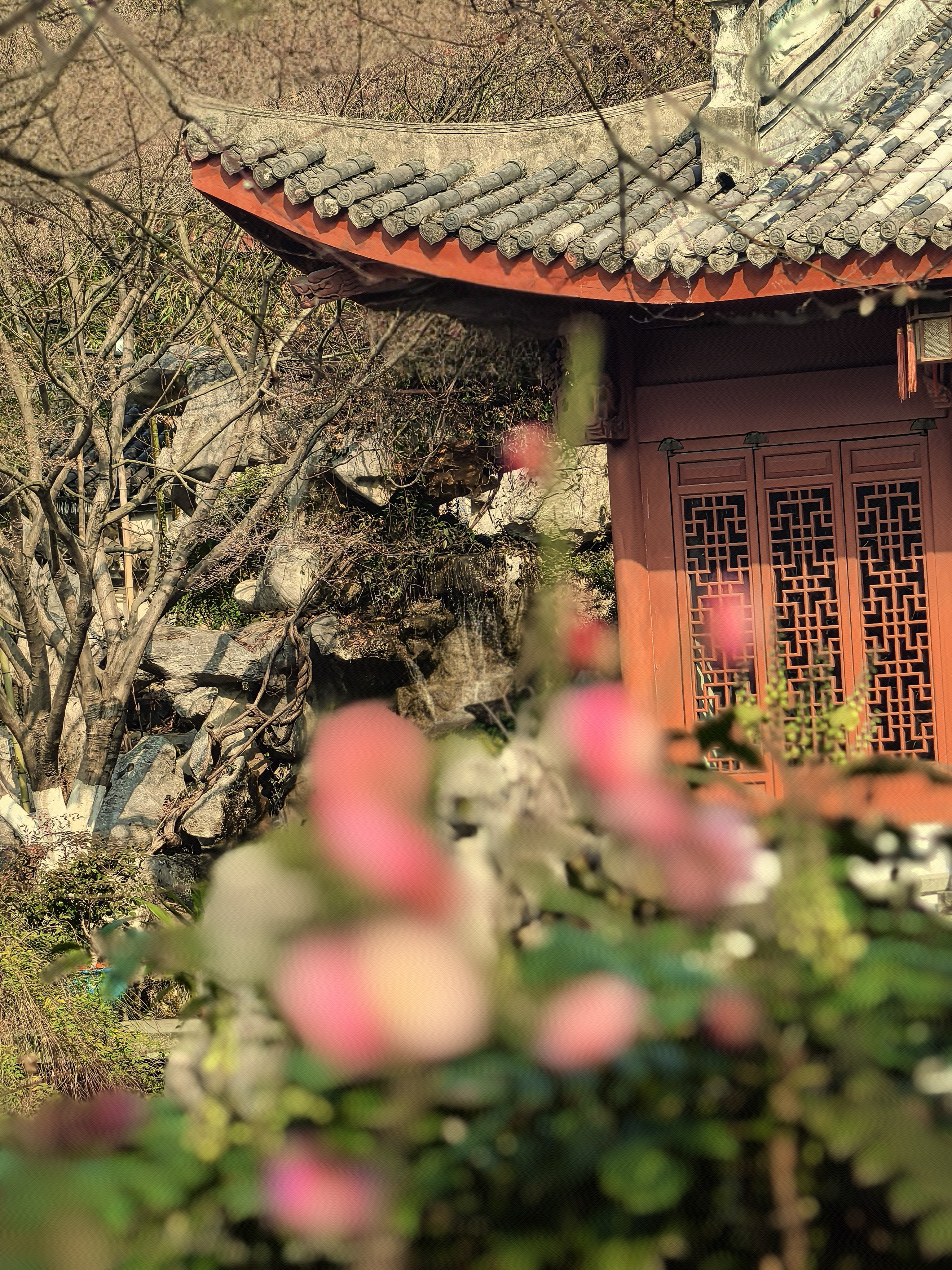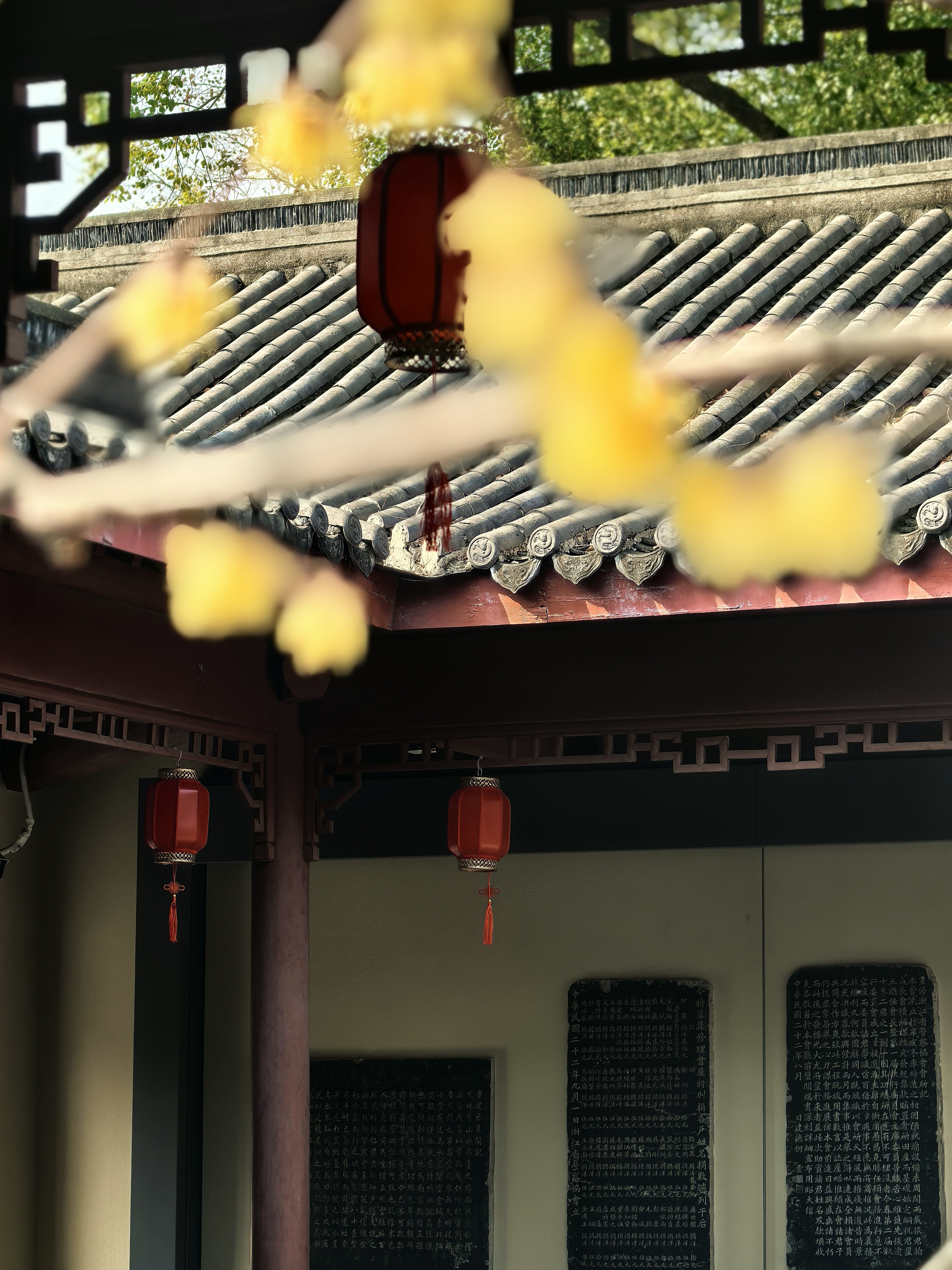 孔庙园子里梅花的确是不多,却处处有寻梅赏梅的意趣。粉墙边斜出几枝红梅,正映着各个朝代斑驳的石纹;白梅三两株,清清淡淡地点在墨池的一角,檐角的兽吻衬着,便成了画。 最不起眼的蜡梅,藏在碑廊深处的窗洞边,幽香一阵阵的,走近了,才见那蜜蜡似的玲珑,那香气是从古碑的缝隙里漫出来的。 孩子们在梅花小景前留影,笑声让梅枝一颤一颤的。在这里,梅不是轰轰烈烈地开给你看,是要你停一停,在碑文间、在水影里、在翘檐指向的天空中,自己去遇见的。杭城赏梅之十七孔庙。