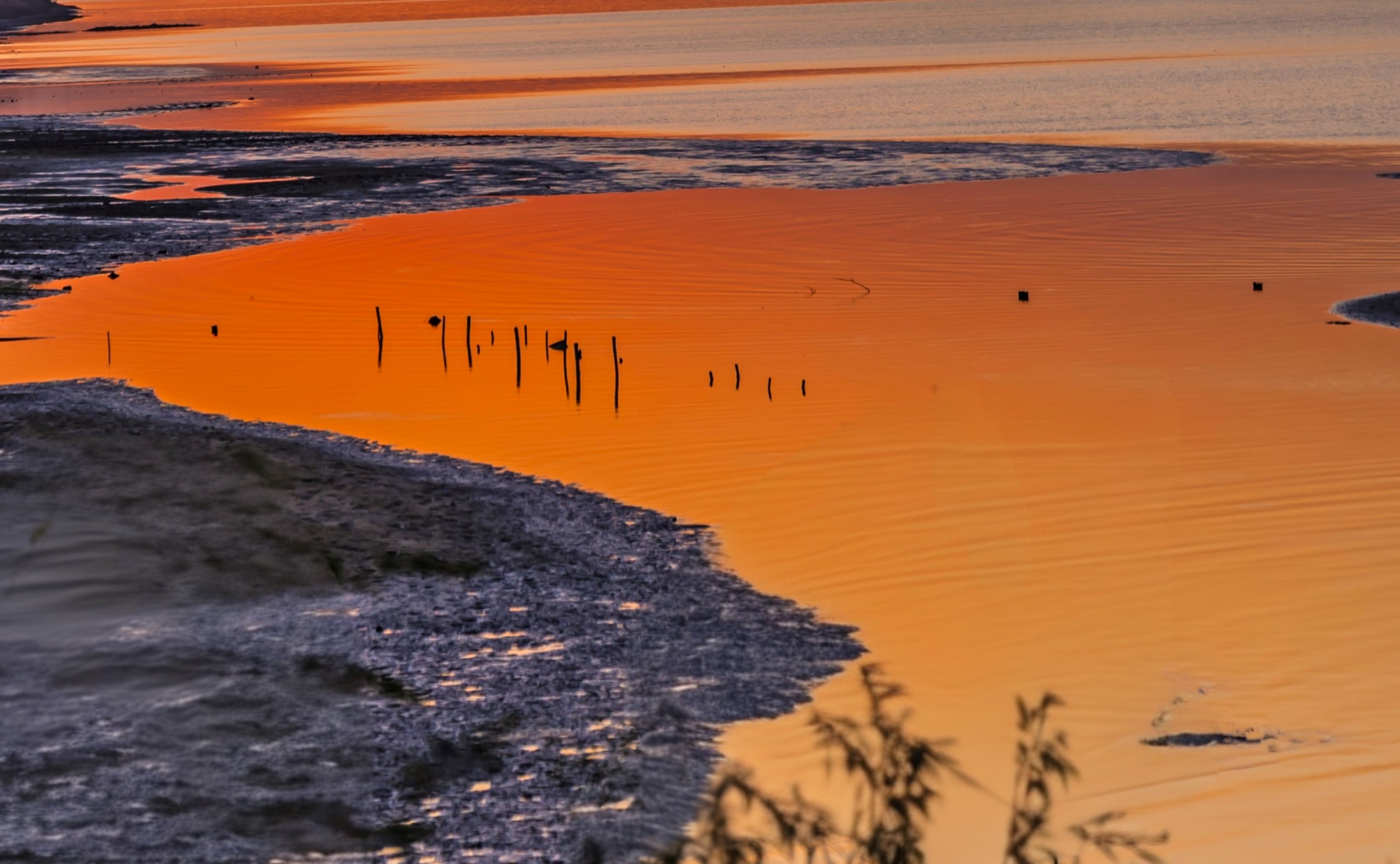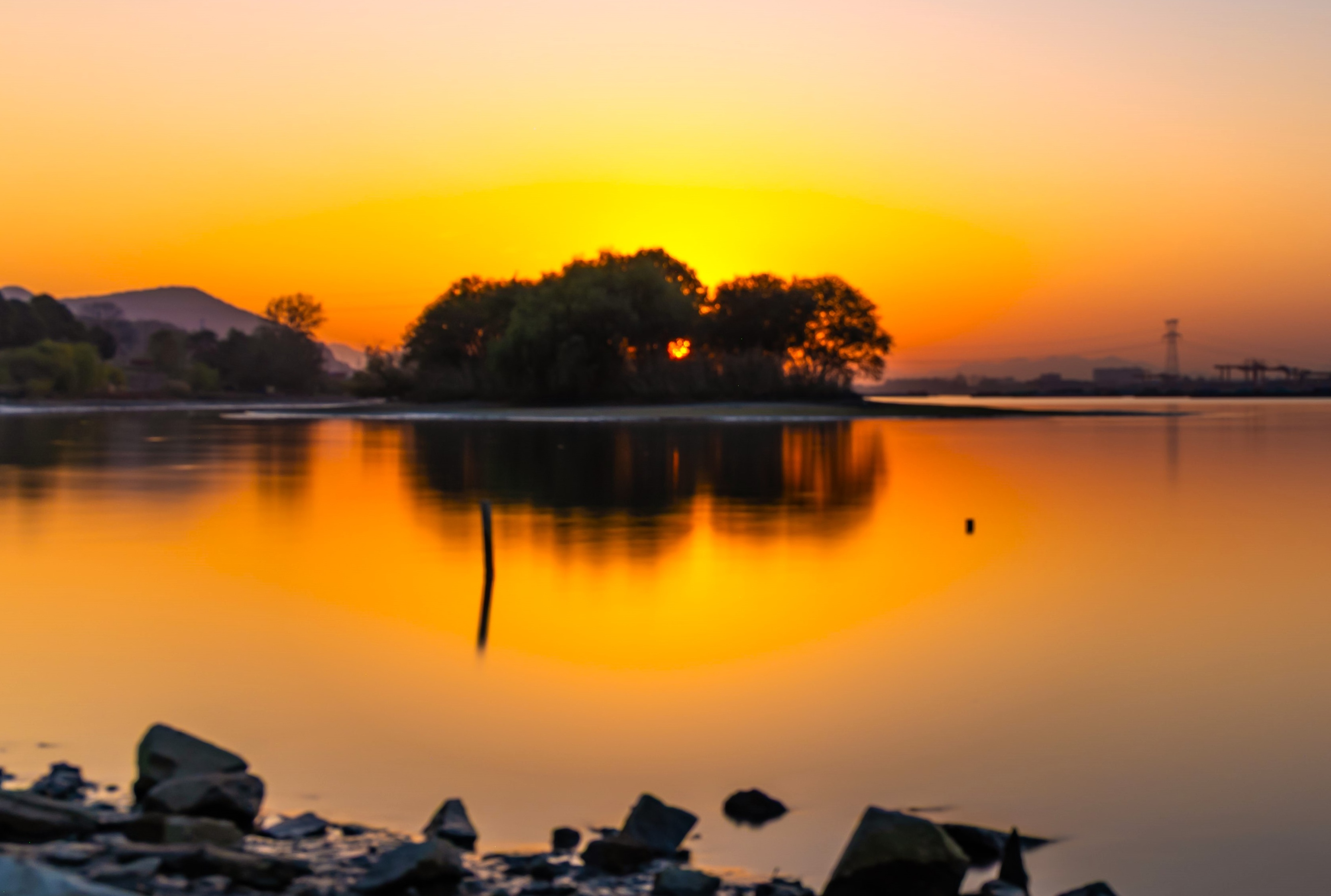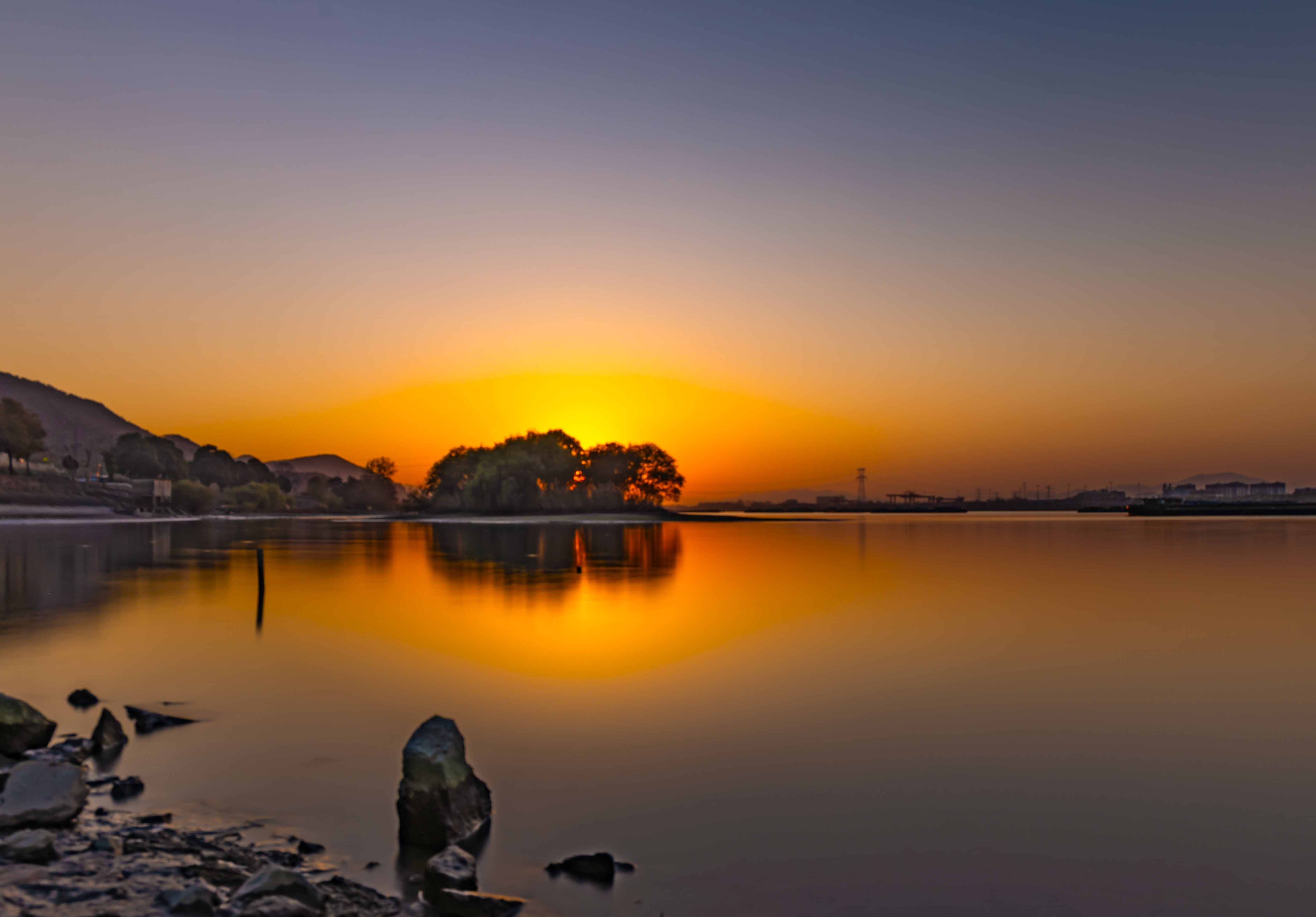 富春江边夕阳吻湖,橙空树影摇,石块木桩静守;水波轻漾,山丘城市入画,这黄昏,刚刚好~