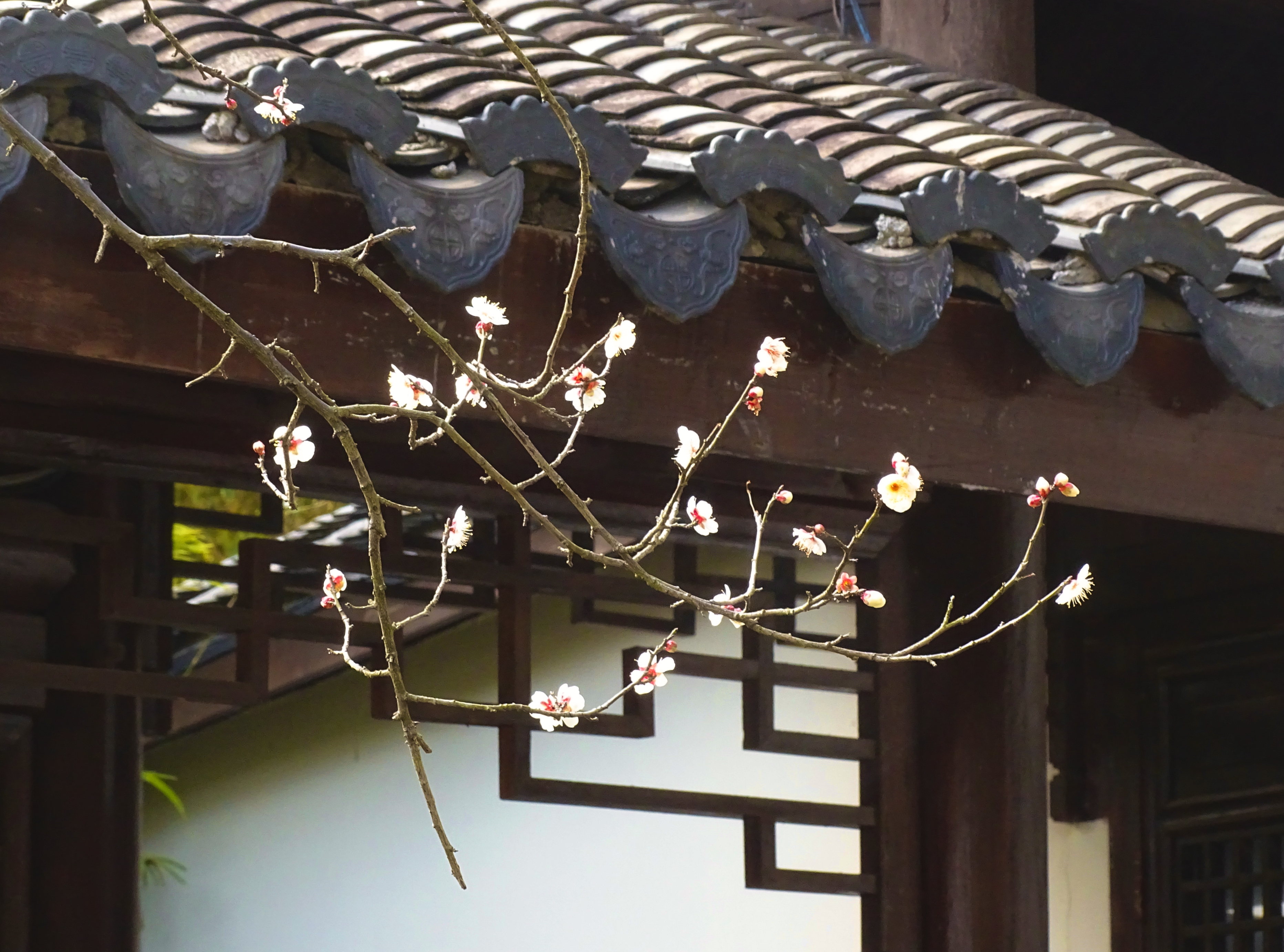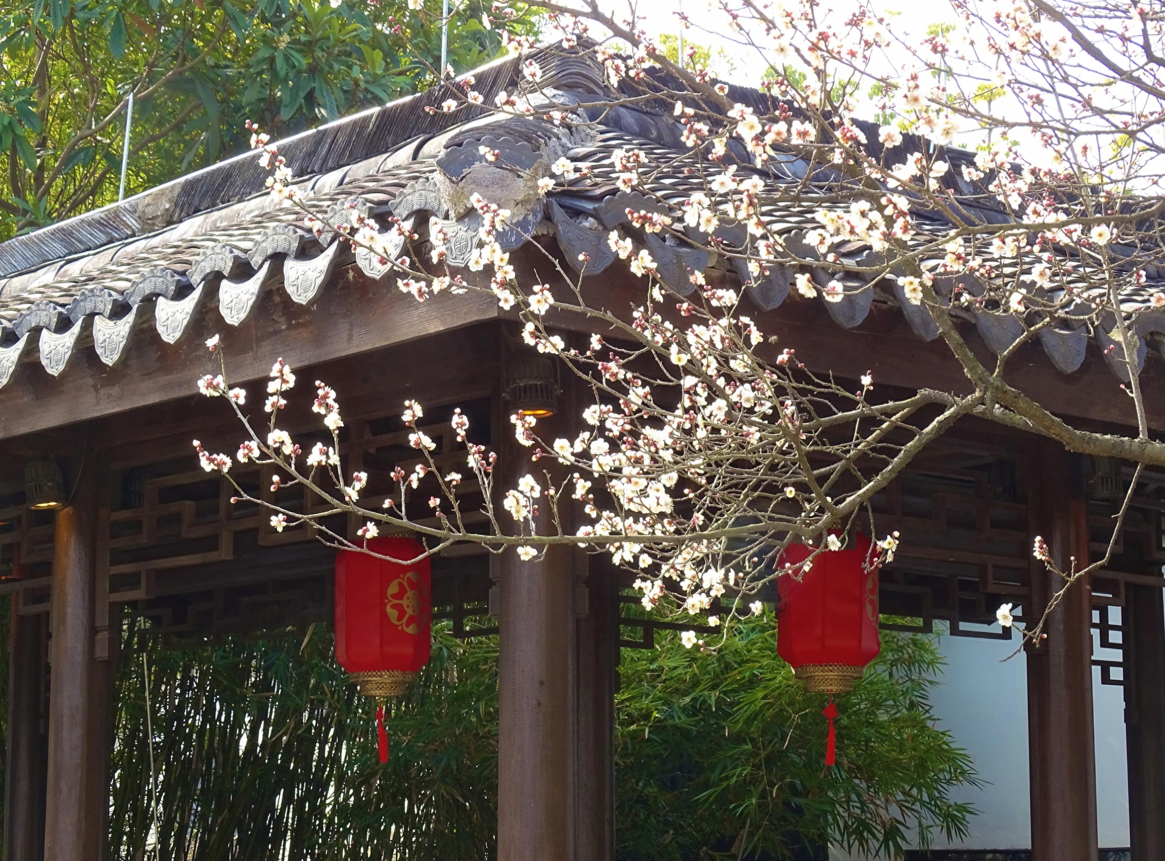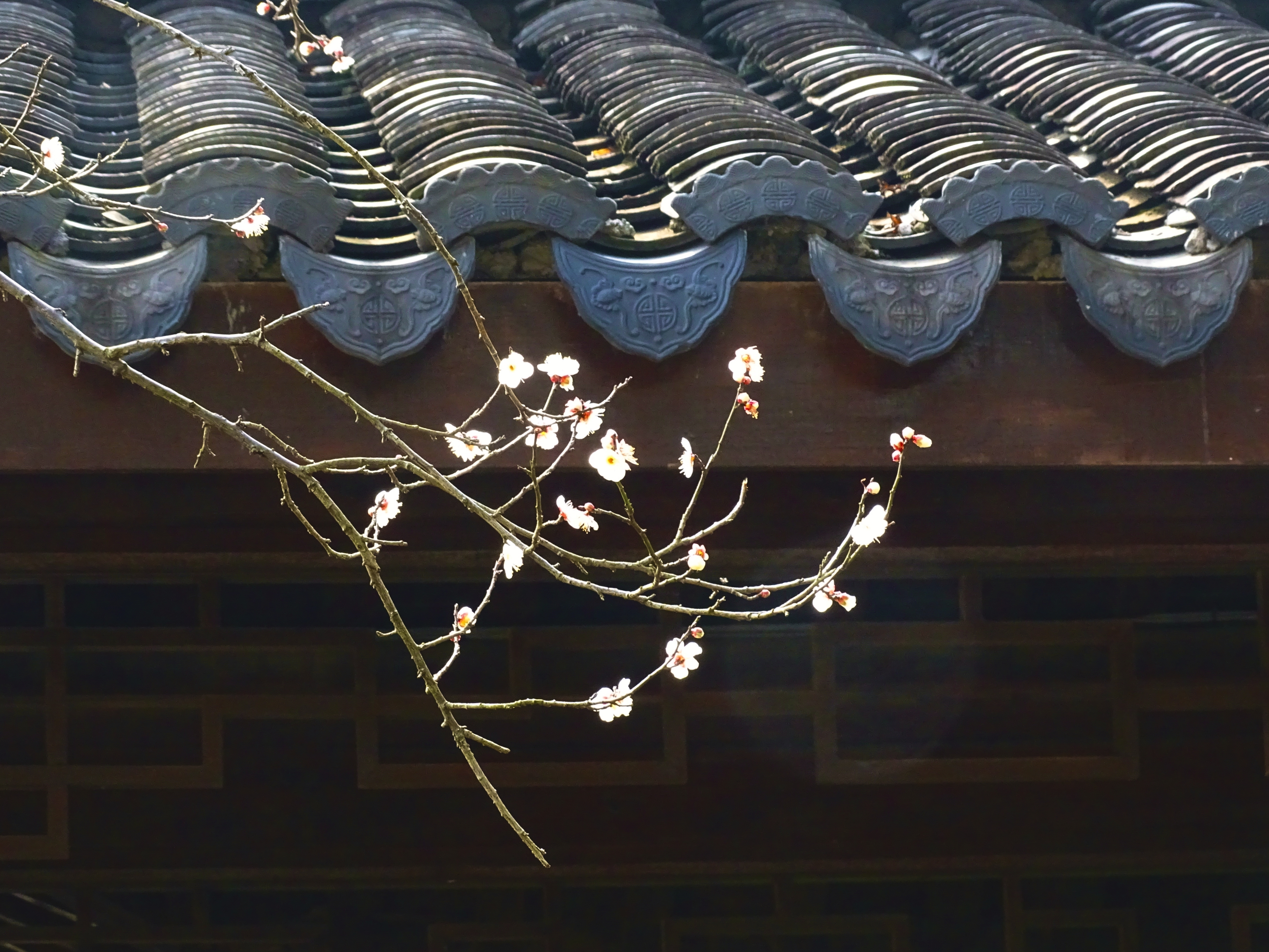 白梅枝桠探过黛瓦,暗香悄悄漫过来啦。红灯笼在梅树下轻轻晃,古意和春味都齐了。阳光穿过花瓣落在窗格上,超山的春天真让人心里暖暖的!