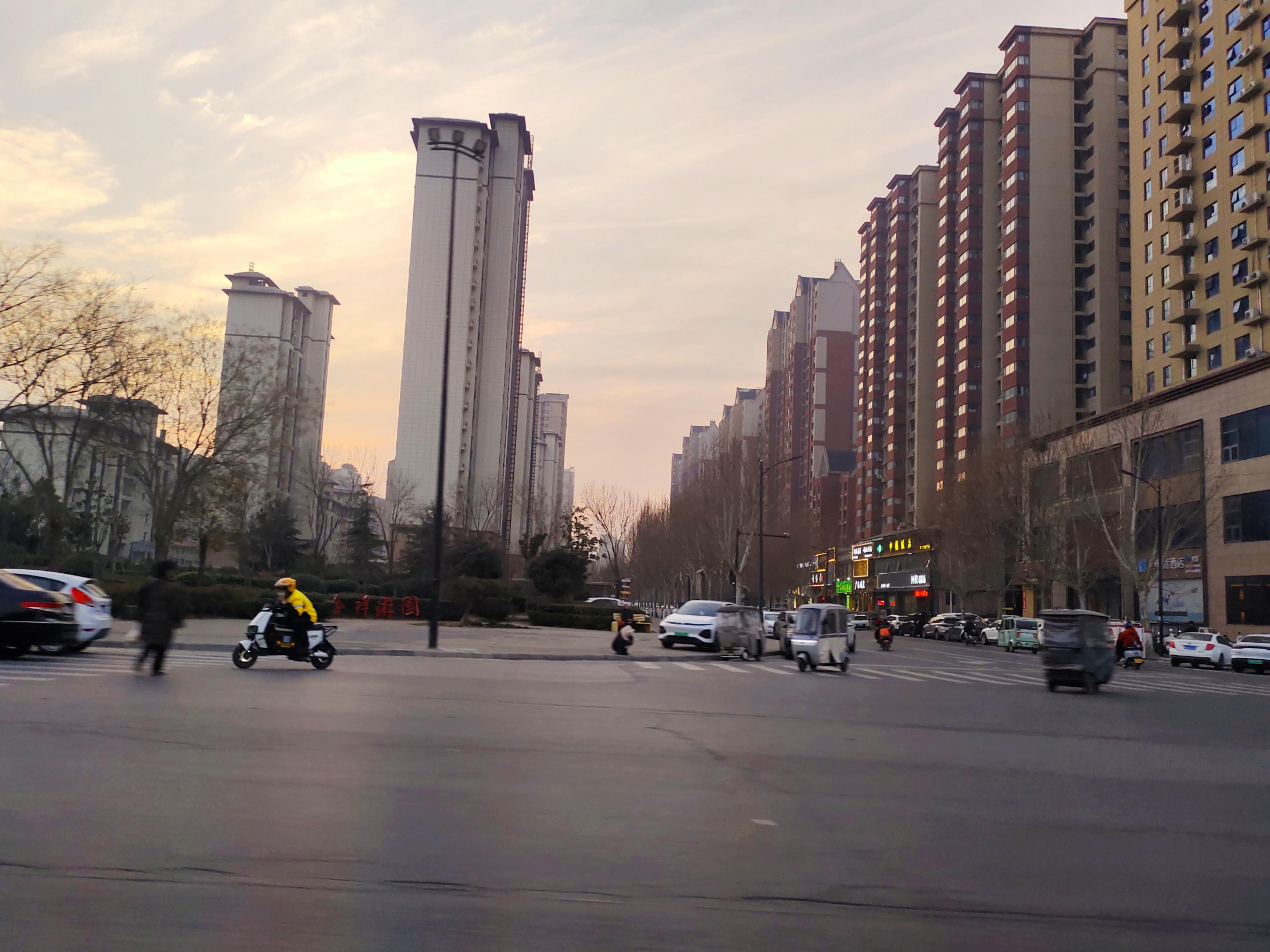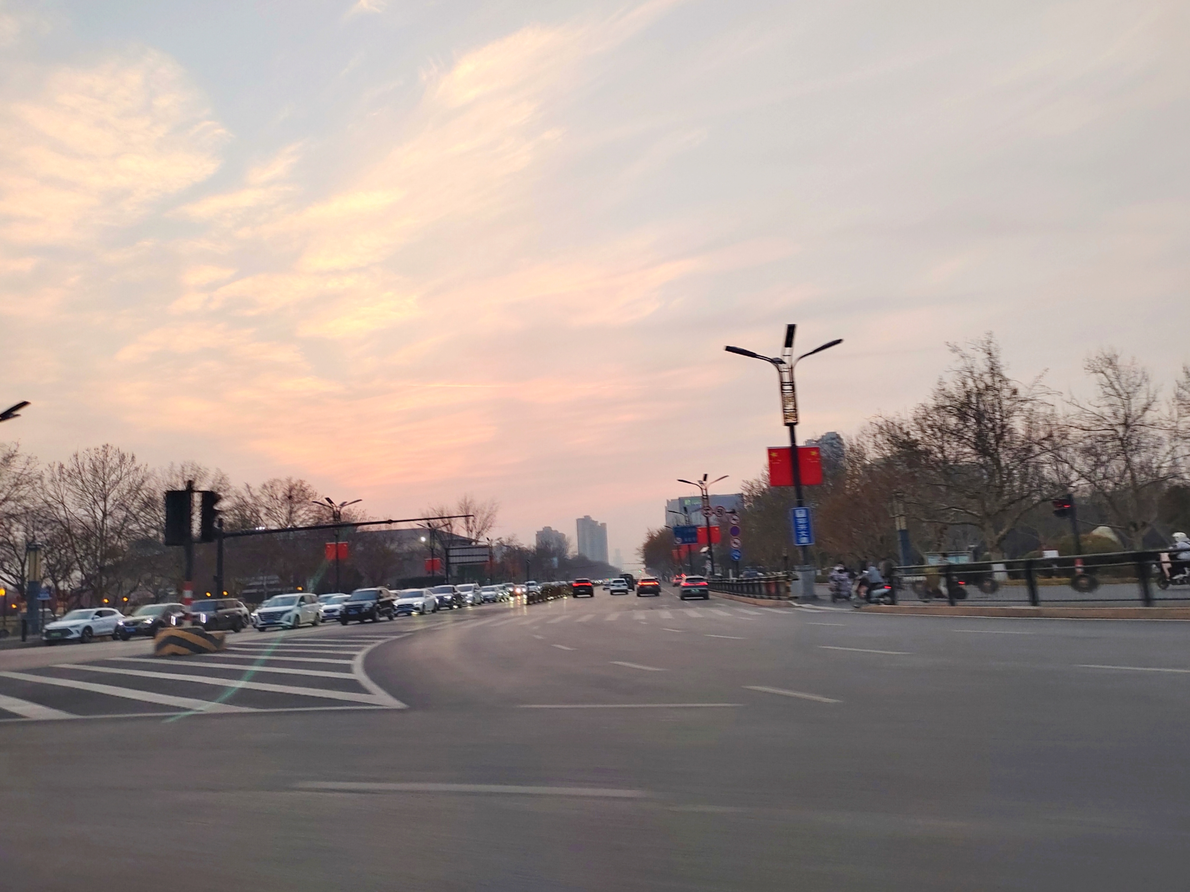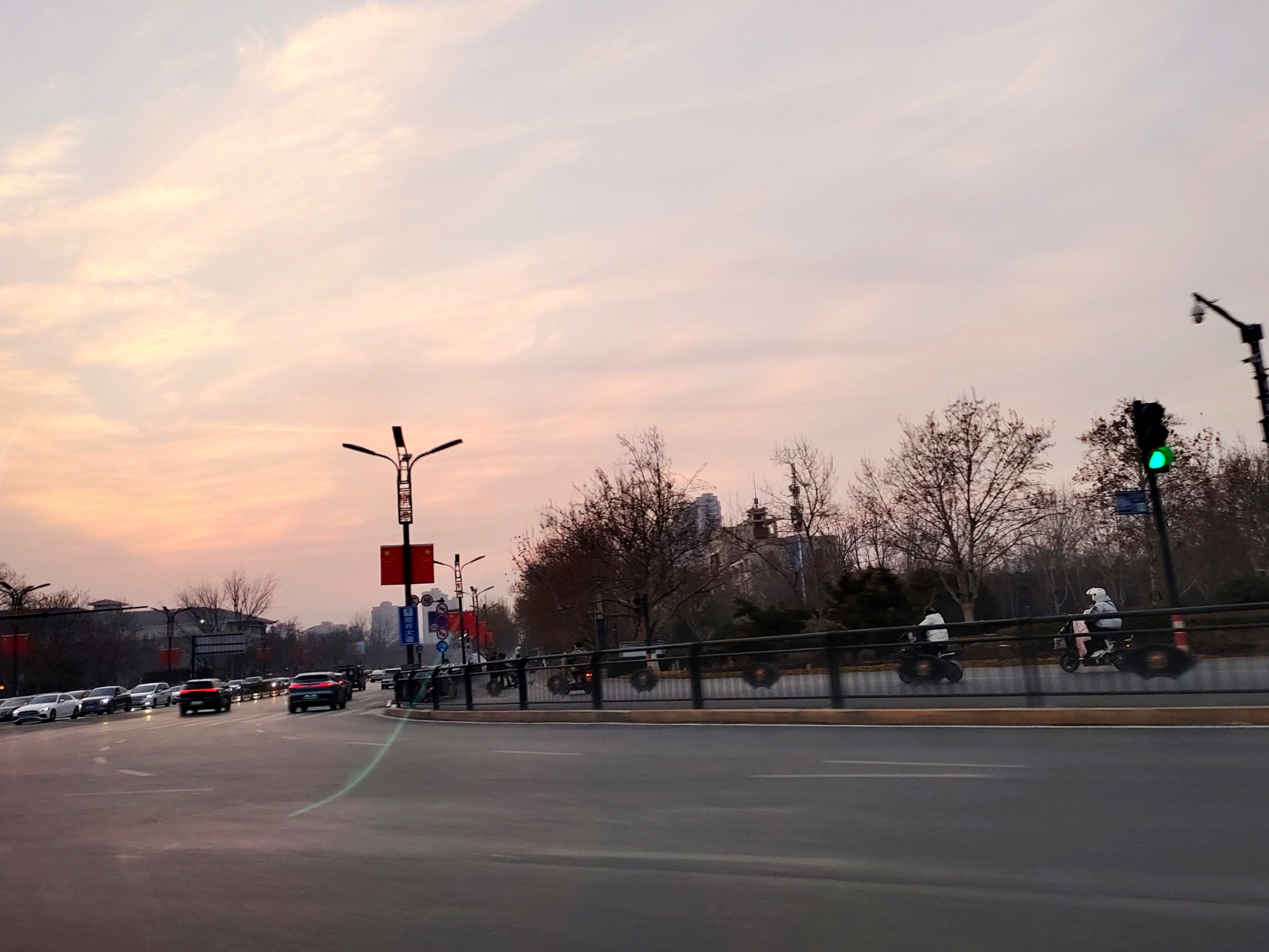 黄昏路口,车流如织,国旗在晚霞里轻轻飘,三轮车拐过斑马线——冬日的烟火气,刚刚好。