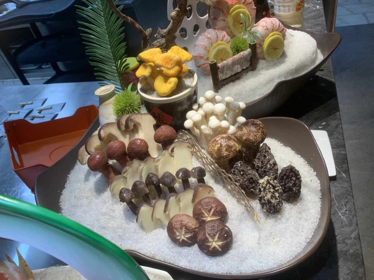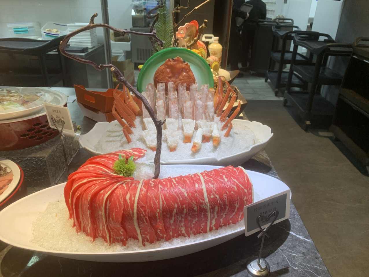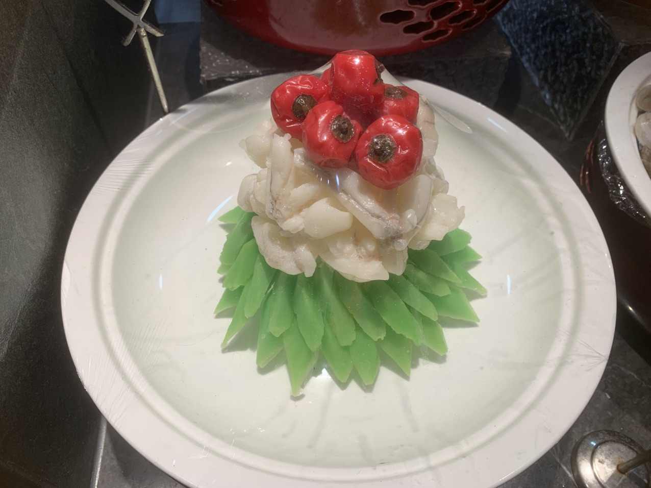 冰盘里的山河序章 碎冰铺就的雪原上,万物皆有了呼吸。 雪花牛肉卷成温润的红浪,大理石般的肌理凝着霜色,像极了冬日里初融的山雪,在冰上静候一场滚烫的相遇。蟹腿如珊瑚枝般挺立,橙红的壳甲在碎冰间泛着冷光,仿佛刚从深海的浪涛里挣脱,还带着咸湿的风。那只完整的蟹壳被托在青瓷盘上,像一枚深海的勋章,宣告着海的辽阔与丰饶。 东星斑的红是这方天地里最烈的一笔。鱼身舒展成破浪的姿态,鱼片卷成花,缀着柠檬的明黄与法香的翠绿,在冰上晕开层层涟漪。虾肉凝着粉白的肌理,似被月光吻过的贝,每一片都裹着海风的鲜醇。菌菇们则在另一处静立成林:金黄的鸡油菌在陶盏里舒展,红菇的伞盖凝着深褐的光,香菇上刻出的星纹,是大地写给餐桌的密语。 还有那盘精巧的食雕,蚕豆的巧妙堆叠成塔,红果缀顶,绿瓣为基,像极了春日里初绽的花苞,藏着时光的温柔。另一盘白瓷盛着的佳肴,嫩白的肉团簇拥着红果,青笋铺底,似雪地里燃起的火,冷与暖在盘中交织。 这哪里是寻常的宴席,分明是食者写给自然的情诗。山的厚重与海的辽阔,在冰盘上相遇;菌菇的清甜与海鲜的鲜醇,在舌尖上共舞。刀工是诗行,摆盘是韵脚,每一片食材都带着自然的呼吸,每一缕香气都藏着时光的馈赠。 当筷子轻触冰面,碎冰簌簌落下,似雪落山林,又似潮退沙滩。入口的瞬间,山风与海浪在舌尖相拥,清冽与醇厚交织,鲜与甜缠绵。这一口,是山的馈赠,是海的深情,是人间至味,亦是岁月温柔。 冰盘里的山河,从来不止是食材的陈列,更是中国人对自然的敬畏,对滋味的执着。在这方寸之间,我们与山对话,与海相拥,把四季的流转,都酿成了舌尖上的诗。