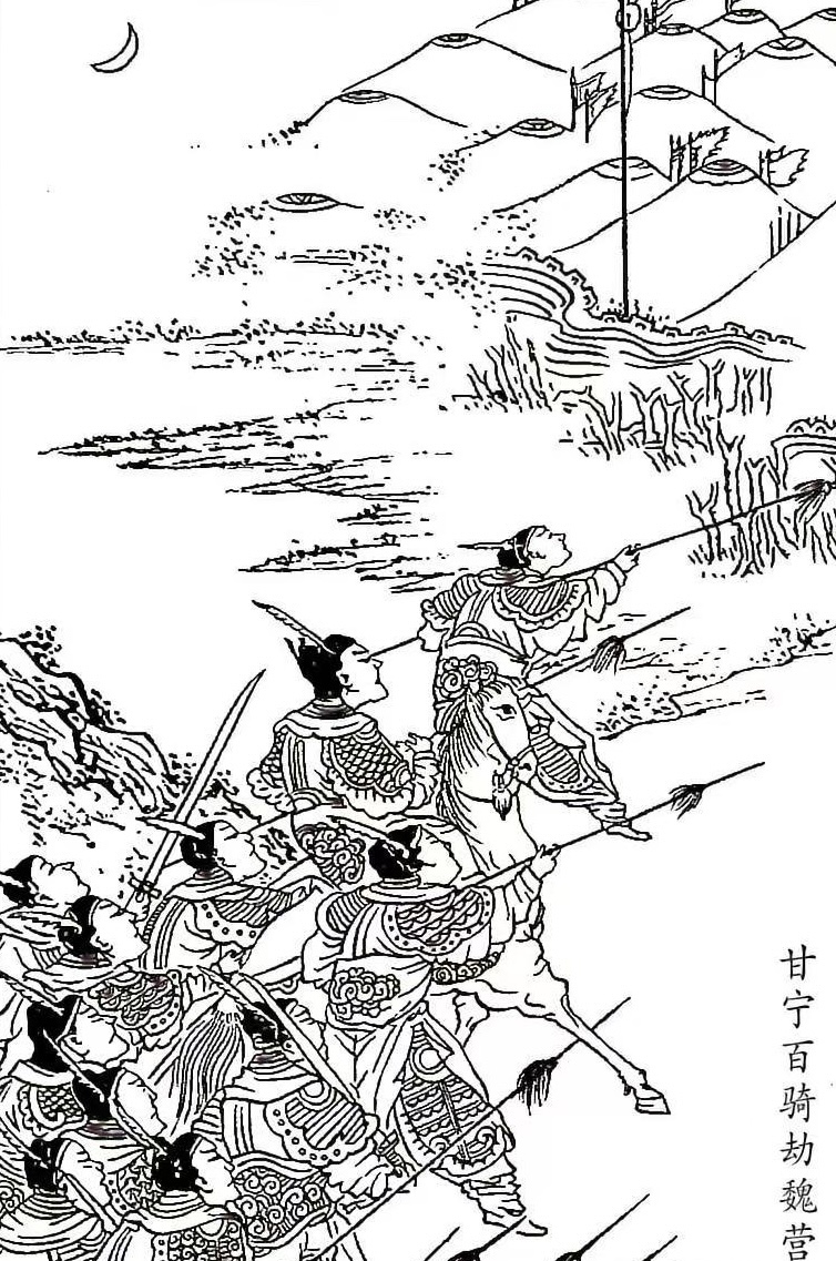 甘宁百骑劫魏营。甘宁带一百人马,披甲上马,盔插白鹅翎,突袭曹营,不折一人一骑,足使操惊骇。孙权把甘宁比作曹操手下的张辽,说:孟德有张辽,孤有甘兴霸,足以相敌也。可见甘宁勇敢善战。 左慈掷杯戏曹操。左慈真乃得道神仙,逍遥自在懂美食,嬉笑怒骂惩奸雄,导致曹操惊而成疾。