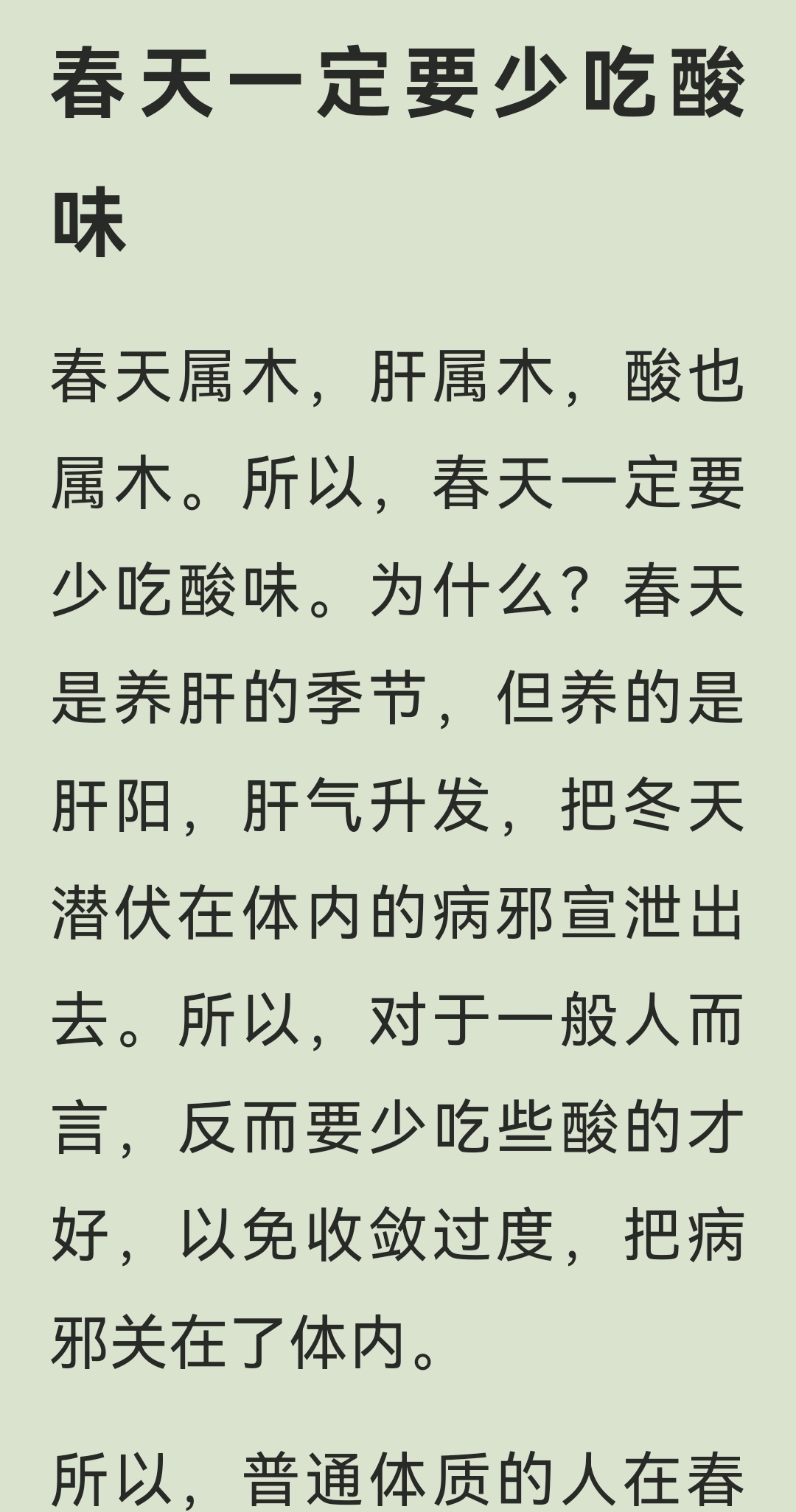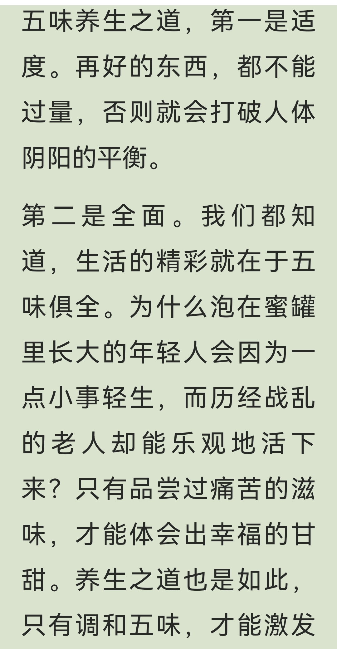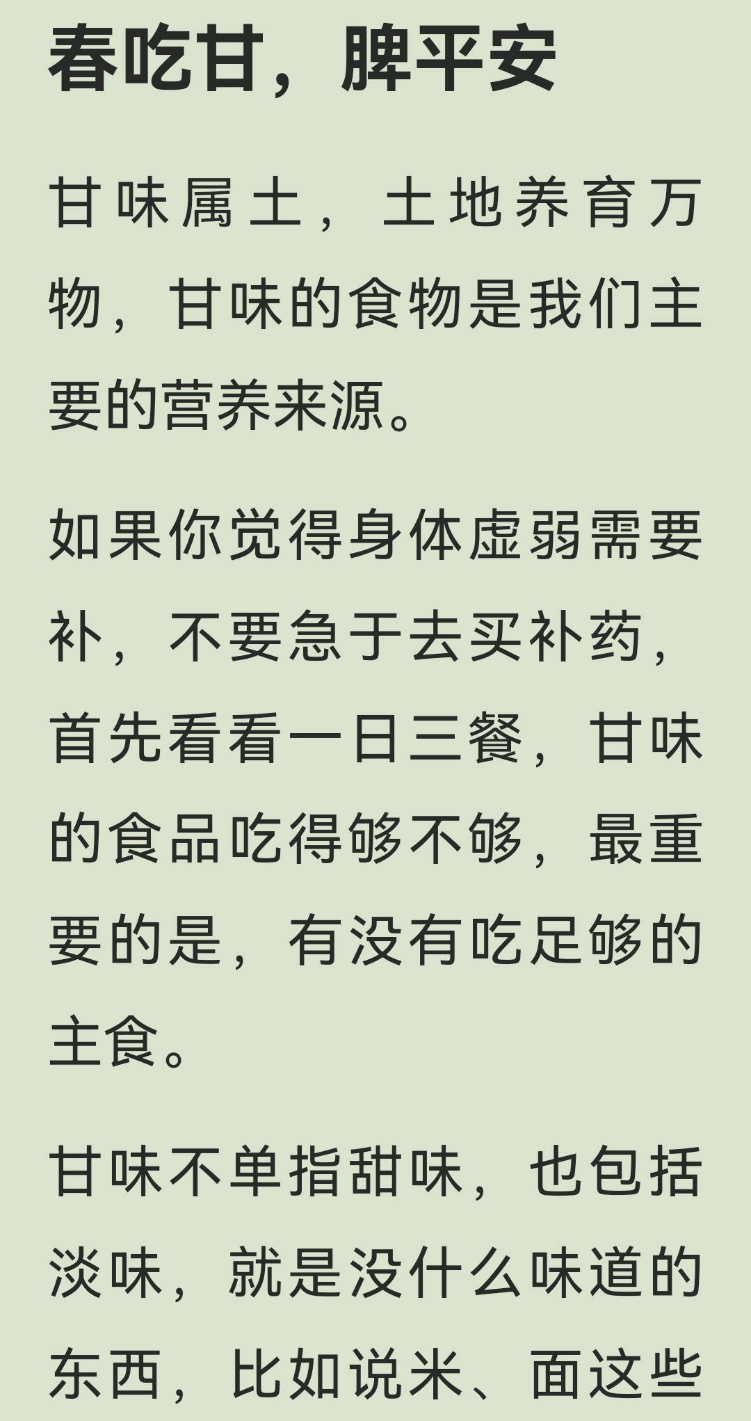《回家吃饭的智慧》第二章第三节(四季五味养生术)核心内容及读后感: 这一节围绕顺时养生、五味调和的核心,结合春节(冬末春初)的时节特点,给出了具体的饮食与养生指导: 1. 顺时调五味 - 书中提出“一个季节什么脏腑最旺,就要少吃跟它同样属性的东西”。春季属木,对应肝脏,酸味也属木,因此春季要少吃酸味,避免肝气过盛、收敛过度,把病邪关在体内。 - 甘味属土,对应脾脏,春季应多吃甘味食物(包括米、面等淡味主食和温和的甜味食物),以滋养脾胃,防止肝木过旺克脾土。 2. 春季养生要点 - 饮食原则:春节正值冬末春初,养生既要顺应阳气升发,又要兼顾脾胃养护。应遵循“少酸多甘”的原则,减少山楂、乌梅等酸味食物,增加小米、山药、红枣等甘味食材。 - 情绪调理:书中强调“春天,人的心情应该像草木一样舒展”。春节期间,应保持心情舒畅,不压抑情绪,让肝气顺畅升发,这是最自然的养肝之道。 - 养生智慧:五味养生之道,在于适度与全面。再好的食物也不能过量,否则会打破阴阳平衡;只有调和五味,全面摄入,才能激发身体的活力。 读后感 读《回家吃饭的智慧》这一节,我最大的感受是:养生从来不是复杂的玄学,而是顺应自然的生活智慧。 春节期间,我们常常被丰盛的年菜包围,容易陷入“多吃补药、大鱼大肉”的误区。但陈允斌老师却告诉我们,真正的健康不在昂贵的补品里,而在一粥一饭的日常选择中。“少酸多甘”的原则,不仅是对身体的温柔照顾,更是对自然节律的深刻理解。 这让我反思,过去春节里的种种不适,如胃胀、上火、情绪烦躁,其实都与饮食不当、违背时节有关。当我们放下对“大补”的执念,回归到好好吃饭、好好生活的本质,身体自然会回馈我们安稳与健康。 这一节让我明白,最好的养生,就是带着对自然的敬畏,把日子过细,把饮食吃对,在烟火气中守护好自己和家人的身心。