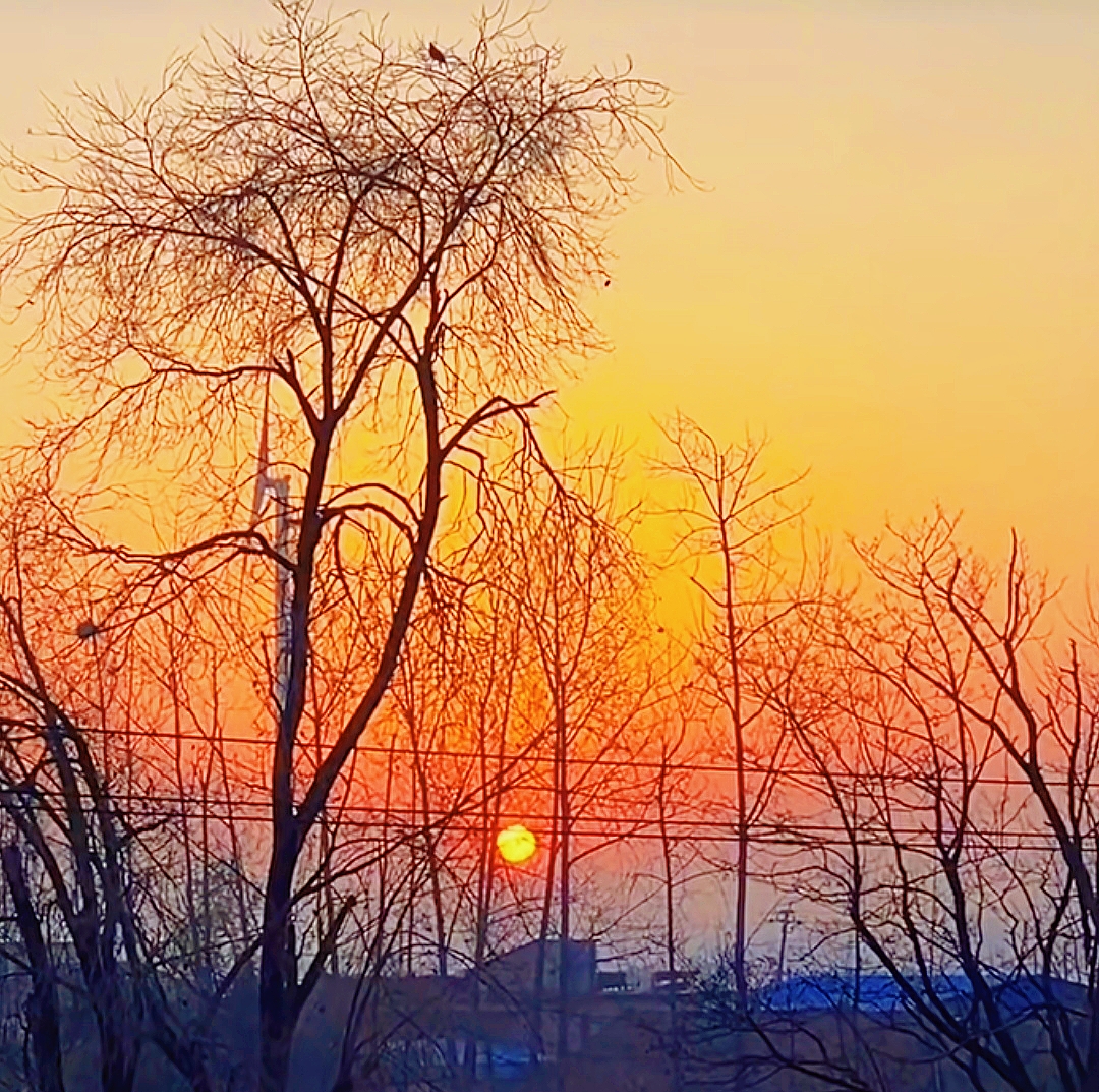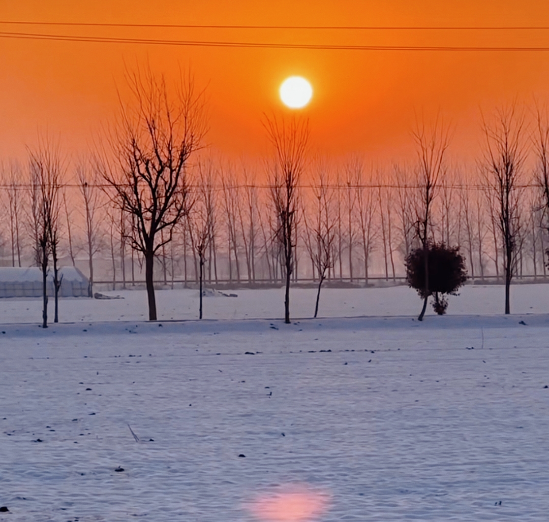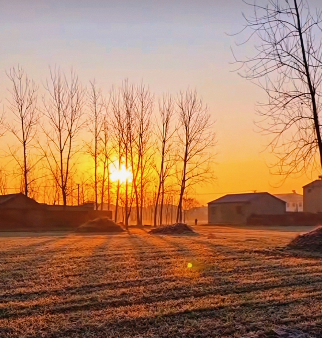 北国乡村·朝露辞 天刚破晓,北国的乡村还浸在霜色里。 一轮朝阳从枯林深处缓缓升起,把天际染成熔金的暖红。 光秃秃的枝桠在霞光里舒展,像大地伸出的千万只手,托住这团跳动的火。电线横斜,把天空织成细密的网,网住了归鸟的剪影,也网住了这片刻的温柔。 风是凉的,带着泥土与枯草的气息,却被这朝阳烘得暖了几分。远处的屋舍还沉在晨雾里,只露出模糊的轮廓,像一幅未干的水墨画。朝阳越升越高,把每一根枝桠都镀上金边,把每一寸土地都唤醒。 这不是江南的烟雨朦胧,是北国独有的清冽与热烈。枯木不言,却在晨光里写尽了苍茫;朝阳不语,却在霜天里燃尽了寒凉。在这样的清晨,连时光都慢了下来,让人只想站在这霞光里,听风过林梢,看日升东方,把一整个冬天的沉寂,都交付给这初露的朝阳。