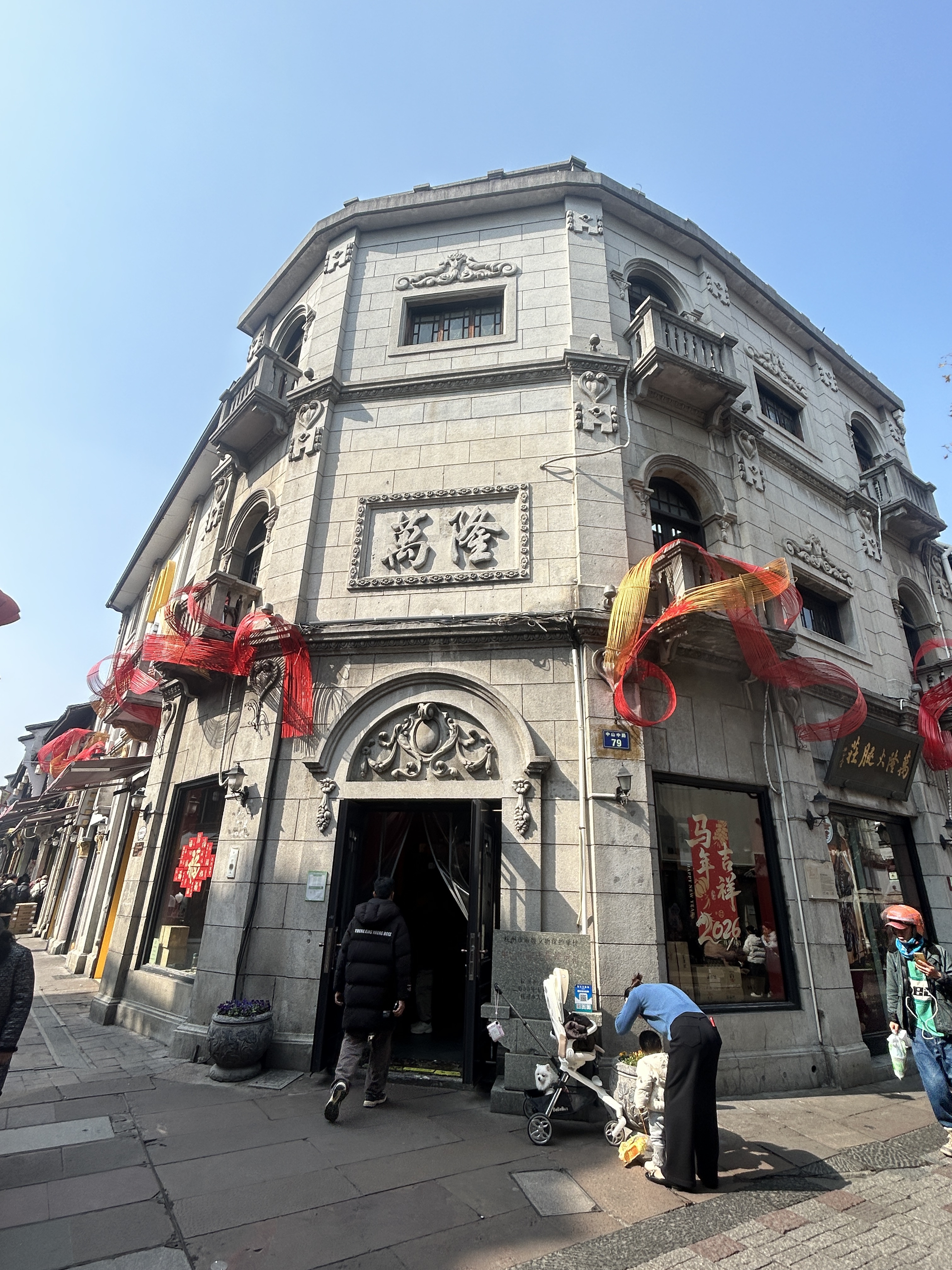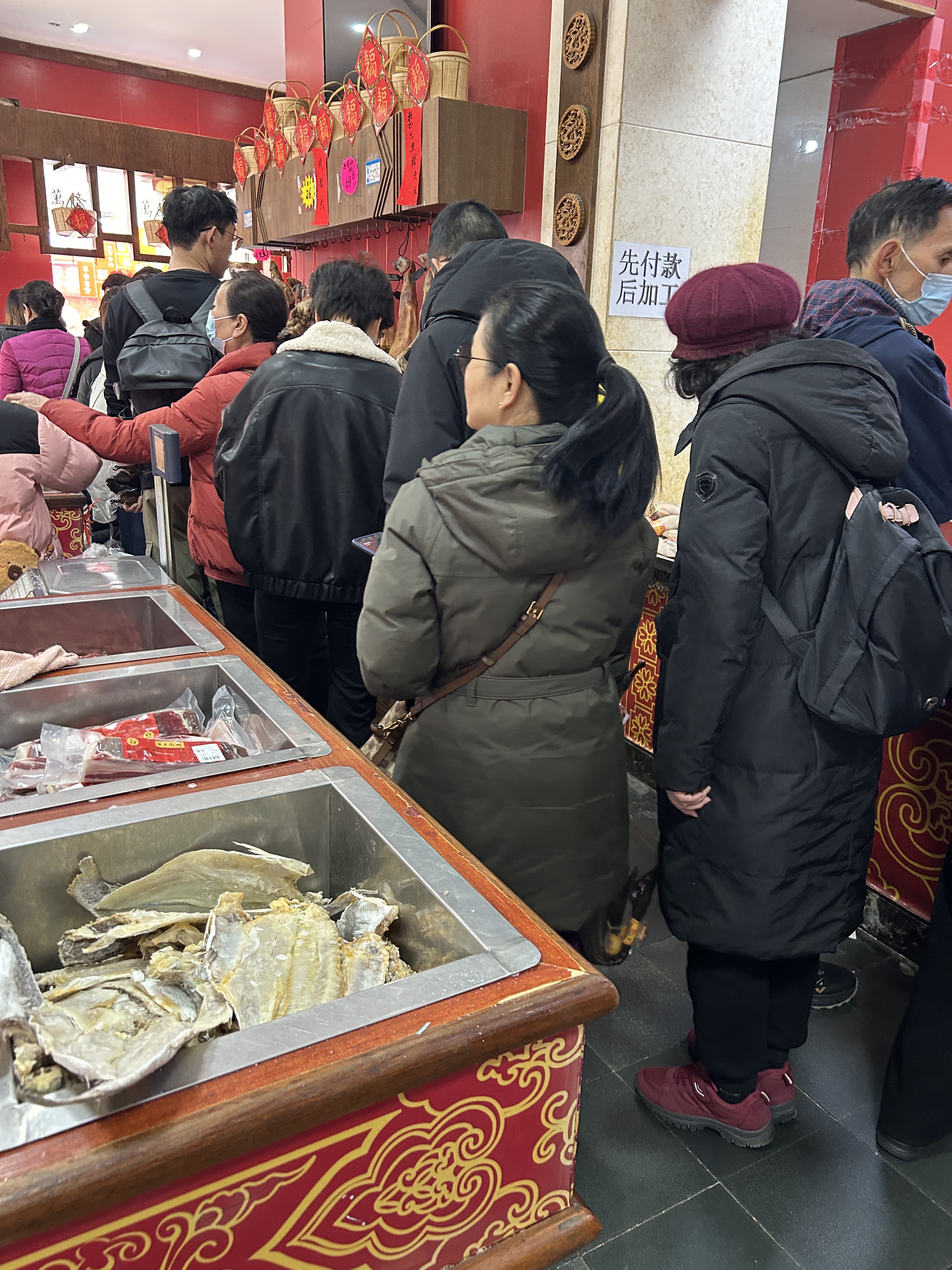 杭州河坊街中华老字号万隆火腿庄年前排队买腌货,酱货。