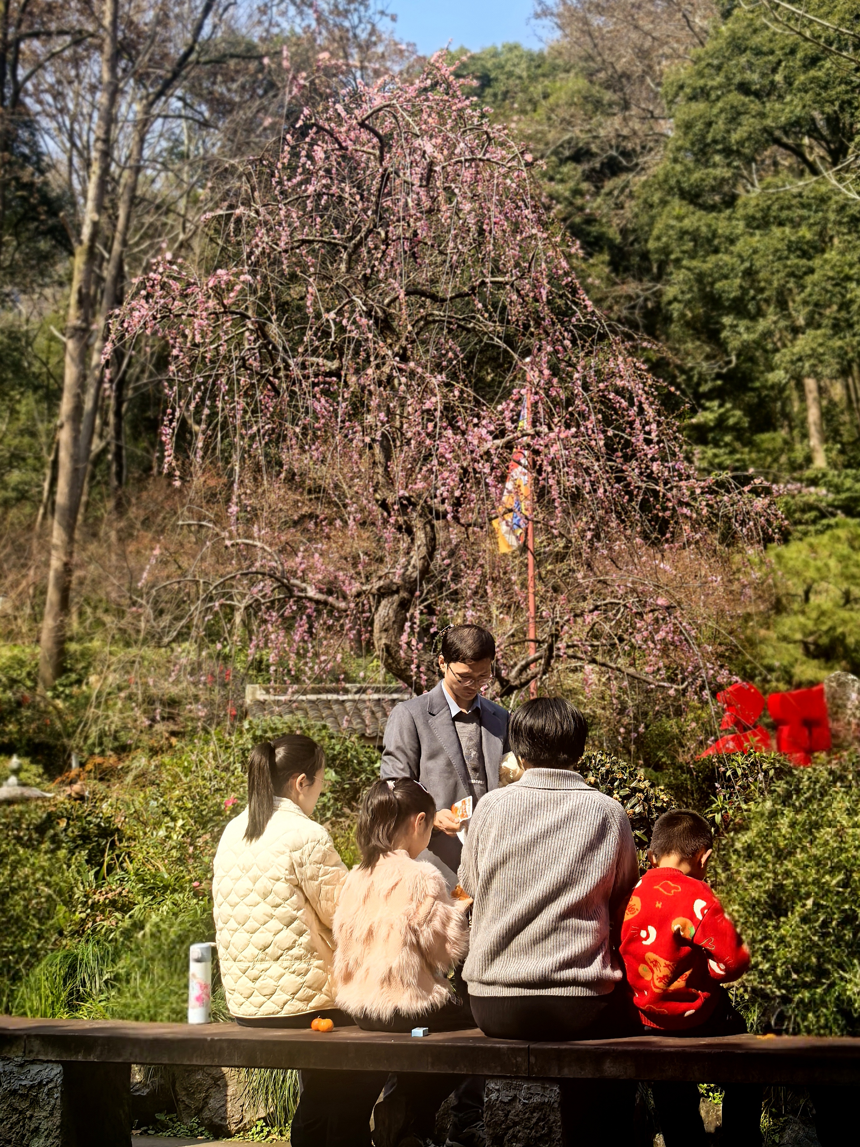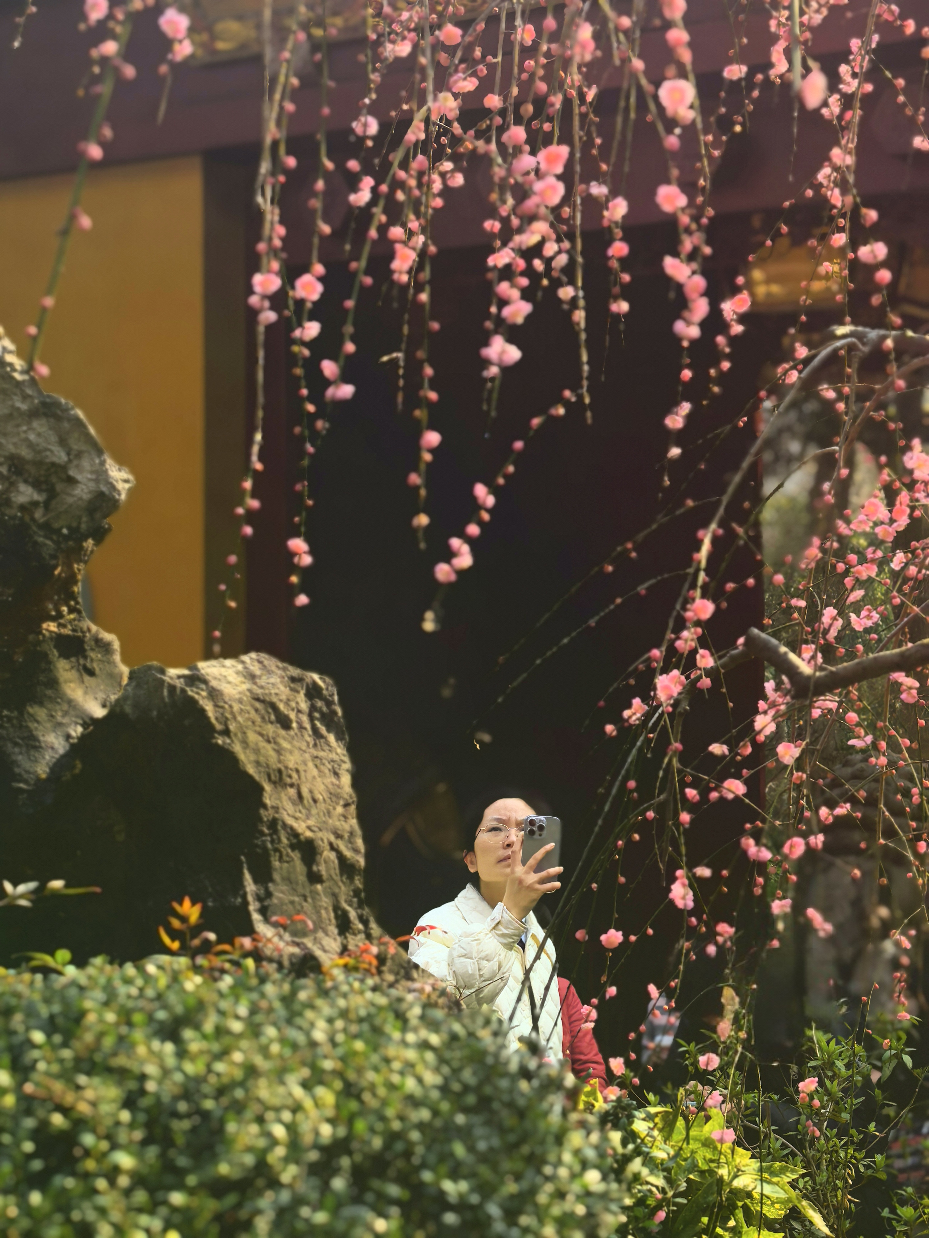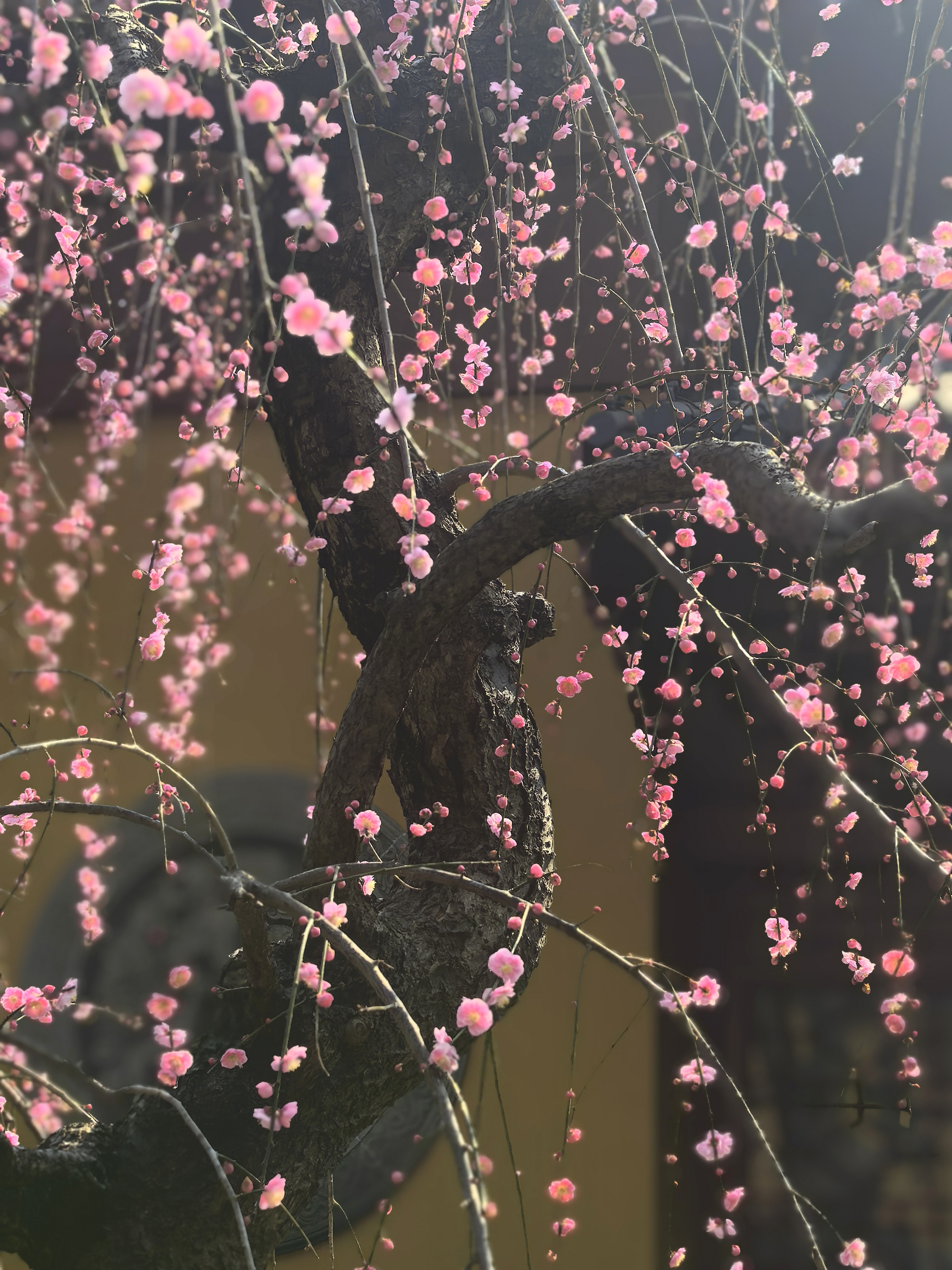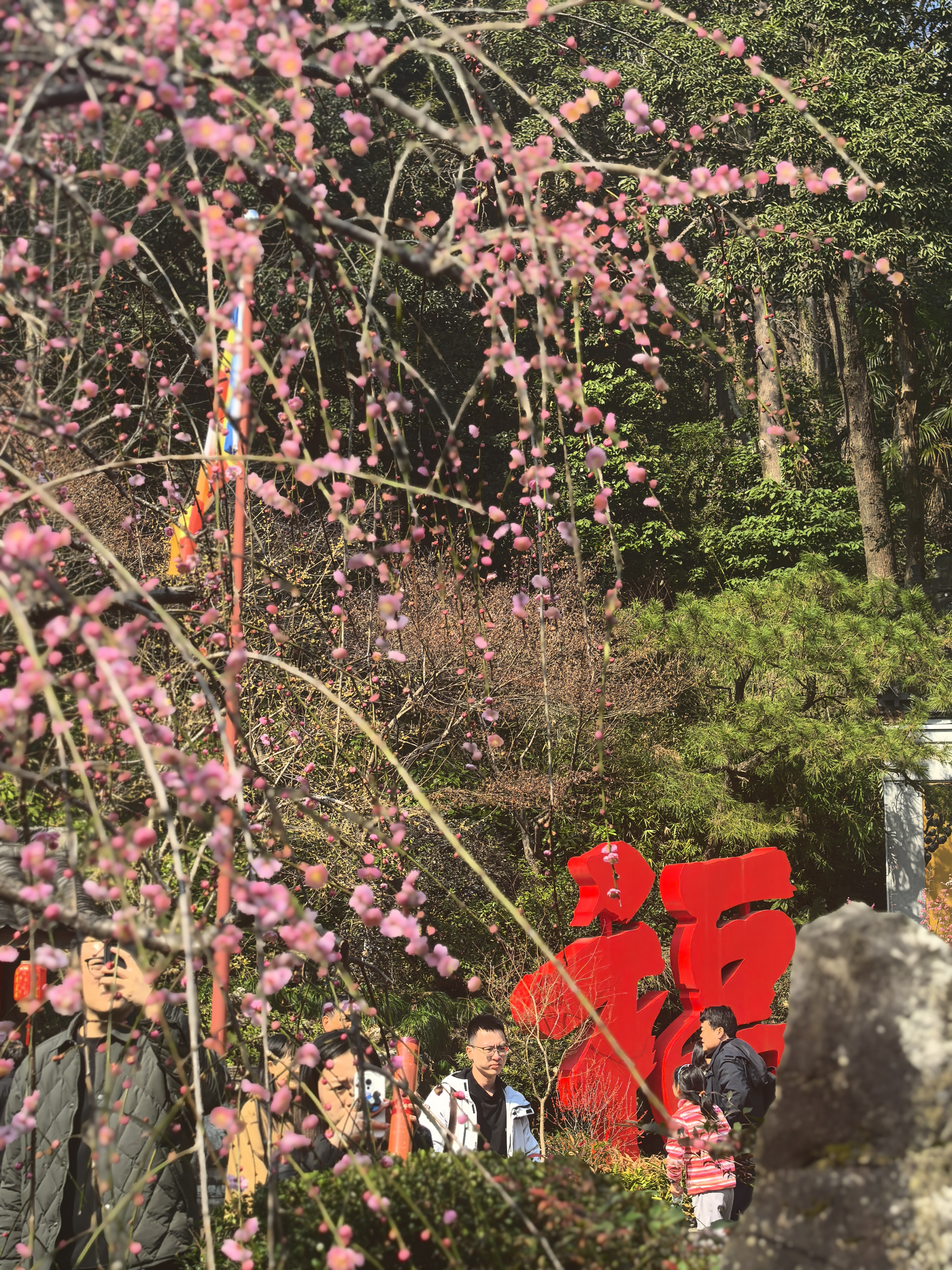 龙梅是个稀罕物。在杭城其他赏梅点很难得看到。我将走出寺门时,立马就被它吸引了。因为前几天还想去永嘉普华寺赏龙梅呢。 永福寺的这株龙梅,学名“垂枝梅”,是梅花家族中姿态最为飘逸的一脉。它的枝条不像寻常红梅那般倔强地朝天伸展,而是顺应着地心的引力,柔软地向下垂挂。主干苍劲如铁,枝梢却纤柔似柳,宛如一条蟠龙俯身饮水,因而得名“龙梅”。 与常见的直枝红梅相比,龙梅少了几分孤峭的棱角,多了一重温婉的风致。它的花多为重瓣,粉嫩如霞,密缀在丝绦般的枝条上。当早春料峭晨风拂过时,满树繁花摇曳,不是“疏影横斜”,而是“花枝低垂”,仿佛一挂粉色的流苏珠帘,在古刹的黄墙黛瓦间轻轻摆动,洒下满庭的温柔与禅意。 这株龙梅,永福寺赋予了它独特的灵性。始建于东晋的古寺,曾是南宋皇家的香火院,历代高僧在此驻锡,香火鼎盛。明人张岱在《西湖梦寻》中曾描绘过永福寺“梅影入窗,恍若维摩诘示疾时天女散花之境”的景象,龙梅是否见证过那场“散花”呢? 它静静地伫立在石笋峰下,历经千载,将佛家的慈悲与梅花的傲骨融为一体,守护着这片“钱塘第一福地”的安宁。(杭城赏梅之二十永福寺龙梅)