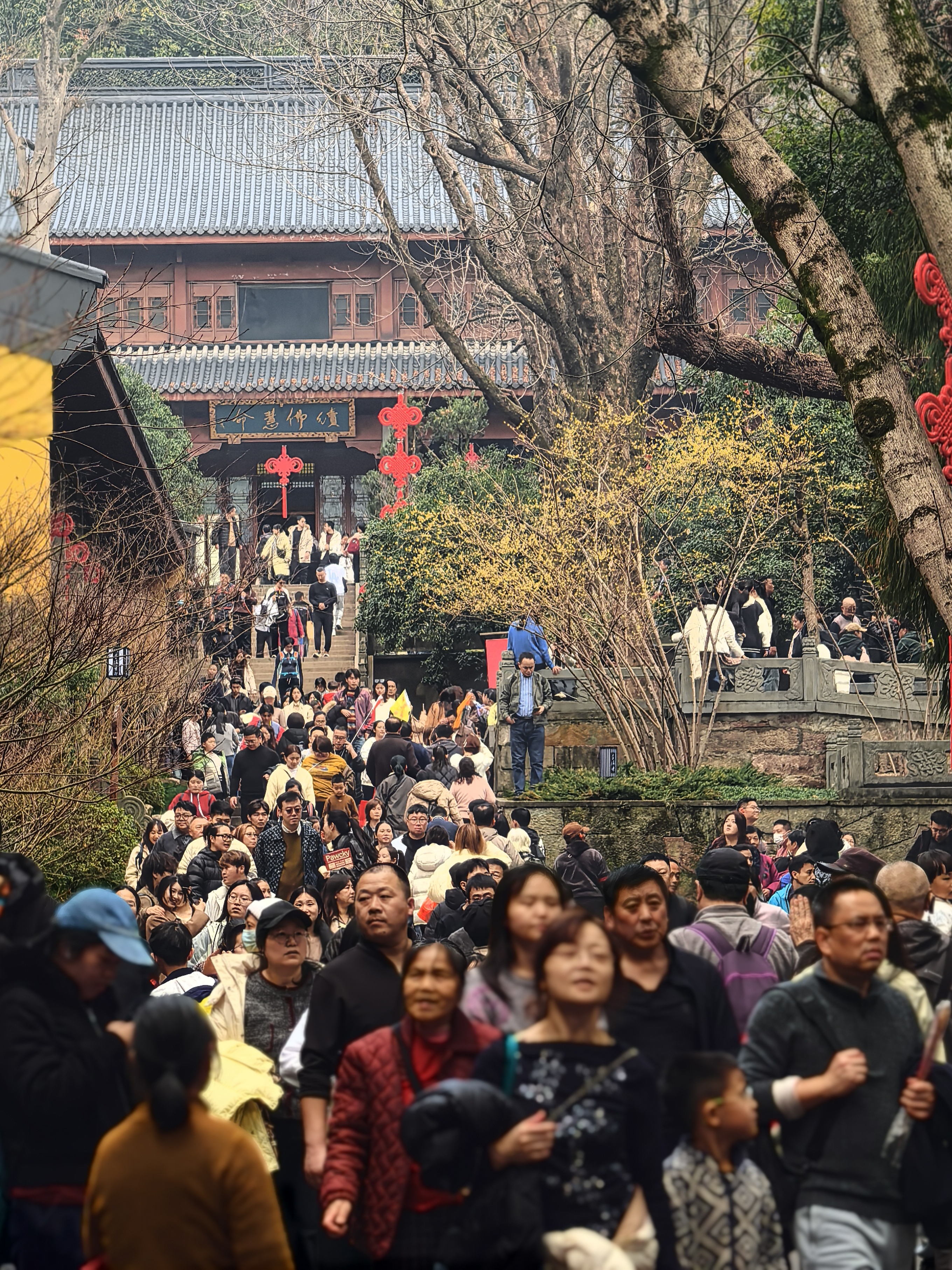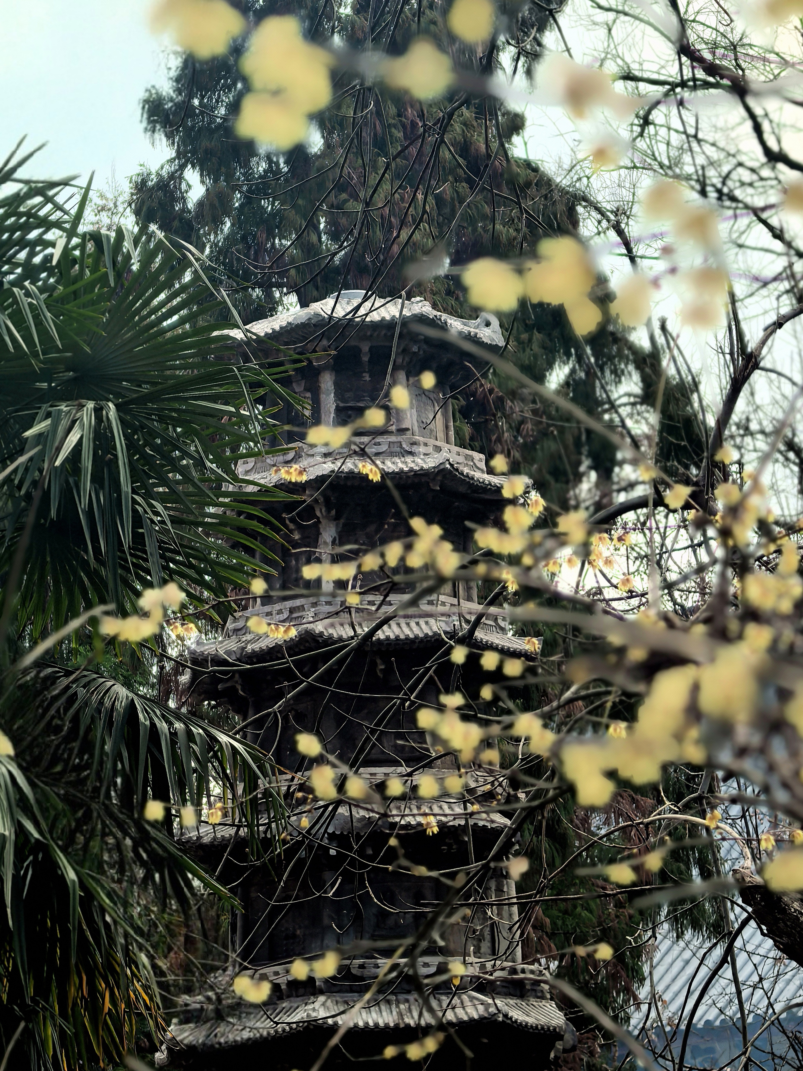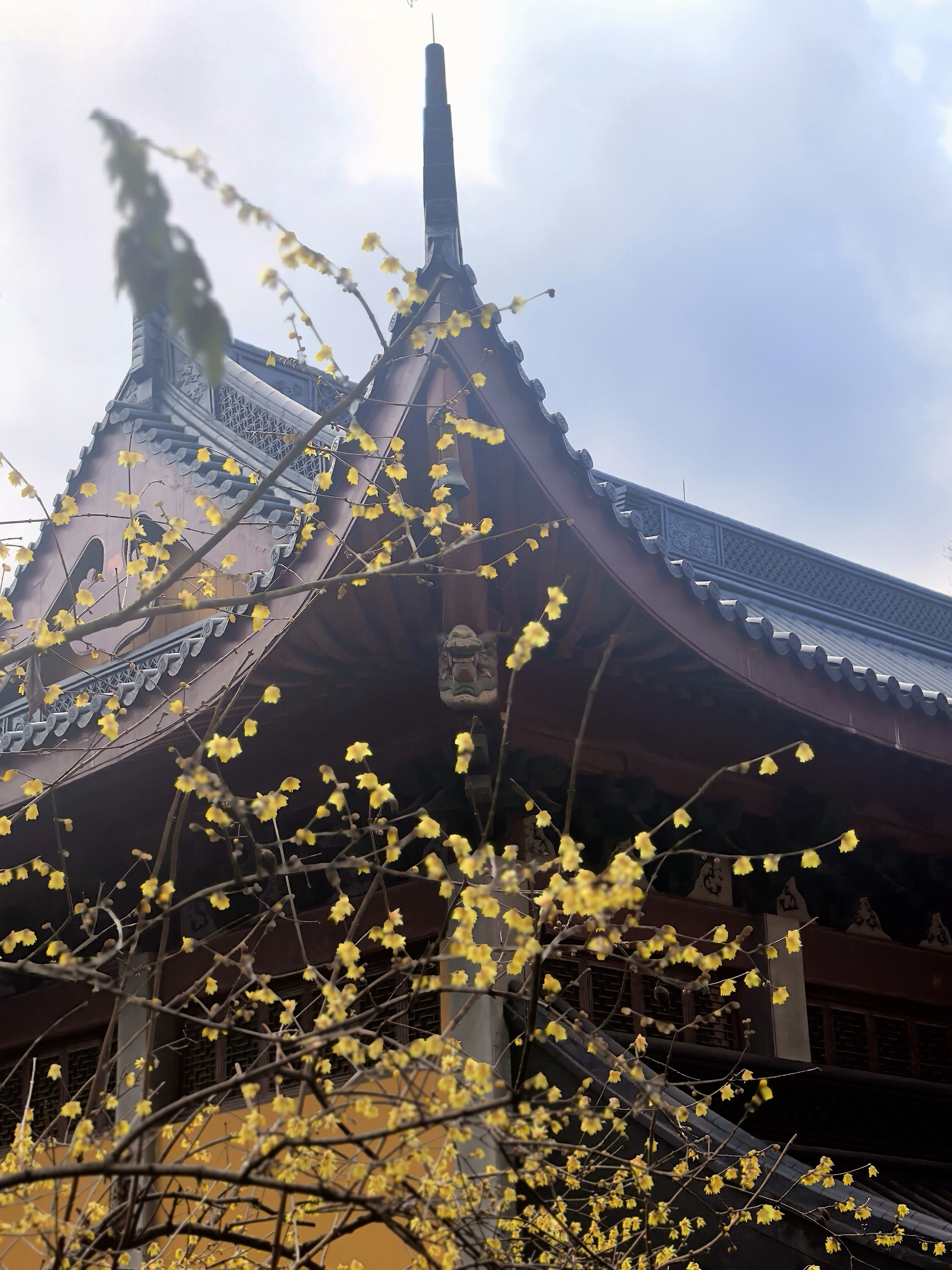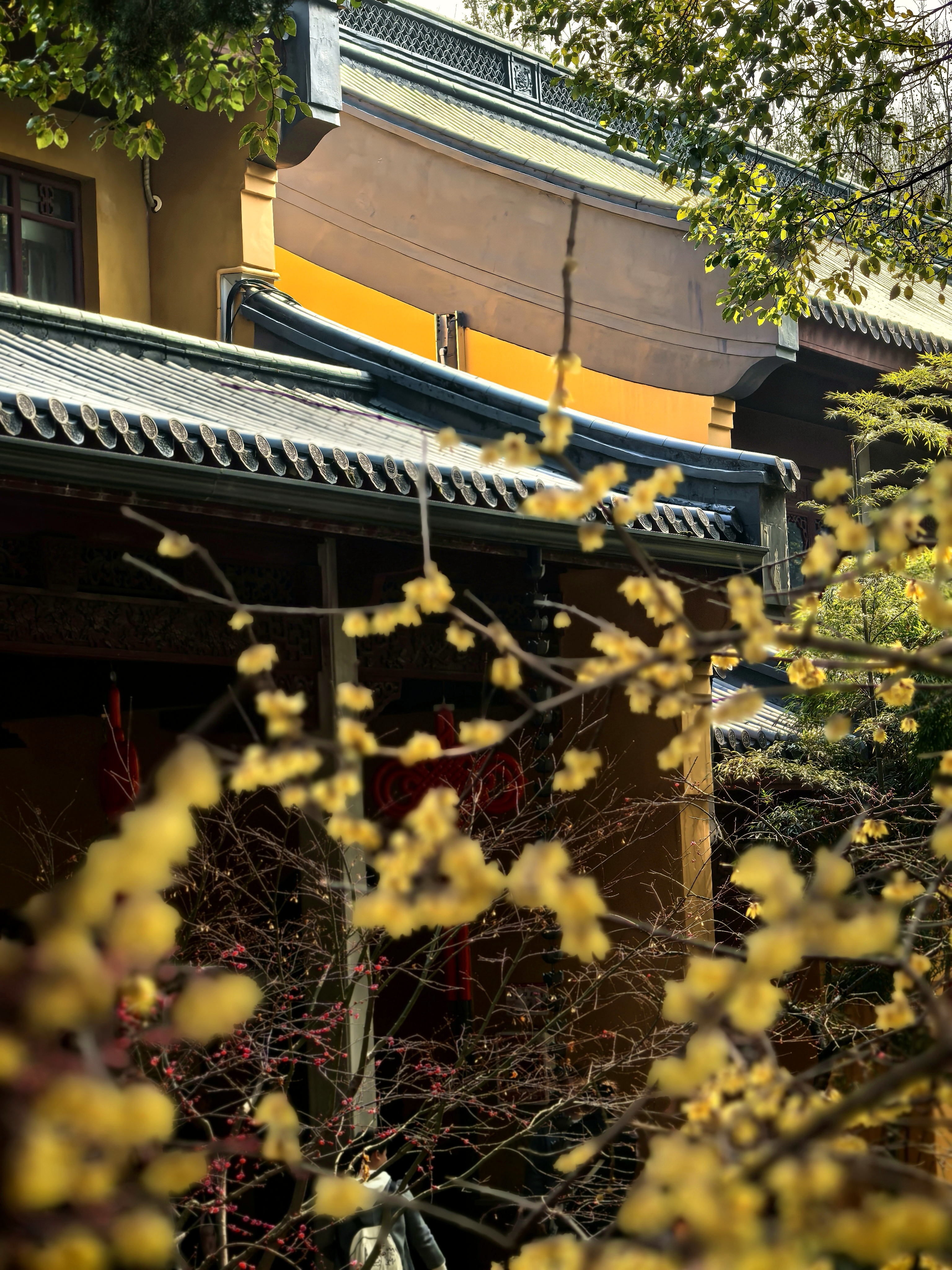 梅香与梵音交织成灵隐寺一种独有的静谧。 檐角牌匾下斜出的一枝白梅,花瓣如凝新雪,在深褐窗棂前颤颤地亮着,也许这是佛前供奉的清澈。 蜡梅开在石塔旁、墙角处,一团团金箔似的缀满枯枝,逆光中熔成暖融融的蜜蜡,将古朴的梁柱都浸得温润起来。 在寺院内我寻过蜡梅,以前都在大雄宝殿周边,这次终于见到客堂边房里那株孤独而惊艳的蜡梅,一树的繁花有如蒋庄或钱王祠的那几株。厢房空无一人,寂寞让蜡梅竟然如此美丽! 梅花与古刹,是浑然天成的对话:梅以疏影暗香隐藏禅意,古寺以飞檐石刻承接花影;梅是流转的刹那,寺是凝驻的永恒。 站在“佛光普照”匾额下,看香烟袅袅拂过梅梢,恍然觉得这绽放不仅是冬日的馈赠,更是千年道场一声温柔的应许。今日是农历除夕,愿以枝头春信,贺诸君马年安康,愿潮新闻日日生香。每天醒来第一件事,就是打开潮新闻app。杭城赏梅之二十灵隐寺。