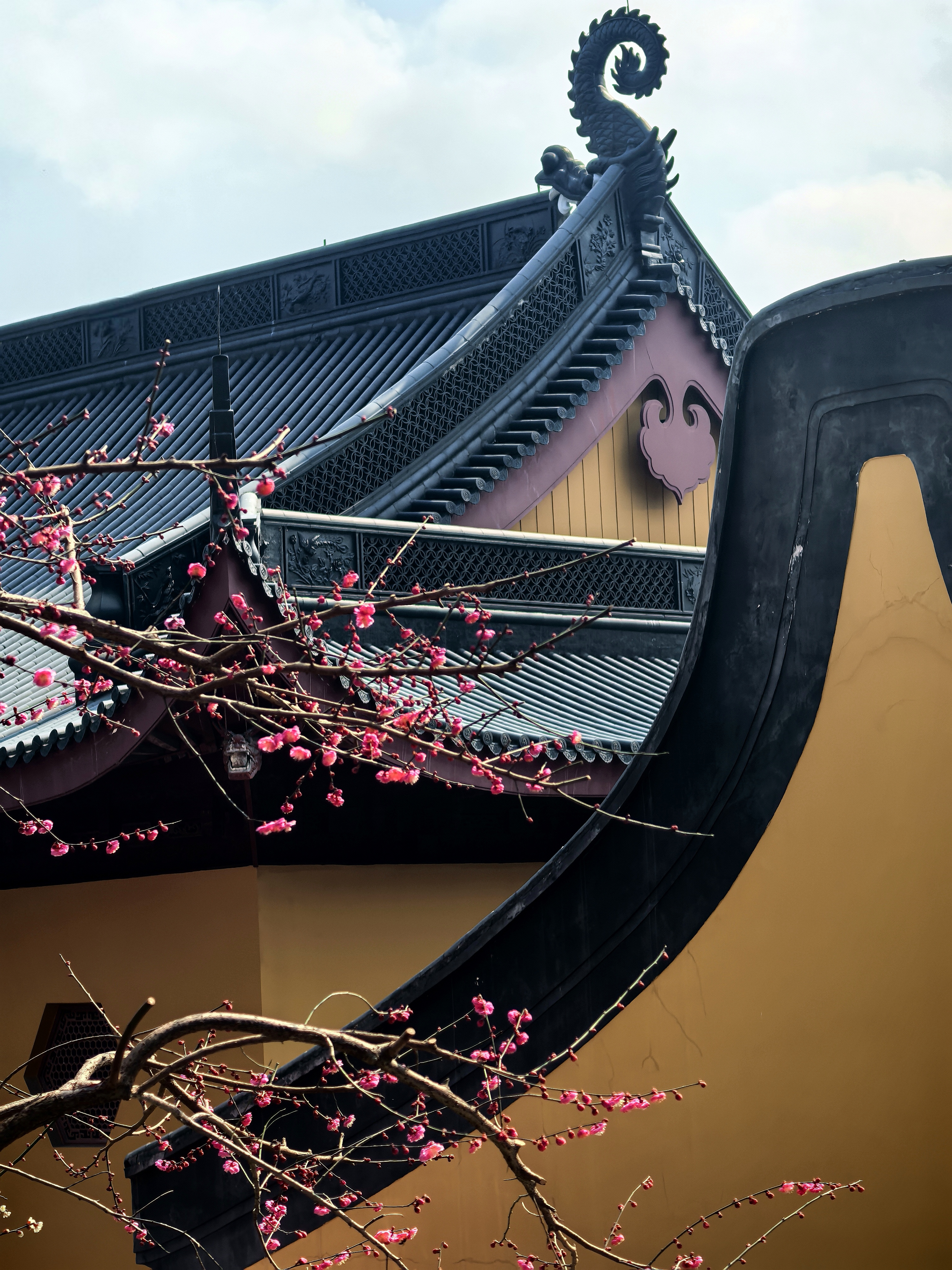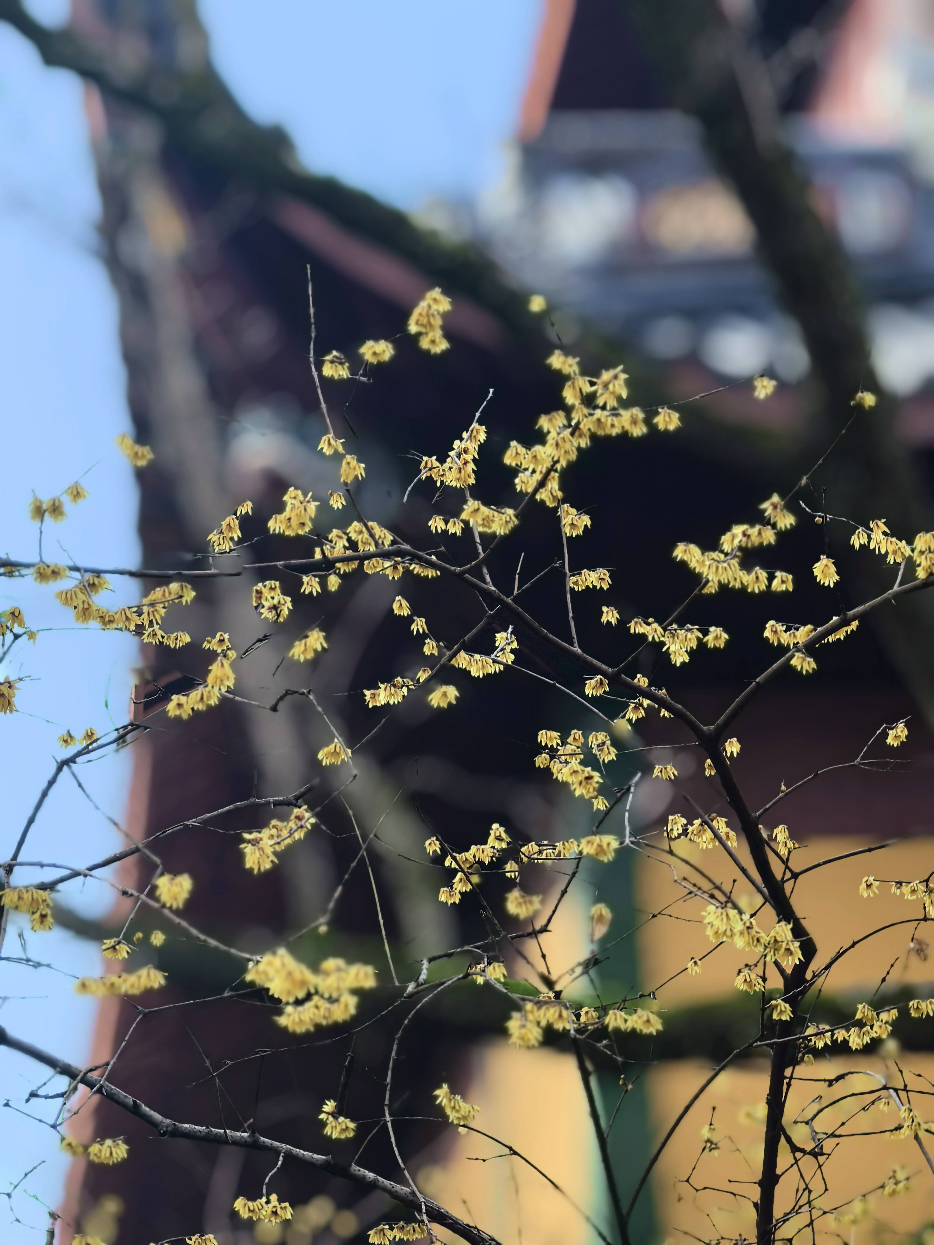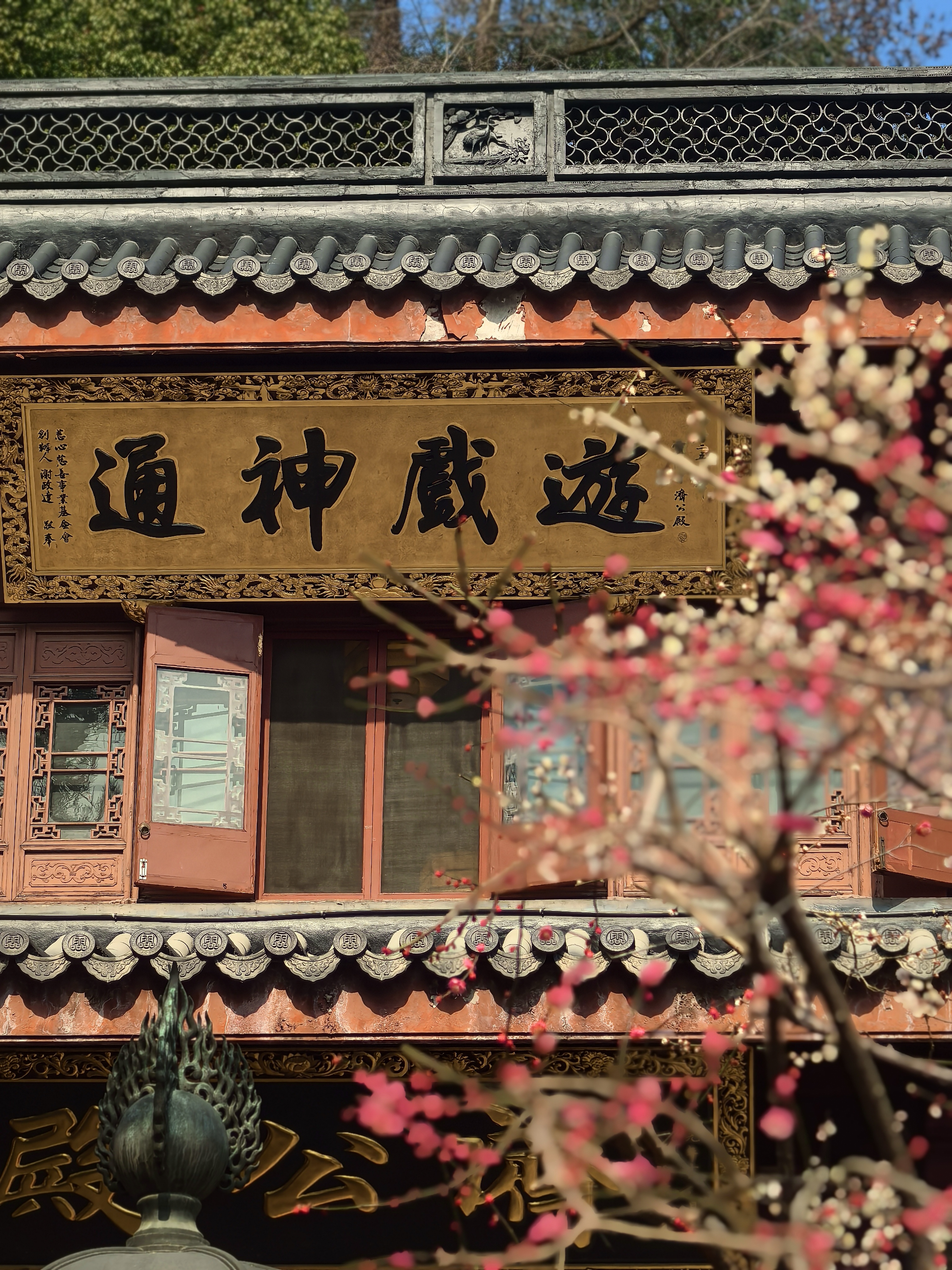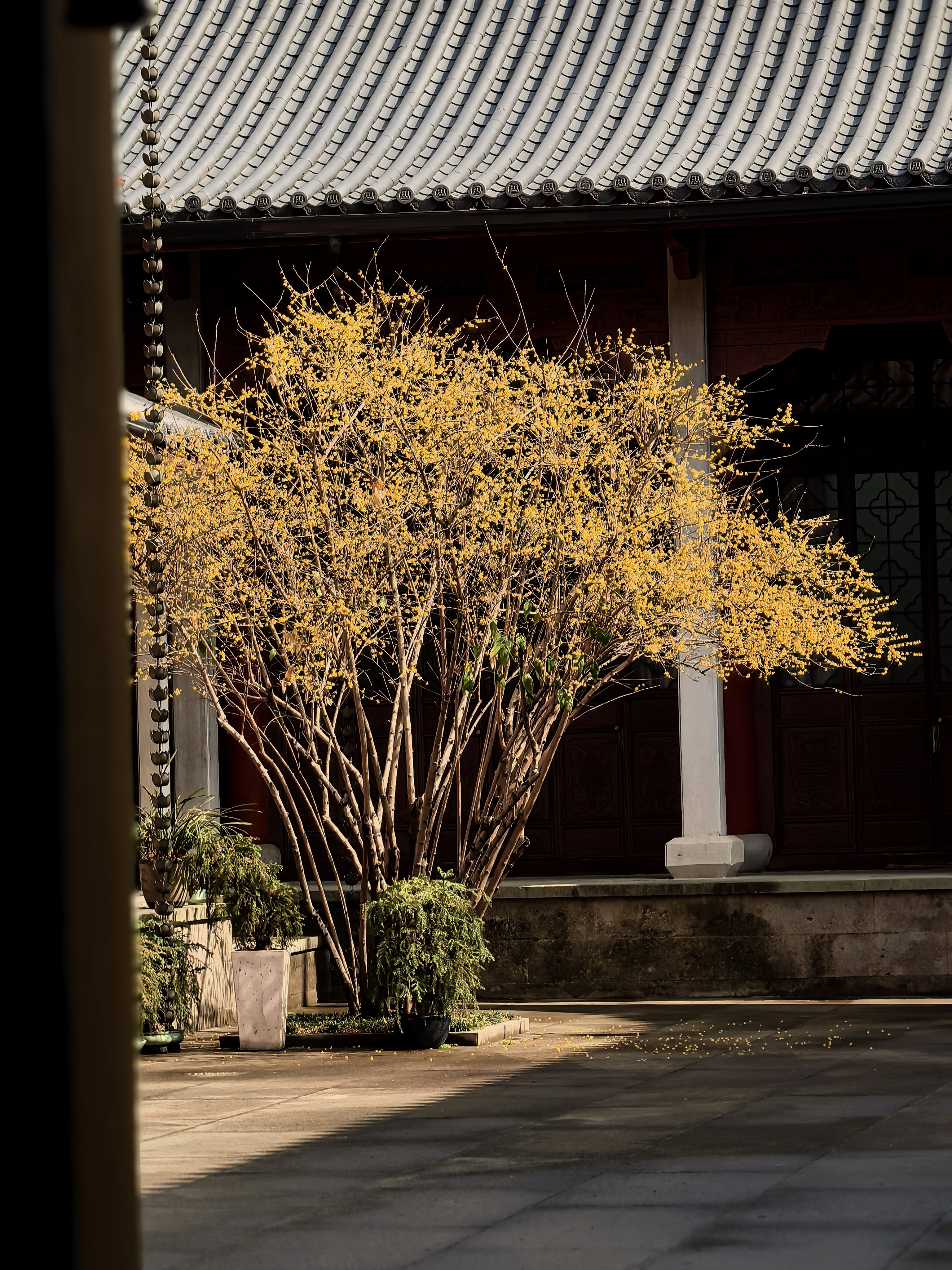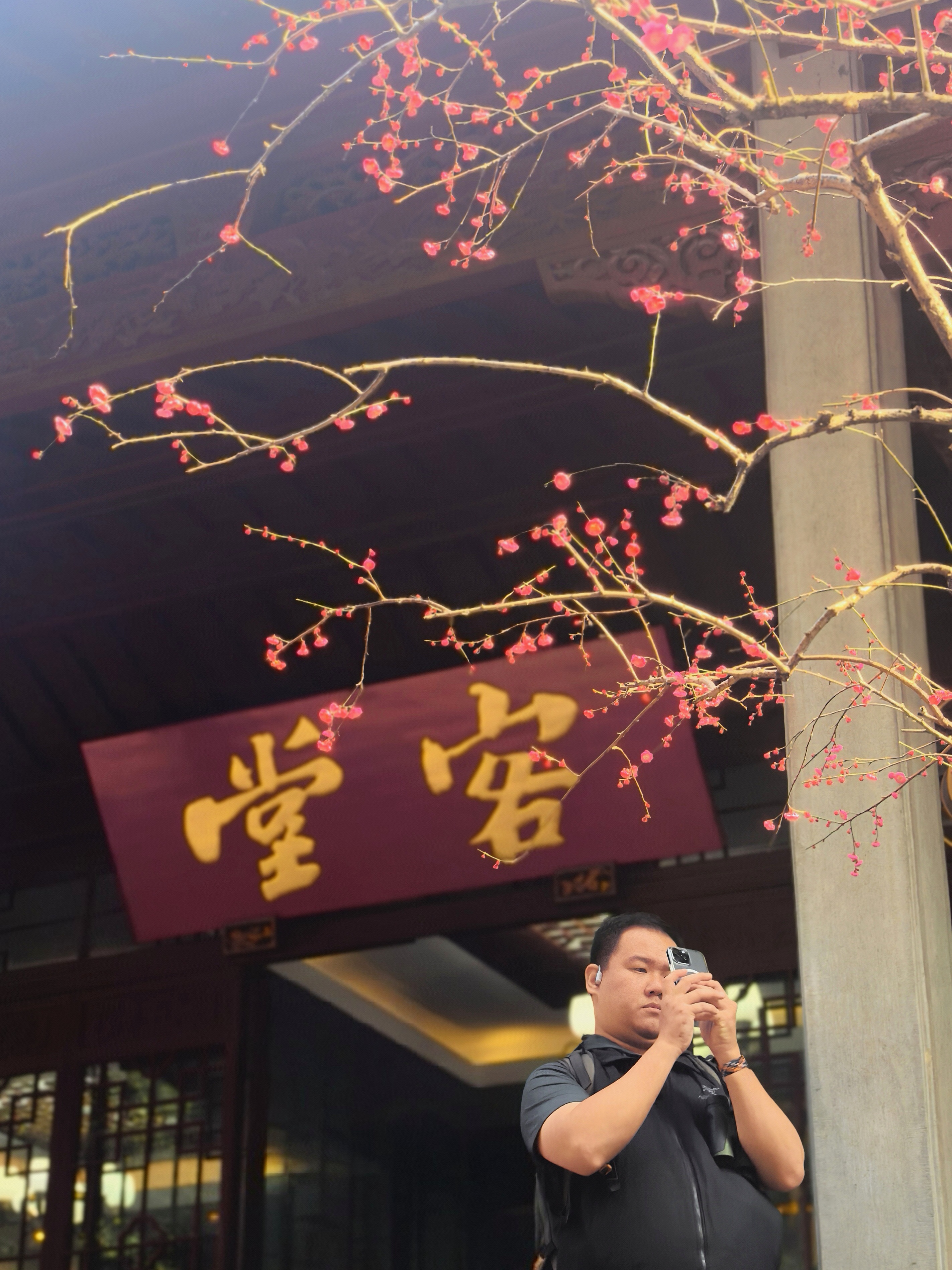 梅香与梵音交织成灵隐寺一种独有的静谧。 檐角牌匾下斜出的一枝白梅,花瓣如凝新雪,在深褐窗棂前颤颤地亮着,也许这是佛前供奉的清澈。 蜡梅开在石塔旁、墙角处,一团团金箔似的缀满枯枝,逆光中熔成暖融融的蜜蜡,将古朴的梁柱都浸得温润起来。 在寺院内我寻过蜡梅,以前都在大雄宝殿周边,这次终于见到客堂边房里那株孤独而惊艳的蜡梅,一树的繁花有如蒋庄或钱王祠的那几株。厢房空无一人,寂寞让蜡梅竟然如此美丽! 梅花与古刹,是浑然天成的对话:梅以疏影暗香隐藏禅意,古寺以飞檐石刻承接花影;梅是流转的刹那,寺是凝驻的永恒。 站在“佛光普照”匾额下,看香烟袅袅拂过梅梢,恍然觉得这绽放不仅是冬日的馈赠,更是千年道场一声温柔的应许。今日是农历除夕,愿以枝头春信,贺诸君马年安康,愿潮新闻日日生香。每天醒来第一件事,就是打开潮新闻app。杭城赏梅之二十灵隐寺。